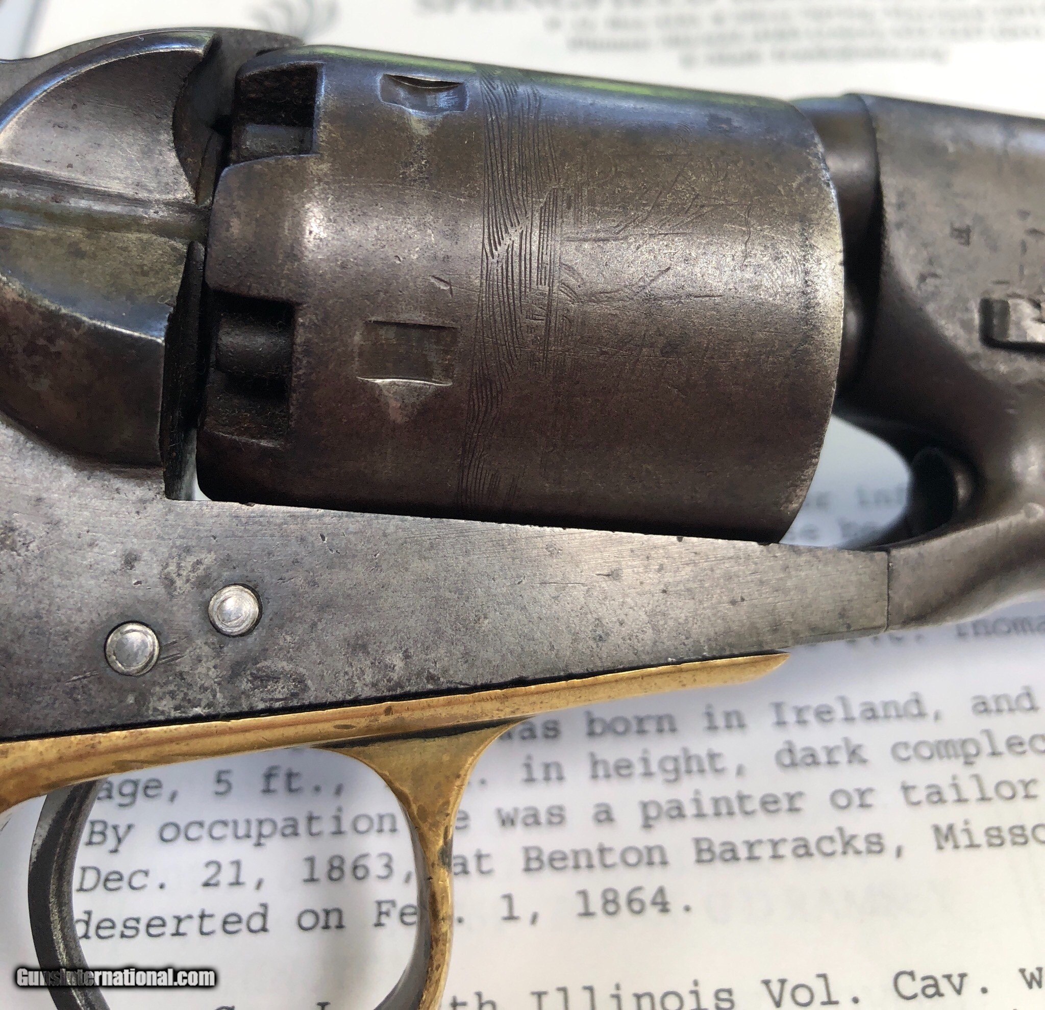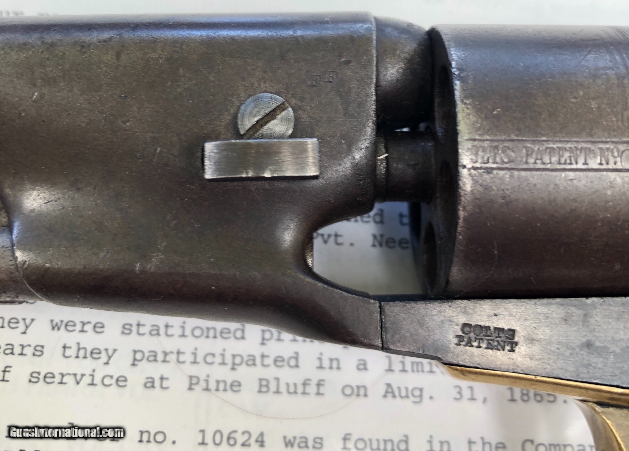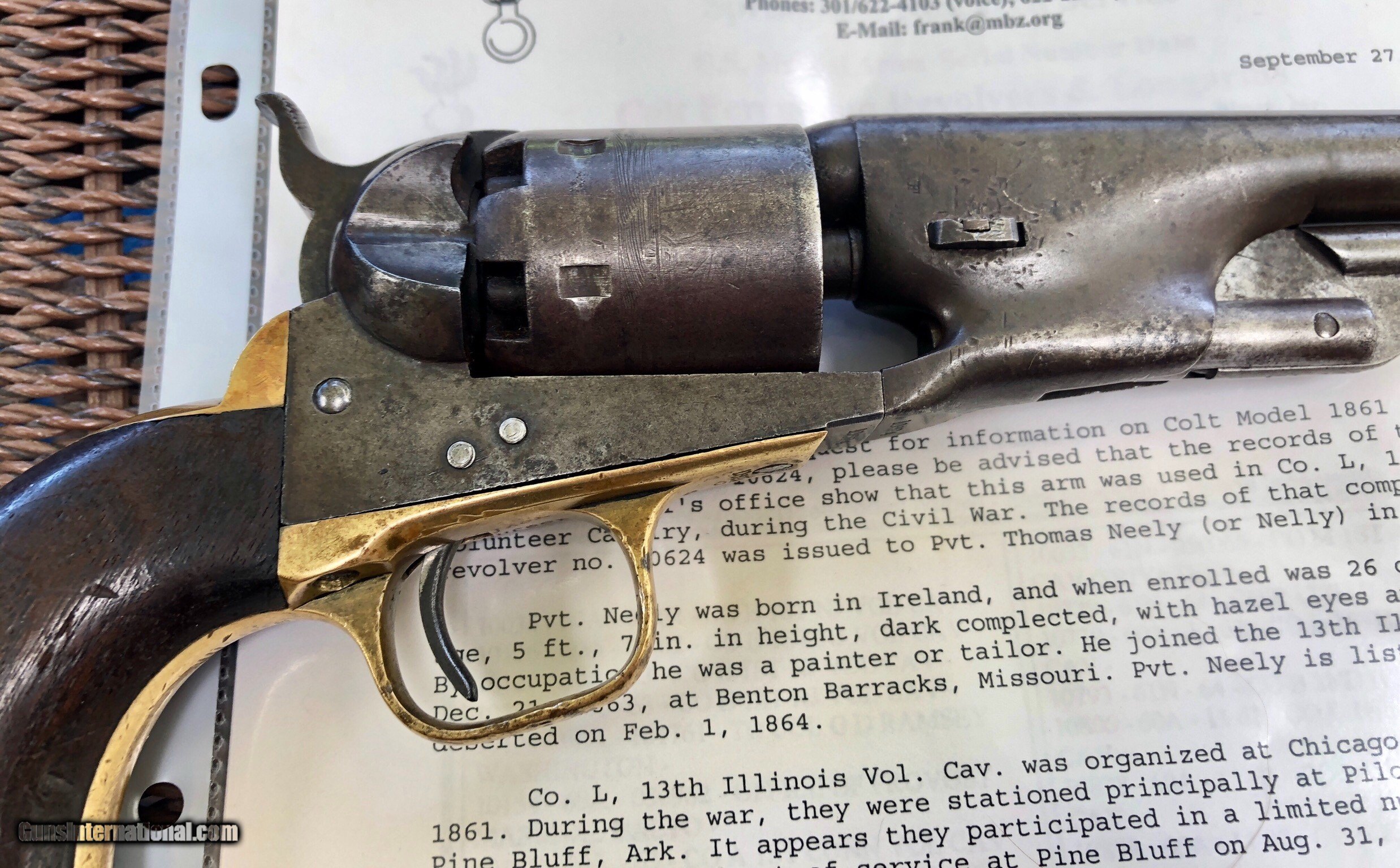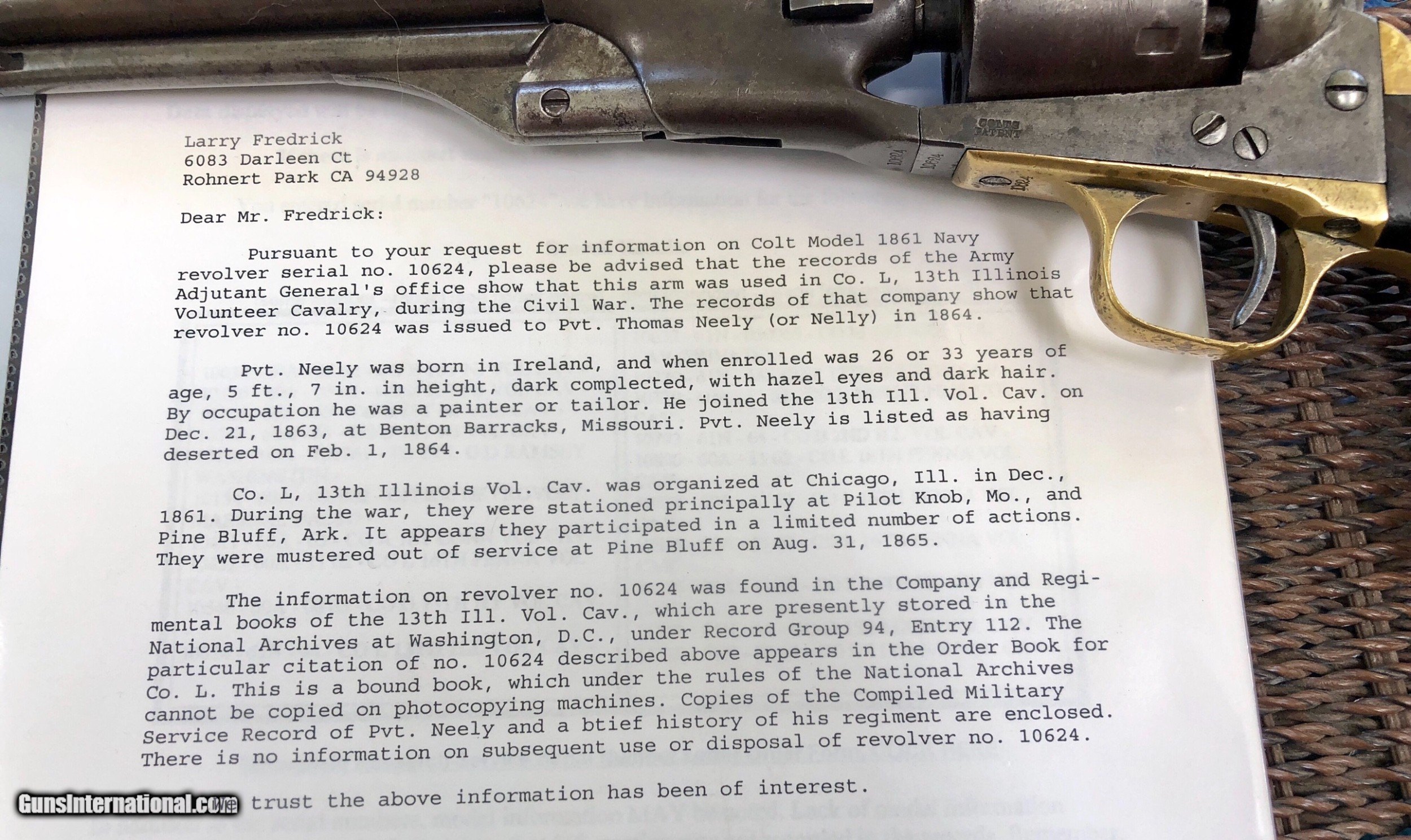 Description: This Martial Colt 1861 Navy is scarce on its own but when you can find a documented example to a soldier, it takes it up a notch. There is faint cartouches visible on the grip. a repair to the right grip toe. Mechanically excellent. Overall the finish has faded to a beautiful untouched patina. Private Neely or Nelly served in Co. L 13th Illinois Volunteer Cavalry, He enlisted December 21, 1863 at Benton Barrack, Missouri. Pvt. Nelly is listed having deserted on Feb. 1, 1864. Although he did not serve long, this is still an incredible and documented example! Shipping is $20 plus actual insurance SOLD SOLD Antique: Yes |