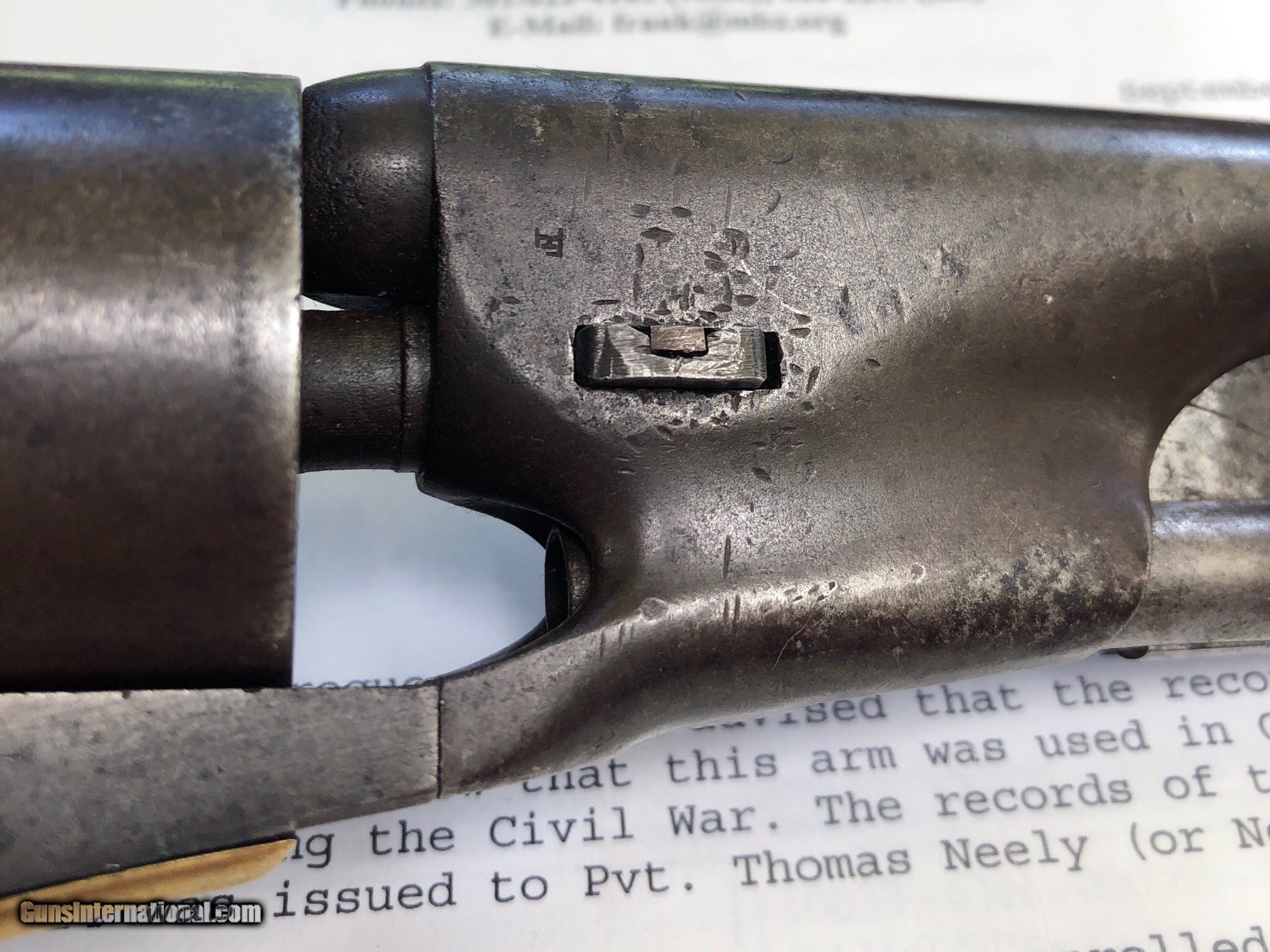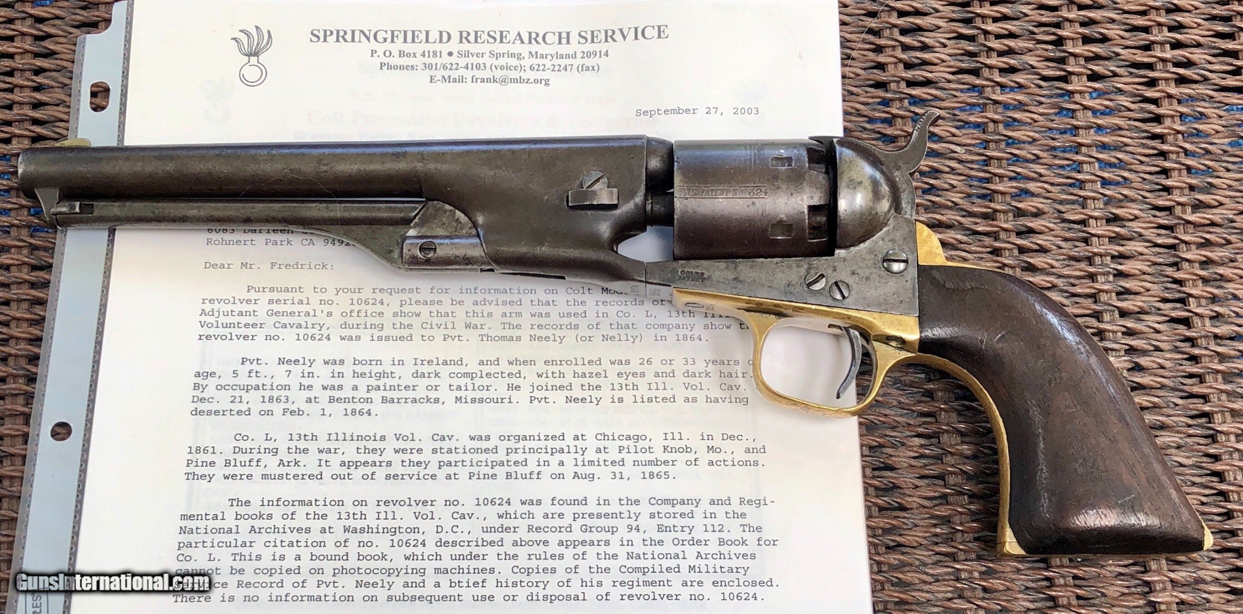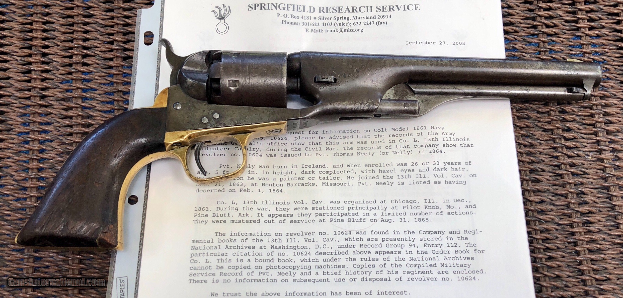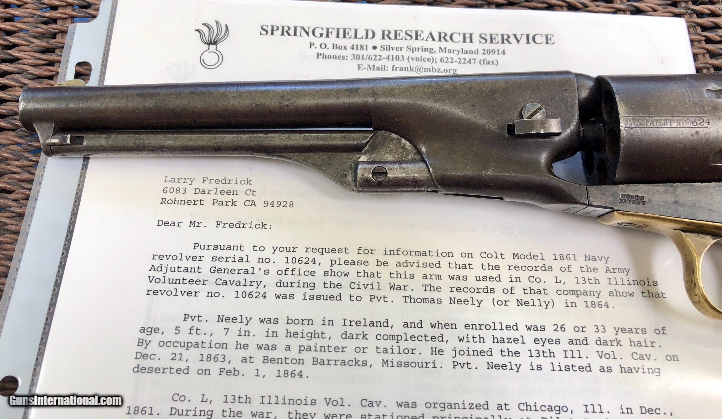 Description: This Martial Colt 1861 Navy is scarce on its own but when you can find a documented example to a soldier, it takes it up a notch. There is faint cartouches visible on the grip. a repair to the right grip toe. Mechanically excellent. Overall the finish has faded to a beautiful untouched patina. Private Neely or Nelly served in Co. L 13th Illinois Volunteer Cavalry, He enlisted December 21, 1863 at Benton Barrack, Missouri. Pvt. Nelly is listed having deserted on Feb. 1, 1864. Although he did not serve long, this is still an incredible and documented example! Shipping is $20 plus actual insurance SOLD SOLD Antique: Yes |