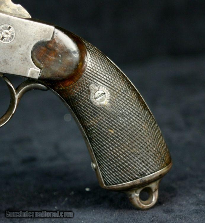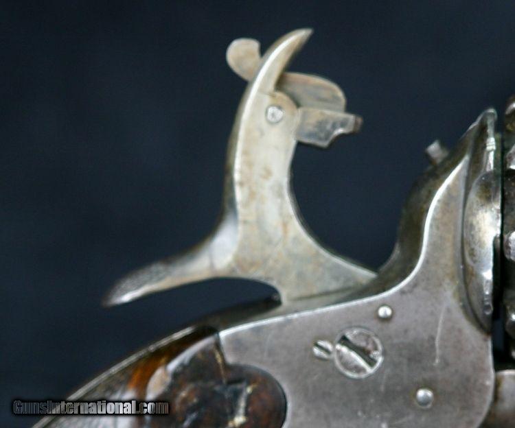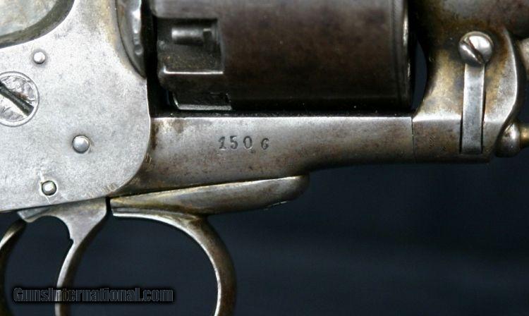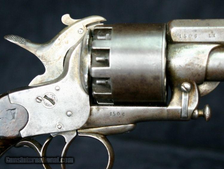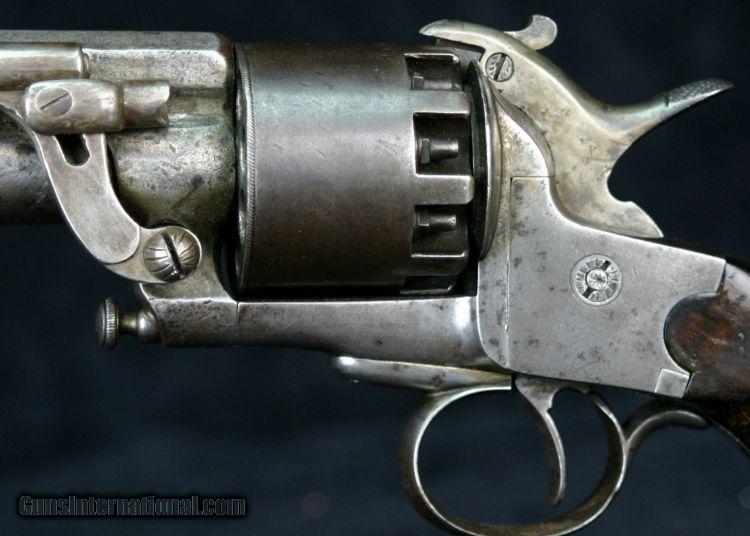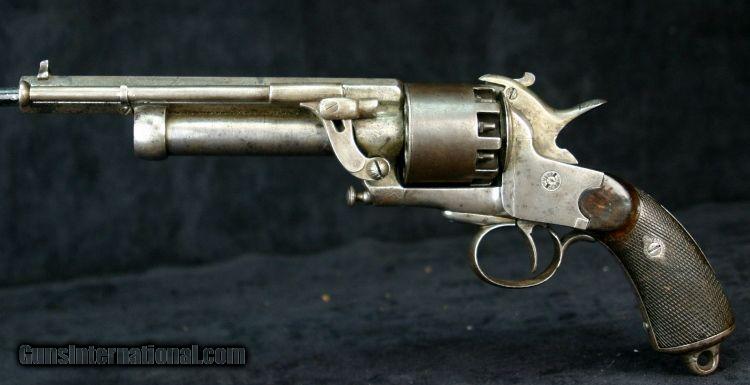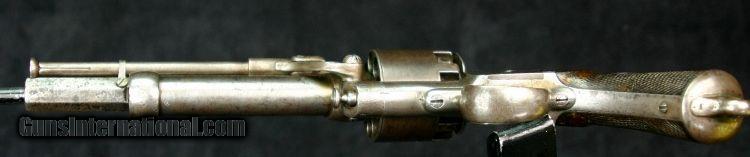 Description: .42 cal 9 shot cylinder over .63 cal smooth bore, #1506, 7 inch octagon barrel over 5 inch lower barrel, blue finish, "Col LeMat BTE s.g.d.g. Paris" on top barrel flat, 2 piece wood grips, swivel face on hammer to change from cylinder fire to lower barrel, circa 1860's. Condition: bores are very good, silver/gun metal finish overall with some surface oxidation, spring holding loading lever may be a replacement, grips are very good, excellent mechanically, excellent marks. SOLD Antique: Yes |