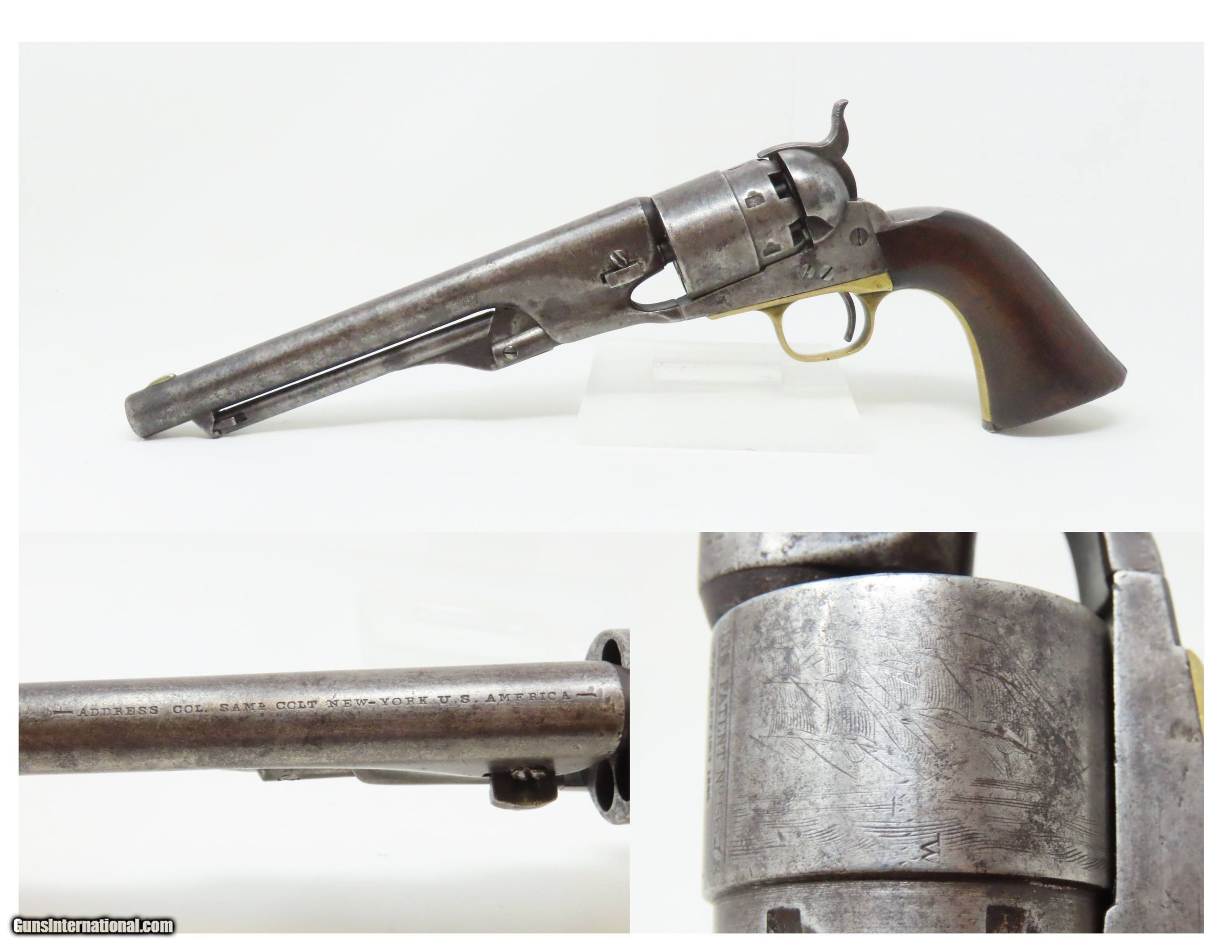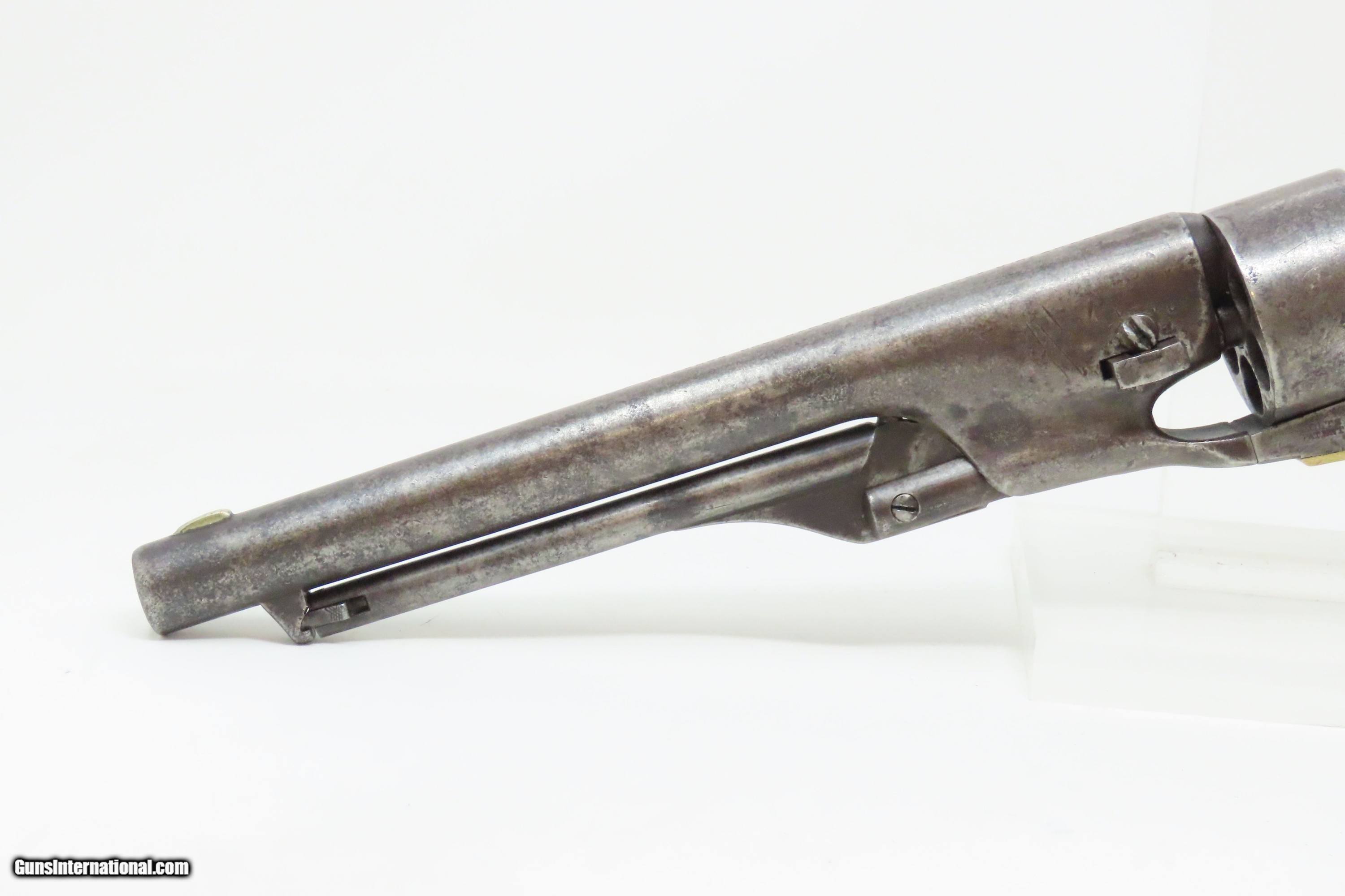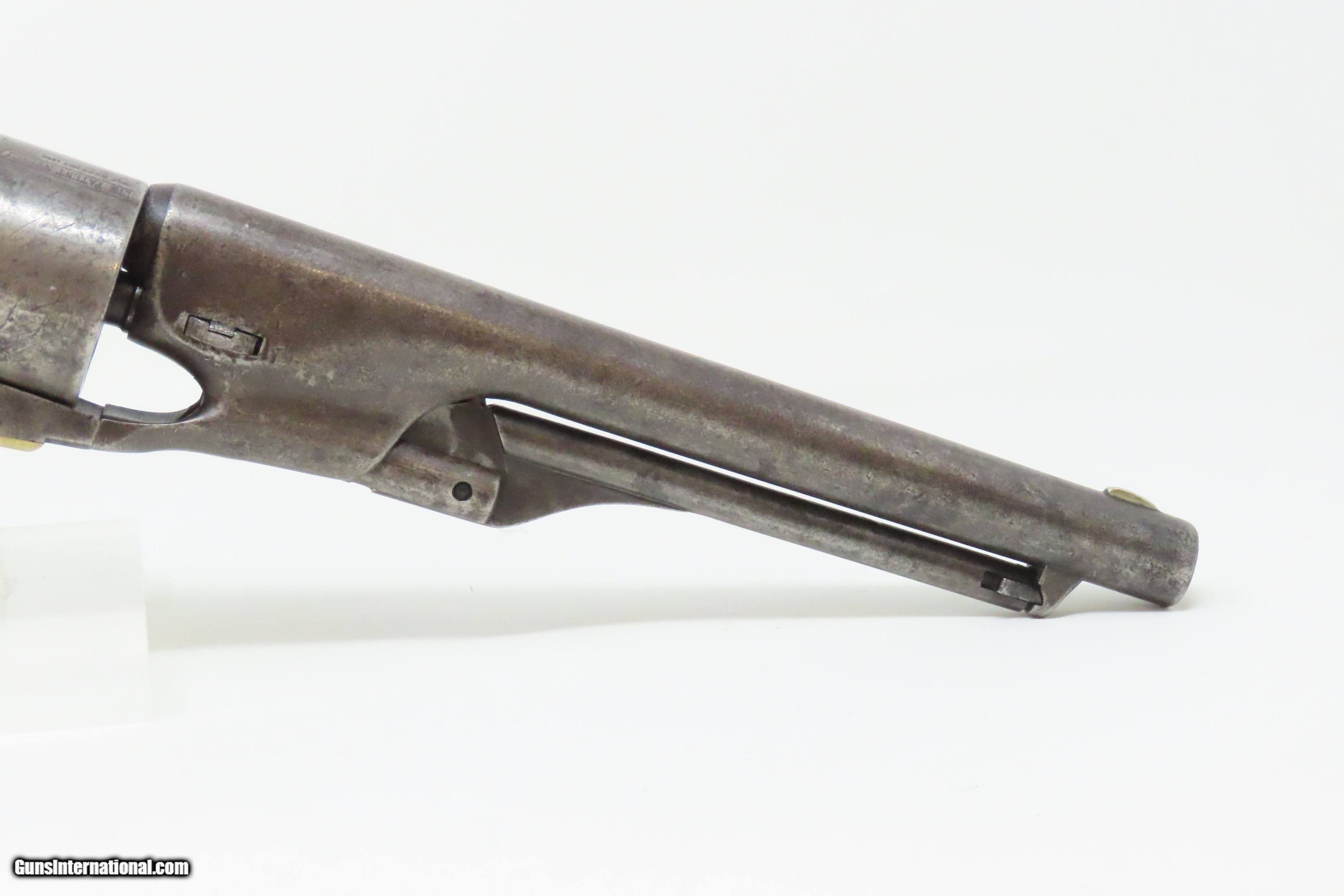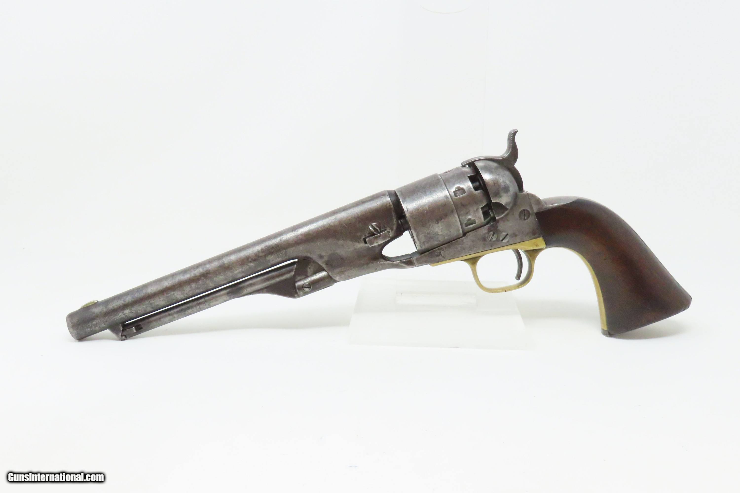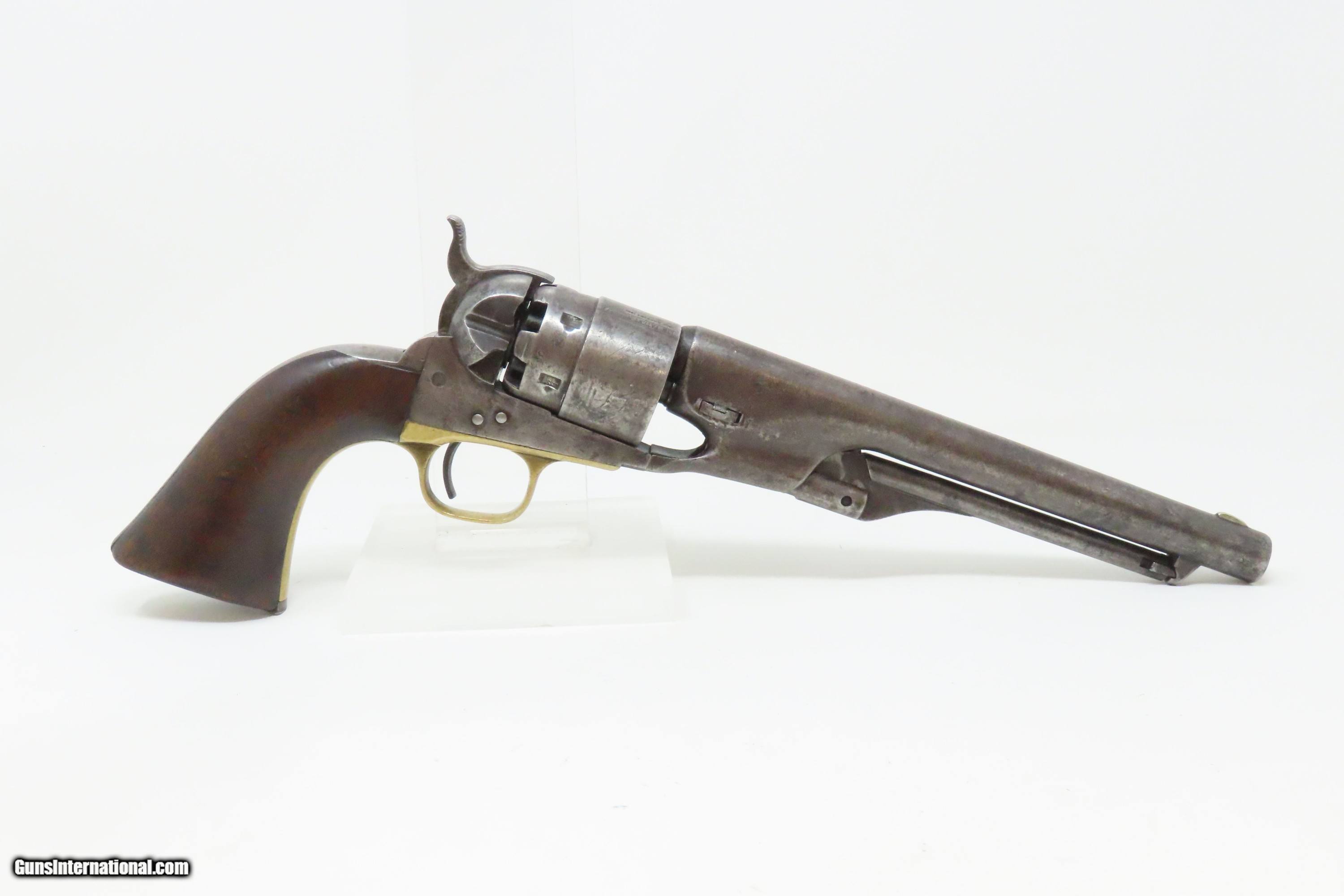Description: LETTERED 1863 mfr. CIVIL WAR Antique US COLT Model 1860 ARMY .44 Percussion Revolver Used Past the Civil War into the WILD WEST Here we present an antique Colt U.S. Model 1860 Army Revolver, made in 1863 in Hartford, Connecticut. Per the factory letter this revolver was sold to the U.S. Government, shipped to the New York Arsenal, Governor’s Island, New York, on March 4, 1863 The 1860 Army was the single most used pistol of the American Civil War. Over 200,000 were made from 1860 to 1873, and 156,000 of those were made by the end of the war in 1865. These were excellent sidearms for officers, cavalry, infantry, and artillery troops. The 1860 Army was Samuel Colt’s finest achievement to that point, having finally developed a large caliber revolver that weighed about 2 lbs. 10 oz. to the famous Dragoon’s 4 lbs. 4 oz., and was adopted en masse by the U.S. government with huge contracts. The revolver was well balanced in hand and had a long enough barrel to be effective when utilized as a carbine with the attachable shoulder stock. This revolver represented unprecedented firepower from a handgun in the field at the time and was especially suited to Cavalry. The Confederacy, lacking in manufacturing capabilities though they were, managed to produce limited numbers of copies, and battlefield pickups of the 1860 Army were highly coveted. The 1860 Army went on to serve the U.S. military even after the Civil War and into the Indian Wars, until production of Colt’s 1873 Single Action Army created new waves in the revolver market, and again achieved great success in the military and commercial markets. The overall condition is good+. Gray patina throughout. Faint but visible Battle of Campeche cylinder scene. The action is excellent. The bore is in very good condition with strong rifling. The grip is solid and each side shows faint traces of inspector cartouches. Other inspectors’ marks are visible throughout. Numbers match throughout. Own the original! This is a legitimate antique and not a reproduction. Barrel is 8 inches. Caliber: .44 Percussion Overall condition as seen in photos. Very Fast. Very Safe. FREE SHIPPING WORLDWIDE. Delivered directly to your door by express mail! Guaranteed AUTHENTIC & Includes CERTIFICATE OF AUTHENTICITY. ancestryguns $5950 #244066 SOLD Antique: Yes |