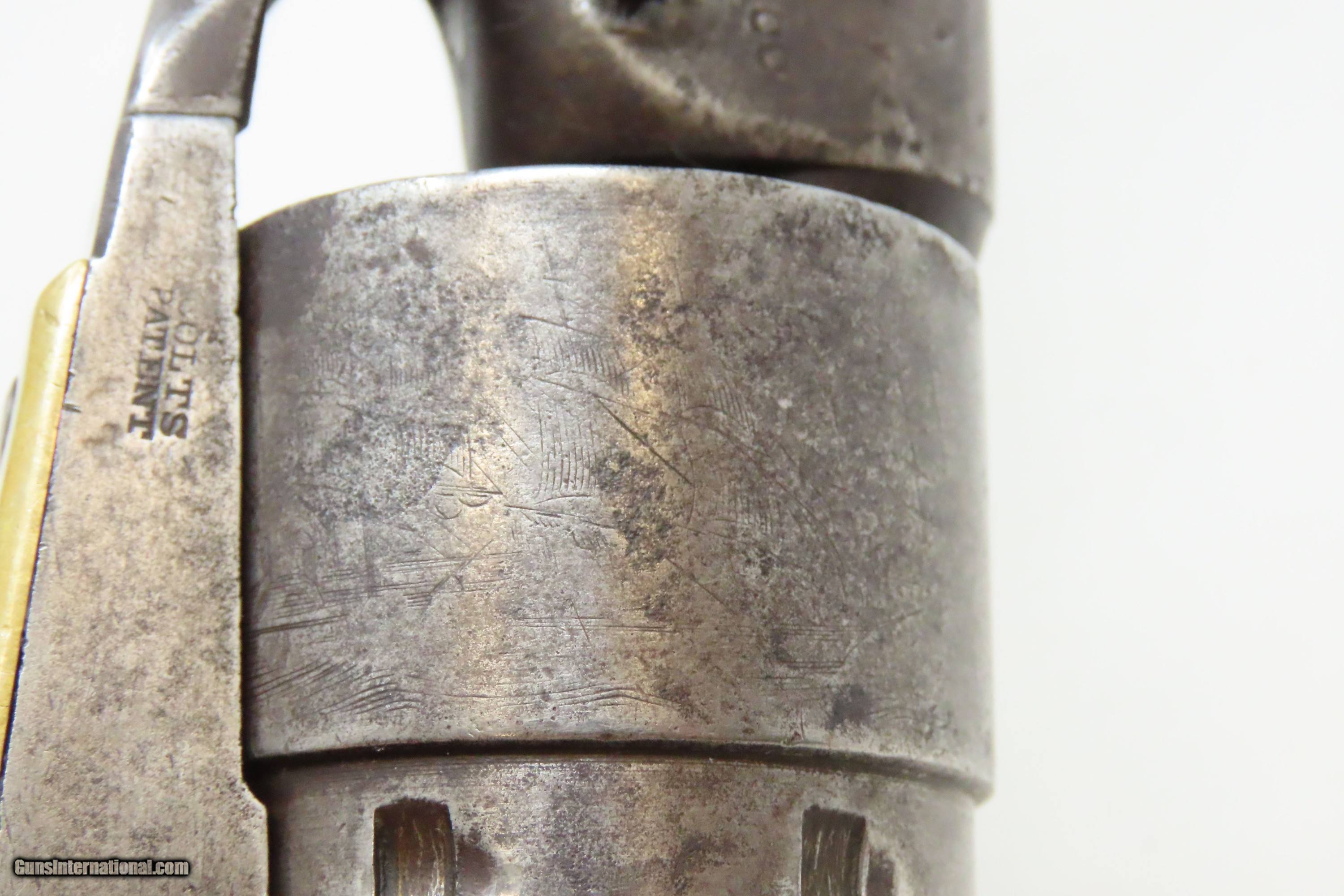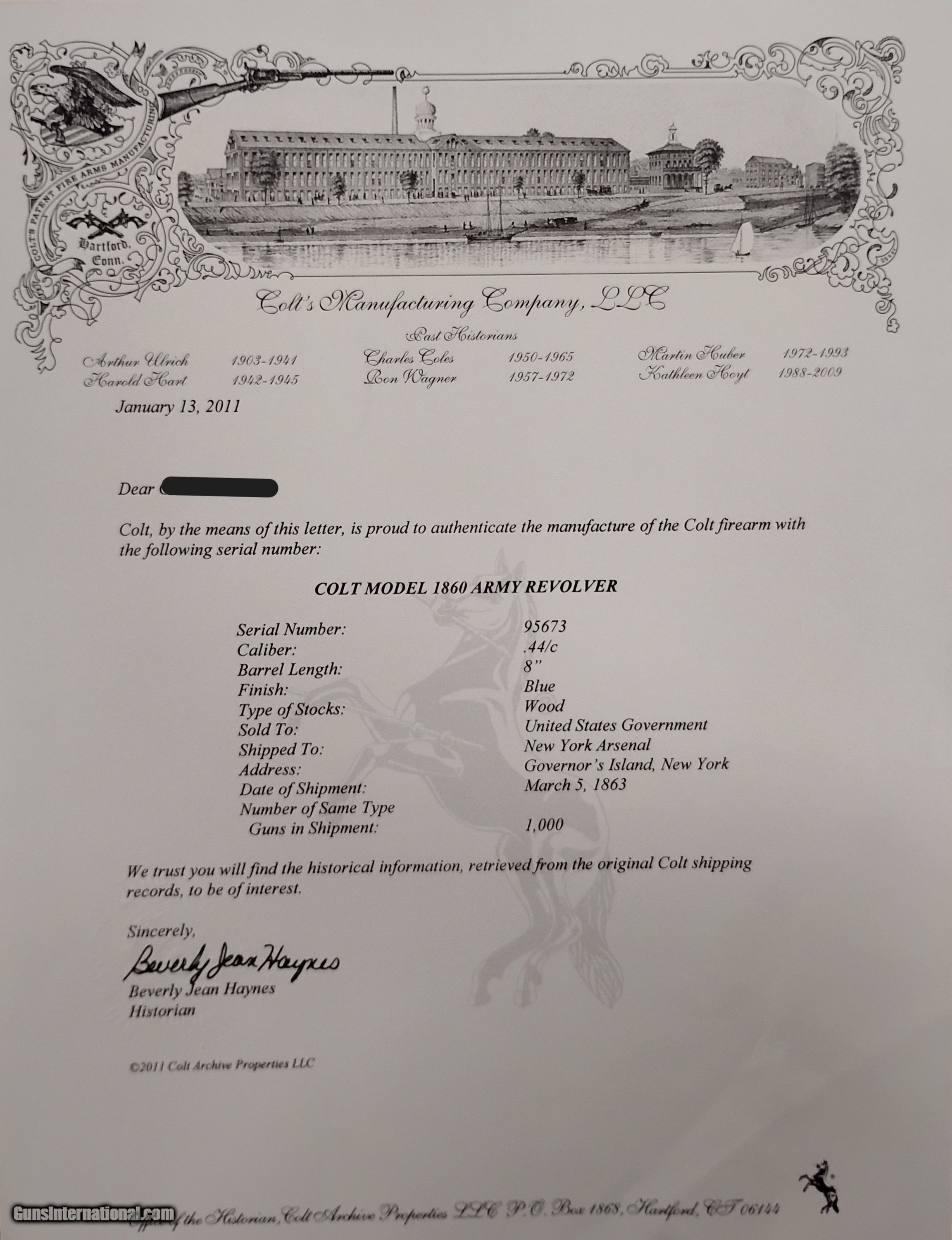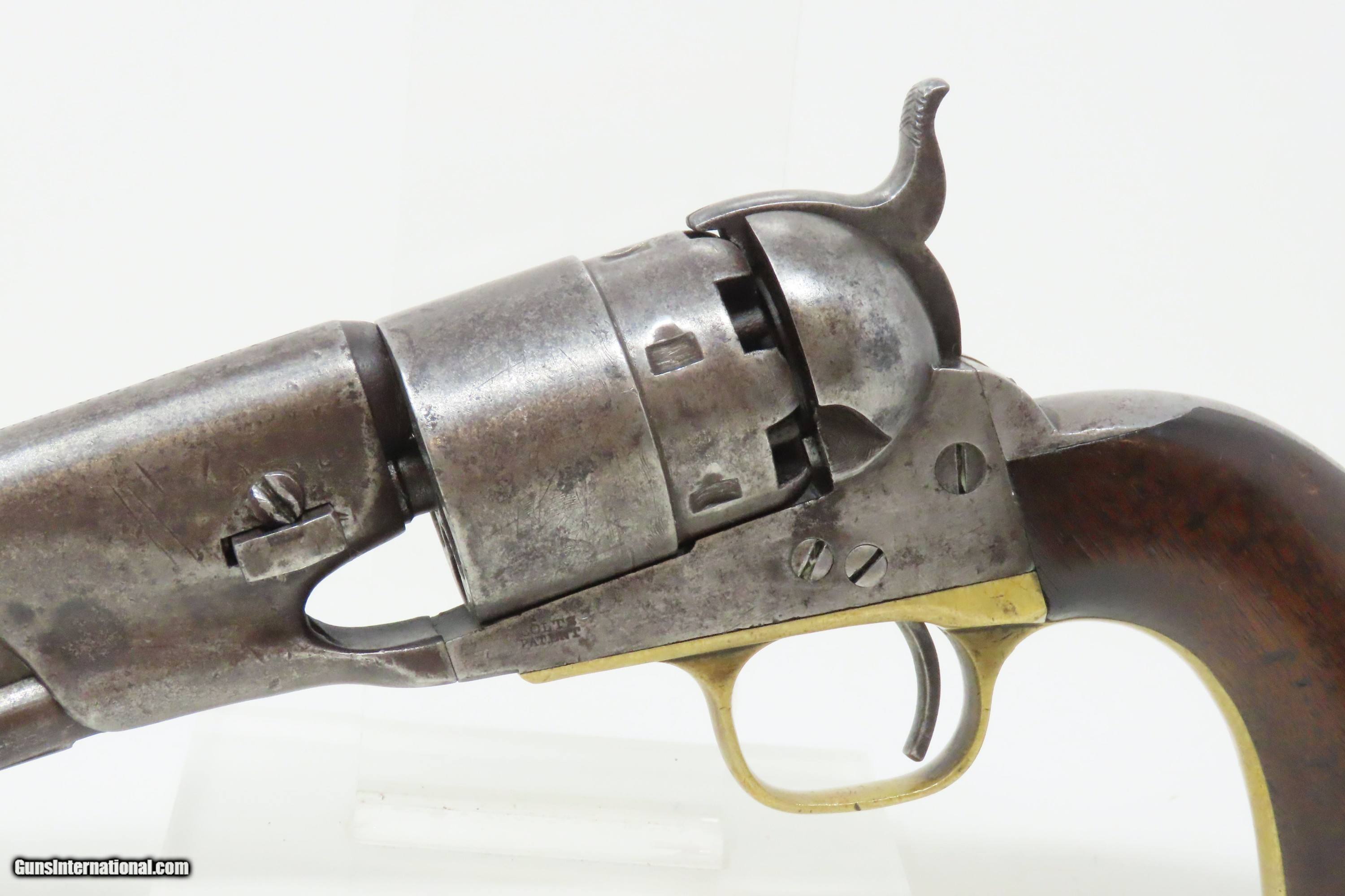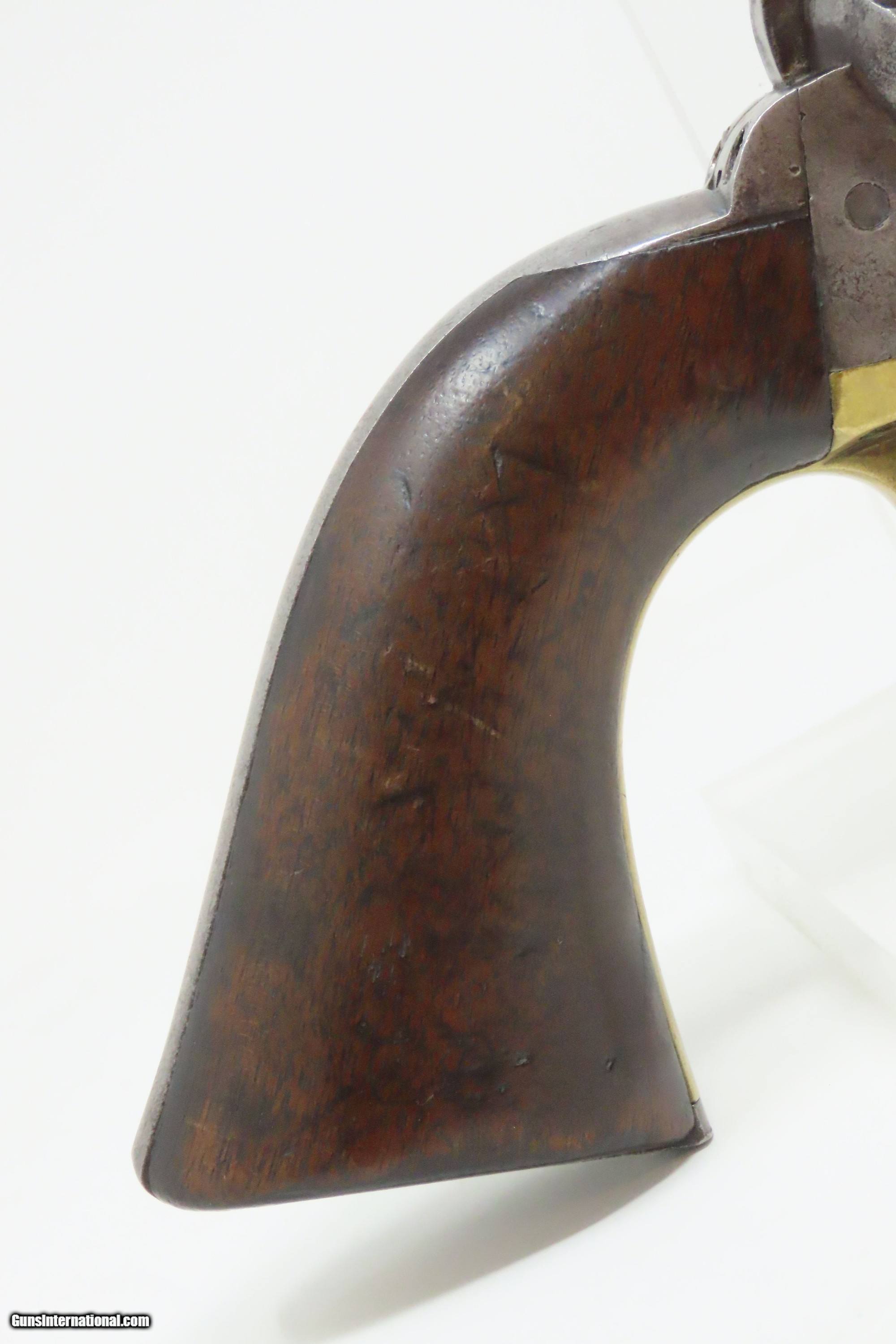 Description: LETTERED 1863 mfr. CIVIL WAR Antique US COLT Model 1860 ARMY .44 Percussion Revolver Used Past the Civil War into the WILD WEST Here we present an antique Colt U.S. Model 1860 Army Revolver, made in 1863 in Hartford, Connecticut. Per the factory letter this revolver was sold to the U.S. Government, shipped to the New York Arsenal, Governor’s Island, New York, on March 4, 1863 The 1860 Army was the single most used pistol of the American Civil War. Over 200,000 were made from 1860 to 1873, and 156,000 of those were made by the end of the war in 1865. These were excellent sidearms for officers, cavalry, infantry, and artillery troops. The 1860 Army was Samuel Colt’s finest achievement to that point, having finally developed a large caliber revolver that weighed about 2 lbs. 10 oz. to the famous Dragoon’s 4 lbs. 4 oz., and was adopted en masse by the U.S. government with huge contracts. The revolver was well balanced in hand and had a long enough barrel to be effective when utilized as a carbine with the attachable shoulder stock. This revolver represented unprecedented firepower from a handgun in the field at the time and was especially suited to Cavalry. The Confederacy, lacking in manufacturing capabilities though they were, managed to produce limited numbers of copies, and battlefield pickups of the 1860 Army were highly coveted. The 1860 Army went on to serve the U.S. military even after the Civil War and into the Indian Wars, until production of Colt’s 1873 Single Action Army created new waves in the revolver market, and again achieved great success in the military and commercial markets. The overall condition is good+. Gray patina throughout. Faint but visible Battle of Campeche cylinder scene. The action is excellent. The bore is in very good condition with strong rifling. The grip is solid and each side shows faint traces of inspector cartouches. Other inspectors’ marks are visible throughout. Numbers match throughout. Own the original! This is a legitimate antique and not a reproduction. Barrel is 8 inches. Caliber: .44 Percussion Overall condition as seen in photos. Very Fast. Very Safe. FREE SHIPPING WORLDWIDE. Delivered directly to your door by express mail! Guaranteed AUTHENTIC & Includes CERTIFICATE OF AUTHENTICITY. ancestryguns $5950 #244066 SOLD Antique: Yes |