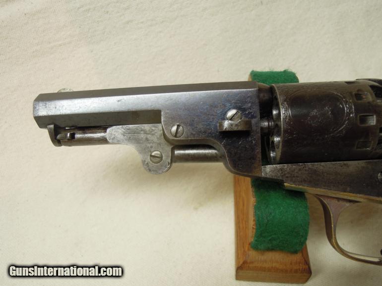 Description: Manhattan Navy Revolver - Series V - Cal. .36 - 4" Bbl. - SN 694 (1867) - 1st year production of this series which was made only in 1867 and 1868 - all matching numbers - 6-shot. Bore is excellent - bright and shiny with sharp rifling and only a very few spots of very mild roughness - action is excellent with perfect timing and lock-up . .Barrel retains about 90% blue with a few areas of light thinning - cylinder has 90% thinning blue and a 99% very sharp and crisp cylinder scene. Frame and loading lever show about 40% fading case colors - guard and backstrap retain 90% silver plating. Metal is excellent overall with no pits or corrosion - sharp edges and markings - perfect nipples and screws. Grips are excellent, undamaged, and retain 95% + finish and are the desirable "fat" style. The Manhattan was a very well made revolver and the earlier series were a very popular Civil War sidearm produced as a competitor to the Colt 1849 Pocket and 1851 Navy models - later versions were a popular back up revolver in the early West. Only about 9000 of the Series V were produced, making this a fairly scarce revolver. This is an outstanding example of a first year production Series V Manhattan Navy with lots of original finish and is all original, and in excellent ++ condition - an exceptionally nice early West collectible. SOLD Antique: Yes |