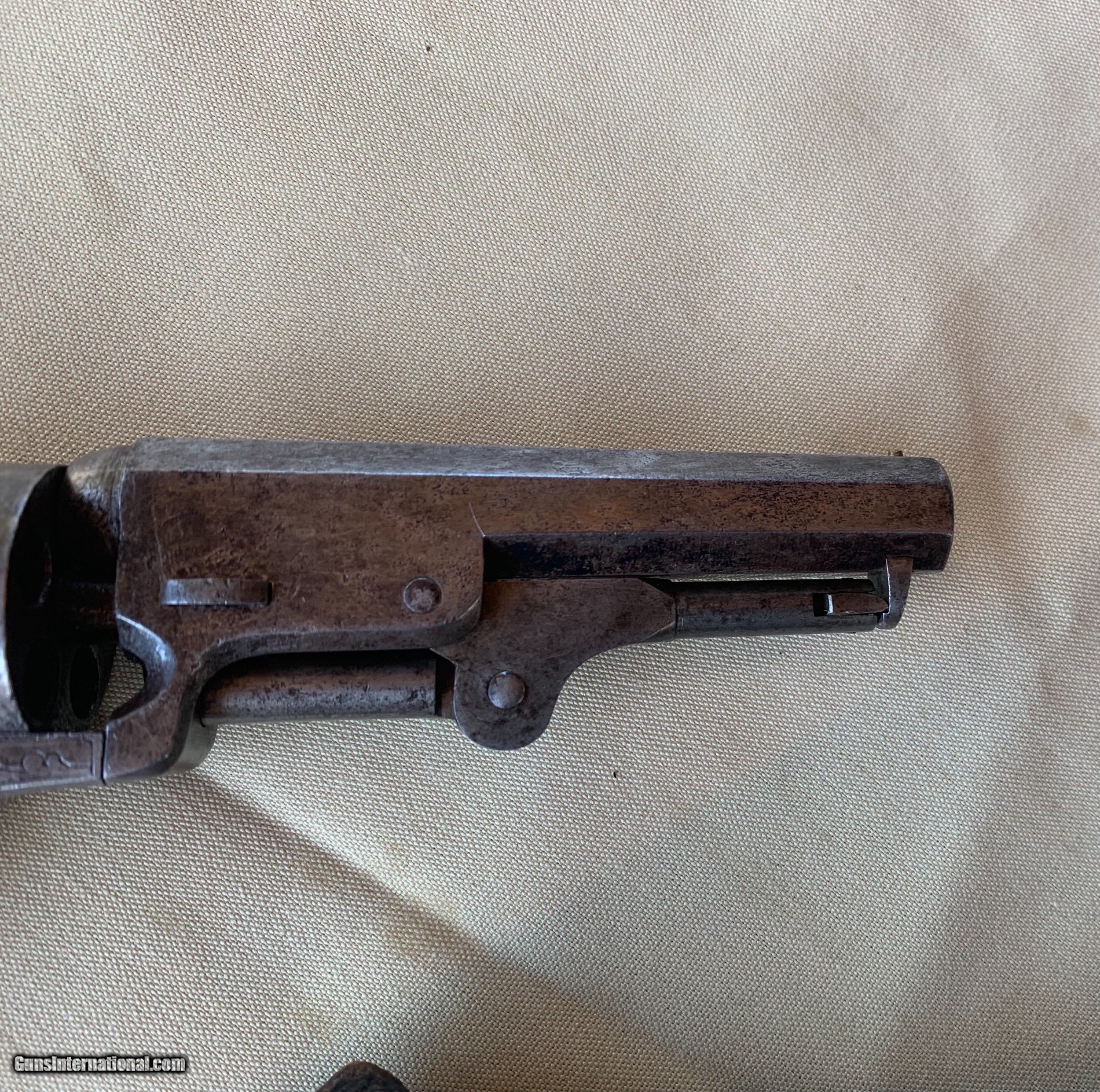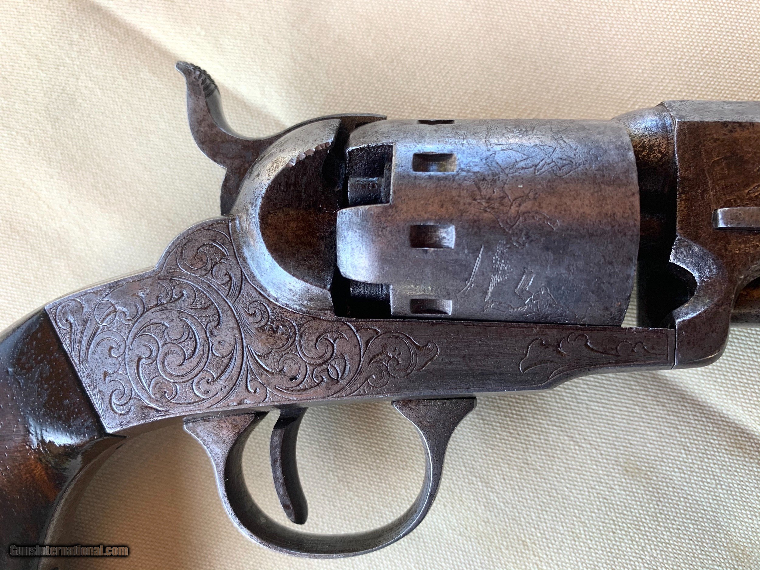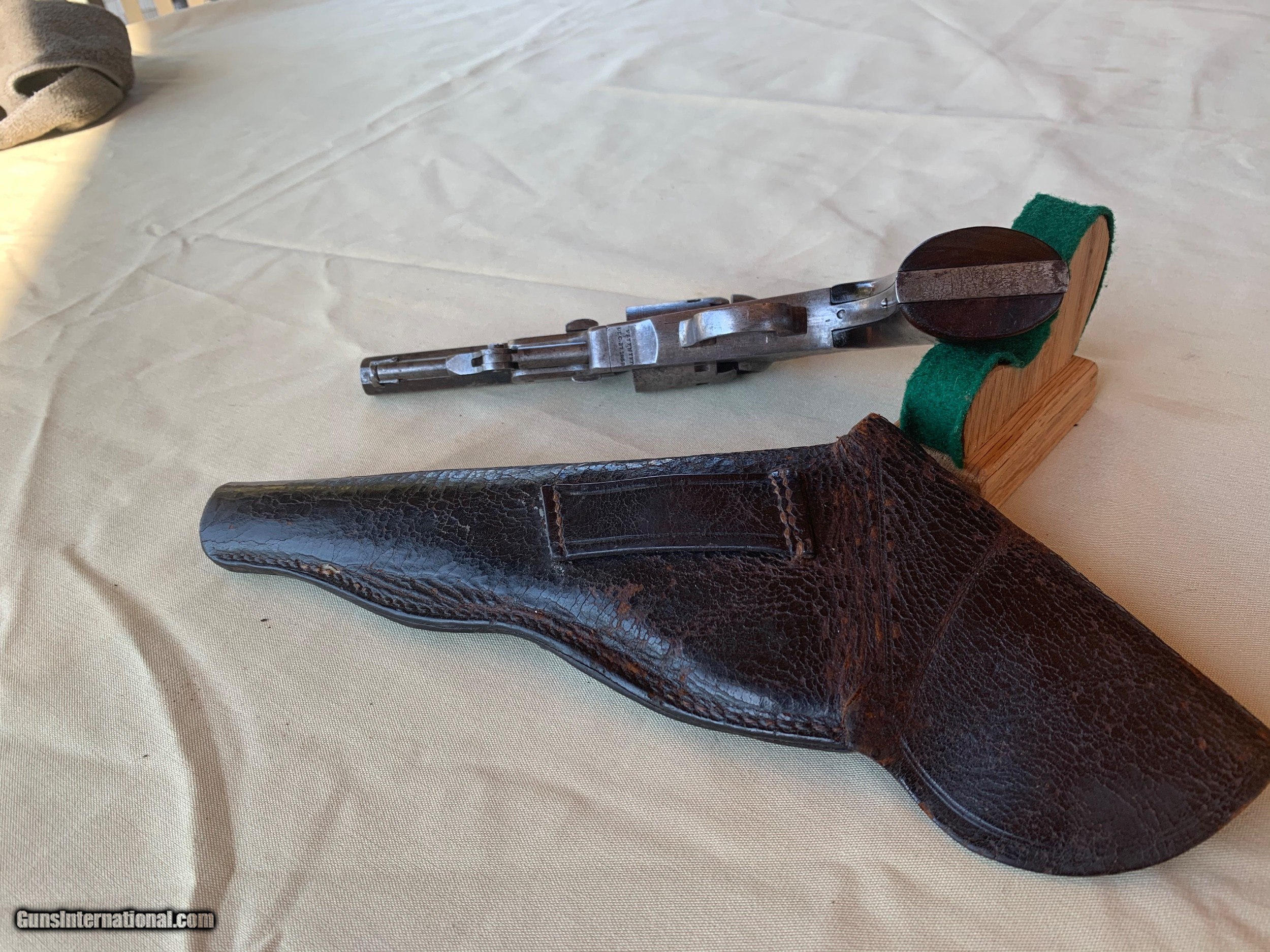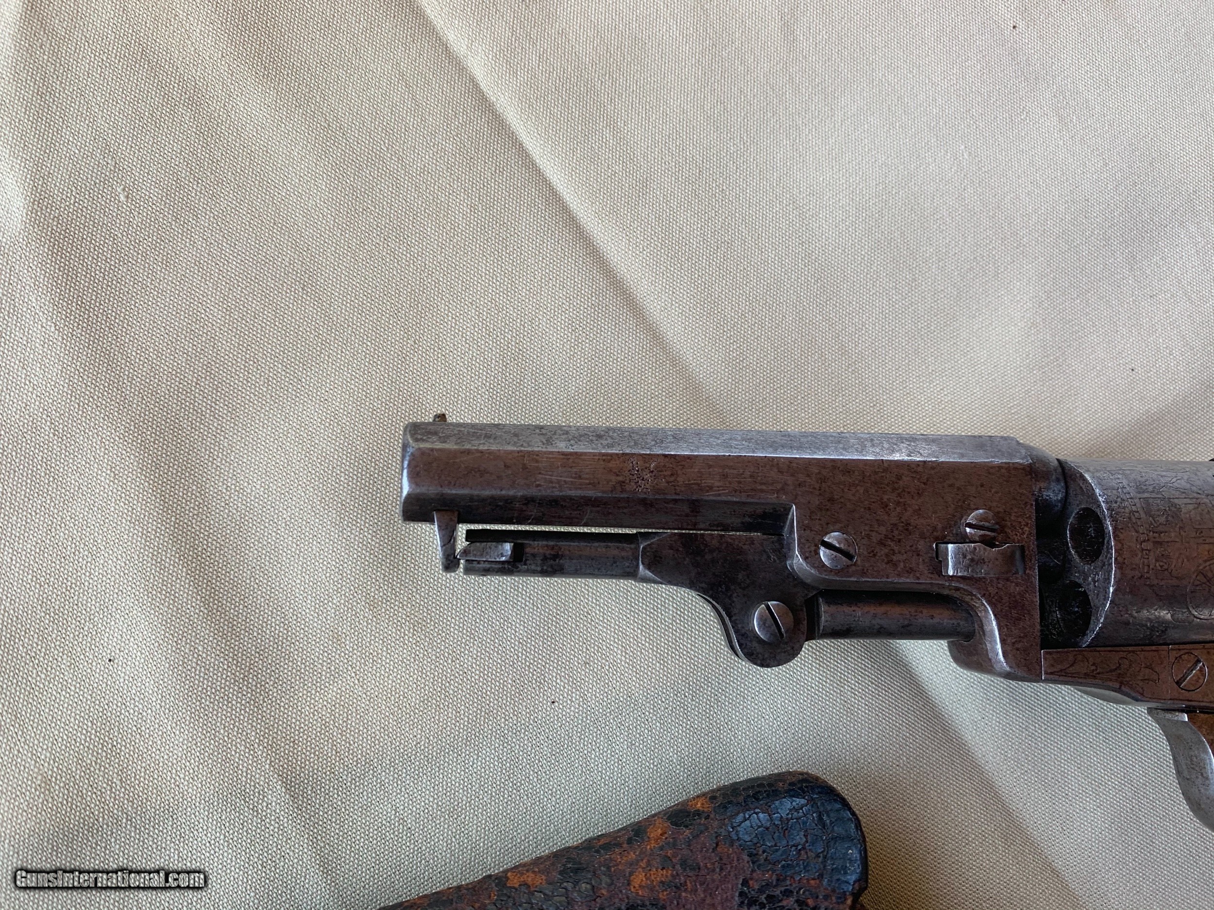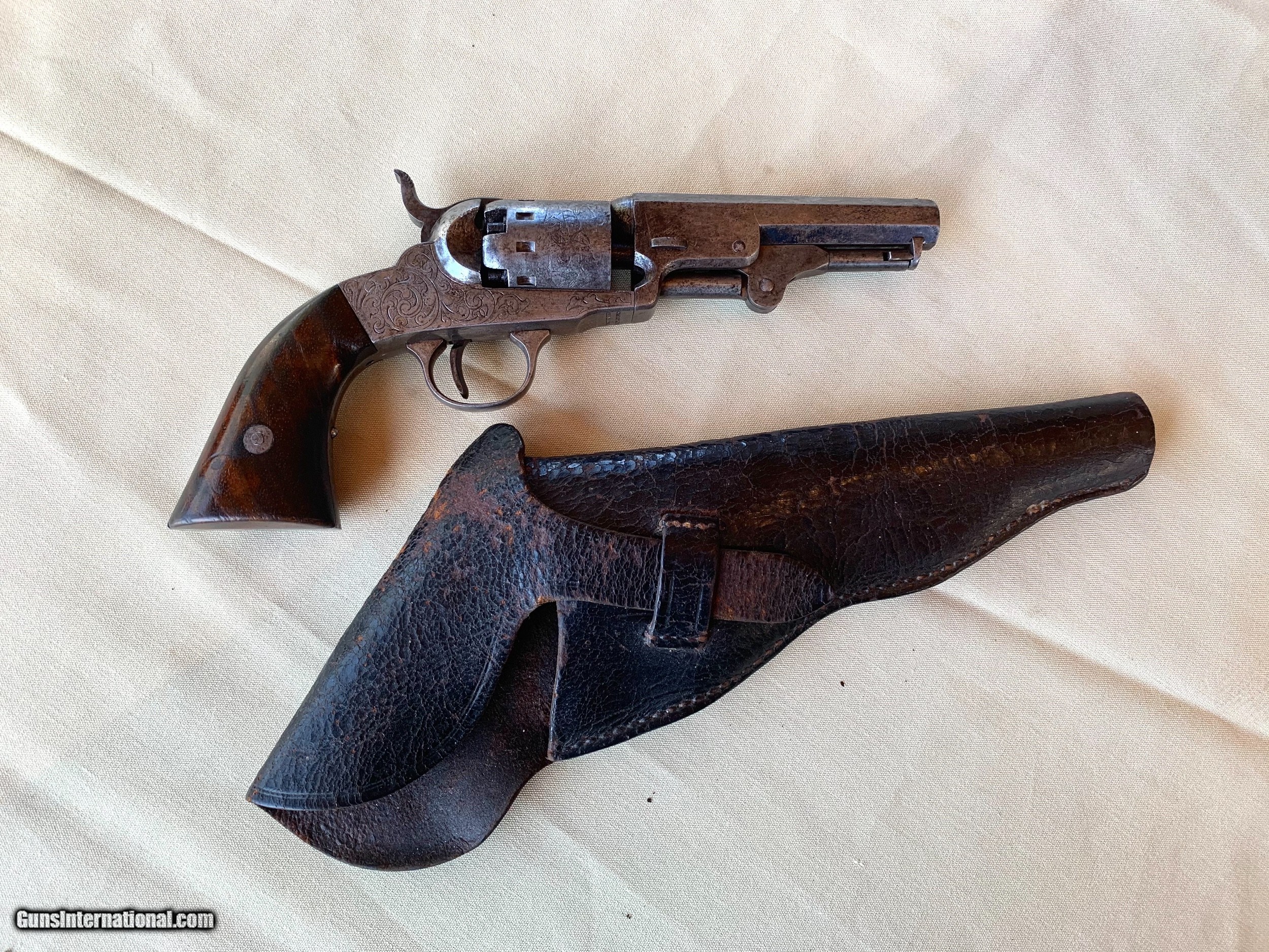 Description: Manhatten Firearms Co. Civil War 31 Caliber Revolver . Factory Engraved With Awsome Burl Walnut Wood Grips . Comes with a Fantastic Period Original Holster . True survivors ! Your talking over 150 years has passed ! Only If These Two items could talk !!!!! Gun is in very good working order . Bore and mechanics are very good plus condition. Most the original finish has gone tiurning to a grey brown mellow patina . Gun is still sharp ! Locks up tight . All the pins are Excellent! This gun will fire with no problem ! The holster is in excellent original condition. Great honest original civil war set ! Please review my photos and email me with any questions ? 3 day inspection as allways . Thank you for looking Little Jo SOLD Antique: Yes Handgun Caliber: .31 Manufacturer: Manhatten Firearms Co. Model: Pocket |