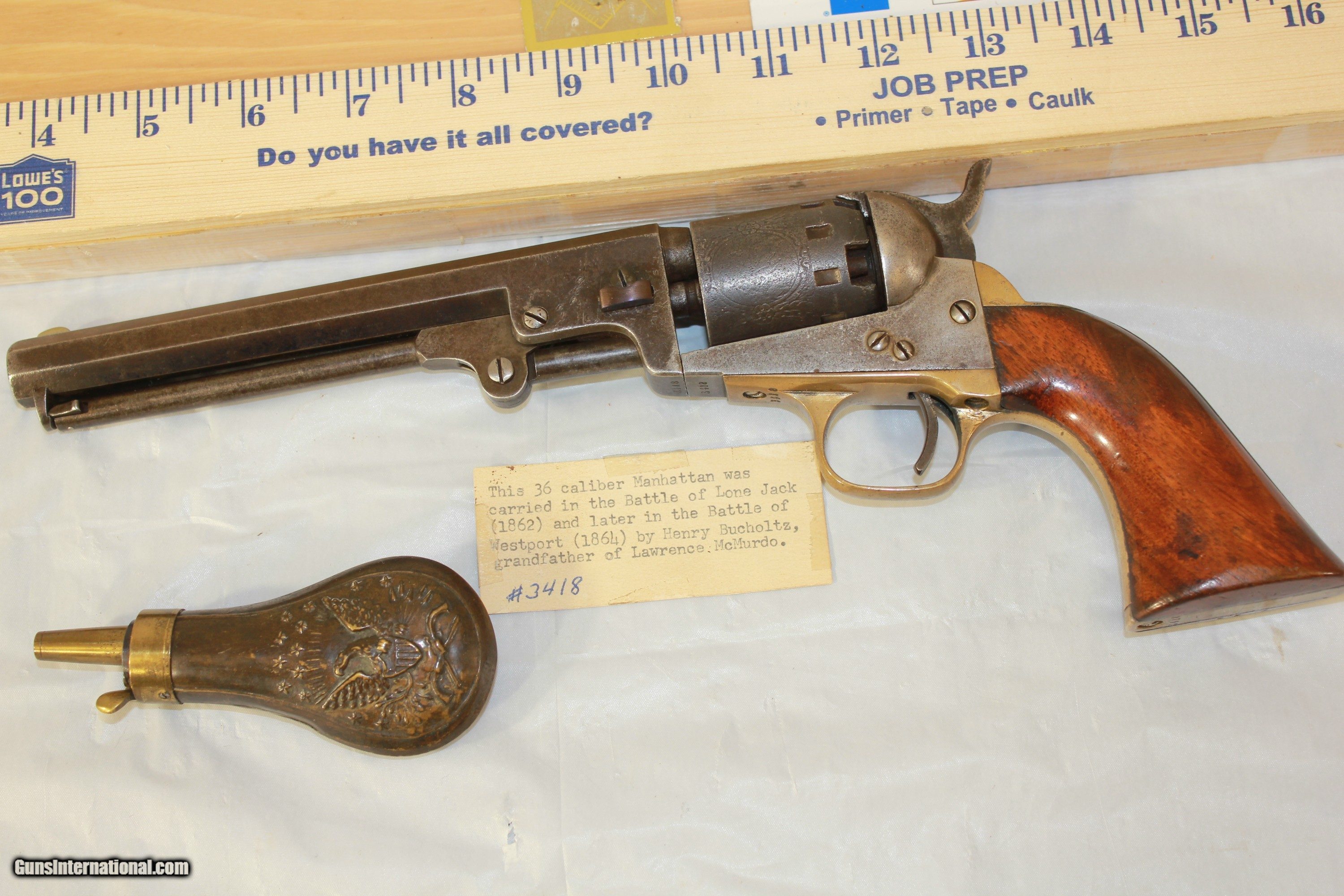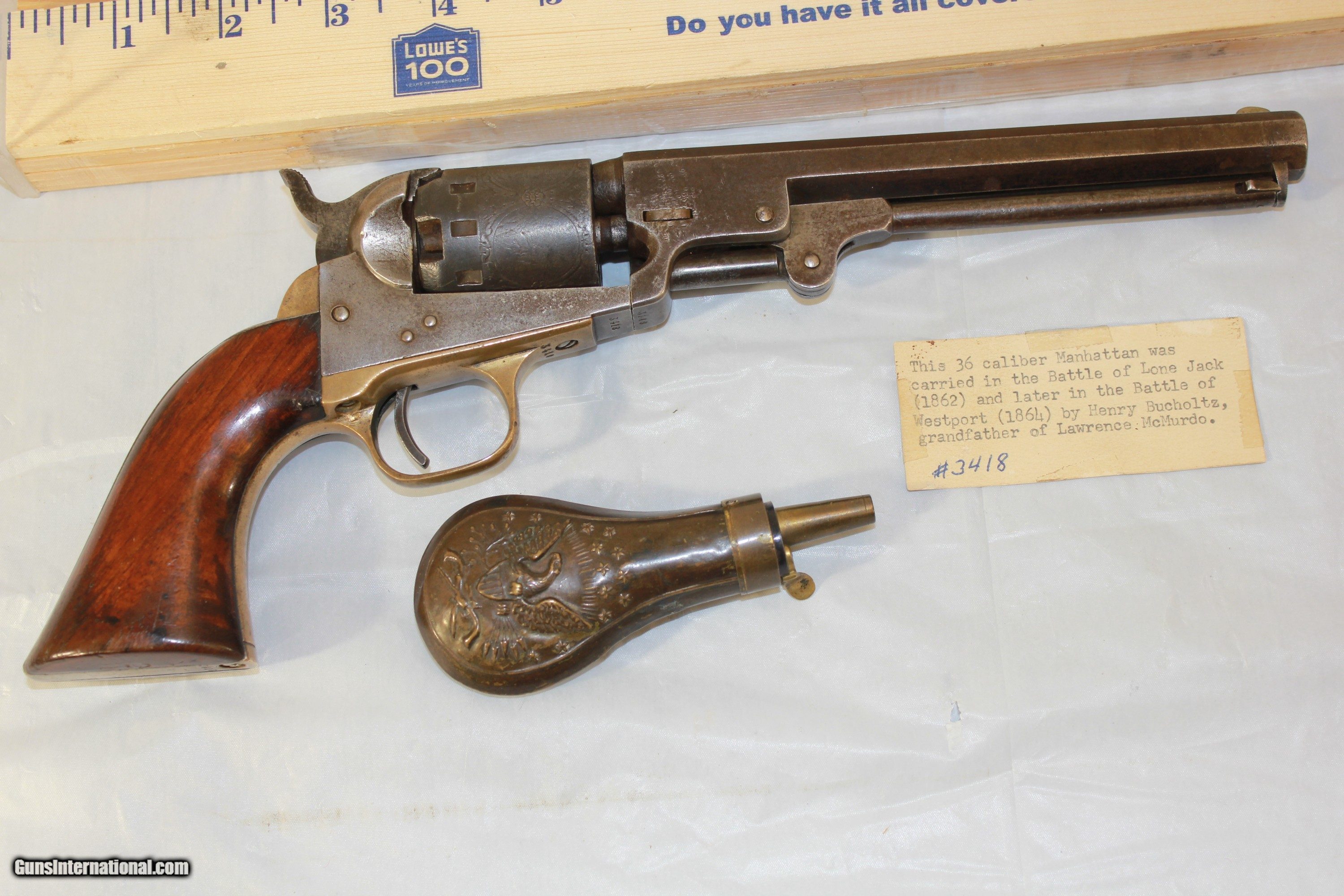 Description: This Manhattan Navy comes with the original Eagle Flask and Provenance. It is documented as being used in at least two battles in Missouri by Henry Bucholtz, The Flask by itself would bring over $250.00. Use the ZOOM to make your evaluation of this historic offering. Antique. Can be delivered to your door. $30.00 shipping via priority Mail SOLD Antique: Yes |