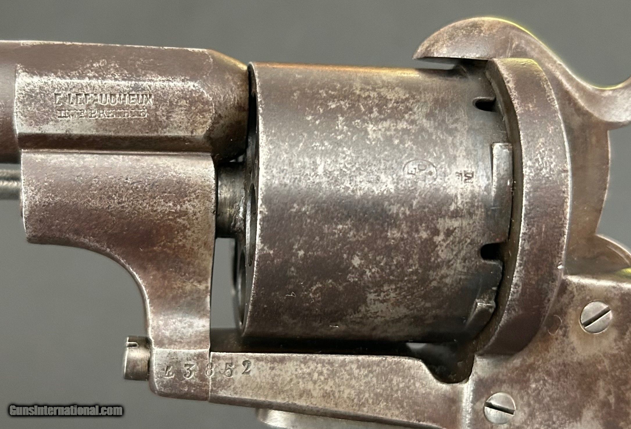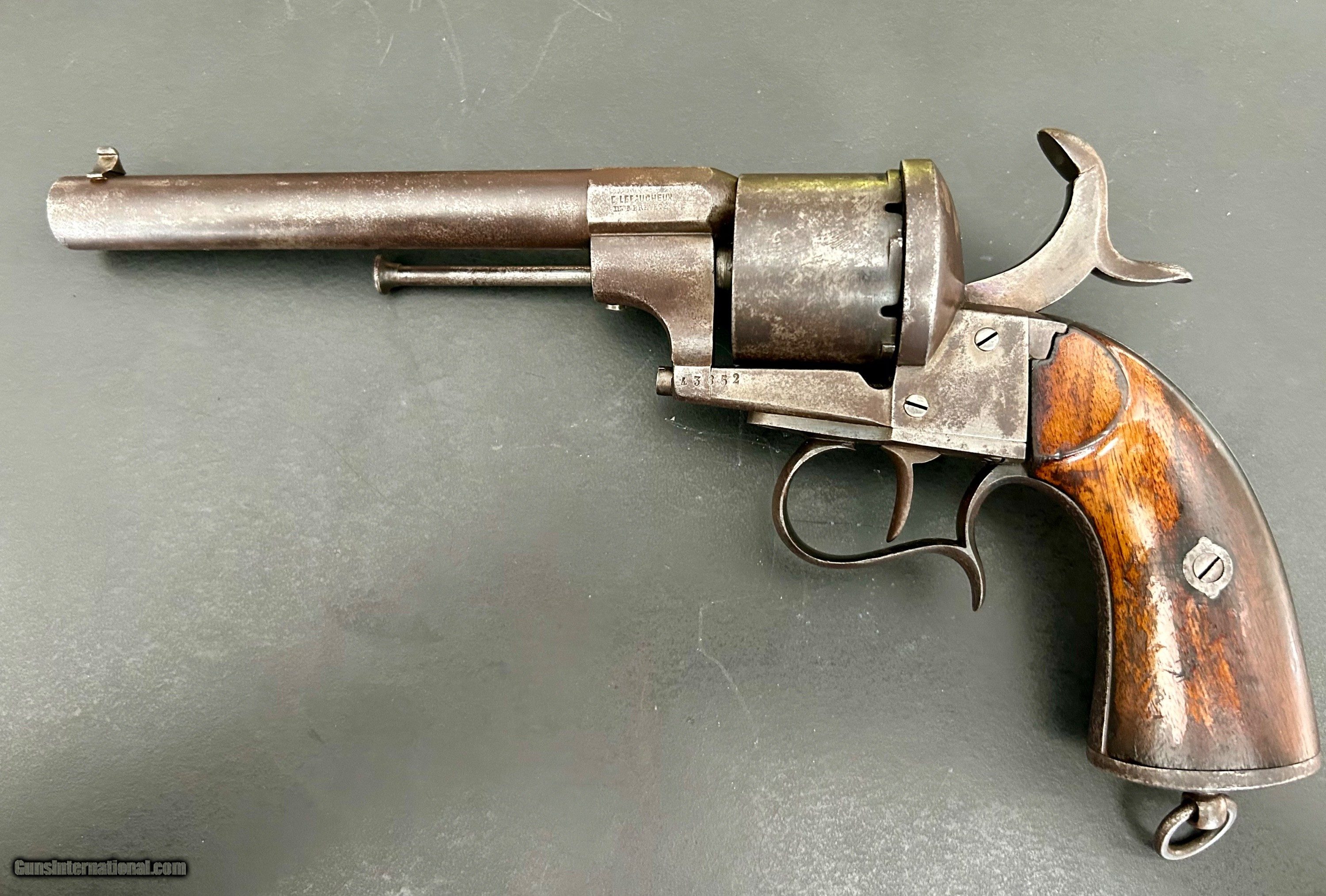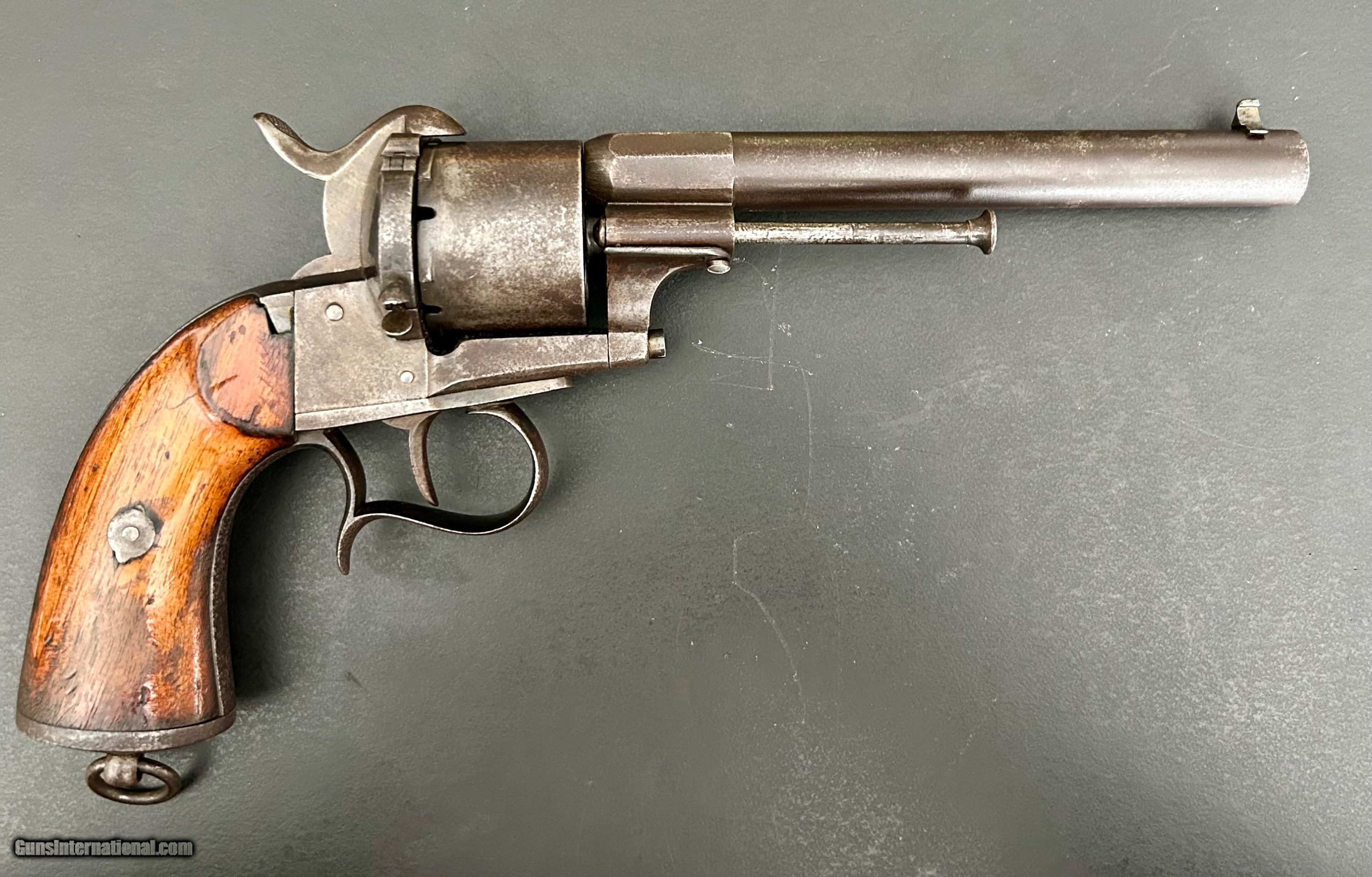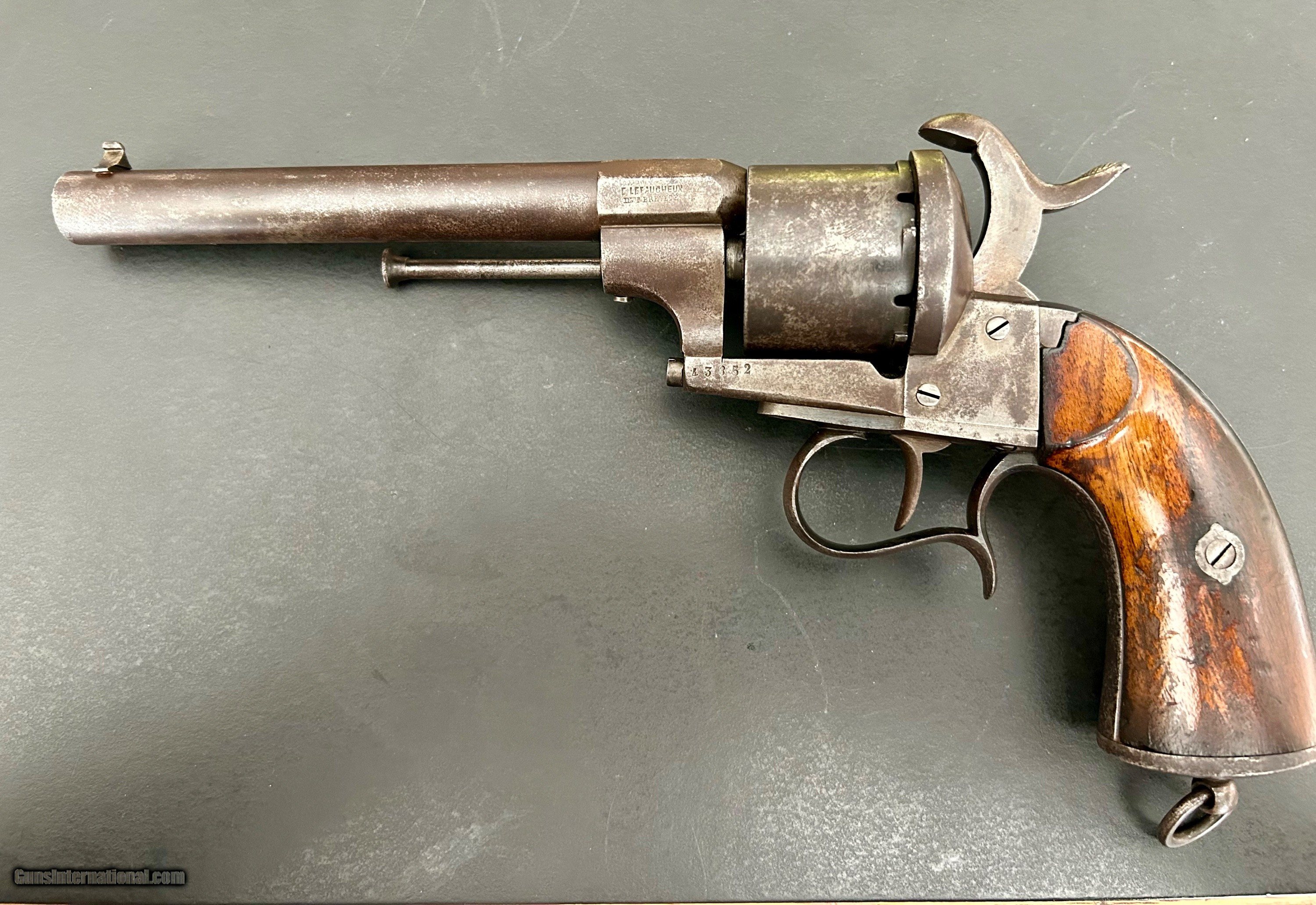 Description: This is a Model 1854 12-mm LeFaucheux pinfire revolver designed and produced by Eugene LeFaucheux, acclaimed French firearm designer/inventor. This is an Army model with the signature spur trigger guard. It is a six-shot, single action military revolver produced at Liege, Belgium. The action is tight, all parts are original, and the markings are sharp. The serial number is 43852. Cylinder is symbol stamped DG, for Gilles Decortis, Belgian cylinder maker. The gun fired a self-contained metallic pinfire cartridge. During the Civil War, this was the only non-percussion revolver issued by the Union and one of the foreign handguns purchased (12,000 total); this gun was Used mainly by Union troops in the Western theater. Many fell into the hands of Trans-Mississippi Confederates. It was apparently not well-liked by either. Overall, the gun is in Very Good condition and a nice example. SOLD Antique: Yes Handgun Caliber: 12mm |