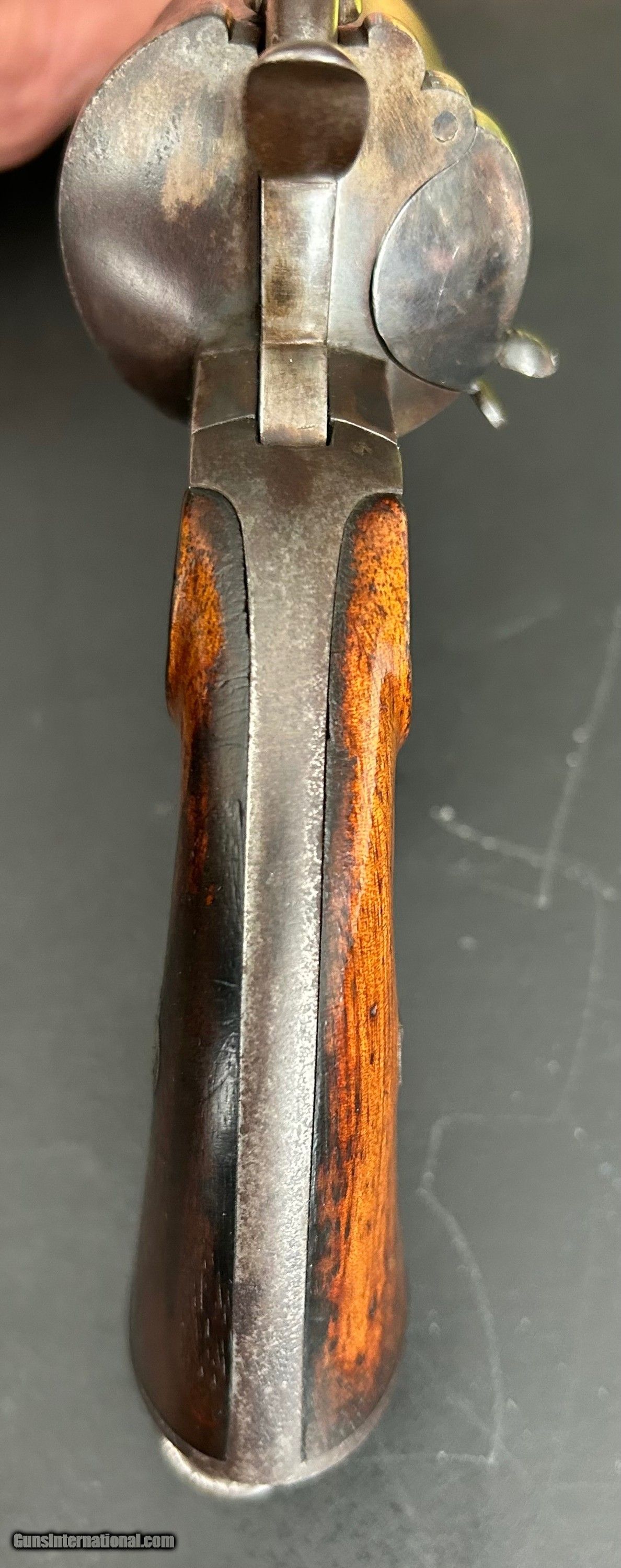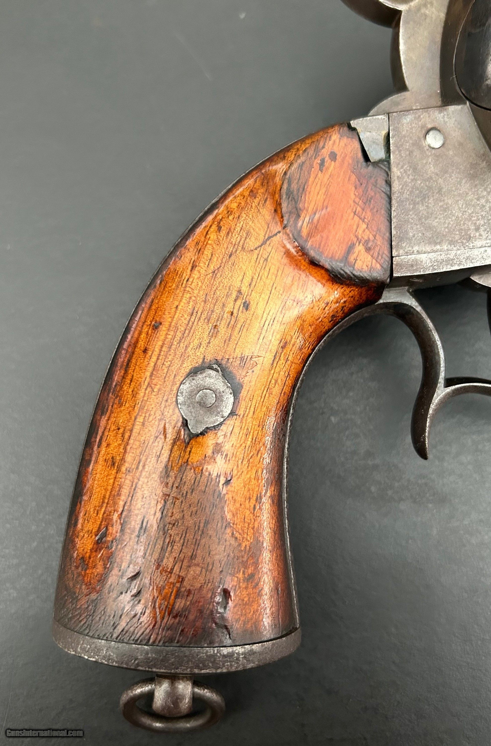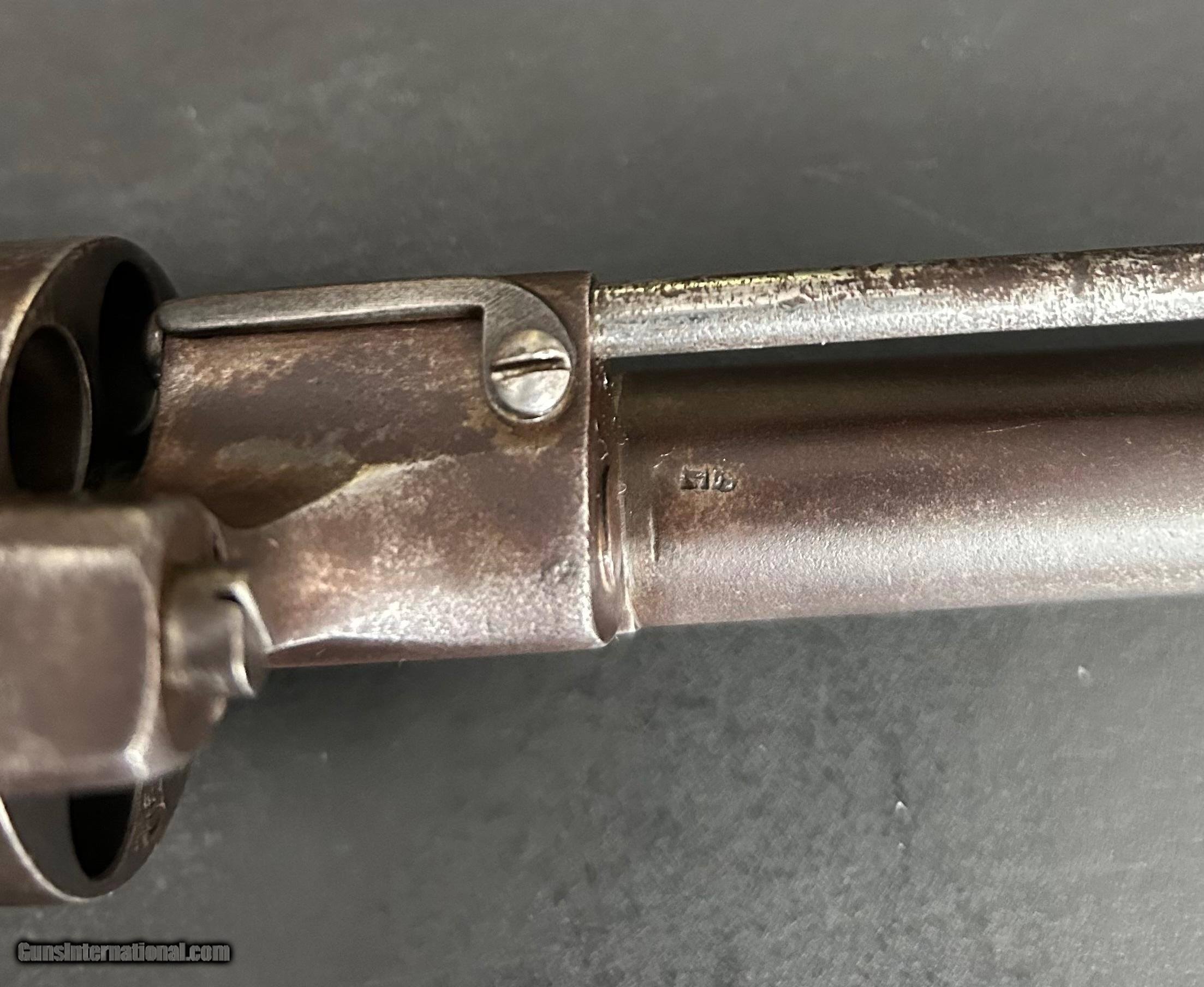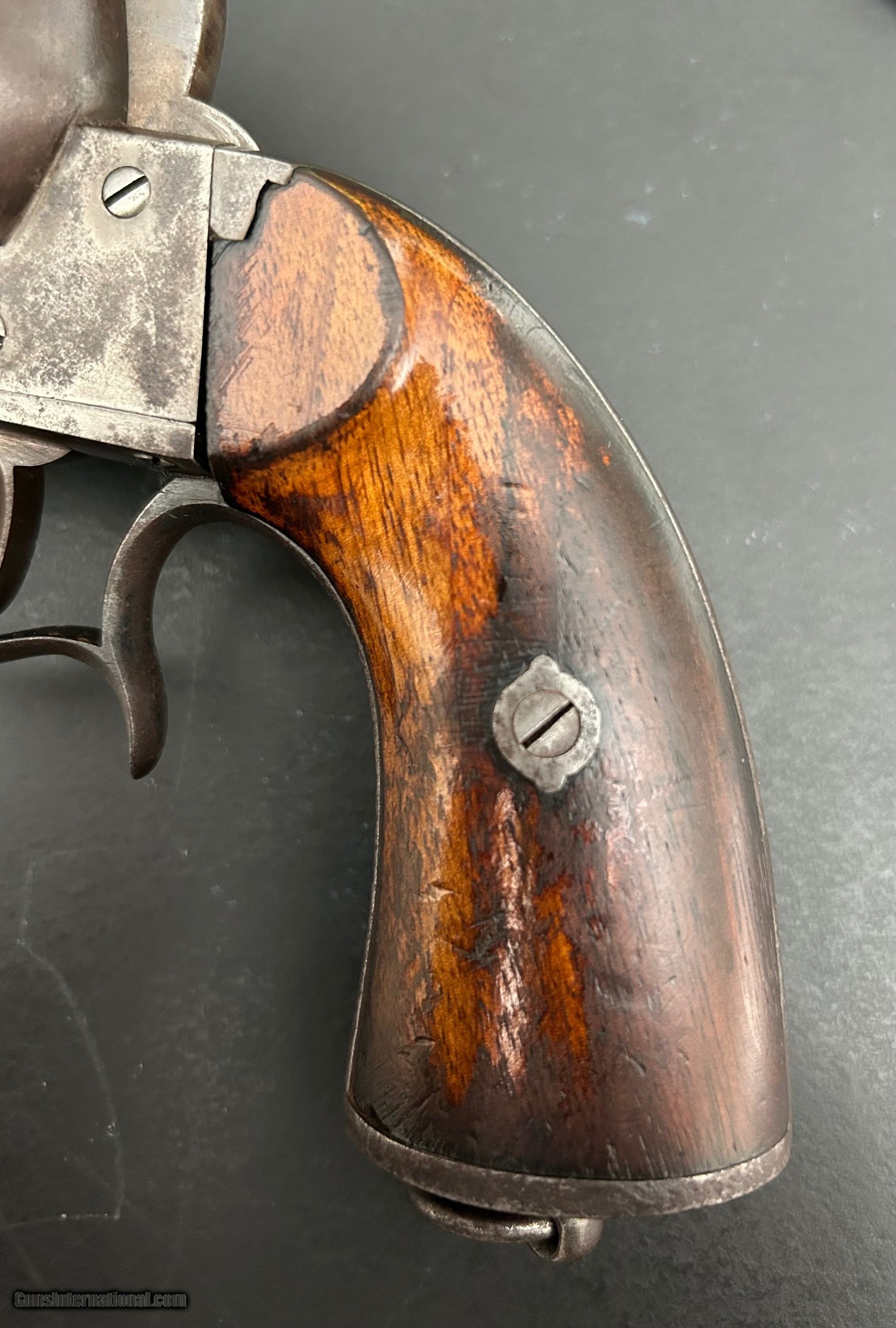Description: This is a Model 1854 12-mm LeFaucheux pinfire revolver designed and produced by Eugene LeFaucheux, acclaimed French firearm designer/inventor. This is an Army model with the signature spur trigger guard. It is a six-shot, single action military revolver produced at Liege, Belgium. The action is tight, all parts are original, and the markings are sharp. The serial number is 43852. Cylinder is symbol stamped DG, for Gilles Decortis, Belgian cylinder maker. The gun fired a self-contained metallic pinfire cartridge. During the Civil War, this was the only non-percussion revolver issued by the Union and one of the foreign handguns purchased (12,000 total); this gun was Used mainly by Union troops in the Western theater. Many fell into the hands of Trans-Mississippi Confederates. It was apparently not well-liked by either. Overall, the gun is in Very Good condition and a nice example. SOLD Antique: Yes Handgun Caliber: 12mm |