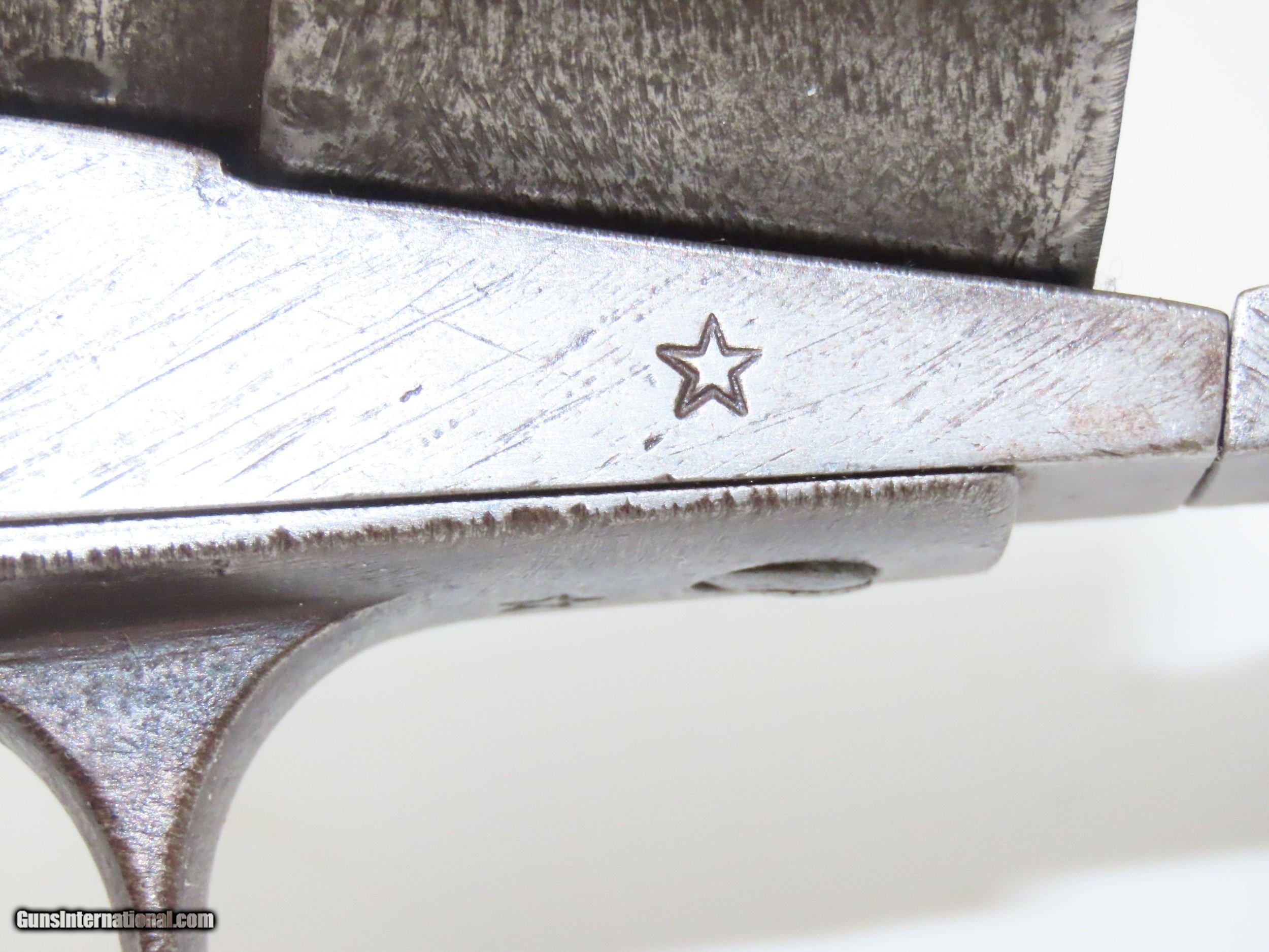 Description: ONE-OF-A-KIND Inscribed CONFEDERATE Copy of a COLT 1860 ARMY Revolver .44 “C.S” Marked w Reference to BATTLE of TUPELO, MS! Here we present an antique Handmade Copy of a Colt Model 1860 Army Revolver in .44, marked with references to Colonel H.P. Mabry & Private Upton Crooks, both Confederate soldiers in the War Between the States. Even without the inscriptions—which cover both sides as well as the top and bottom of the barrel—this revolver is a fascinating study. There is no doubt that the maker used the Colt Model 1860 Army as his muse—a refined, reliable, and very lethal weapon if ever there was one. This specimen may be less refined but is undoubtedly very functional and equally lethal. Similarities to the Colt include the overall profile, to include the 8-inch round barrel and rebated 6-shot .44 caliber cylinder. However, the construction of this piece is completely of iron. Differences are numerous between the two, primarily having to do with the means of manufacture employed. Asymmetry will be noticed throughout, which was a result of the heavy use of a file in order to shape this gun and is further evidenced by the very noticeable file marks on the entire exterior of the piece. Right away one will notice the barrel wedge, which is rather blockier than the flat, grooved wedge of the Colt. This one lacks the retainer screw for the wedge as well. Looking inside to the cutout on the cylinder arbor, you will notice that it is not nicely centered but high up and causing the material on top to be quite thin. The recoil shield is next and is again asymmetrical as seen from the back of the gun. Unlike the Colt, which has a fully rounded and complete recoil shield (aside from the cutouts for priming and for the attachable shoulder stock), this one tapers on both sides from the top down, joining the bottom portion of the frame where it turns completely flat. The left “lobe” of the recoil shield is a bit larger than the right. Turning our attention to the bottom of the revolver, you will notice how thin the material was connecting the barrel assembly to the front of the frame; it is so thin, in fact, that the shaping with a file of that area actually broke through to expose the mounting pins within. The creeping loading lever too, bears great resemblance to the Colt’s, however, it was shaped by hand with a file and the cogs are not perfectly uniform. The profile of the grip strap shows a full and “pregnant” look, rather than flat with parallel edges. The holes for the screws for the hammer, trigger, and cylinder stop are not concentric. The hammer does not have any checkering on the spur. The bore is .44 caliber but is smooth and devoid of any remnant of rifling. Bore also not perfectly concentric as observed at the muzzle. 5-pointed stars may be seen throughout on the right side of the frame, the front of the trigger guard, the loading lever, and the inside of the grip frame (under the grip). As mentioned above, there are inscriptions cut throughout. Perhaps the most mysterious one being the “J.W.J.” on the backstrap. Clearly these are initials. “C.S.” with a 5-pointed star between is marked on the right side of the barrel assembly just behind the loading lever. “TUPELO (HARRISBURG) MISS. JULY 15th 1864” is inscribed on the right side of the barrel, “COL. H.P. MABRY ~ 3RD KY. CAV. 1863 C.S.A.” on the left, “UPTON CROOKS 1848-1933 3RD KY. CAV. C.S.A” on the top, and “Upton S. Crooks St. Joseph, Mo. 1848” on the bottom. “COL. H.P. MABRY ~ 3rd KY. CAV. 1863 C.S.A.” Hinche Parham Mabry was a Texas State Legislator in the antebellum period beginning with his election in 1856. During his last year as state representative, Mabry saw the dawn of the Civil War (1861), and even though he opposed secession, he cast his lot with his state of Texas and the Confederacy. Quickly, in May of 1861 he served among the ranks in a volunteer expeditionary force that took command of two Federal Forts in Indian Territory. In the following month, he joined the 3rd Texas Cavalry and was promoted shortly thereafter to Captain. Mabry saw action at the Battles of Elkhorn and Iuka, being severely wounded and taken prisoner in the latter. After being released in a prisoner exchange in late 1862, he was promoted to Colonel and became commander of a brigade of units from Louisiana, Mississippi, and Arkansas. Stationed at Mississippi in 1864, he and his men captured the Federal gunboat “Petrel”. His latter service saw him serve under General Nathan Bedford Forrest, and attempt to cut off Union supply routes that were the logistical tail of General Sherman’s brutal drive to Atlanta. The Battle of Tupelo (also known for nearby Harrisburg) was a part of this effort. “Upton S. Crooks St. Joseph, Mo. 1848” & “UPTON CROOKS 1848-1933 3rd K.Y. CAV. C.S.A.” Upton Crooks was born circa 1848 in St. Joseph, Missouri as is indicated on the bottom of the barrel. This inscription is different from the others as a different and smaller font was used and the letters are not all capitalized. We believe this is original to the period during which the revolver was used. Crooks enlisted and mustered into H Company of the 3rd Kentucky Mounted Infantry on 1 April 1864. “TUPELO (HARRISBURG) MISS. JULY 15th 1864” This is the tie between Mabry and Crooks, both of them having served under Forrest during this timeframe in Mississippi and each having a part of the action in the Battle of Tupelo 15-16 July 1864. The Union forces would eventually overcome the Confederates but after a protracted and pitched battle that took place over about 10 miles of ground. It comes in a very fitting black leather holster. It is an open-top design with a high side on the back that curves around to the front to shield the gun from brush when riding. The back is cut to allow it to slide onto a wide belt (about 2-3/4 inches). The seam is secured by large leather cord. A large star emblem adorns