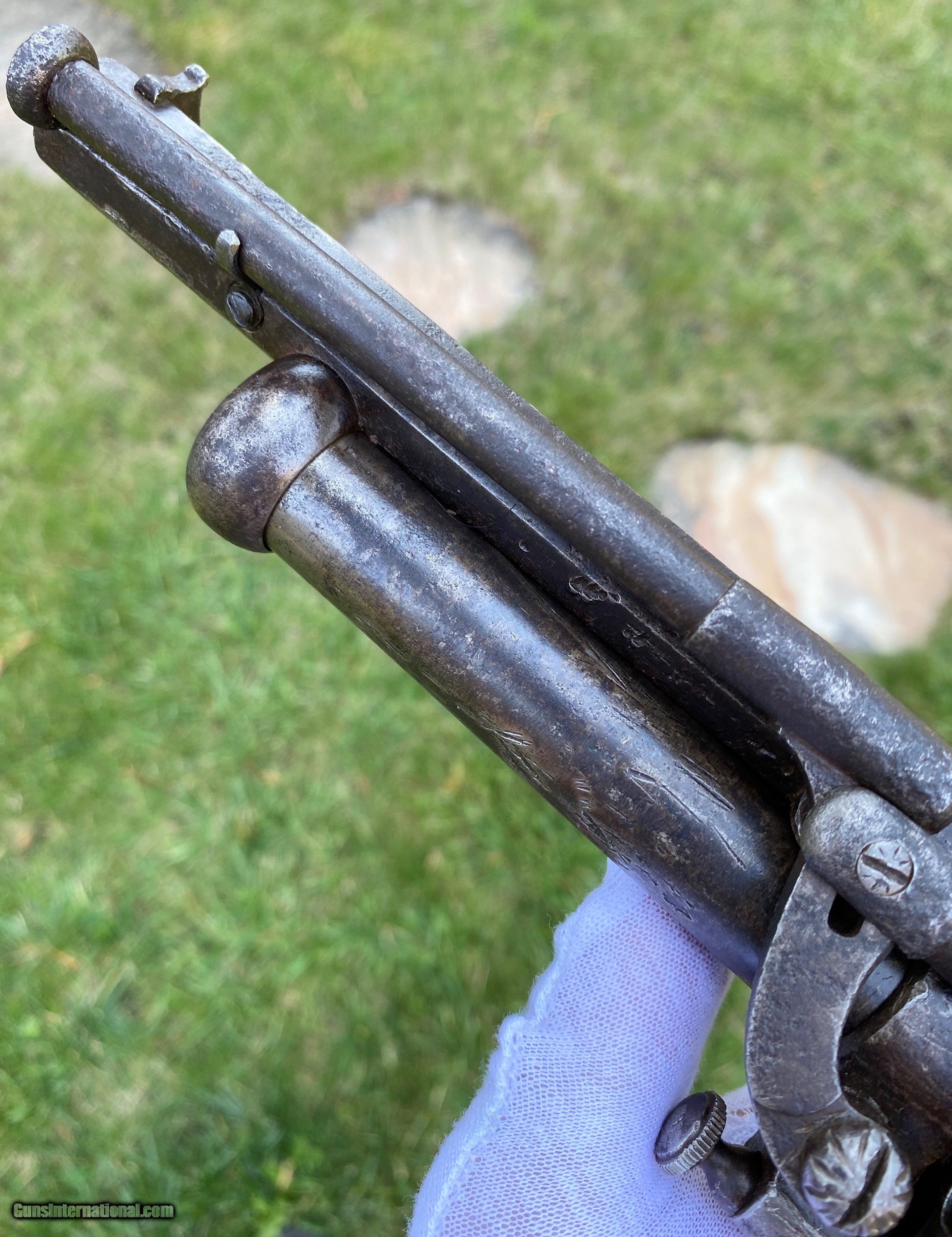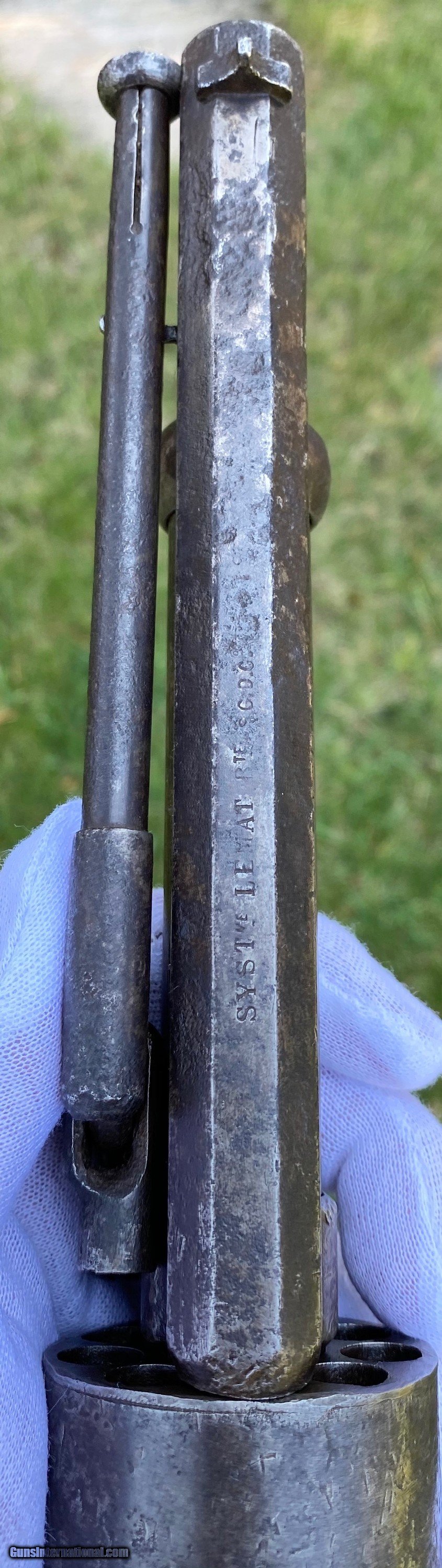 Description: This is an authentic Confederate LeMat Revolver, this example shows pitting throughout the entirety of the revolver. The grips are very good condition. There are British proofs found on the barrel and the cylinder, as it appears after the War this went overseas. The proper "LM" "star" is found on the barrel. Serial number 2369. Mechanically the revolver functions excellent and is tight. If your looking for a LeMat that is affordable and has the "been there, done that" attitude, this is it. Shipping is $30 plus actual insurance. Buyer can choose how much insurance they want to put on the package. Sale Pending SOLD Antique: Yes |