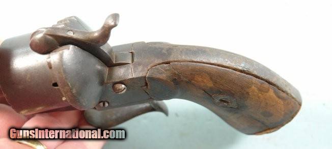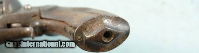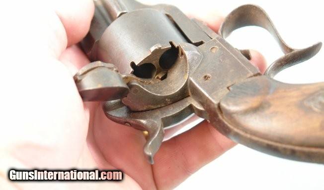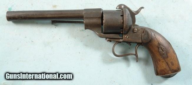 Description: ORIGINAL CIVIL WAR LEFAUCHEUX 12MM PINFIRE MODEL 1854 ARMY REVOLVER CIRCA 1862-5. Type used on both sides during the Civil War but more closely associated with the Confederacy which imported several thousand during the war. General Stonewall Jackson carried a similar engraved version of the Lefaucheux Pinfire Revolver. Six shot double action with 6 ½” round barrel. In genuine “barn find” semi relic condition with the original dark patina on metal and the original grips. All original but not in operating condition missing internal parts and mainspring and trigger broken but nice looking display piece for a Civil War collection at a reasonable price. SOLD Antique: Yes Handgun Caliber: 12mm |