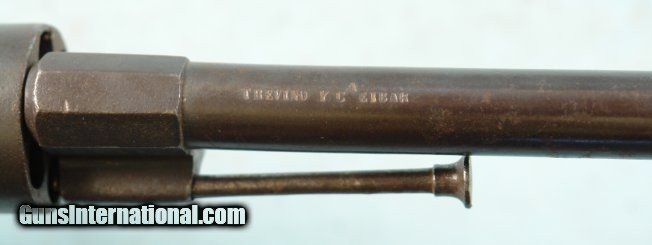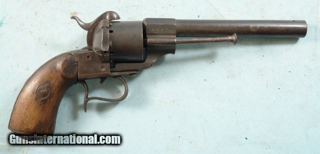 Description: ORIGINAL CIVIL WAR LEFAUCHEUX 12MM PINFIRE MODEL 1854 ARMY REVOLVER CIRCA 1862-5. Type used on both sides during the Civil War but more closely associated with the Confederacy which imported several thousand during the war. General Stonewall Jackson carried a similar engraved version of the Lefaucheux Pinfire Revolver. Six shot double action with 6 ½” round barrel. In genuine “barn find” semi relic condition with the original dark patina on metal and the original grips. All original but not in operating condition missing internal parts and mainspring and trigger broken but nice looking display piece for a Civil War collection at a reasonable price. SOLD Antique: Yes Handgun Caliber: 12mm |