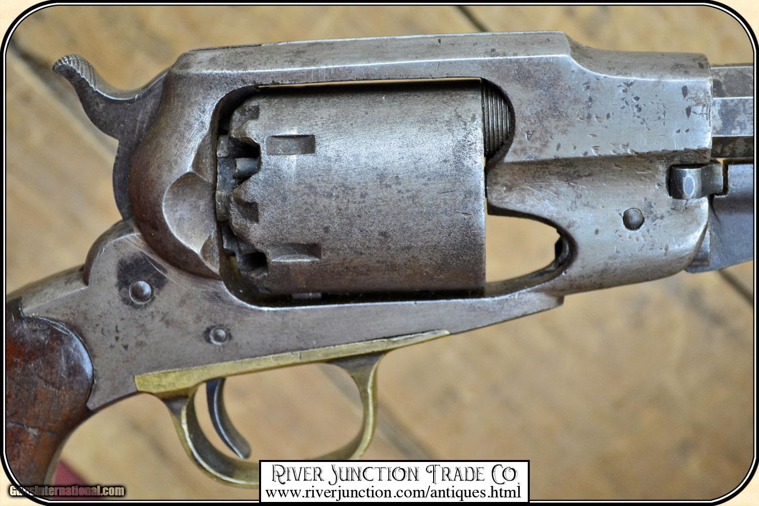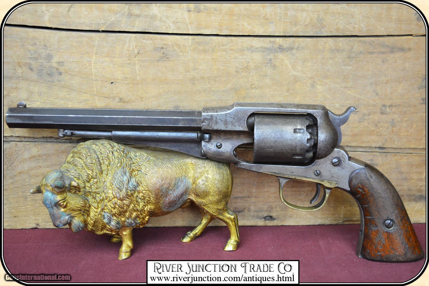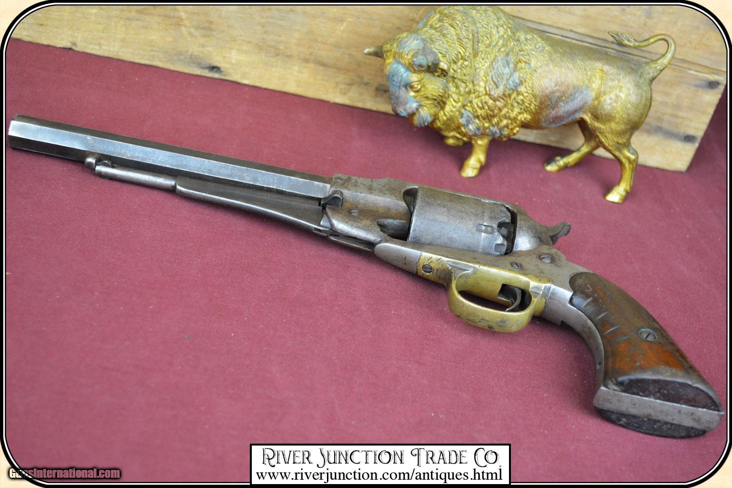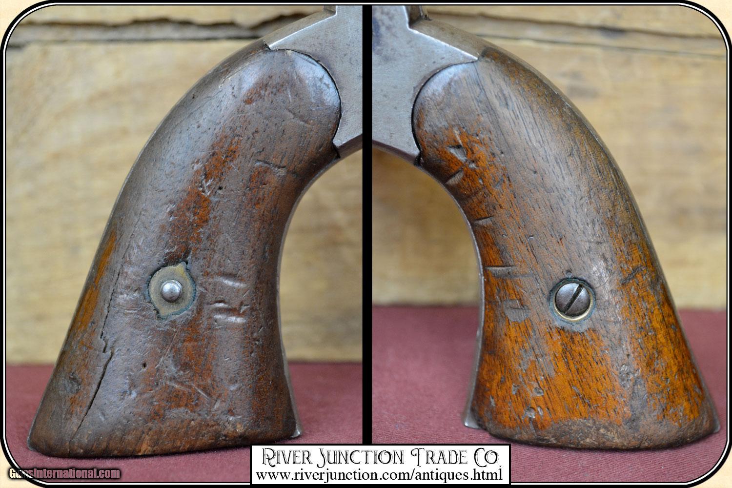 Description: Original Remington Model 1861 Army Revolver CIVIL WAR , AKA Old Model Army 44 cal Bore bright and shinny, Mechanicaly perfect, Original Grips show some varnish and cracked but all there. Has an 8” oct barrel with faded Markings are light but readable. Serial # 6821. Metal overall has an aged grey finish with some fine pitting in areas. On the inside of the right grip is boldly marked "I. O. S. 1885". This is an ANTIQUE and can be shipped directly to you. (adult signature required) Sold as an Antique ~ no guarantees, warranties, or liabilities for any actual usage. If any firearms are to be used for shooting purposes, a qualified gunsmith should inspect them first. We will ship antique guns over seas. Payment Cash, postal money order, cashiers check, personal & business checks. Can be ordered with a credit card or paypal at wxx.riverjunction,cxx just type in the number 4506 in the search box. SOLD |