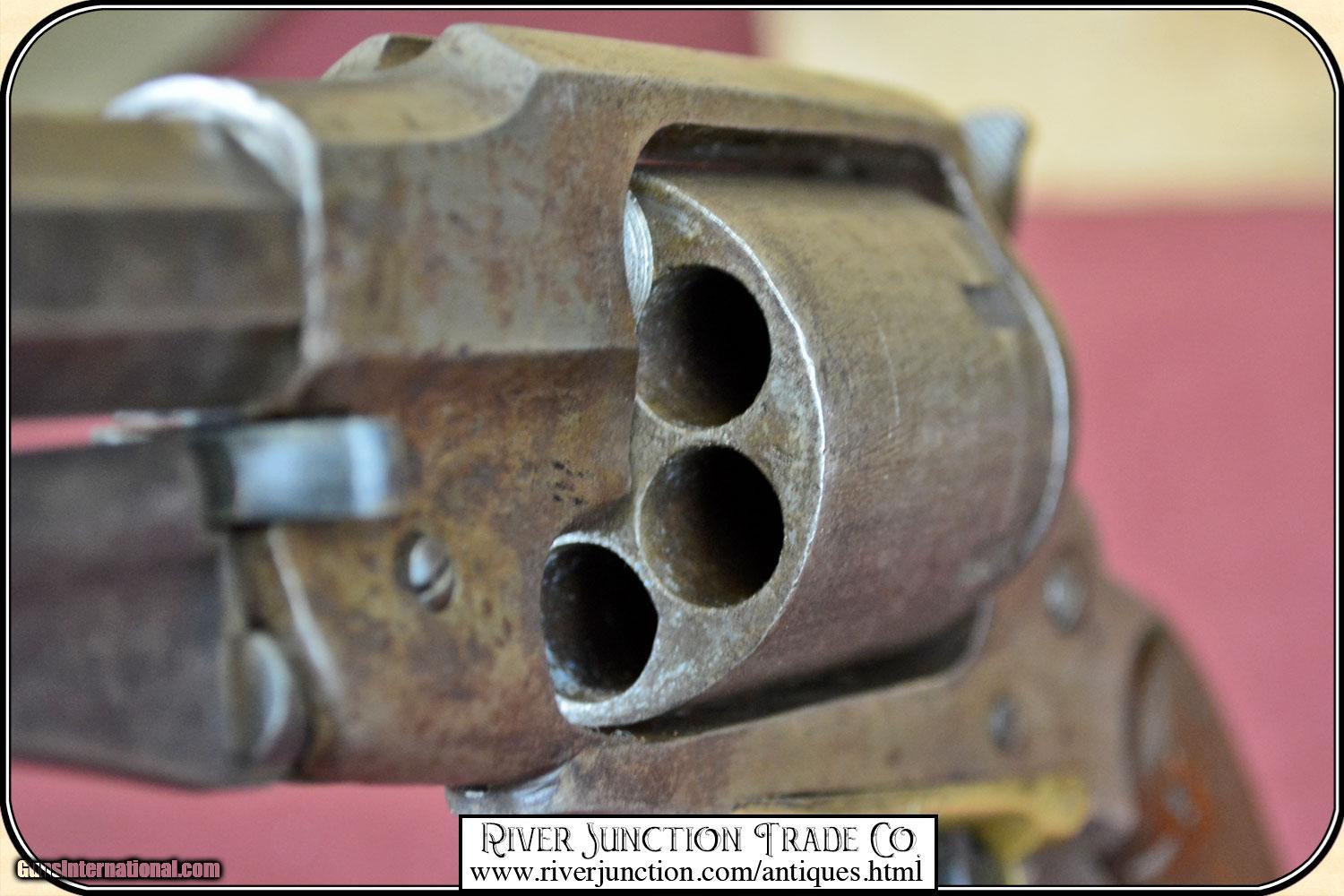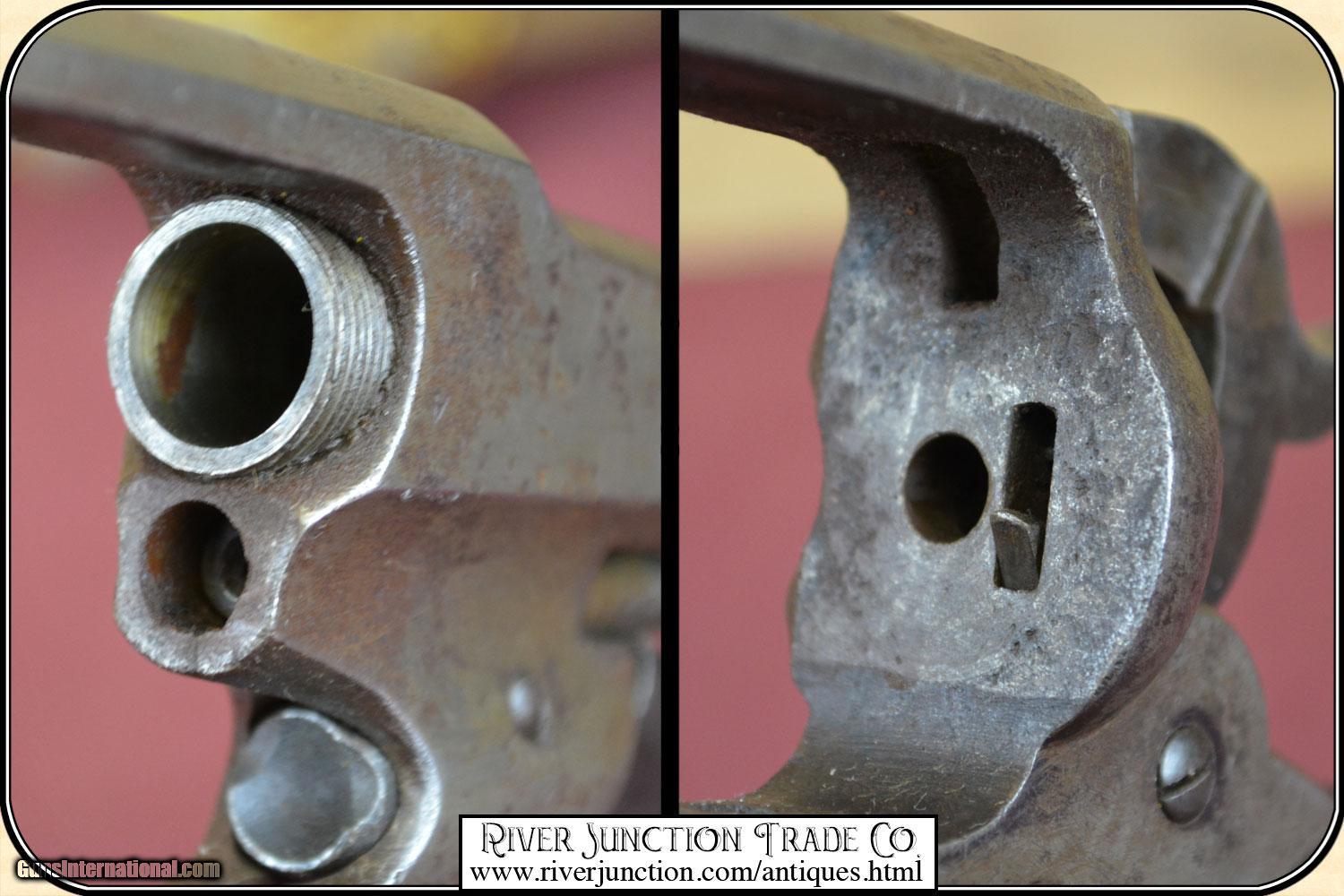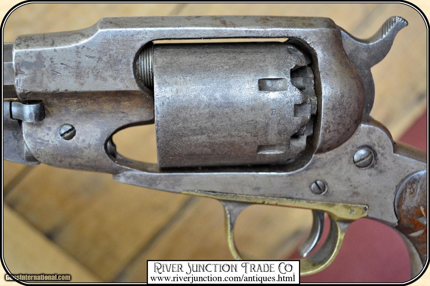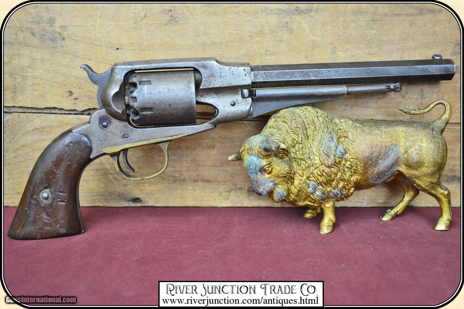 Description: Original Remington Model 1861 Army Revolver CIVIL WAR , AKA Old Model Army 44 cal Bore bright and shinny, Mechanicaly perfect, Original Grips show some varnish and cracked but all there. Has an 8” oct barrel with faded Markings are light but readable. Serial # 6821. Metal overall has an aged grey finish with some fine pitting in areas. On the inside of the right grip is boldly marked "I. O. S. 1885". This is an ANTIQUE and can be shipped directly to you. (adult signature required) Sold as an Antique ~ no guarantees, warranties, or liabilities for any actual usage. If any firearms are to be used for shooting purposes, a qualified gunsmith should inspect them first. We will ship antique guns over seas. Payment Cash, postal money order, cashiers check, personal & business checks. Can be ordered with a credit card or paypal at wxx.riverjunction,cxx just type in the number 4506 in the search box. SOLD |