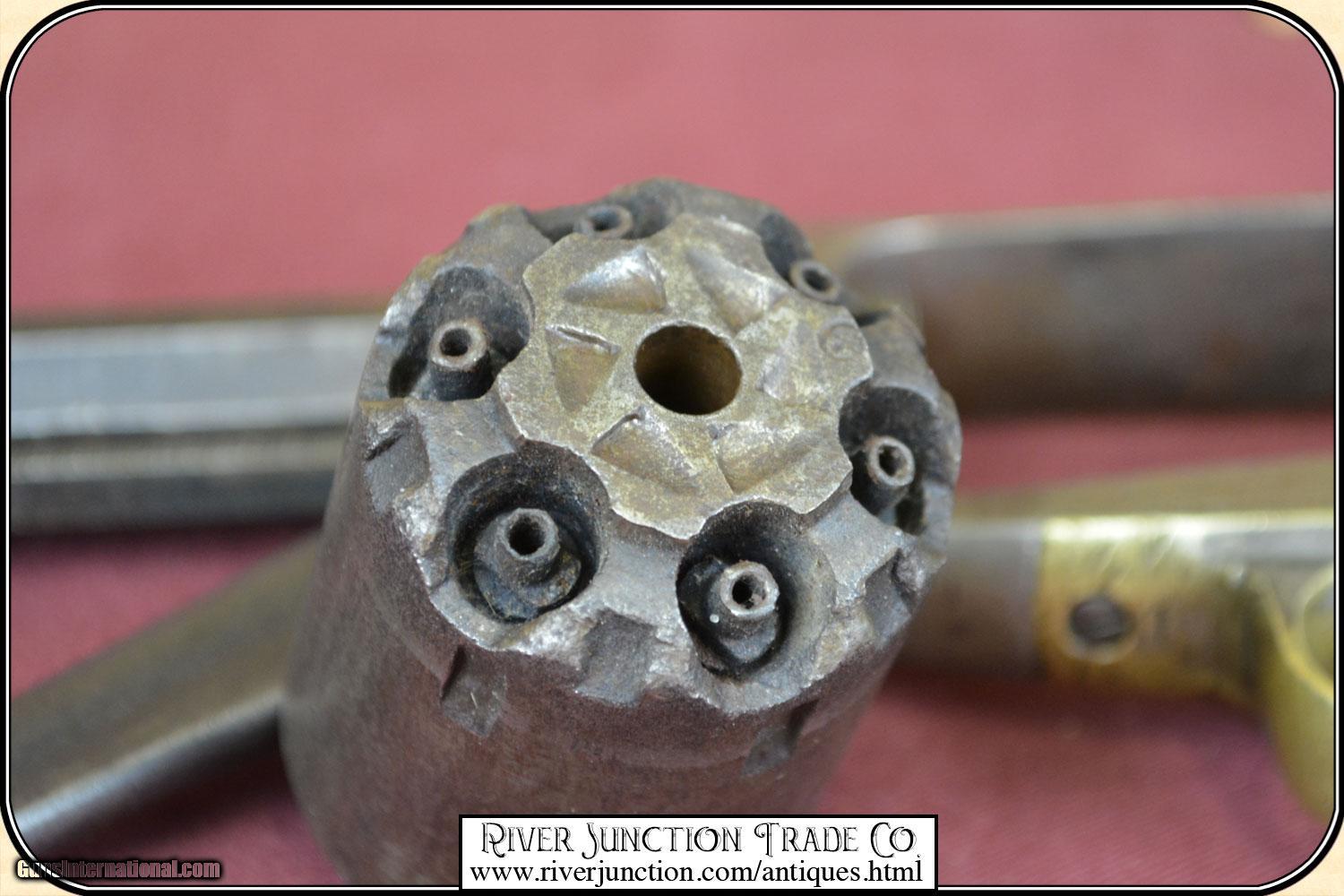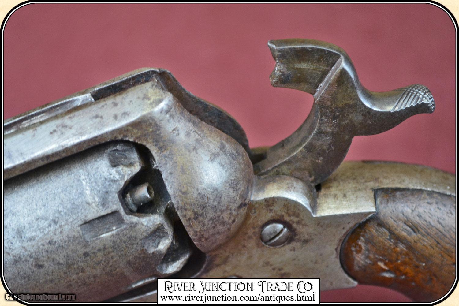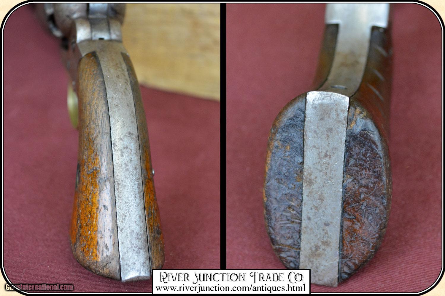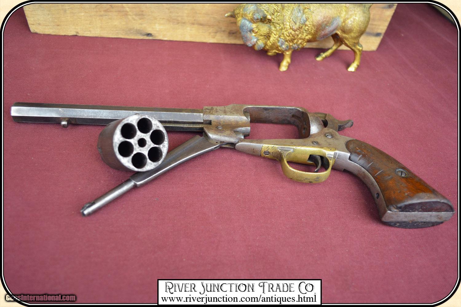 Description: Original Remington Model 1861 Army Revolver CIVIL WAR , AKA Old Model Army 44 cal Bore bright and shinny, Mechanicaly perfect, Original Grips show some varnish and cracked but all there. Has an 8” oct barrel with faded Markings are light but readable. Serial # 6821. Metal overall has an aged grey finish with some fine pitting in areas. On the inside of the right grip is boldly marked "I. O. S. 1885". This is an ANTIQUE and can be shipped directly to you. (adult signature required) Sold as an Antique ~ no guarantees, warranties, or liabilities for any actual usage. If any firearms are to be used for shooting purposes, a qualified gunsmith should inspect them first. We will ship antique guns over seas. Payment Cash, postal money order, cashiers check, personal & business checks. Can be ordered with a credit card or paypal at wxx.riverjunction,cxx just type in the number 4506 in the search box. SOLD |