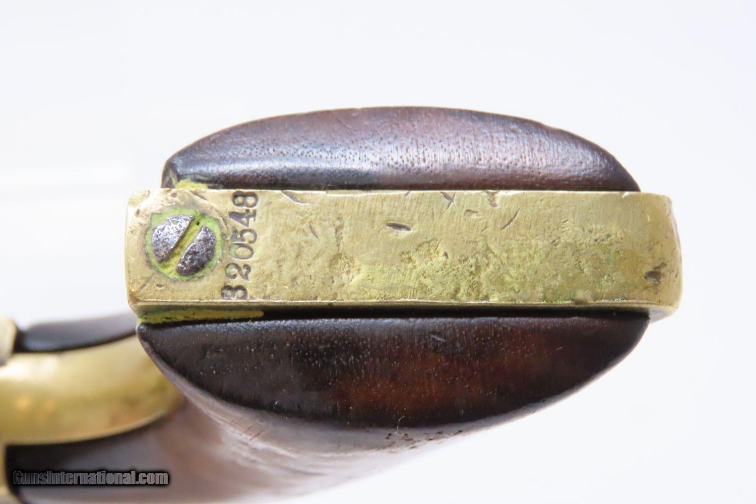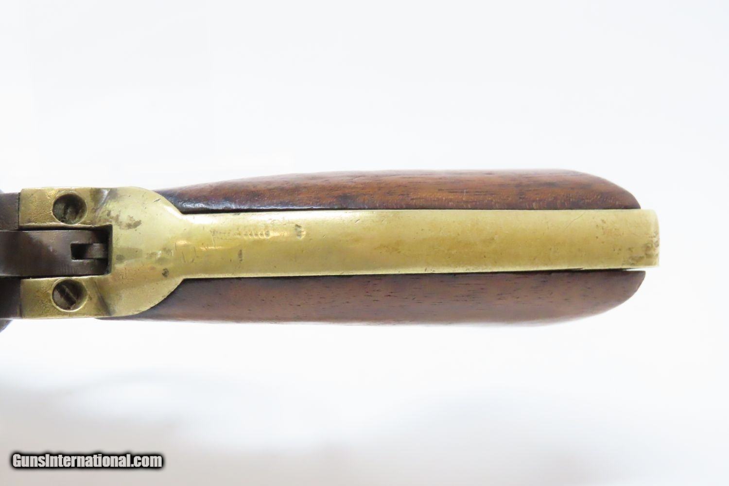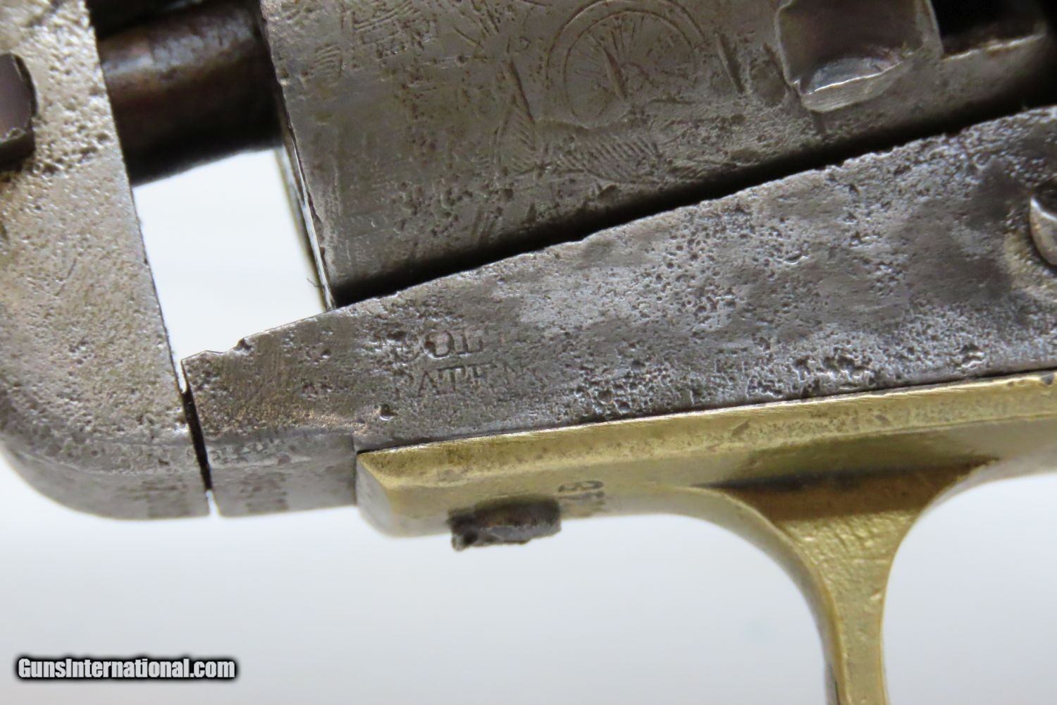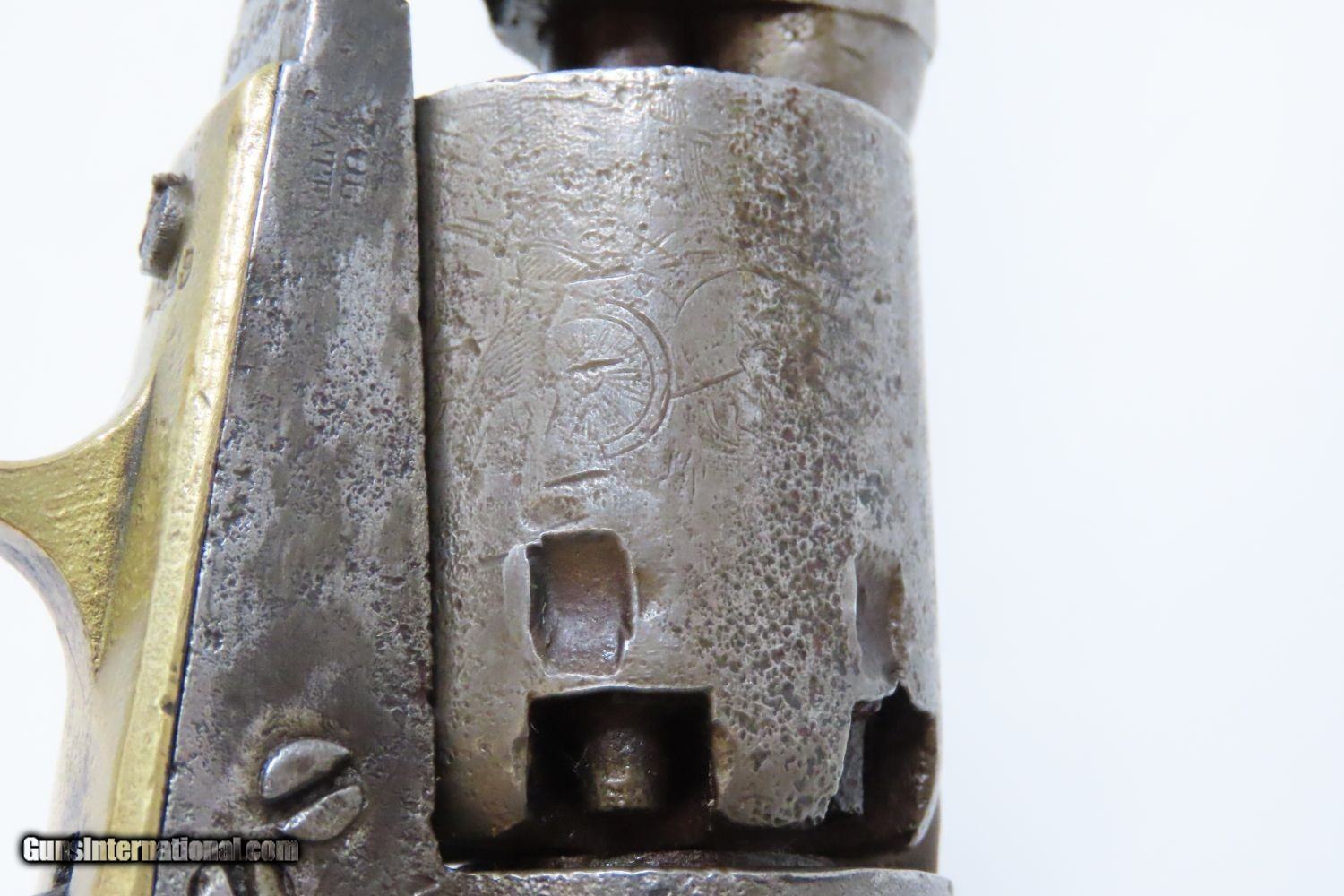 Description: Post-CIVIL WAR Antique COLT Model 1849 POCKET .31 Cal. PERCUSSION Revolver WILD WEST SIX-SHOOTER Made In 1870 Here we present an antique percussion Colt Model 1849 Pocket Revolver, made in 1870 in Hartford, Connecticut. The Model 1849 Pocket, the replacement for the Baby Dragoon, was the most widely produced of any Colt percussion pistol. Nearly 340,000 were manufactured during its 23-year production run that ended in 1873. Over 280,000 of these were produced by Colt’s factory at Hartford by the end of the American Civil War in 1865. These were very popular and saw a lot of use on the battlefield, on the home front and in the West. These were some of the smallest, handiest pocket revolvers of the time. One of the most aesthetically pleasing aspects of this pistol is its cylinder scene. Cylinder scenes during this period were common, especially for Colt, not only for their visual appeal, but because it made a revolver more difficult to forge. The scene on the 1849 Pocket is that of a stagecoach robbery. The focal point is the stagecoach drawn by four horses. A woman in a dress is seen framed in the doorway of the side of the coach. The driver is standing alongside wielding his pistol against multiple assailants as the horses rear and struggle against their harnesses. Several of the bandits lay dying on the ground, one tries to control the horses, two are running away and one is in the process of falling dead after being shot. Not a bad way to show interested buyers what a pistol like this would be good for. It did a fine job as a self-defense handgun for the average citizen in 19th Century America. The overall condition is good. The action is strong, although the cylinder freewheels. The grip is firm and remains in good shape. Numbers match. Good bore. Remnants of the cylinder scene are visible. Here is a great example piece from Colt for the collection. Own the original! This is a legitimate antique and not a reproduction. Barrel is 4 inches. Caliber: .31 Percussion Overall condition as seen in photos. Very Fast. Very Safe. FREE SHIPPING WORLDWIDE. Delivered directly to your door by express mail! Guaranteed AUTHENTIC & Includes CERTIFICATE OF AUTHENTICITY. ancestryguns $1215 #210811 SOLD Antique: Yes |