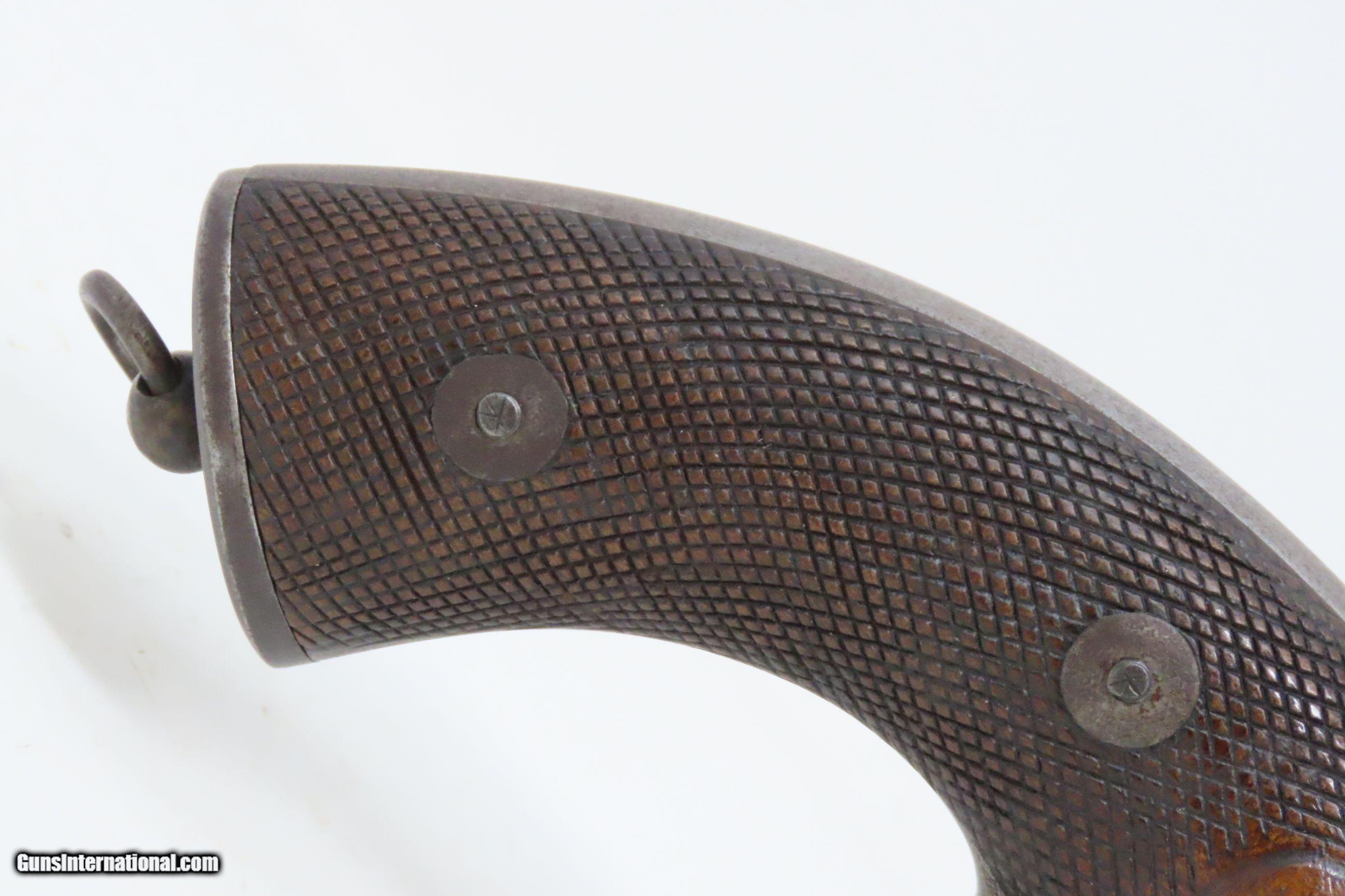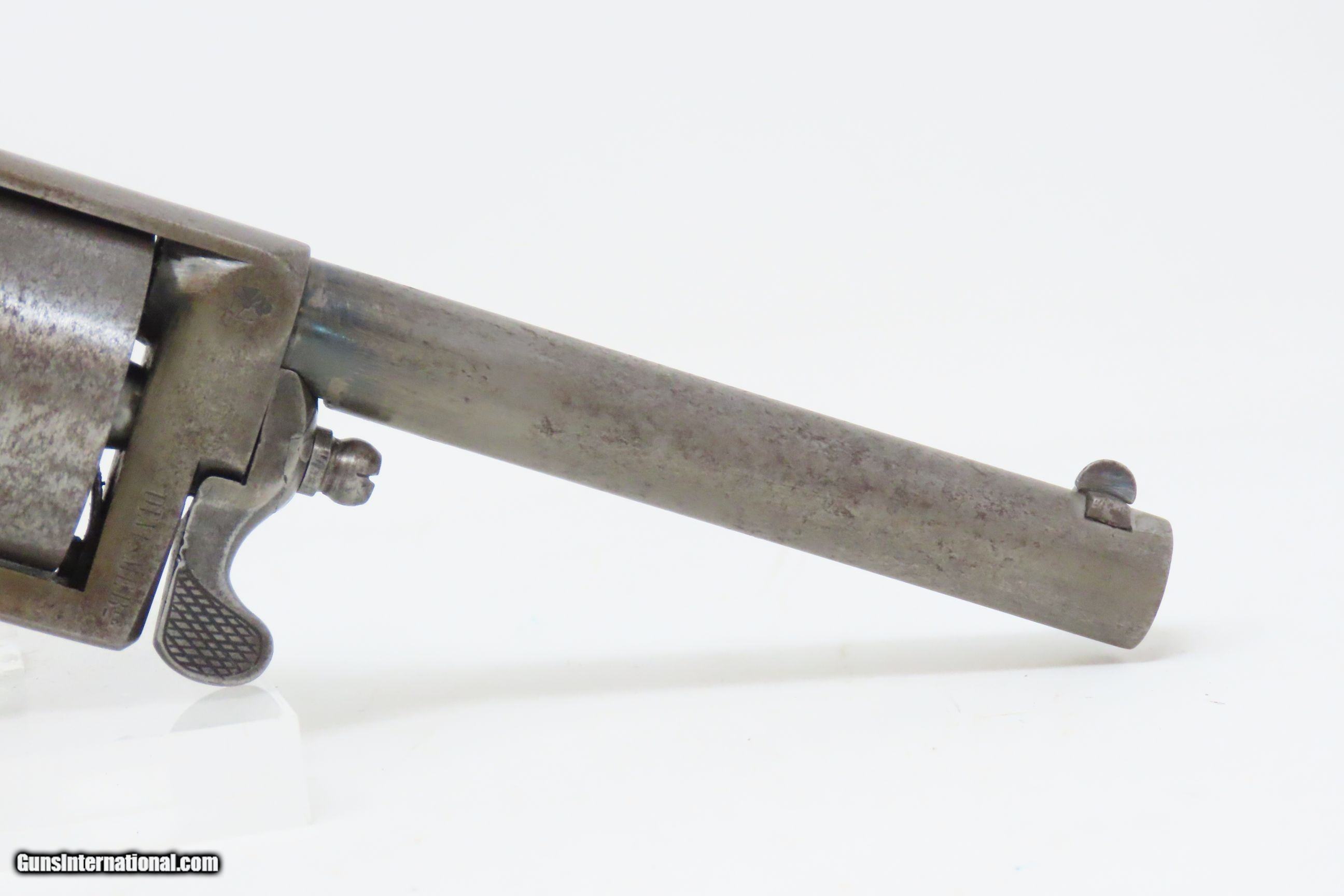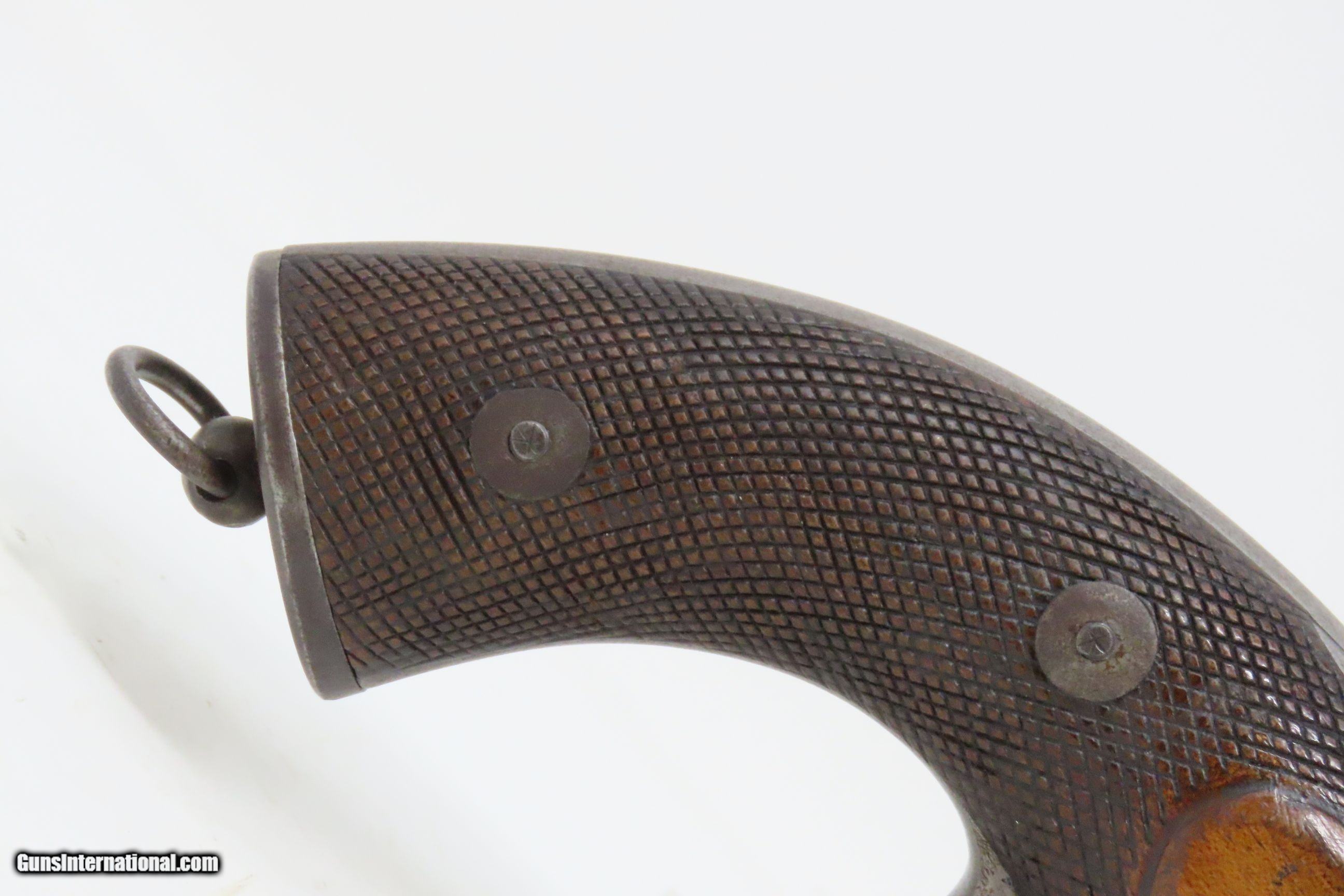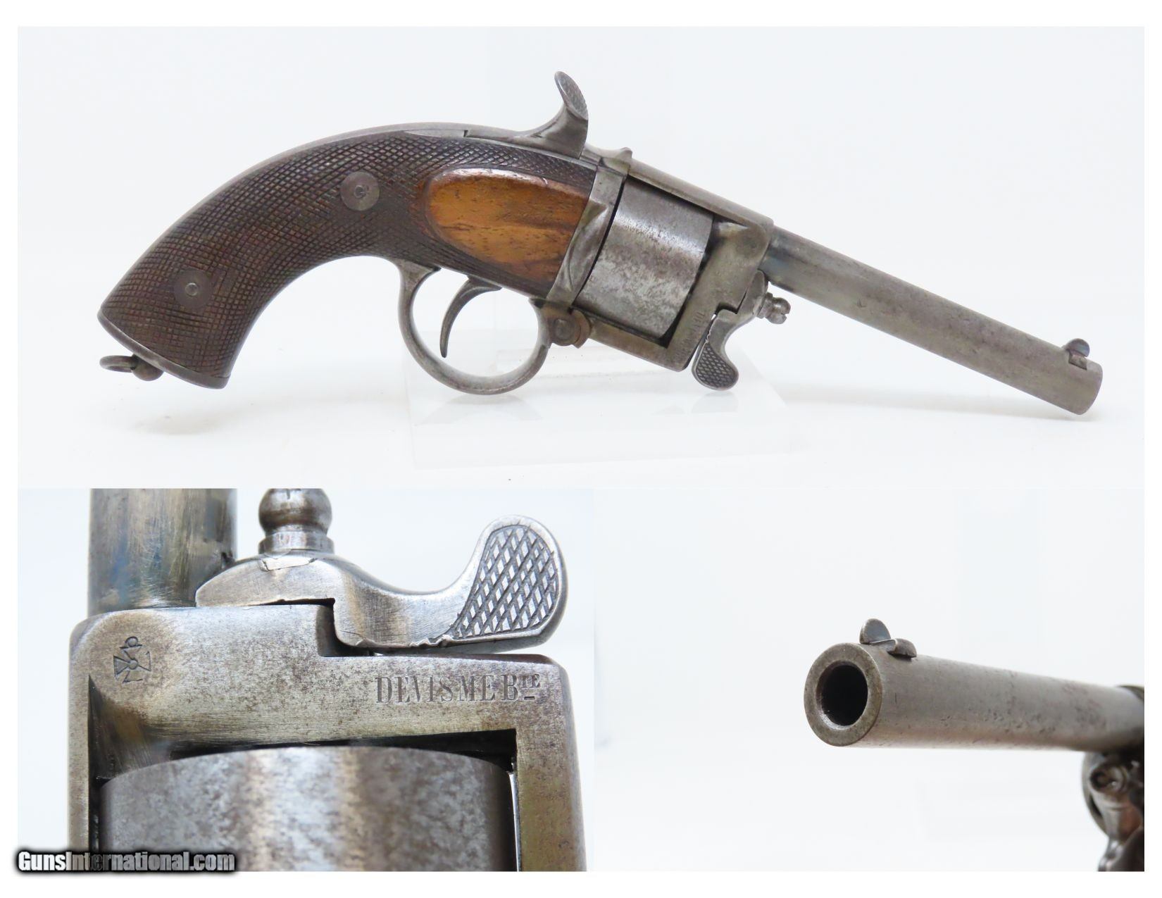 Description: RARE c1859 9.4mm DEVISME PARIS Single Action Revolver Civil War CSA Antique One of the Earliest Centerfire Cartridge Revolvers! Here we present an antique Devisme “Model 1859” Single Action Revolver, made circa 1859 in Paris, France. Jean-Louis François Devisme was a well-known, high-quality gunmaker who was known for his award-winning and innovative designs for firearms and swords. This is one of the first centerfire metallic cartridge firearms. While the Lefaucheuxs had developed their trademark pinfire cartridges and firearms and Smith & Wesson was developing their .22 and .32 rimfire cartridges and firearms, Devisme was adapting his previous percussion revolver to centerfire use. Among his most famous clientele in North America were Confederates General Robert E. Lee, General J.E.B. Stuart, General John Bell Hood, and President Jefferson Davis. Royalty in England, Franch, Russia, and Egypt were also known to have Devisme’s weapons in their collections. This revolver is sleek and streamlined. It features 6 shots of 9.3mm centerfire. The barrel tips down upon the lever on the front being turned to the side. The top of the barrel is hand-engraved “Devisme a Paris”. The frame is marked “DEVISME BTE” with a Maltese Cross nearby. It has a flat pommel with a lanyard ring. Being put into production in 1859 some of these were used during the American Civil War. The overall condition is very good. Original patina. The action is excellent and tight. The bore is bright with sharp rifling. The stocks are hand-checkered and solid. This is a fantastic and unique design that can probably be considered the very first and certainly best on the market centerfire repeater! Own the original! This is a legitimate antique and not a reproduction. Barrel is 3-1/4 inches. Caliber: 9.4mm Devisme Centerfire (.369) Overall condition as seen in photos. Very Fast. Very Safe. FREE SHIPPING WORLDWIDE. Delivered directly to your door by express mail! Guaranteed AUTHENTIC & Includes CERTIFICATE OF AUTHENTICITY. ancestryguns $4800 #230087 SOLD Antique: Yes |
