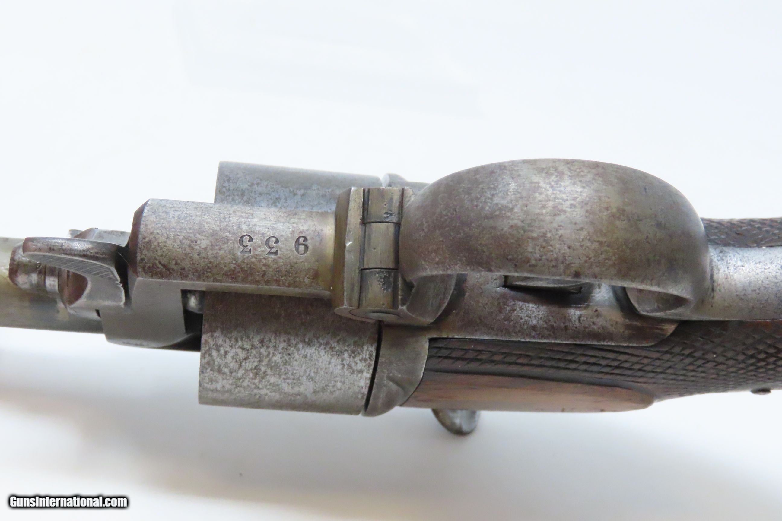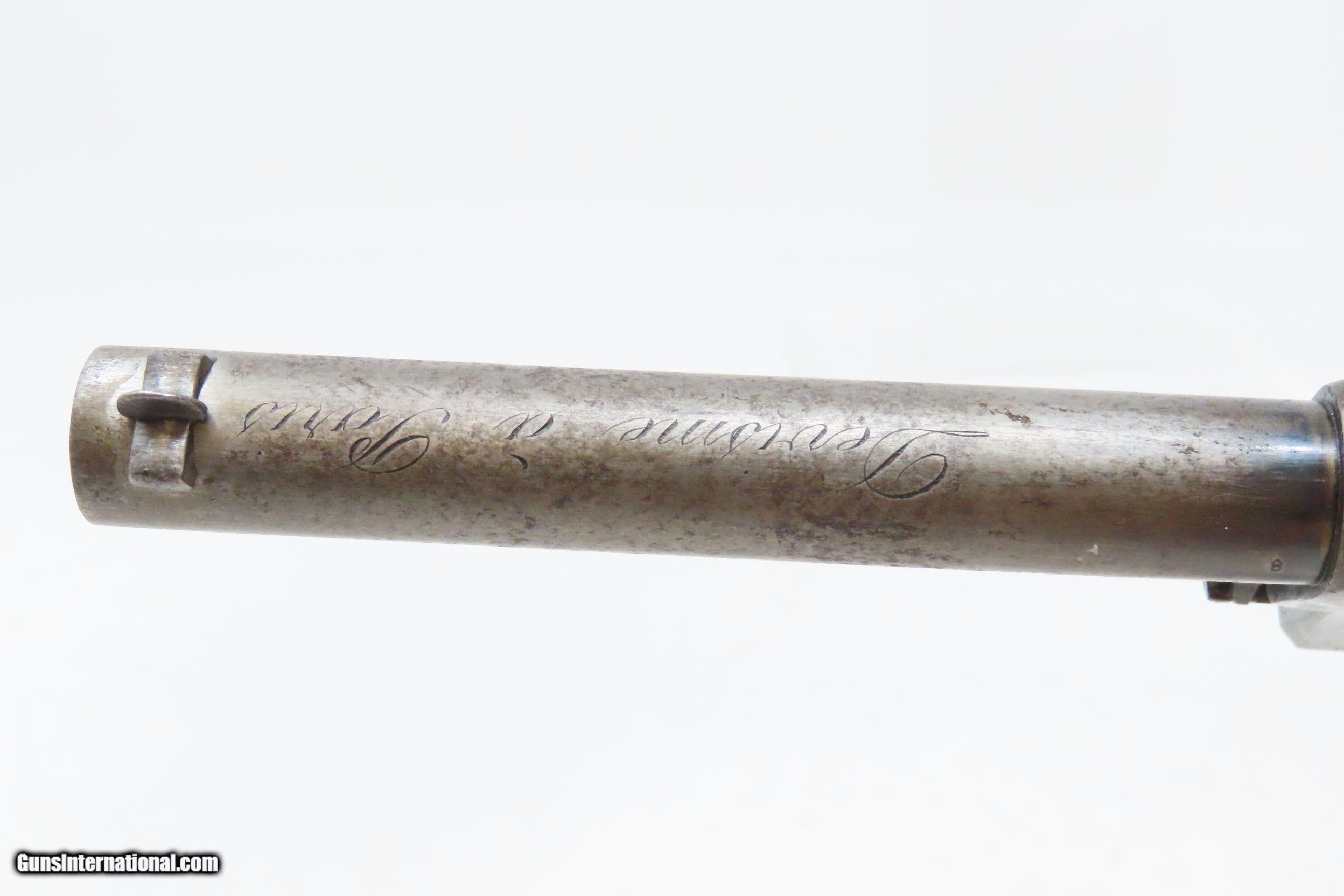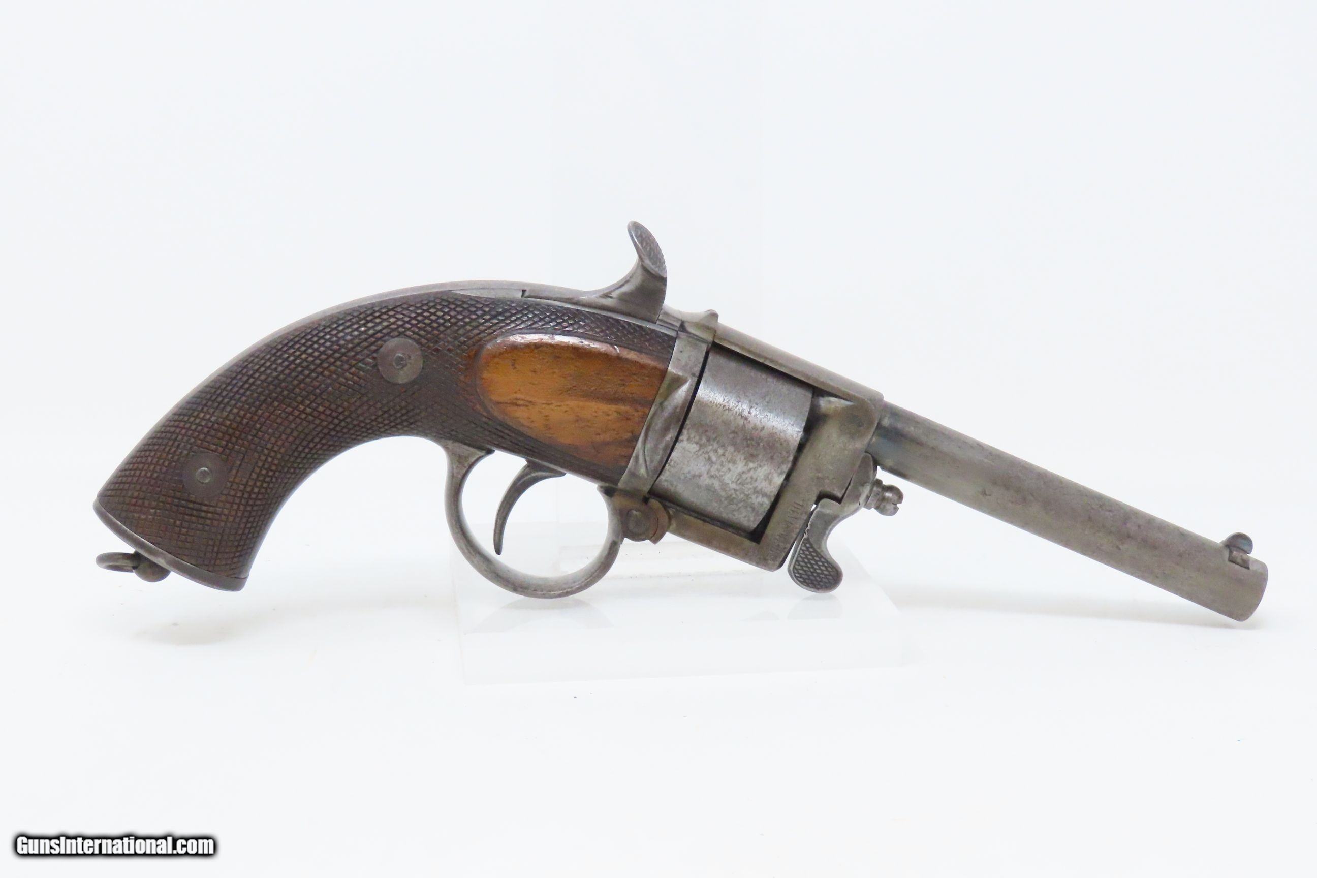 Description: RARE c1859 9.4mm DEVISME PARIS Single Action Revolver Civil War CSA Antique One of the Earliest Centerfire Cartridge Revolvers! Here we present an antique Devisme “Model 1859” Single Action Revolver, made circa 1859 in Paris, France. Jean-Louis François Devisme was a well-known, high-quality gunmaker who was known for his award-winning and innovative designs for firearms and swords. This is one of the first centerfire metallic cartridge firearms. While the Lefaucheuxs had developed their trademark pinfire cartridges and firearms and Smith & Wesson was developing their .22 and .32 rimfire cartridges and firearms, Devisme was adapting his previous percussion revolver to centerfire use. Among his most famous clientele in North America were Confederates General Robert E. Lee, General J.E.B. Stuart, General John Bell Hood, and President Jefferson Davis. Royalty in England, Franch, Russia, and Egypt were also known to have Devisme’s weapons in their collections. This revolver is sleek and streamlined. It features 6 shots of 9.3mm centerfire. The barrel tips down upon the lever on the front being turned to the side. The top of the barrel is hand-engraved “Devisme a Paris”. The frame is marked “DEVISME BTE” with a Maltese Cross nearby. It has a flat pommel with a lanyard ring. Being put into production in 1859 some of these were used during the American Civil War. The overall condition is very good. Original patina. The action is excellent and tight. The bore is bright with sharp rifling. The stocks are hand-checkered and solid. This is a fantastic and unique design that can probably be considered the very first and certainly best on the market centerfire repeater! Own the original! This is a legitimate antique and not a reproduction. Barrel is 3-1/4 inches. Caliber: 9.4mm Devisme Centerfire (.369) Overall condition as seen in photos. Very Fast. Very Safe. FREE SHIPPING WORLDWIDE. Delivered directly to your door by express mail! Guaranteed AUTHENTIC & Includes CERTIFICATE OF AUTHENTICITY. ancestryguns $4800 #230087 SOLD Antique: Yes |