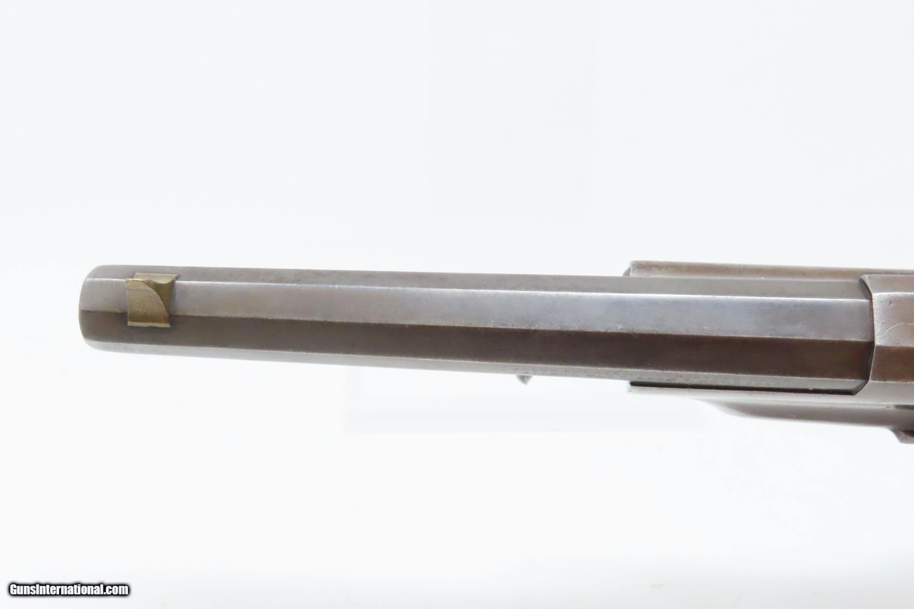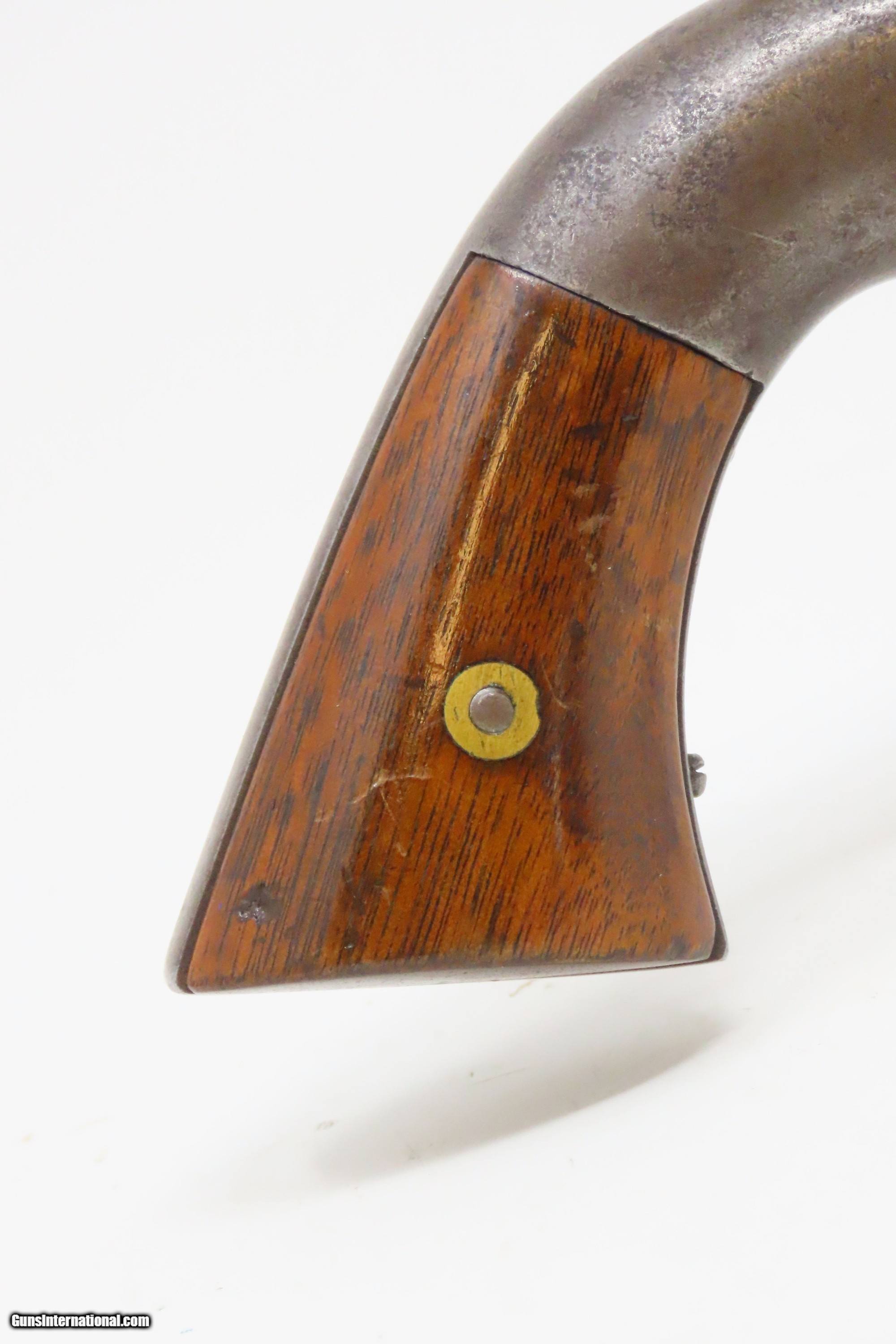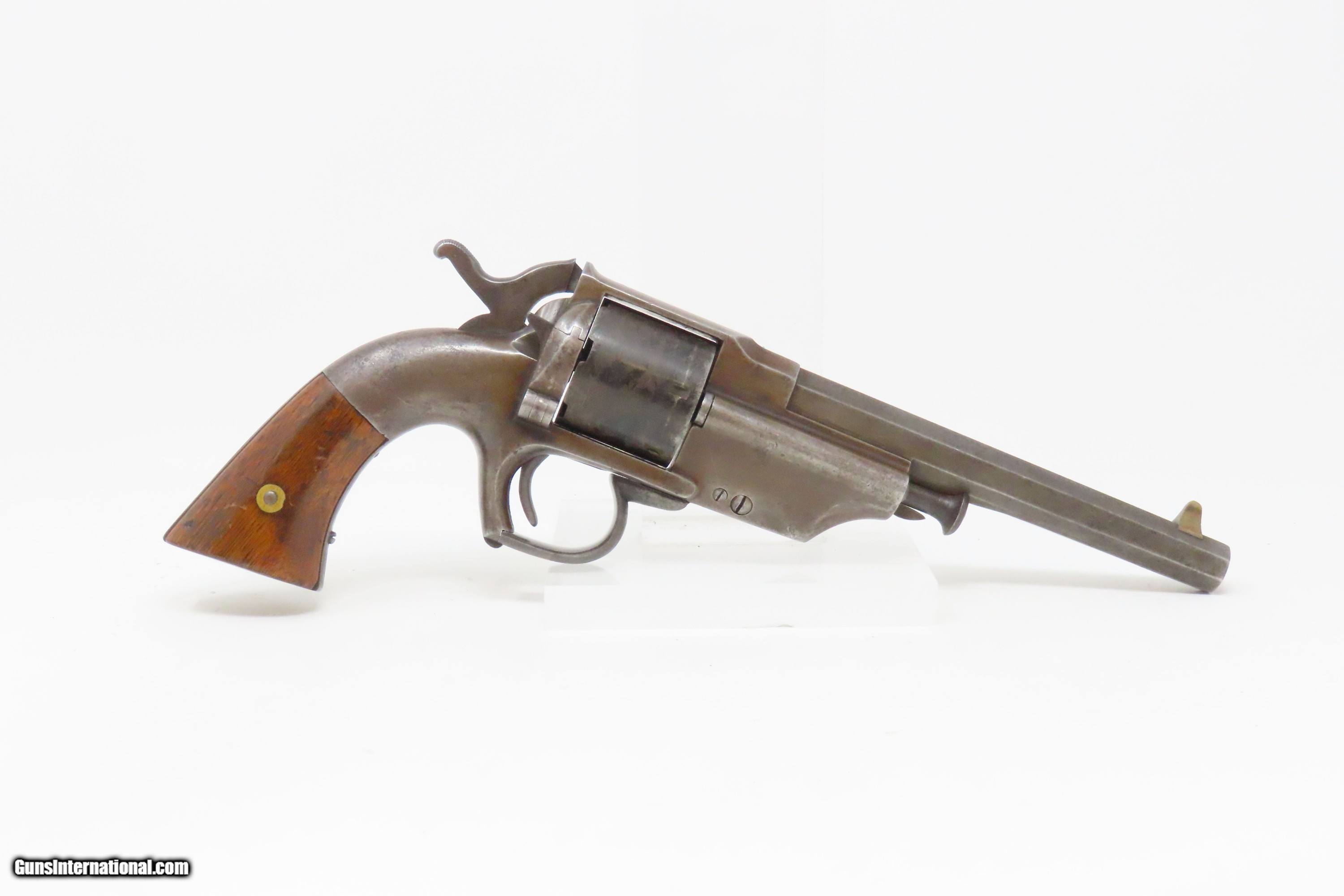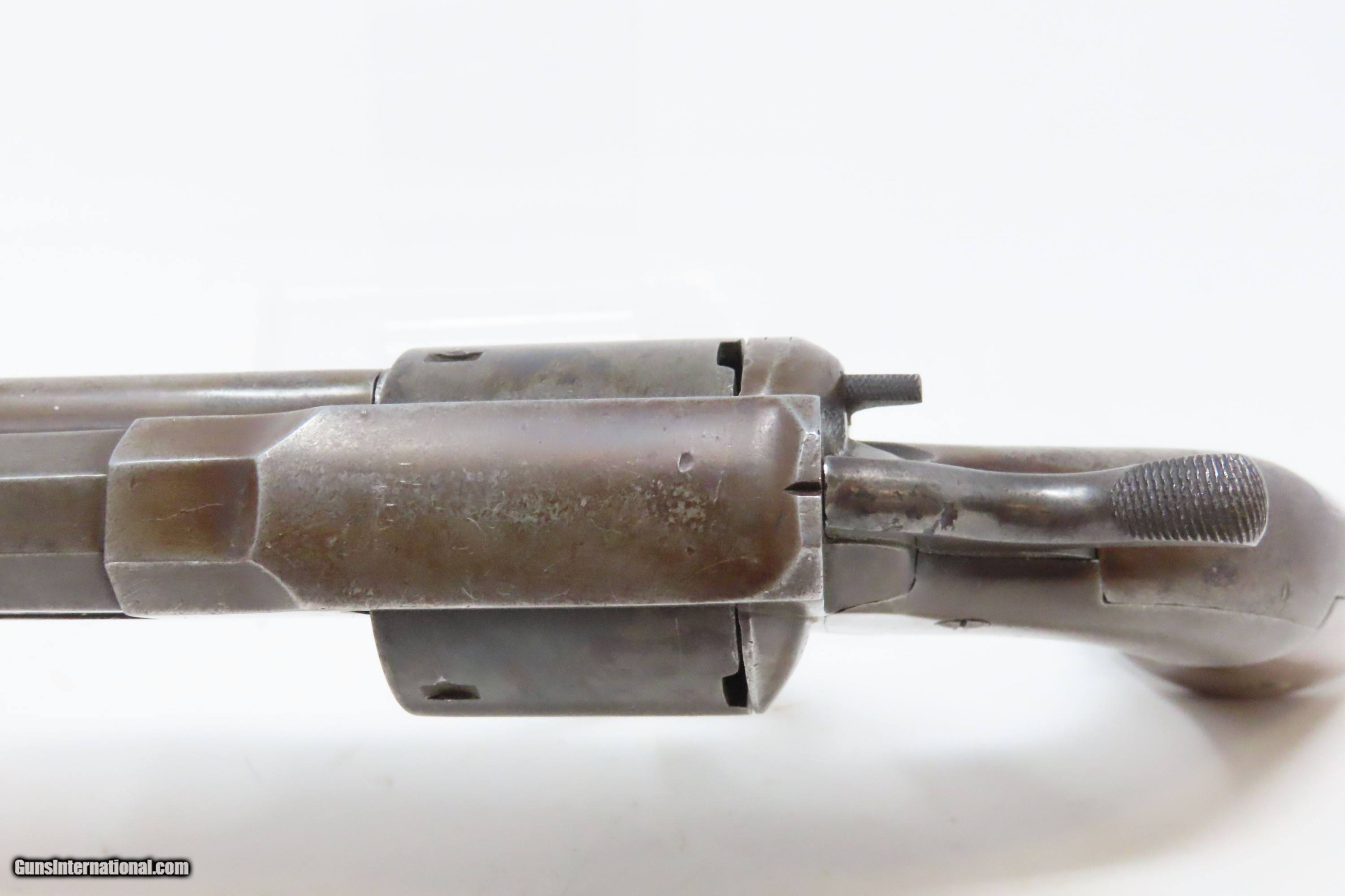 Description: RARE CIVIL WAR Antique ALLEN & WHEELOCK .36 Lipfire NAVY Revolver Worcester 1 of 250 .36 Cal. LIPFIRE Revolvers Made circa 1861 Here we present a very rare antique Allen & Wheelock Navy Lipfire Revolver, made circa 1861-62 in Worcester, Massachusetts, at the start of the American Civil War. According to Flayderman, these revolvers only had a production of about 250 pieces till Allen & Wheelock ran into the Rollins White patent infringement. They were for the most part converted to percussion to resolve the problem. Of those 250 Lipfires manufactured, many were converted, so finding an original revolver still in Lipfire are few and far between. Allen & Wheelock manufactured a total of approximately 700 of these Center Hammer revolvers with, as mentioned, the first 250 being Lipfire. Of these 700, the Ordnance Department purchased 536 of these revolvers in 1861. Nearly all those guns were subsequently issued to the 2nd & 3rd Michigan Volunteer Cavalry regiments. As these revolvers were purchased on the open market, they were not marked with any U.S. military sub-inspection or final inspection marks (including cartouches), as are found on the guns acquired via official Ordnance Department contracts. Surviving examples are rare. This Allen & Wheelock Navy Revolver is a .36 caliber, six-shot, Lipfire single action revolver that had a 6” octagon barrel that utilized a unique ratcheting loading lever that formed the trigger guard of the revolver. The frames, cylinders and barrels of the revolvers were blued with the hammers and the combination loading lever and trigger guards color casehardened. The grips were smooth two-piece walnut that were usually varnished but appear to have been oil finished on some examples. Despite the relatively small number produced, the revolvers were manufactured in three distinct variants. A fine nickel Army caliber version with extensive engraving by Gustav Young and hand-carved ivory grips is thought to have been the personal weapon of Ethan Allen. The overall condition is good. The bore is bright and nicely rifled. Good grips. The action partially functions, as the cylinder does not properly index. Legible markings. Here is a very RARE and attractive revolver from one of the 19th Century’s most prolific makers! Own the original! This is a legitimate antique and not a reproduction. Barrel is 6 inches. Caliber: .36 Lipfire Overall condition as seen in photos. Very Fast. Very Safe. FREE SHIPPING WORLDWIDE. Delivered directly to your door by express mail! Guaranteed AUTHENTIC & Includes CERTIFICATE OF AUTHENTICITY. ancestryguns $1950 #227988 SOLD Antique: Yes |