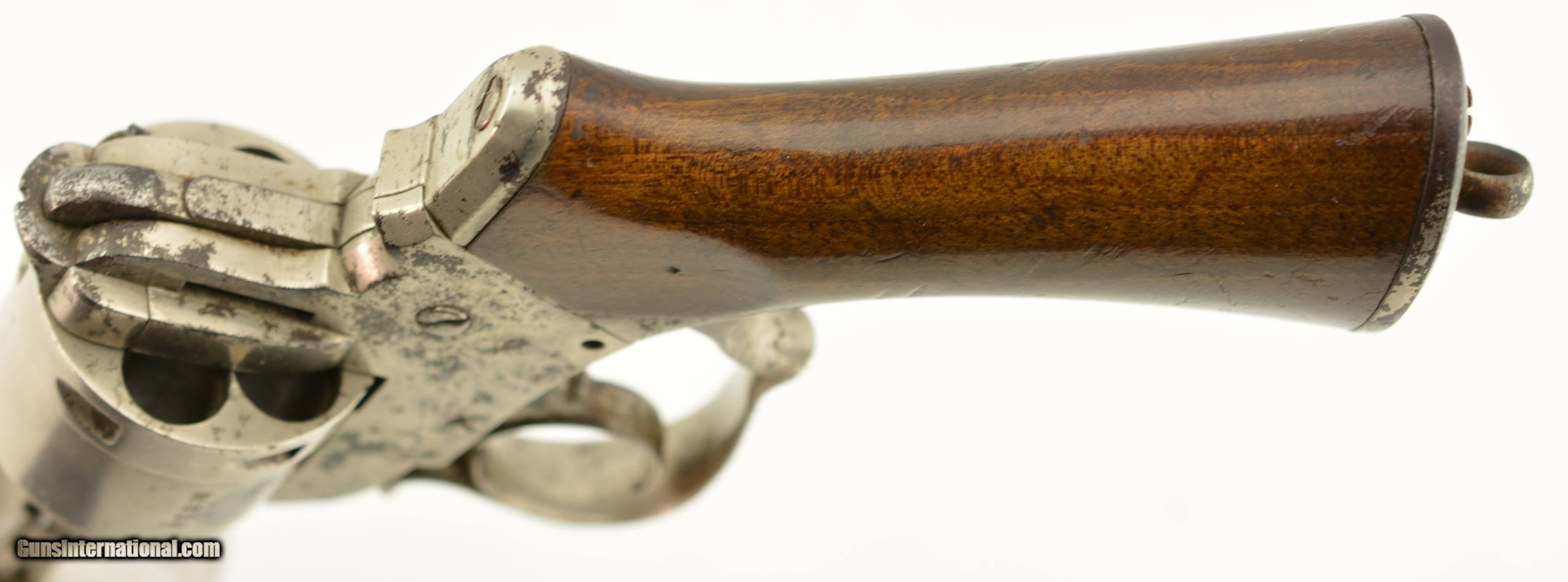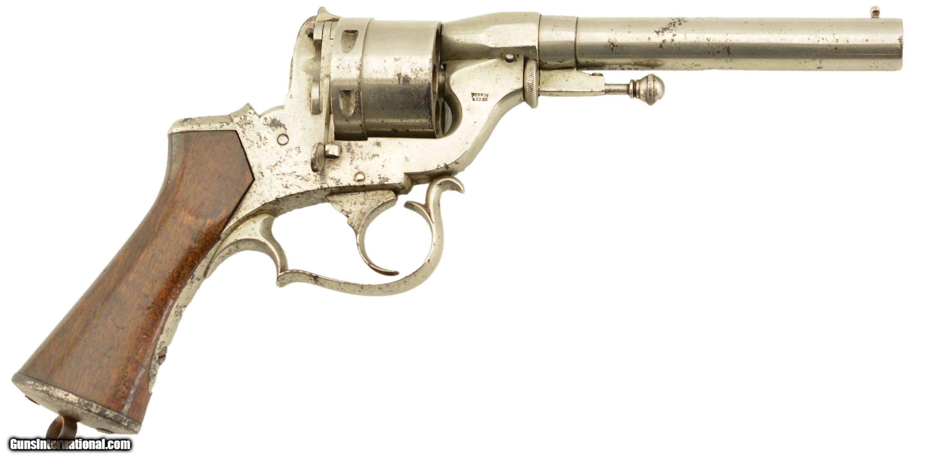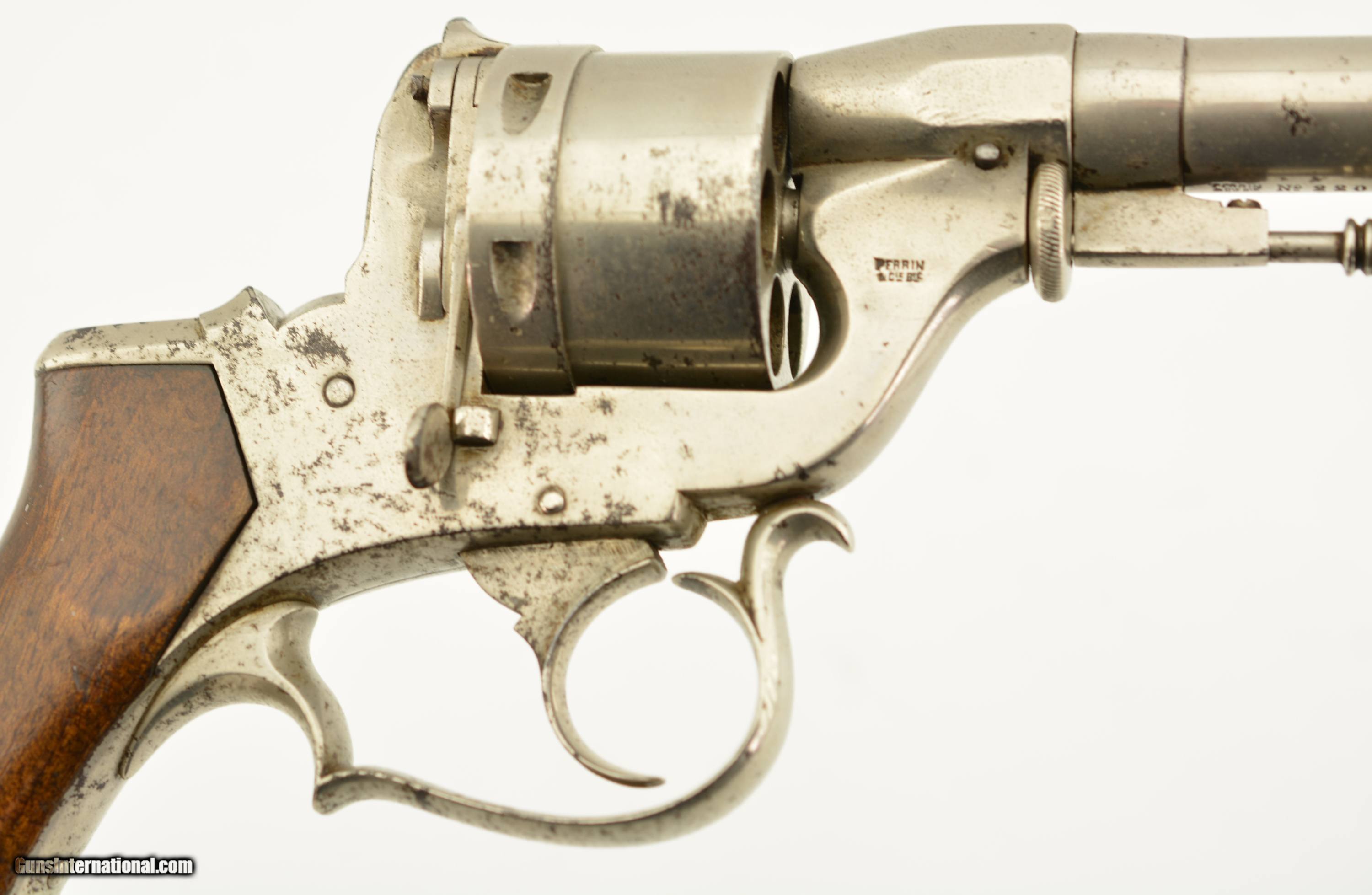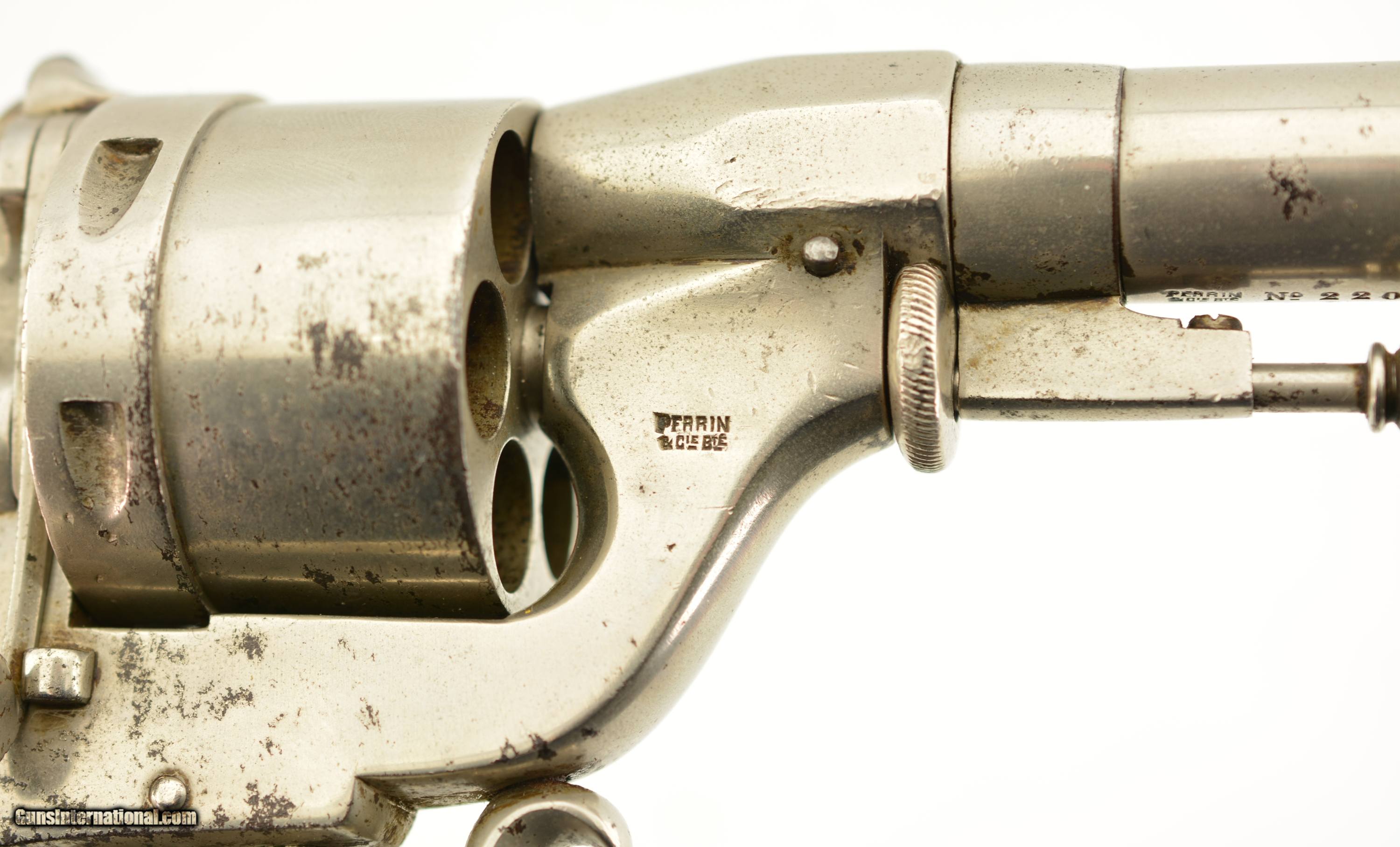 Description: Serial #220, 12mm Perrin CF, 6" barrel with a fine, bright bore that has some traces of freckling within the grooves. This is a "PERRIN / & CIE BTE" and "(sunburst) / PARIS"-marked revolver with matching numbers on the barrel, frame, and cylinder. The metal has retained about 80-85% of an old nickel finish with dark spots of pitting and surface oxidation scattered throughout, but heaviest on the left side of the frame and on the domed buttcap. All markings are crisp and clear, and the edges are still quite sharp. The serpentine safety spring is missing from the left side of the frame, however the action remains functional. The walnut grip is in good shape, but has been sanded smooth and has an added varnish finish throughout. The wood is numbered "120" at the butt and also has a penciled name, presumably a previous owner: "MIESTEAD". The Perrin was an extremely advanced revolver for the time and fired a 12mm centerfire cartridge via a double-action only mechanism, similar to the contemporary Model 1851 Adams patent. During the Civil War, Alexis Godillot (who had offices in both New York and Paris) contracted with the US Government for the sale of 1,000 Perrin revolvers and ammunition, eventually delivering 550 guns in three shipments in 1862 before the balance of the order was cancelled. This is one of the most rarely encountered Civil War revolvers, and represents a great opportunity for the collector to acquire a very scarce example. Antique SOLD Antique: Yes Manufacturer: Perrin Model: Revolver Serial Number: 220 Caliber Info: 12mm Gauge Info: 12mm |