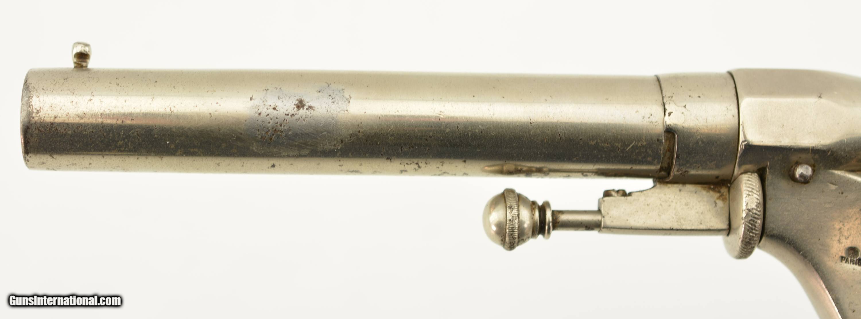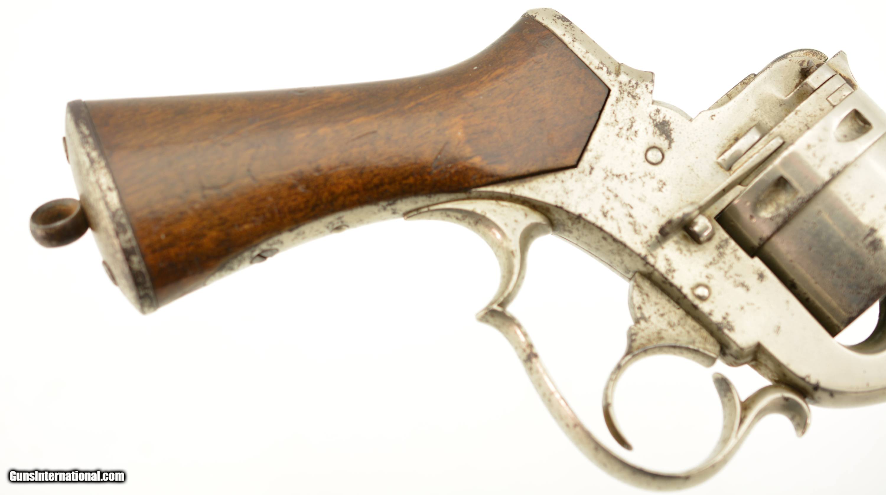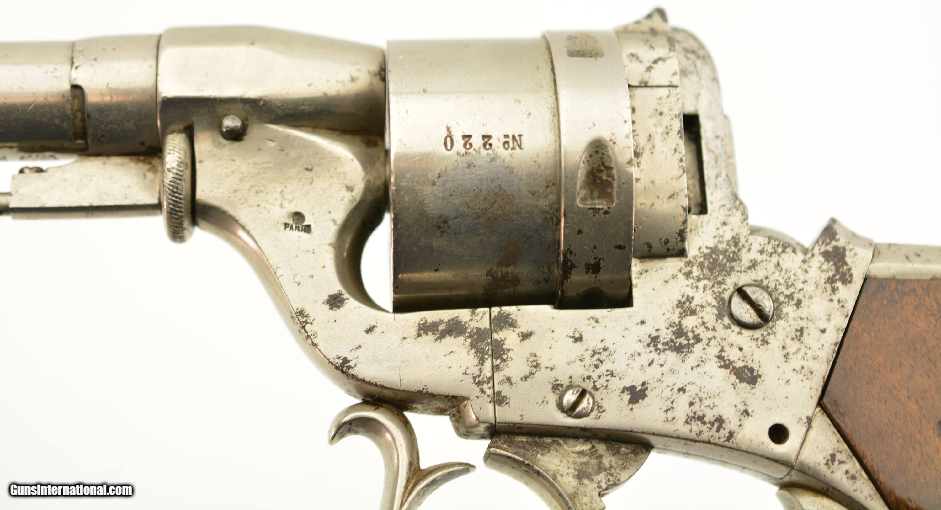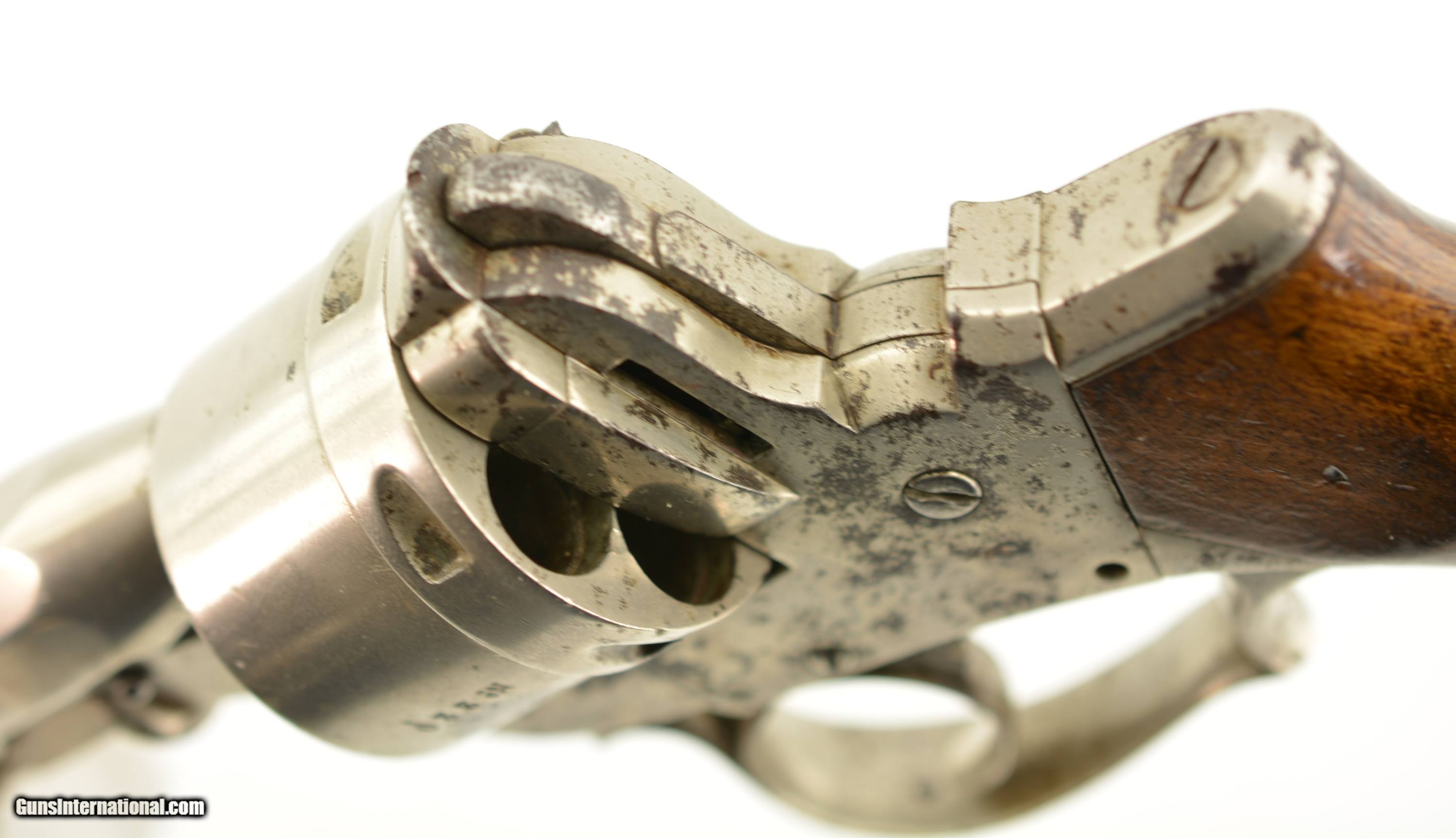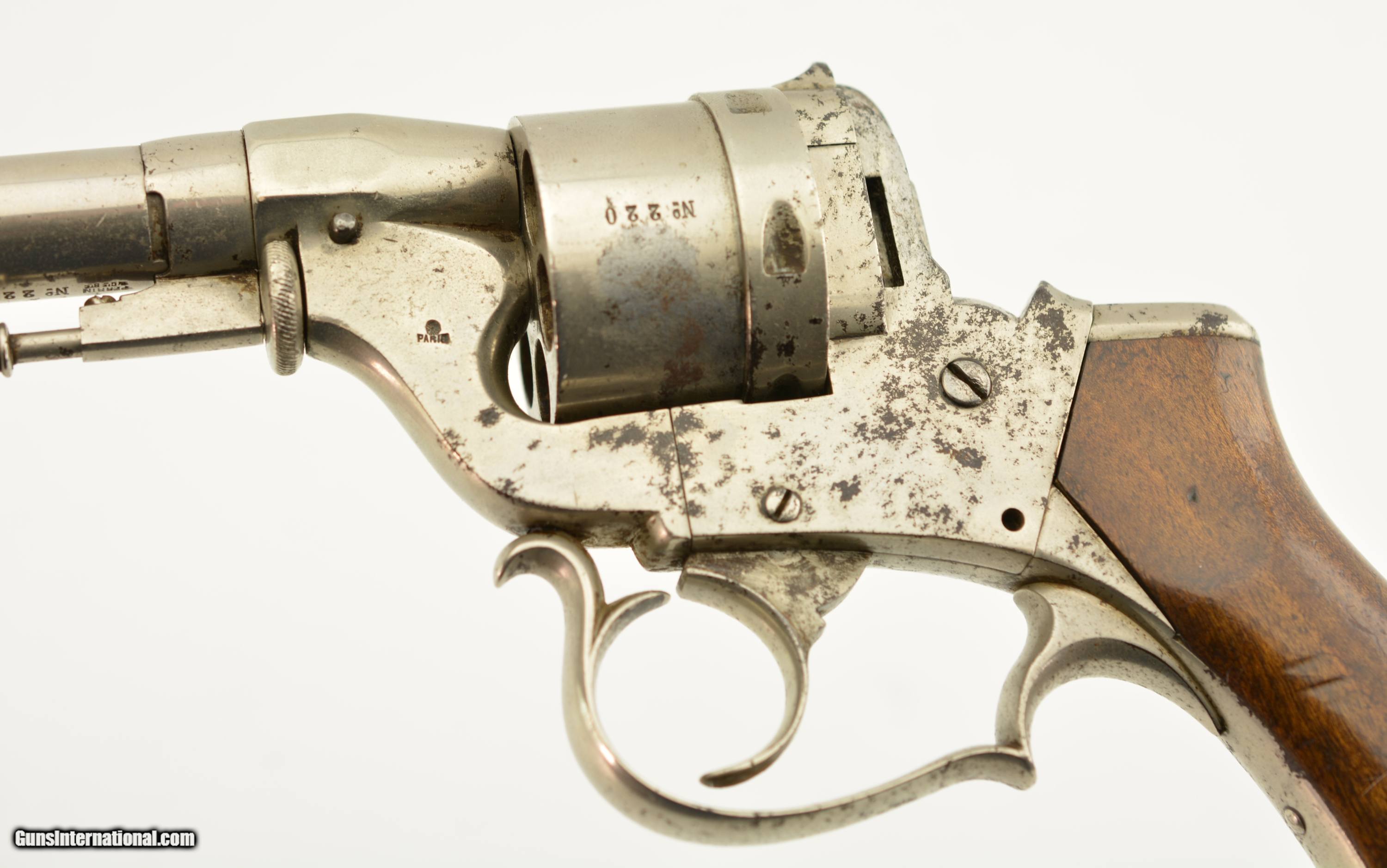 Description: Serial #220, 12mm Perrin CF, 6" barrel with a fine, bright bore that has some traces of freckling within the grooves. This is a "PERRIN / & CIE BTE" and "(sunburst) / PARIS"-marked revolver with matching numbers on the barrel, frame, and cylinder. The metal has retained about 80-85% of an old nickel finish with dark spots of pitting and surface oxidation scattered throughout, but heaviest on the left side of the frame and on the domed buttcap. All markings are crisp and clear, and the edges are still quite sharp. The serpentine safety spring is missing from the left side of the frame, however the action remains functional. The walnut grip is in good shape, but has been sanded smooth and has an added varnish finish throughout. The wood is numbered "120" at the butt and also has a penciled name, presumably a previous owner: "MIESTEAD". The Perrin was an extremely advanced revolver for the time and fired a 12mm centerfire cartridge via a double-action only mechanism, similar to the contemporary Model 1851 Adams patent. During the Civil War, Alexis Godillot (who had offices in both New York and Paris) contracted with the US Government for the sale of 1,000 Perrin revolvers and ammunition, eventually delivering 550 guns in three shipments in 1862 before the balance of the order was cancelled. This is one of the most rarely encountered Civil War revolvers, and represents a great opportunity for the collector to acquire a very scarce example. Antique SOLD Antique: Yes Manufacturer: Perrin Model: Revolver Serial Number: 220 Caliber Info: 12mm Gauge Info: 12mm |