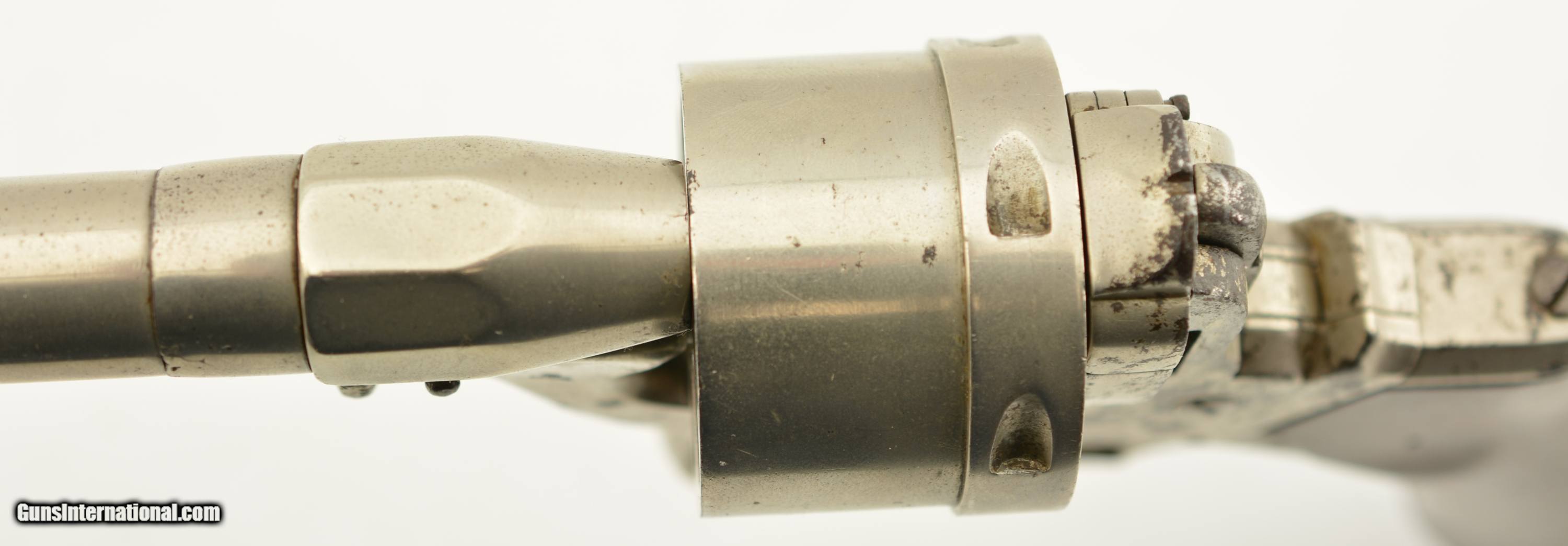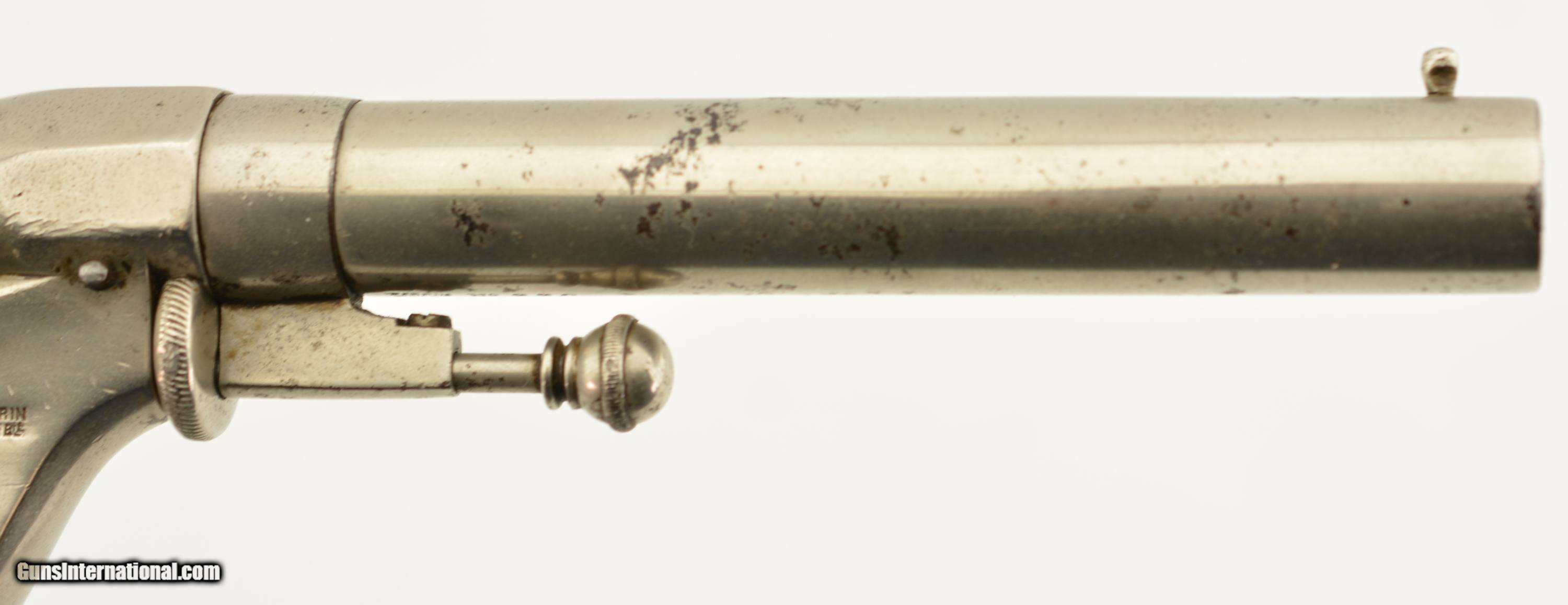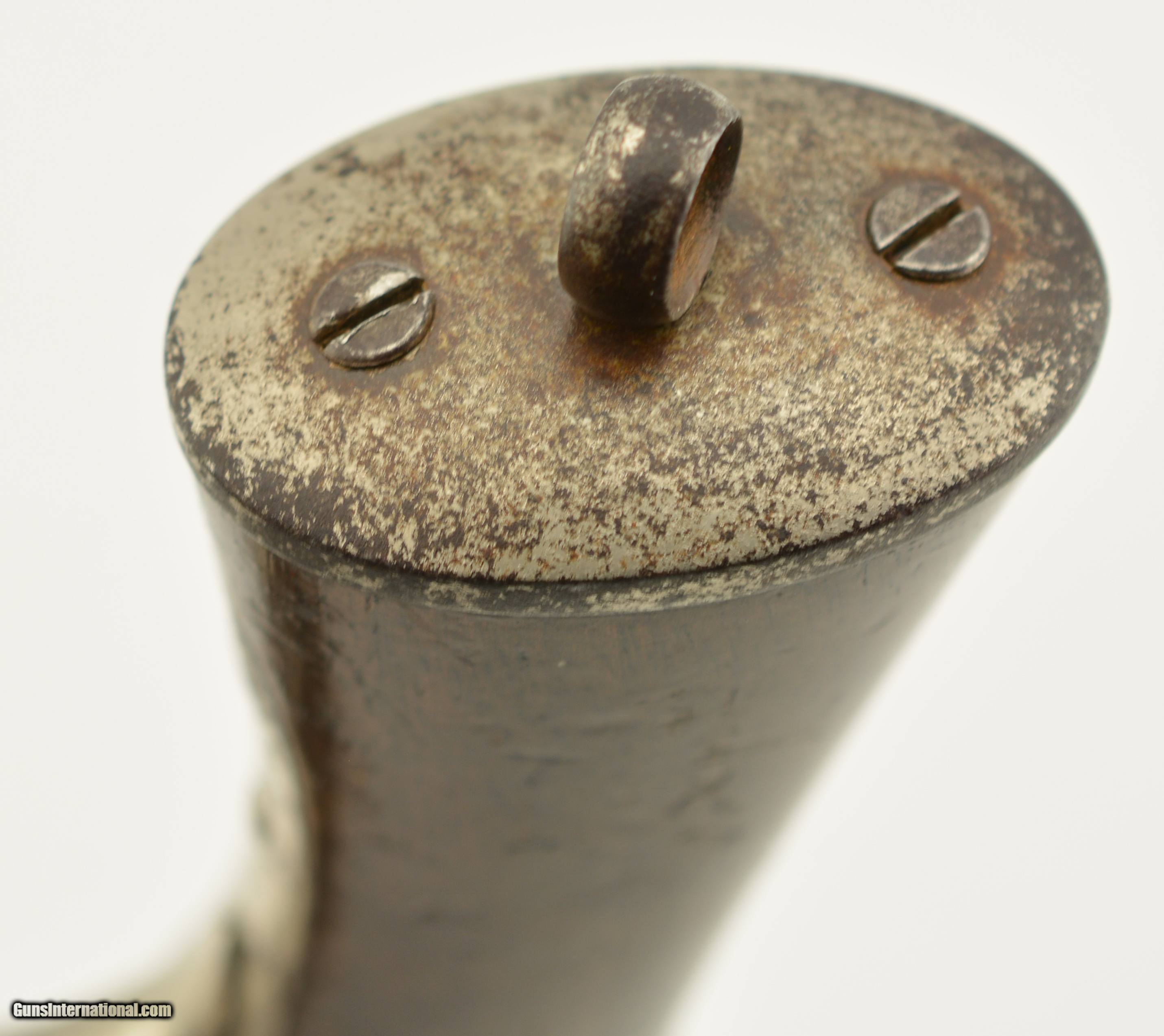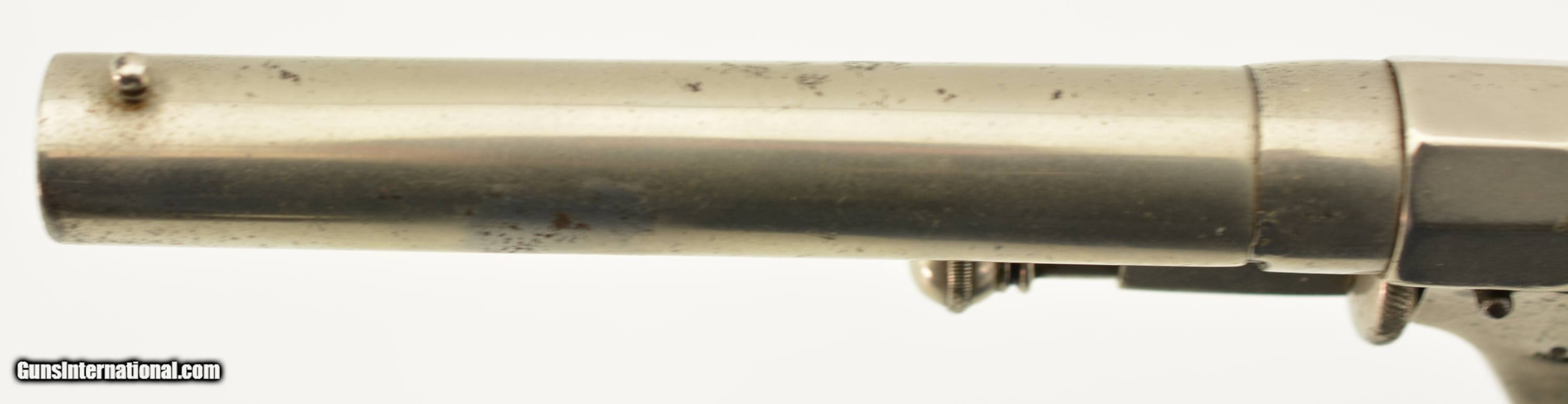 Description: Serial #220, 12mm Perrin CF, 6" barrel with a fine, bright bore that has some traces of freckling within the grooves. This is a "PERRIN / & CIE BTE" and "(sunburst) / PARIS"-marked revolver with matching numbers on the barrel, frame, and cylinder. The metal has retained about 80-85% of an old nickel finish with dark spots of pitting and surface oxidation scattered throughout, but heaviest on the left side of the frame and on the domed buttcap. All markings are crisp and clear, and the edges are still quite sharp. The serpentine safety spring is missing from the left side of the frame, however the action remains functional. The walnut grip is in good shape, but has been sanded smooth and has an added varnish finish throughout. The wood is numbered "120" at the butt and also has a penciled name, presumably a previous owner: "MIESTEAD". The Perrin was an extremely advanced revolver for the time and fired a 12mm centerfire cartridge via a double-action only mechanism, similar to the contemporary Model 1851 Adams patent. During the Civil War, Alexis Godillot (who had offices in both New York and Paris) contracted with the US Government for the sale of 1,000 Perrin revolvers and ammunition, eventually delivering 550 guns in three shipments in 1862 before the balance of the order was cancelled. This is one of the most rarely encountered Civil War revolvers, and represents a great opportunity for the collector to acquire a very scarce example. Antique SOLD Antique: Yes Manufacturer: Perrin Model: Revolver Serial Number: 220 Caliber Info: 12mm Gauge Info: 12mm |