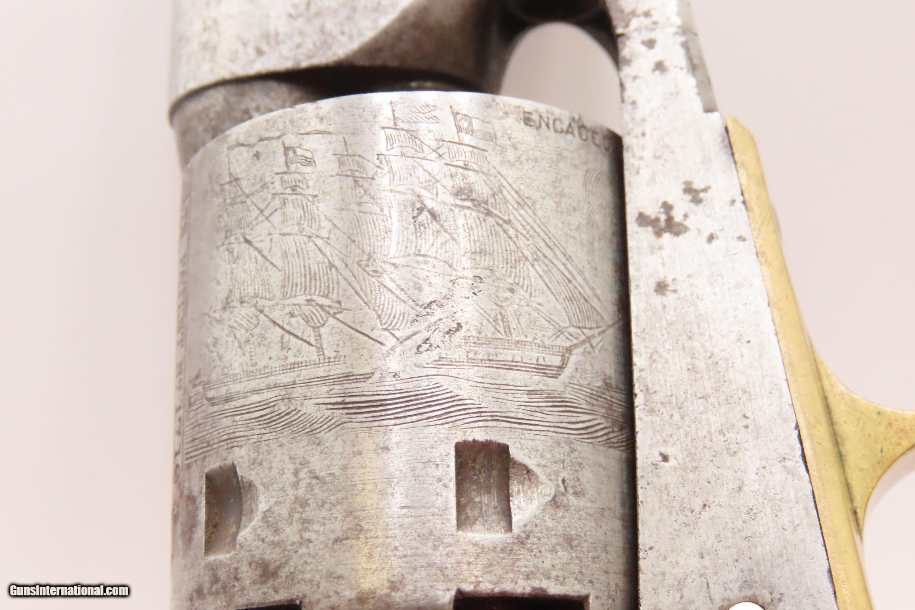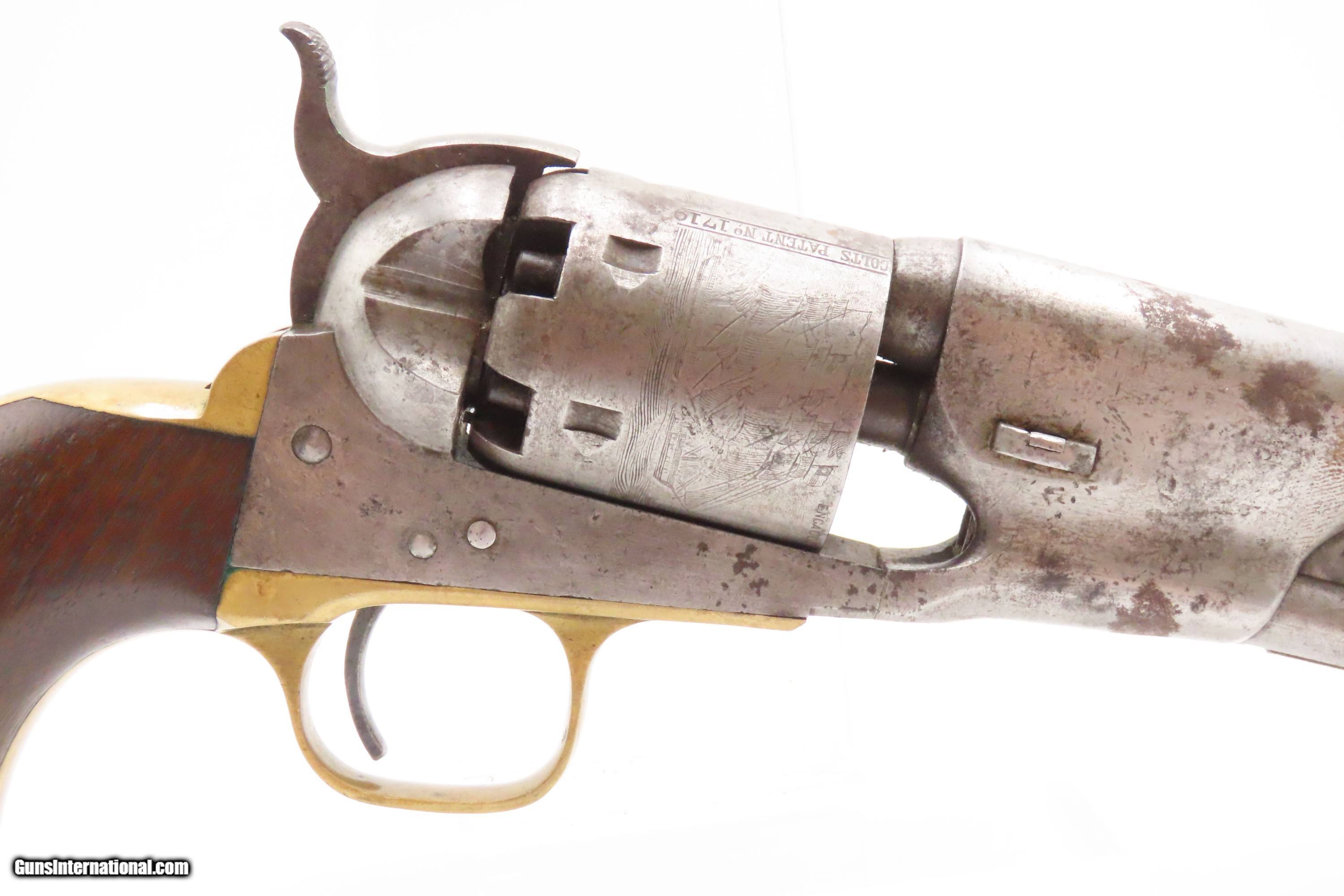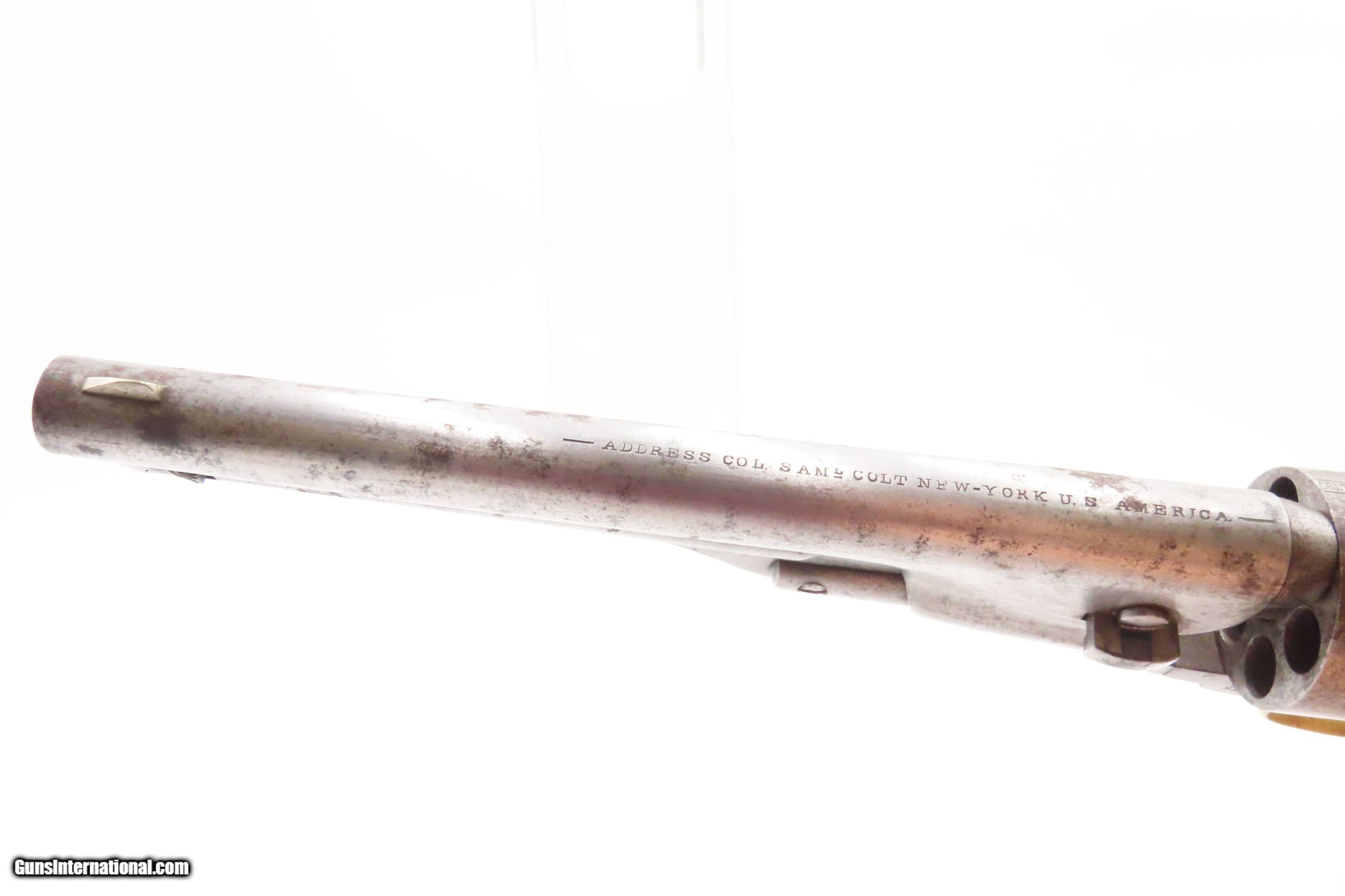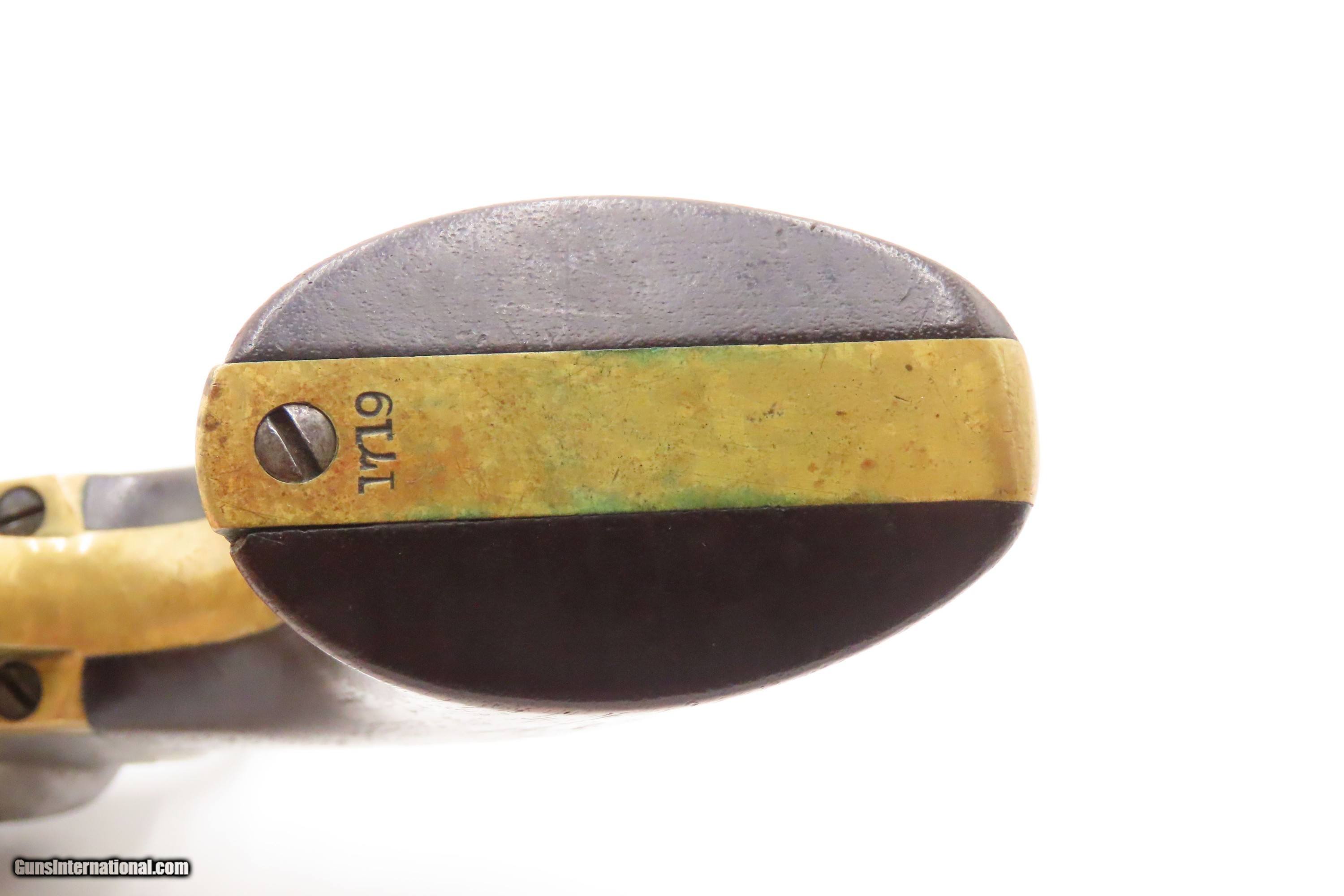 Description: RARE Early Production CIVIL WAR Antique COLT M1861 NAVY Percussion Revolver Produced in 1861 with MATCHING SERIAL NUMBERS Here we present an antique Rare Early Production Colt Model 1861 Navy Percussion Revolver, made in 1861 at the start of the American Civil War. The introduction of the 1861 Navy was simply an update to the very successful 1851 Navy, with the primary differences being the round barrel instead of octagonal, and the addition of the creeping style of loading lever. These updates made for a sleek package that very much resembled Colt’s crowning achievement, the 1860 Army. The 1861 Navy still retained its .36 caliber, making this the preferred firearm for many not wanting to step up to a .44 like the Army, while still sharing most of its dimensions. The Colt Model 1861 Navy was formally adopted by the Union government and was used by both the Army and the Navy. Many of those sold to the military were never martially inspected or marked. Of course, there was a healthy commercial market for these during the war, and many soldiers privately purchased these revolvers as well. In a slightly smaller and lighter package than its 1860 Army big brother, many soldiers and cavalry preferred the Navy in .36 caliber. Of course, these weapons continued to be used well after the Civil War, especially during Westward Expansion. The overall condition is good+. Patina throughout. Very good Battle of Campeche cylinder scene. The action is excellent. The bore is in good condition with strong rifling. The grip is solid. Numbers match throughout. Own the original! This is a legitimate antique and not a reproduction. Barrel is 7-1/2 inches. Caliber: .36 Percussion Overall condition as seen in photos. Very Fast. Very Safe. FREE SHIPPING WORLDWIDE. Delivered directly to your door by express mail! Guaranteed AUTHENTIC & Includes CERTIFICATE OF AUTHENTICITY. ancestryguns $2600 #247150 SOLD Antique: Yes |
