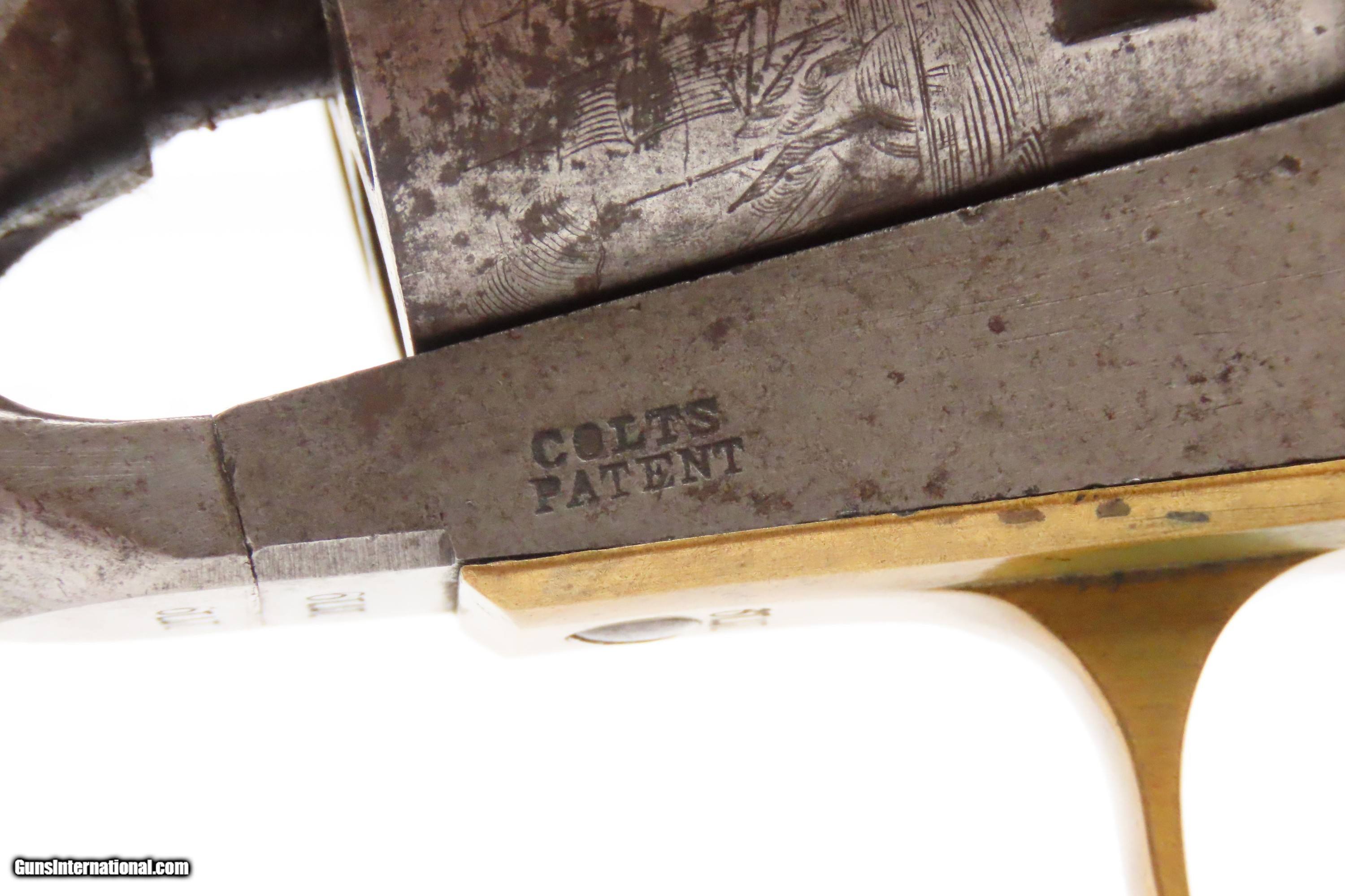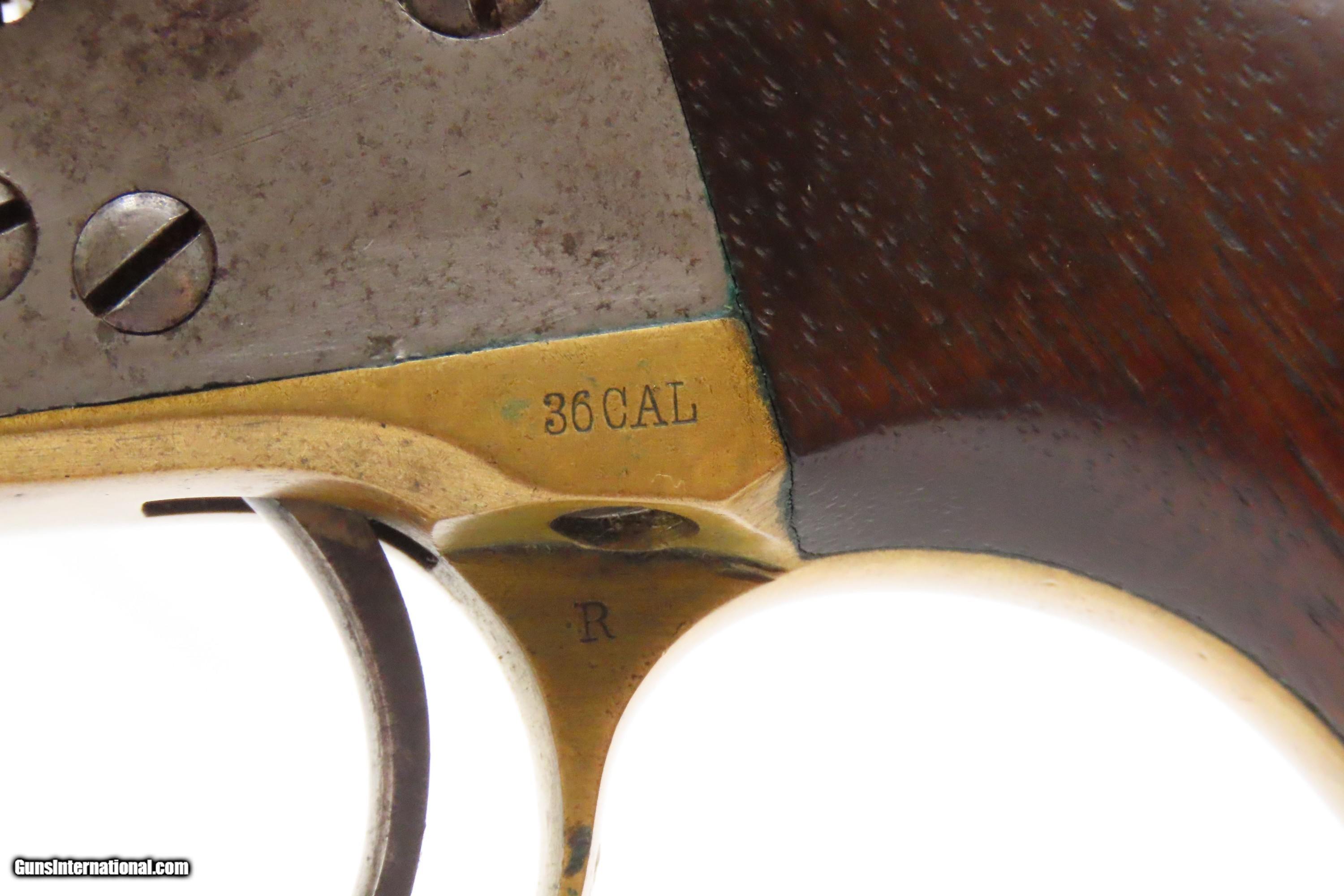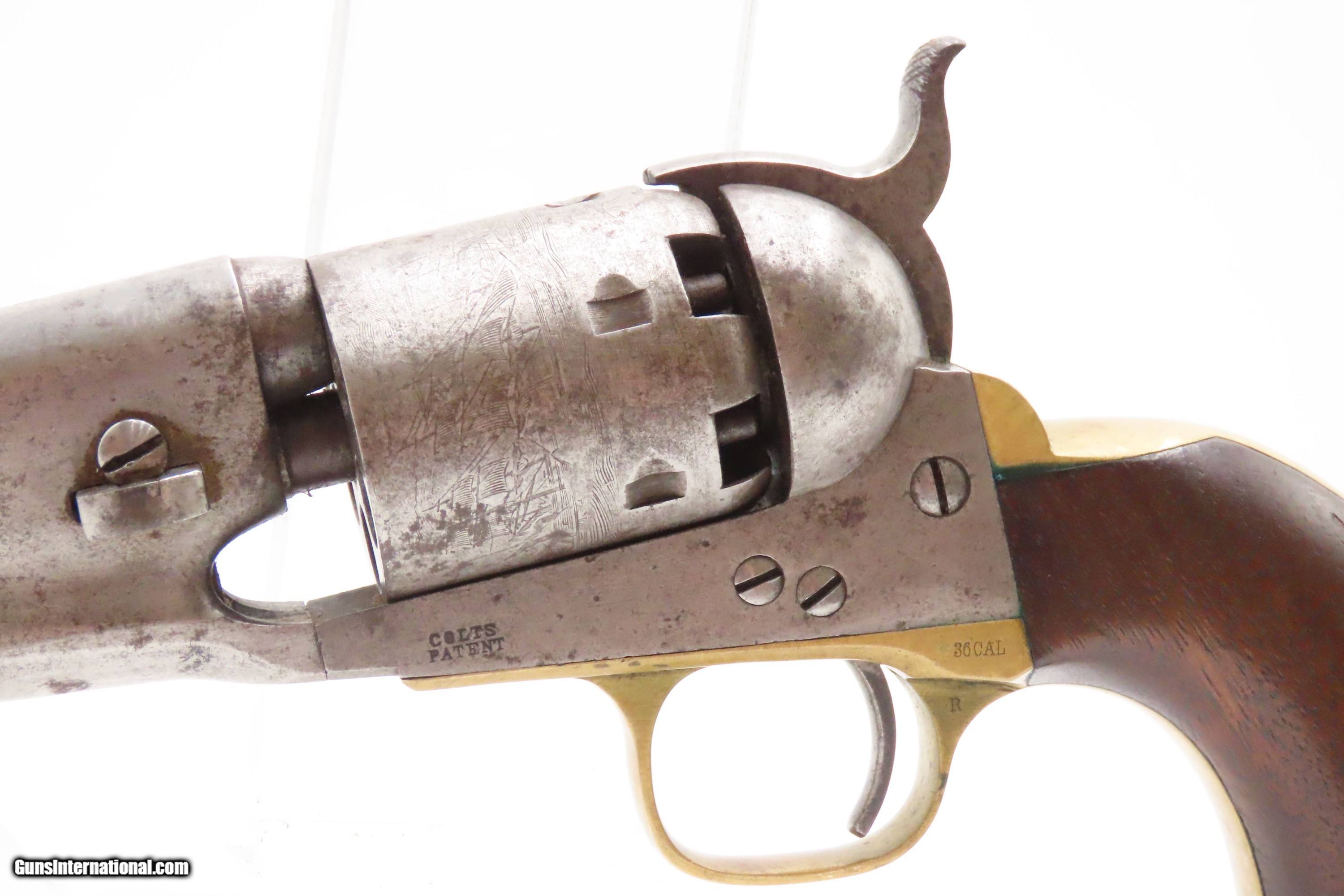 Description: RARE Early Production CIVIL WAR Antique COLT M1861 NAVY Percussion Revolver Produced in 1861 with MATCHING SERIAL NUMBERS Here we present an antique Rare Early Production Colt Model 1861 Navy Percussion Revolver, made in 1861 at the start of the American Civil War. The introduction of the 1861 Navy was simply an update to the very successful 1851 Navy, with the primary differences being the round barrel instead of octagonal, and the addition of the creeping style of loading lever. These updates made for a sleek package that very much resembled Colt’s crowning achievement, the 1860 Army. The 1861 Navy still retained its .36 caliber, making this the preferred firearm for many not wanting to step up to a .44 like the Army, while still sharing most of its dimensions. The Colt Model 1861 Navy was formally adopted by the Union government and was used by both the Army and the Navy. Many of those sold to the military were never martially inspected or marked. Of course, there was a healthy commercial market for these during the war, and many soldiers privately purchased these revolvers as well. In a slightly smaller and lighter package than its 1860 Army big brother, many soldiers and cavalry preferred the Navy in .36 caliber. Of course, these weapons continued to be used well after the Civil War, especially during Westward Expansion. The overall condition is good+. Patina throughout. Very good Battle of Campeche cylinder scene. The action is excellent. The bore is in good condition with strong rifling. The grip is solid. Numbers match throughout. Own the original! This is a legitimate antique and not a reproduction. Barrel is 7-1/2 inches. Caliber: .36 Percussion Overall condition as seen in photos. Very Fast. Very Safe. FREE SHIPPING WORLDWIDE. Delivered directly to your door by express mail! Guaranteed AUTHENTIC & Includes CERTIFICATE OF AUTHENTICITY. ancestryguns $2600 #247150 SOLD Antique: Yes |