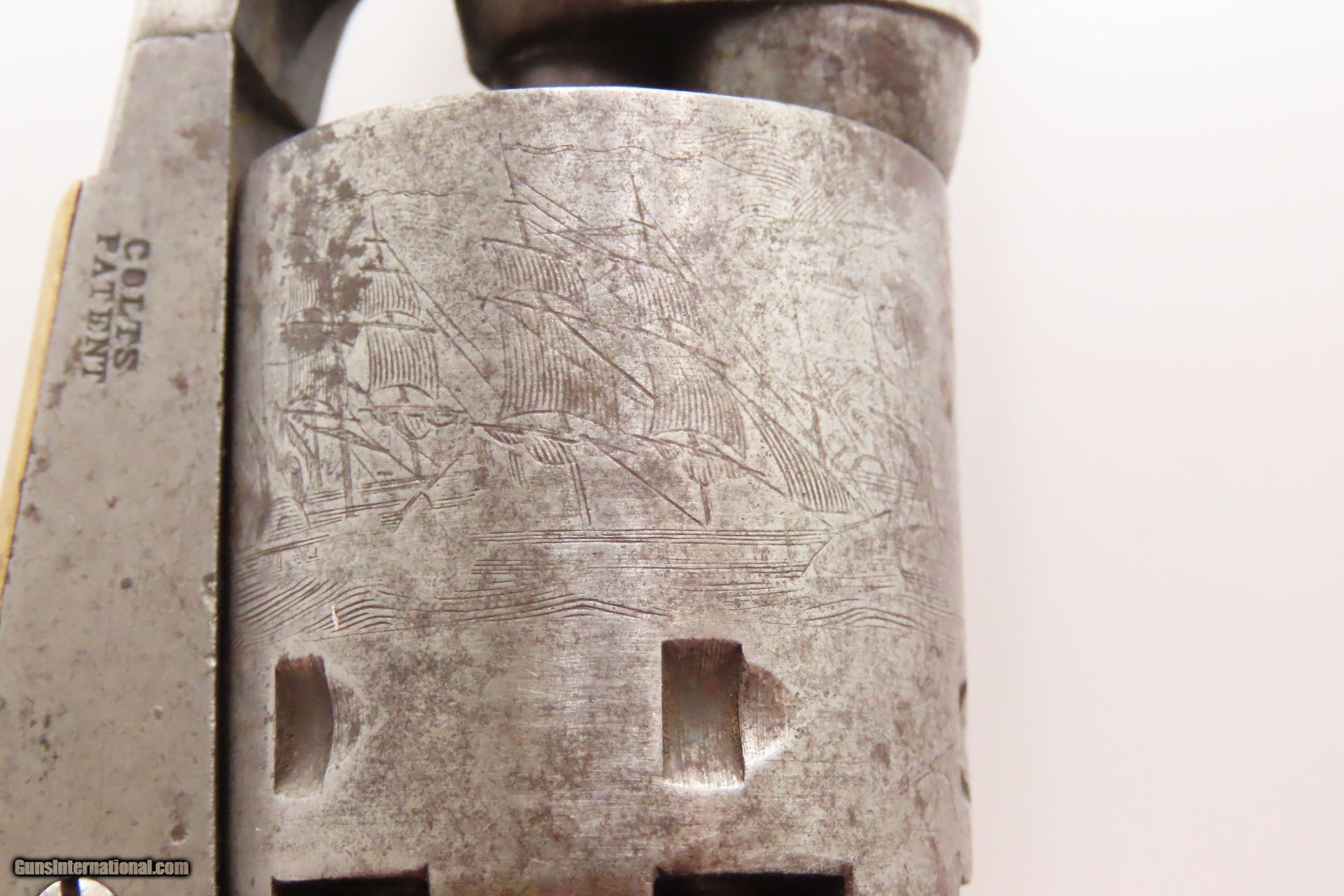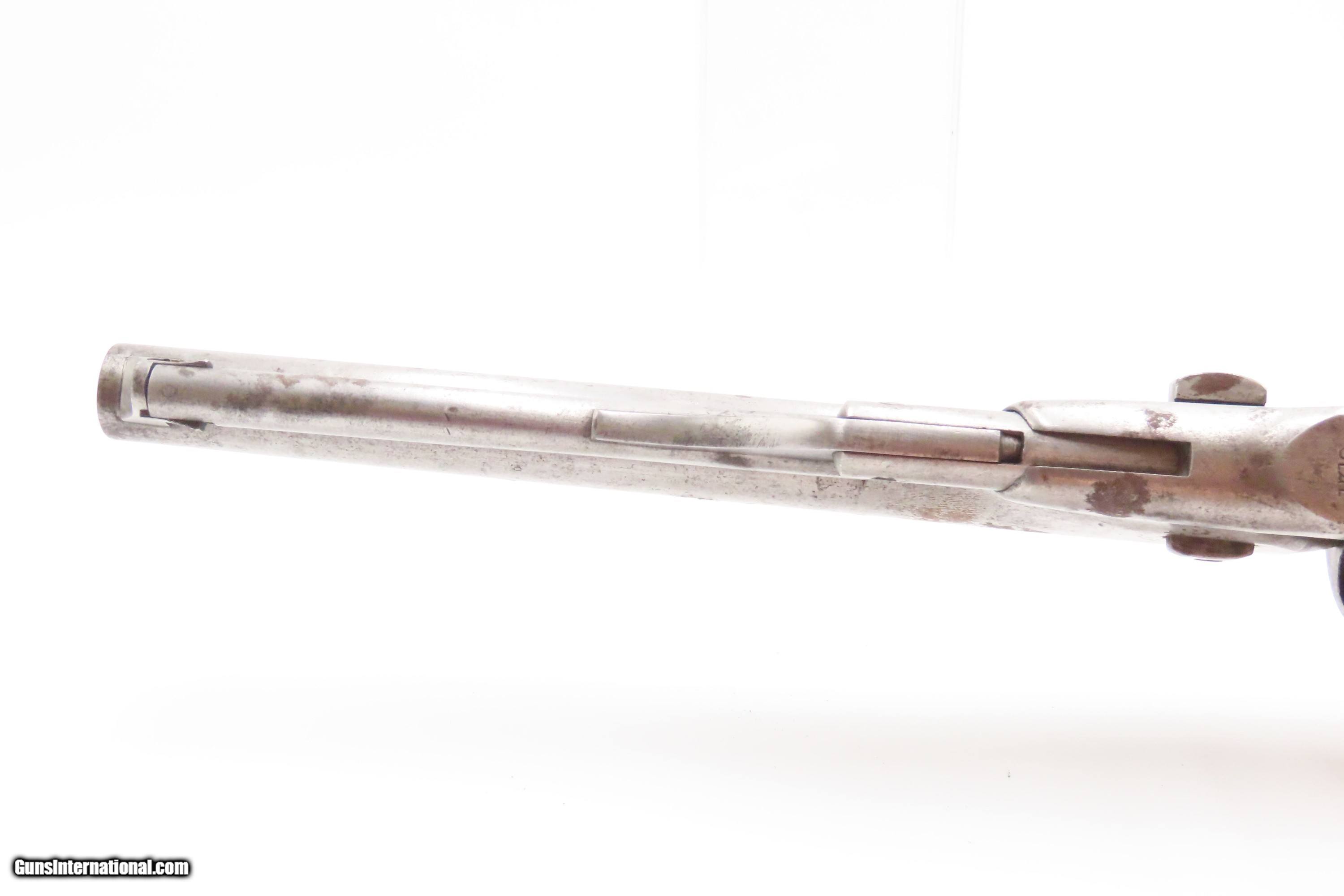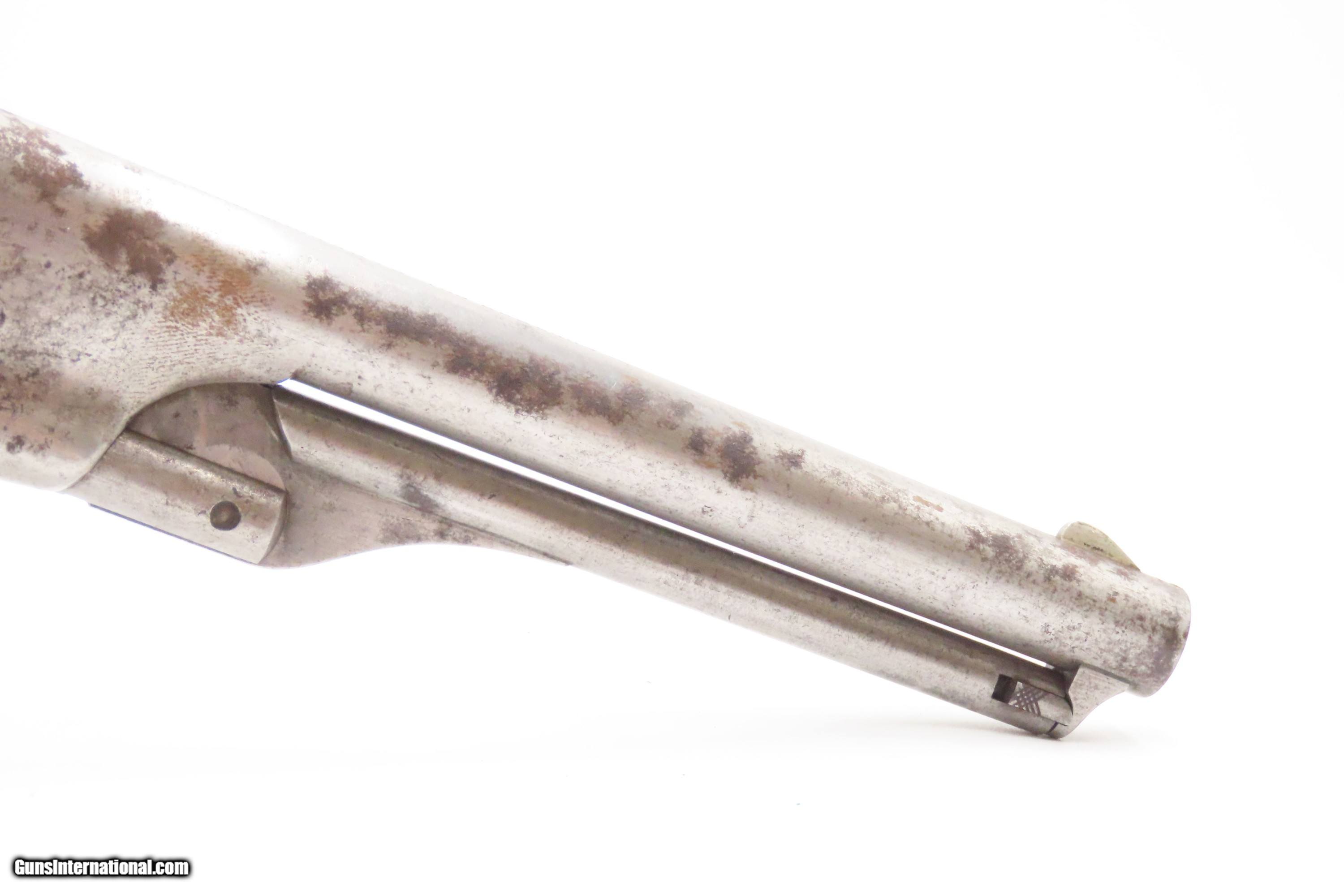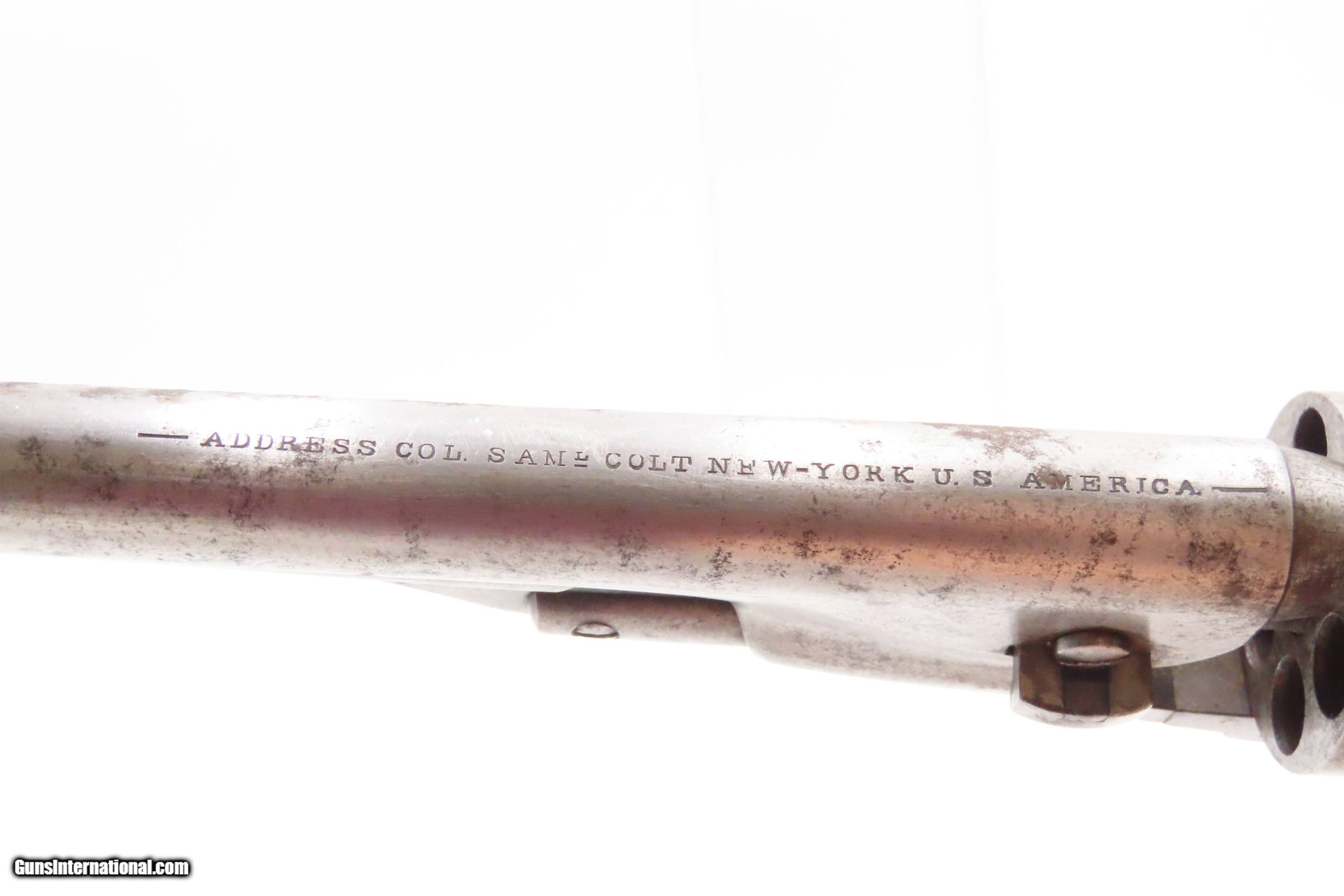 Description: RARE Early Production CIVIL WAR Antique COLT M1861 NAVY Percussion Revolver Produced in 1861 with MATCHING SERIAL NUMBERS Here we present an antique Rare Early Production Colt Model 1861 Navy Percussion Revolver, made in 1861 at the start of the American Civil War. The introduction of the 1861 Navy was simply an update to the very successful 1851 Navy, with the primary differences being the round barrel instead of octagonal, and the addition of the creeping style of loading lever. These updates made for a sleek package that very much resembled Colt’s crowning achievement, the 1860 Army. The 1861 Navy still retained its .36 caliber, making this the preferred firearm for many not wanting to step up to a .44 like the Army, while still sharing most of its dimensions. The Colt Model 1861 Navy was formally adopted by the Union government and was used by both the Army and the Navy. Many of those sold to the military were never martially inspected or marked. Of course, there was a healthy commercial market for these during the war, and many soldiers privately purchased these revolvers as well. In a slightly smaller and lighter package than its 1860 Army big brother, many soldiers and cavalry preferred the Navy in .36 caliber. Of course, these weapons continued to be used well after the Civil War, especially during Westward Expansion. The overall condition is good+. Patina throughout. Very good Battle of Campeche cylinder scene. The action is excellent. The bore is in good condition with strong rifling. The grip is solid. Numbers match throughout. Own the original! This is a legitimate antique and not a reproduction. Barrel is 7-1/2 inches. Caliber: .36 Percussion Overall condition as seen in photos. Very Fast. Very Safe. FREE SHIPPING WORLDWIDE. Delivered directly to your door by express mail! Guaranteed AUTHENTIC & Includes CERTIFICATE OF AUTHENTICITY. ancestryguns $2600 #247150 SOLD Antique: Yes |