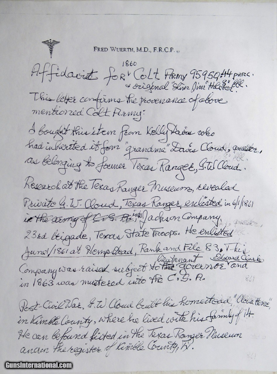 RARE & HISTORIC FAMILY DOCUMENTED COLT 1860 ARMY from COLLECTING TEXAS – BELONGING to G.W. CLOUD – TEXAS RANGER