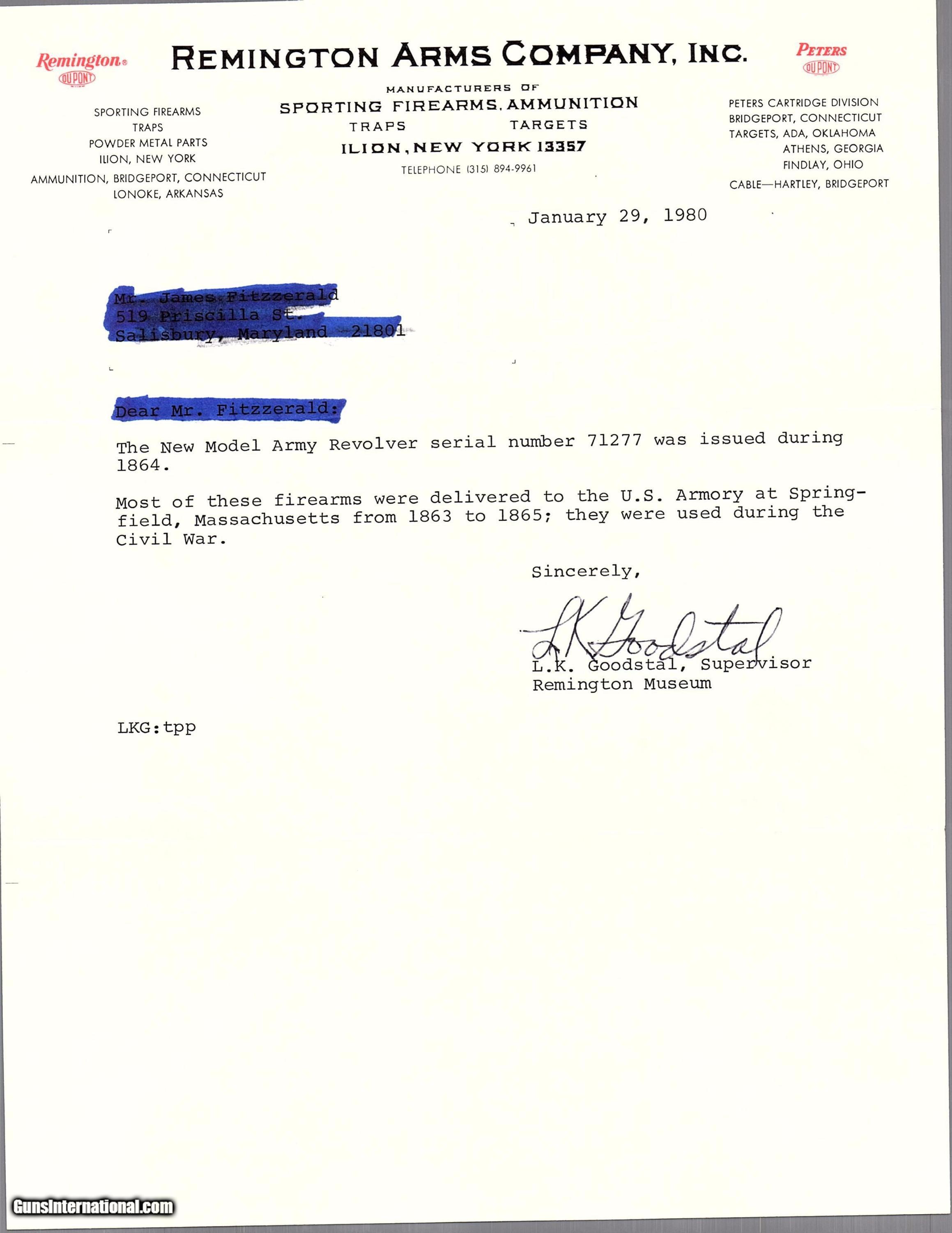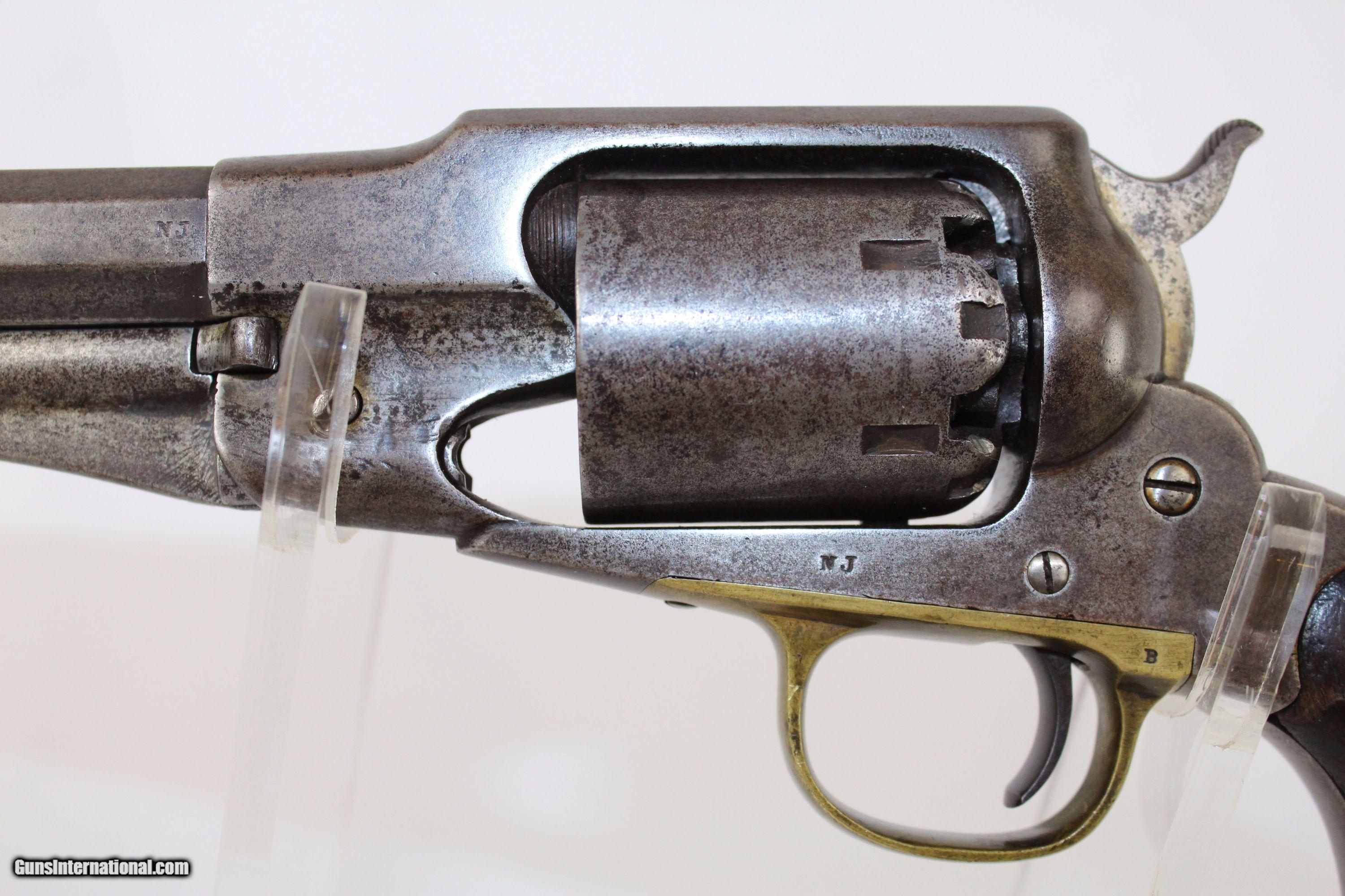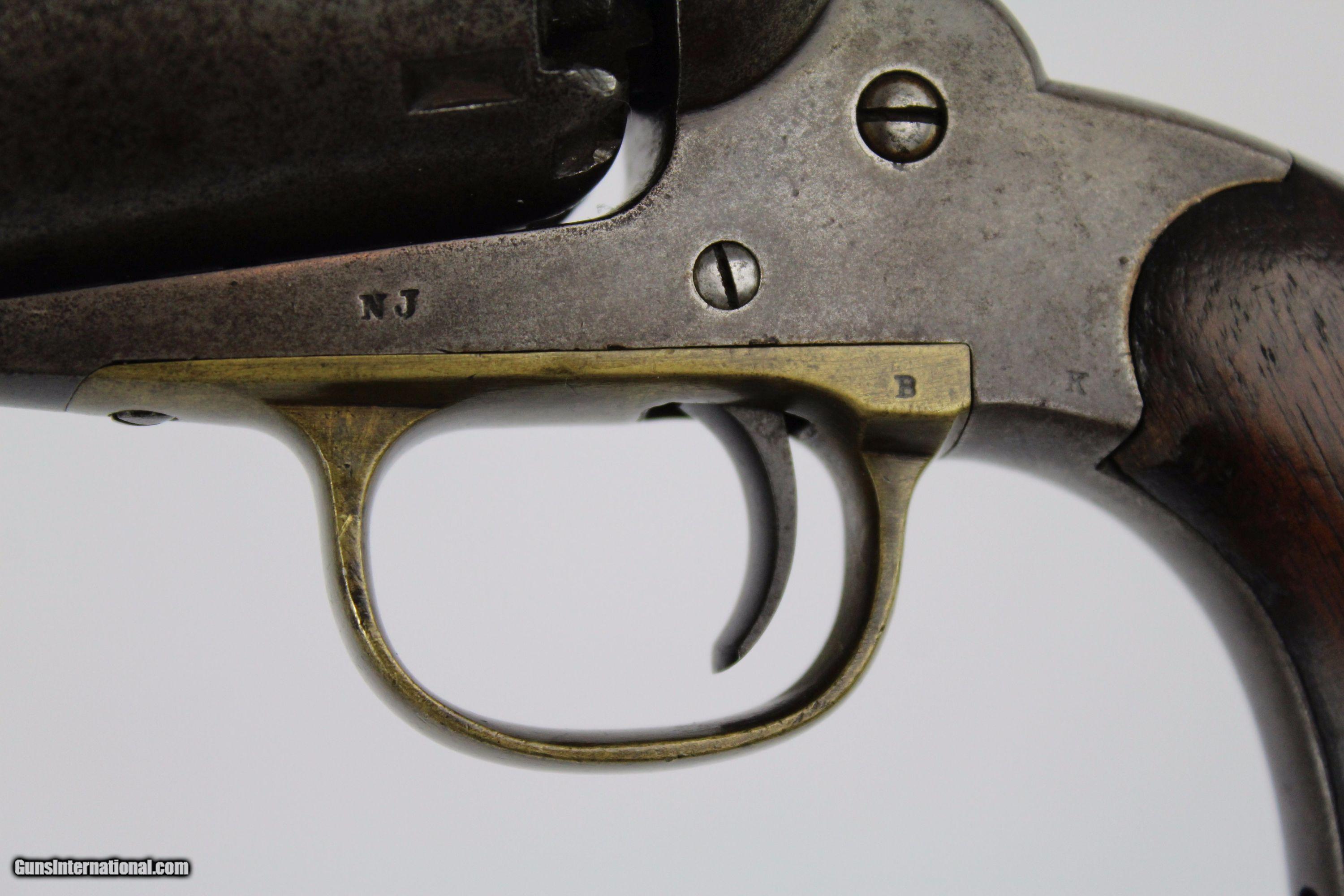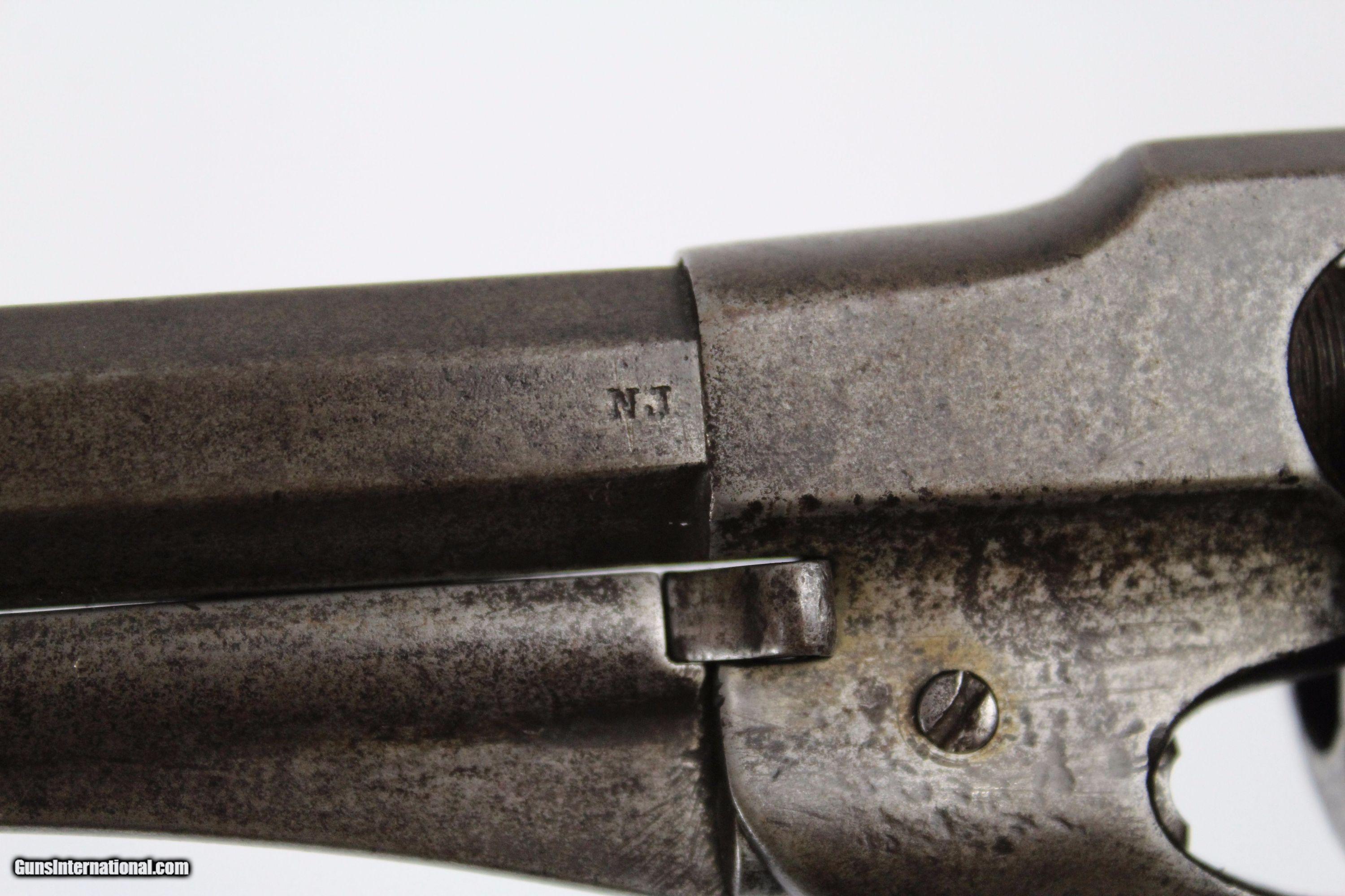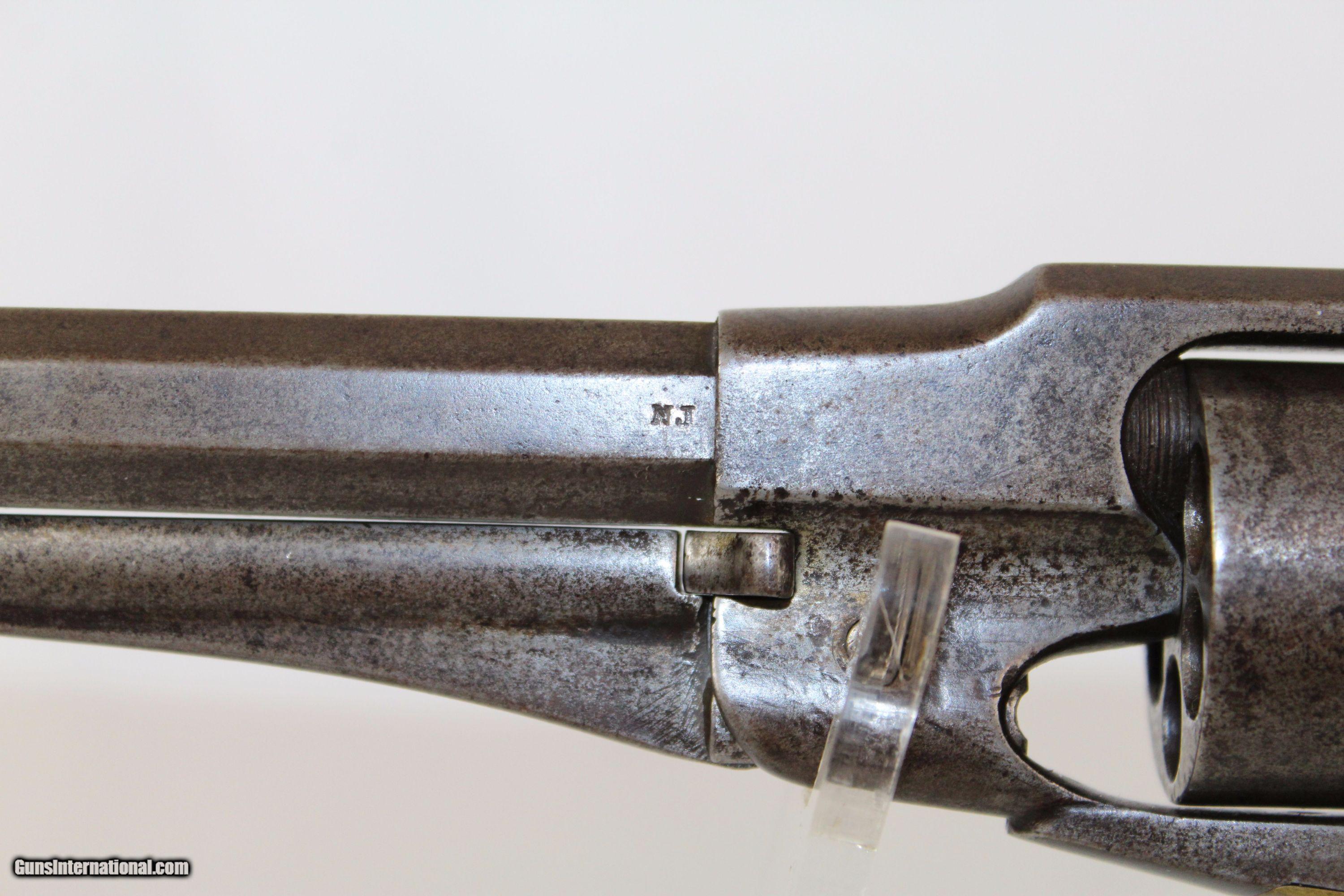 Description: RARE & LETTERED New Jersey Contract Remington Army New Model Army Revolver Issued in 1864 to NJ Militia Here we present an antique Remington New Model Army Revolver, issued to the New Jersey State Militia in 1864, during the American Civil War, according to the accompanying Remington Museum Archive Letter. Only 1,000 of these revolvers were made on this contract, a tiny fraction of the entire production. New Jersey contributed greatly to the Union war effort, fielding over 88,000 troops, a significant portion of which was integrated into the Army of the Potomac. The Remington New Model Army represents the second-most number of issued handguns found on Civil War battlefields, second only to the Colt 1860 Army. The Remington featured a strong, solid-frame design with the groove in the top for a rear sight, as opposed to Colt’s open-top design. Though Colt got the lion’s share of the government contracts, many consider the Remington New Model Army the superior firearm. This example features “NJ” markings on the rear portion of the barrel and the frame on the left side. Small government inspector markings are found throughout. The barrel address reads “PATENTED SEPT. 14 1858/E. REMINGTON & SONS ILION NY USA”. The overall condition of the piece is very good. The metal surfaces have an untouched, dark patina. The markings are clear and legible. Serial numbers match. The walnut grips are smooth and in very good condition. The grips also match the serial number. The bore is sharp and clean. The action is excellent. Here is a very nice example of a rare, New Jersey State Militia issued Remington New Model Army, complete with a Remington Museum Letter from 1980! This is not something you find every day. Own the original! This is a legitimate antique and not a reproduction. Barrel is 8 inches. Caliber: .44 Percussion Overall condition as seen in photos. Very Fast. Very Safe. FREE SHIPPING WORLDWIDE. Delivered directly to your door by express mail! Guaranteed AUTHENTIC & Includes CERTIFICATE OF AUTHENTICITY. ancestryguns $3500 #5005 SOLD Antique: Yes |