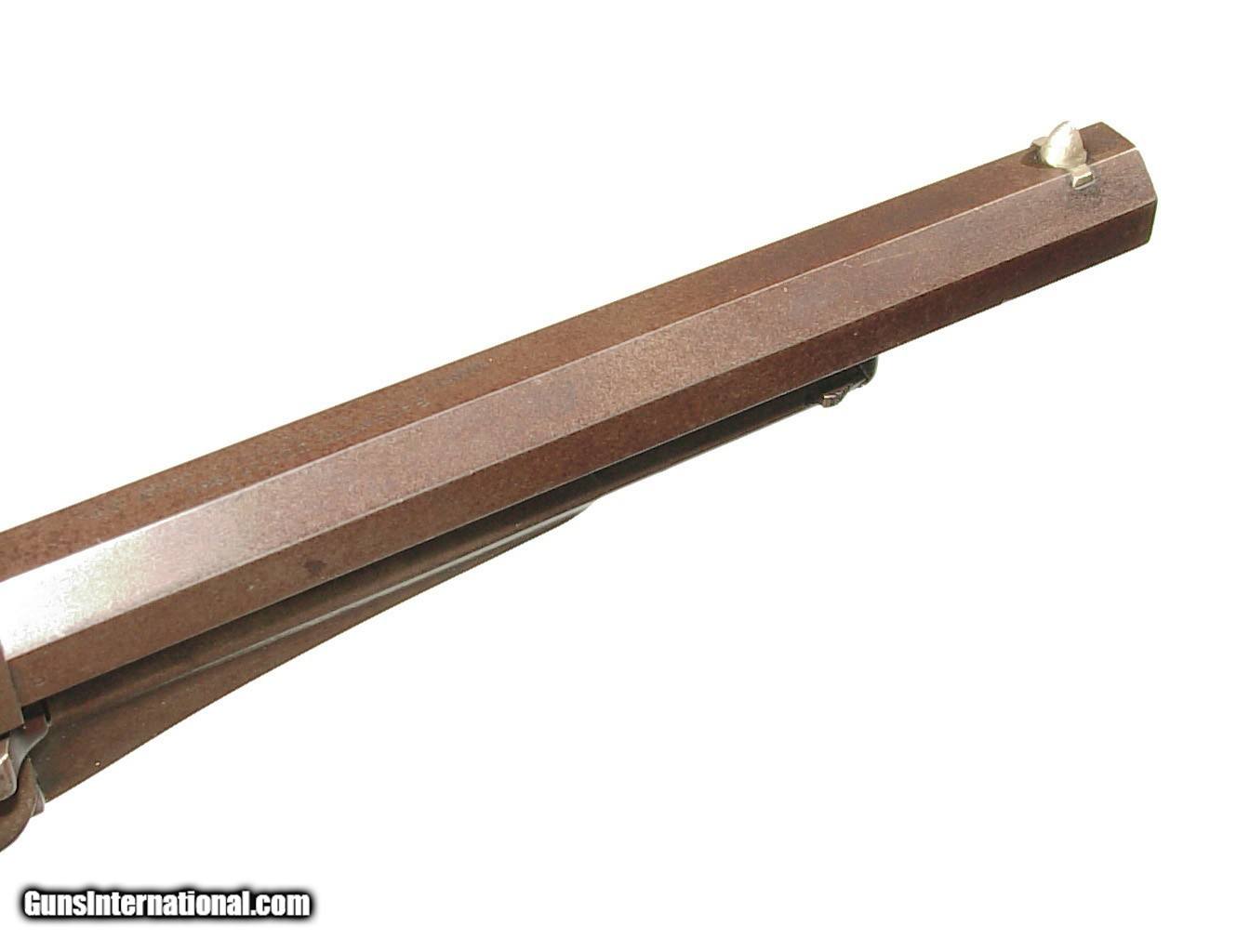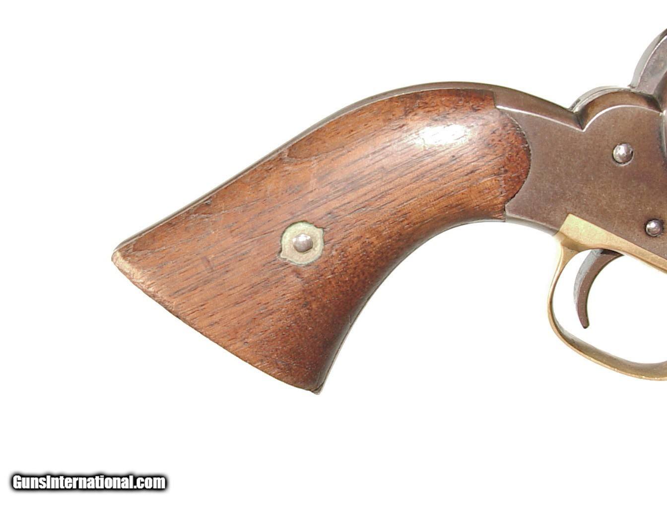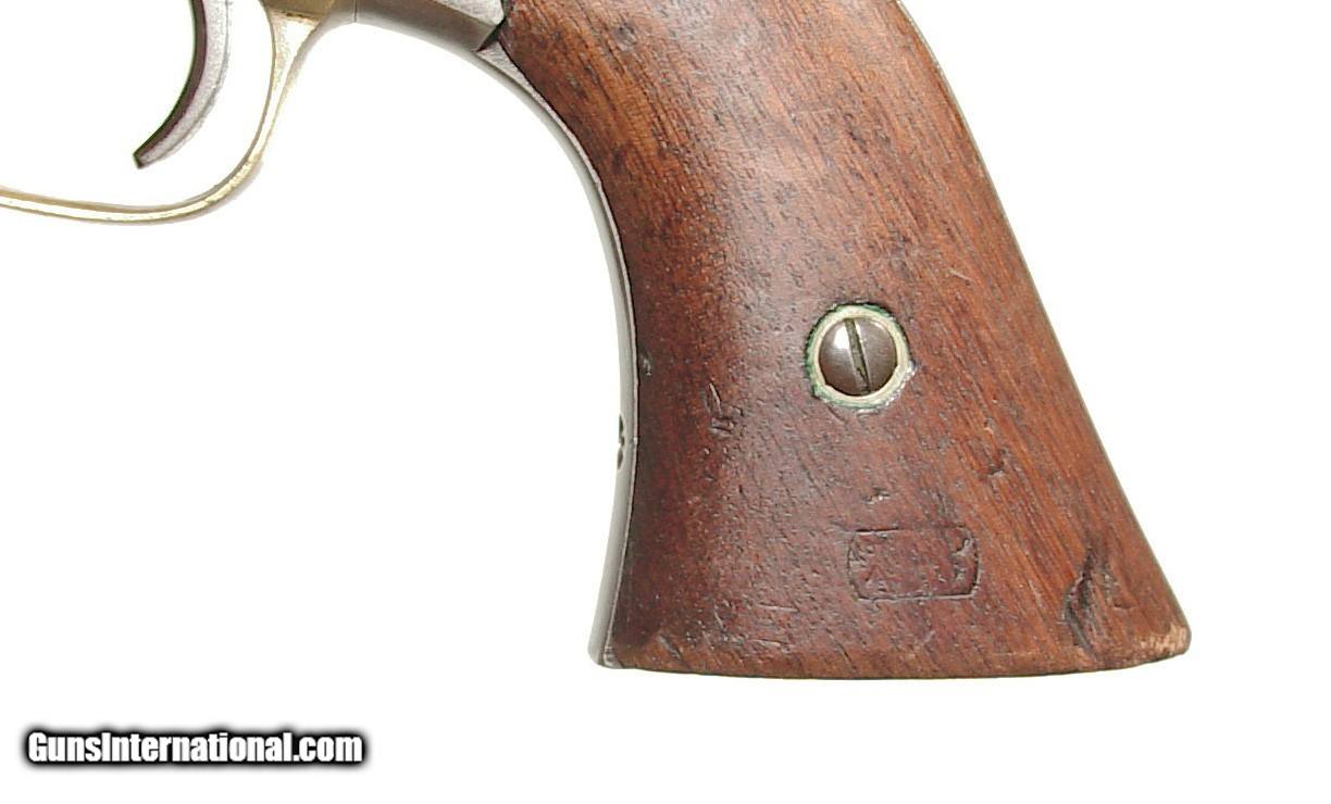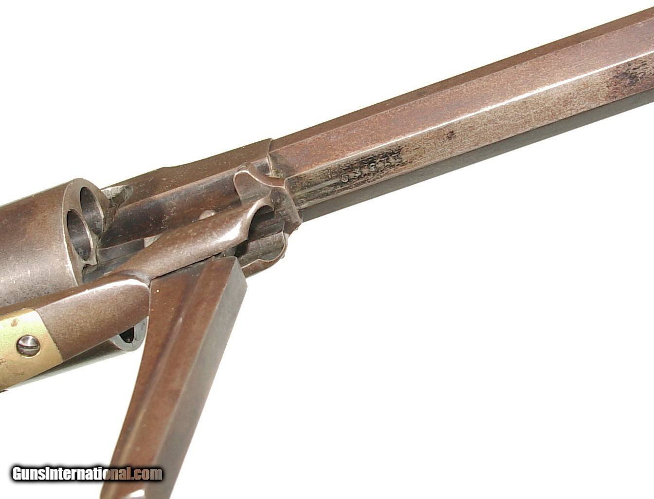 Description: .44 caliber, 8" octagon barrel with loading rod located underneath. Six shot cylinder. Two piece wooden grips with the left bearing the U.S. inspector's cartouche. A crisp example with the metal parts showing blue mixing with plum, very smooth surfaces and sharp edges. The correct single letter inspection initials can be found on the appropriate parts and all of the stampings are sharp and clear. Mechanically excellent. Excellent bright bore and perfect rifling. SOLD Antique: Yes |