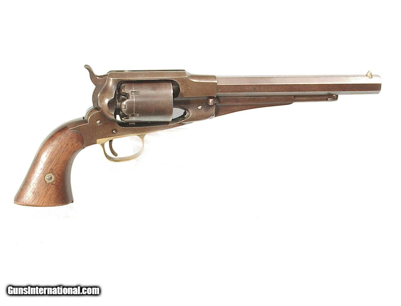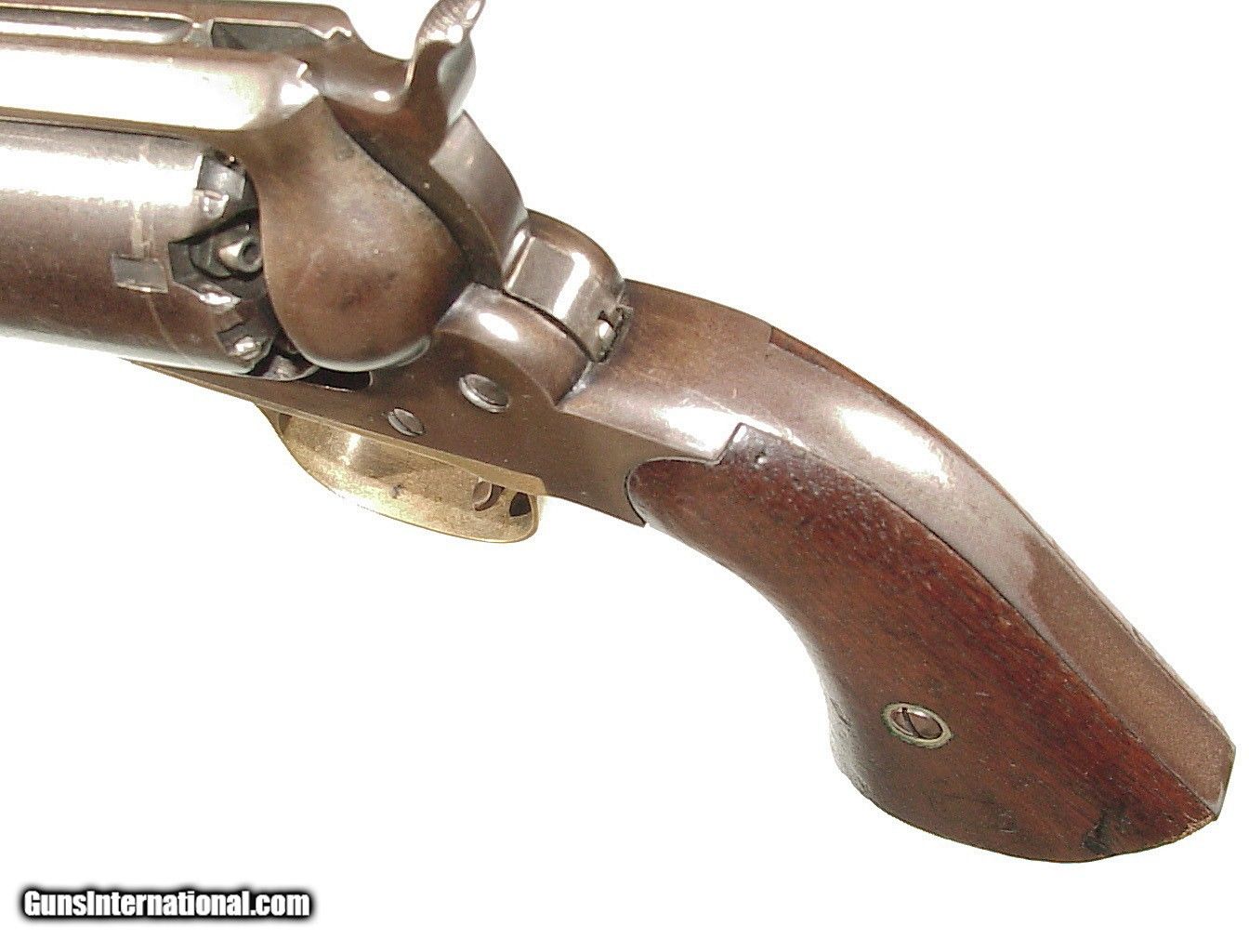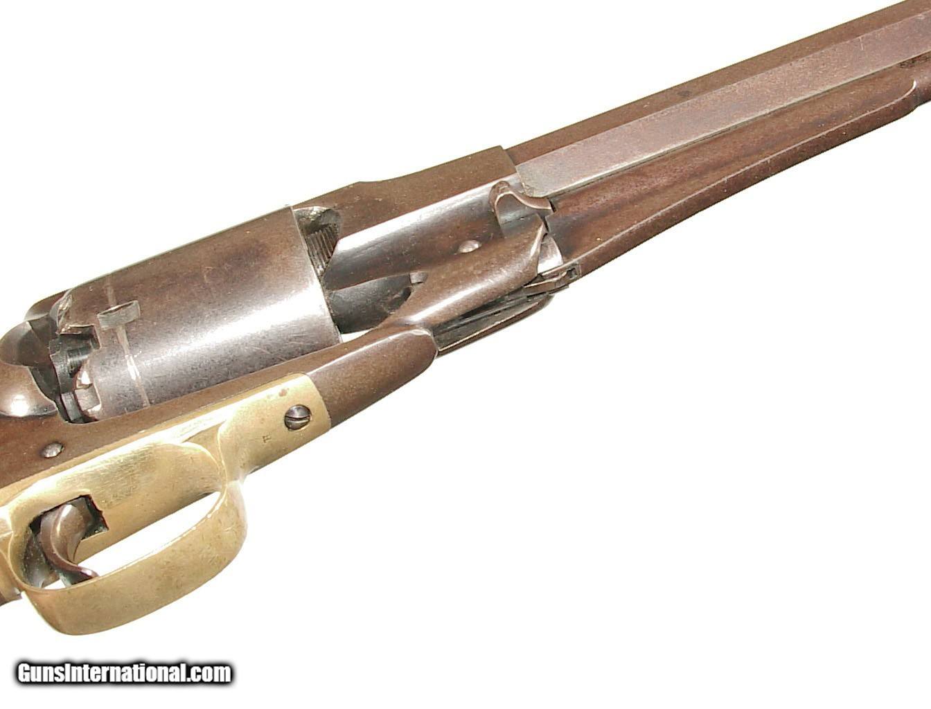 Description: .44 caliber, 8" octagon barrel with loading rod located underneath. Six shot cylinder. Two piece wooden grips with the left bearing the U.S. inspector's cartouche. A crisp example with the metal parts showing blue mixing with plum, very smooth surfaces and sharp edges. The correct single letter inspection initials can be found on the appropriate parts and all of the stampings are sharp and clear. Mechanically excellent. Excellent bright bore and perfect rifling. SOLD Antique: Yes |