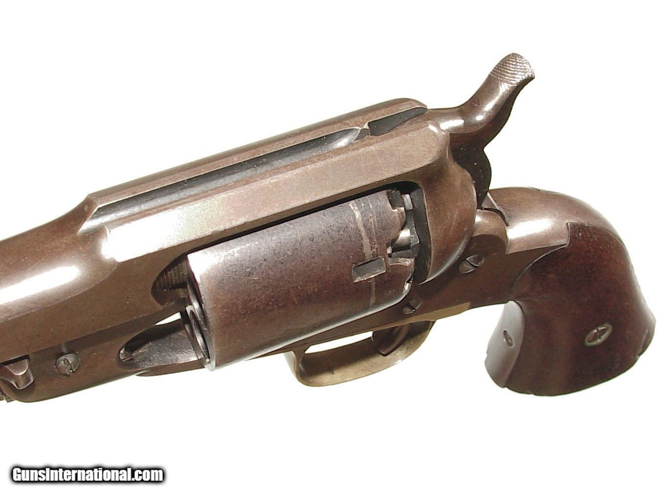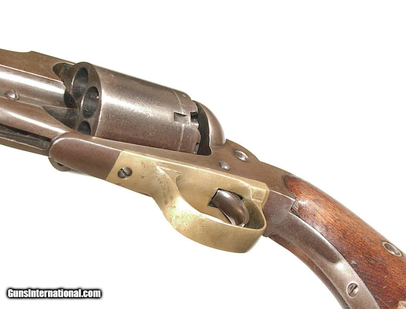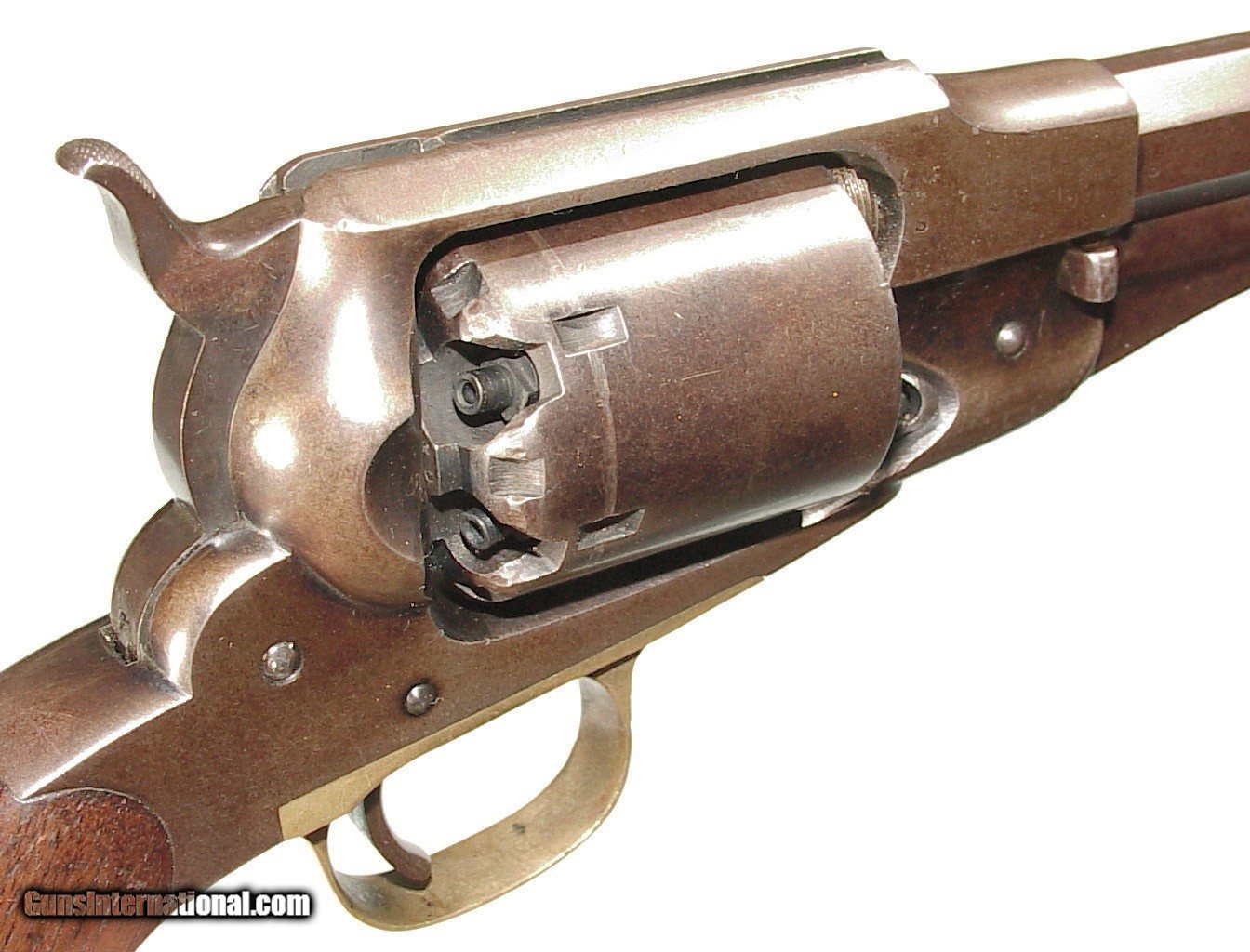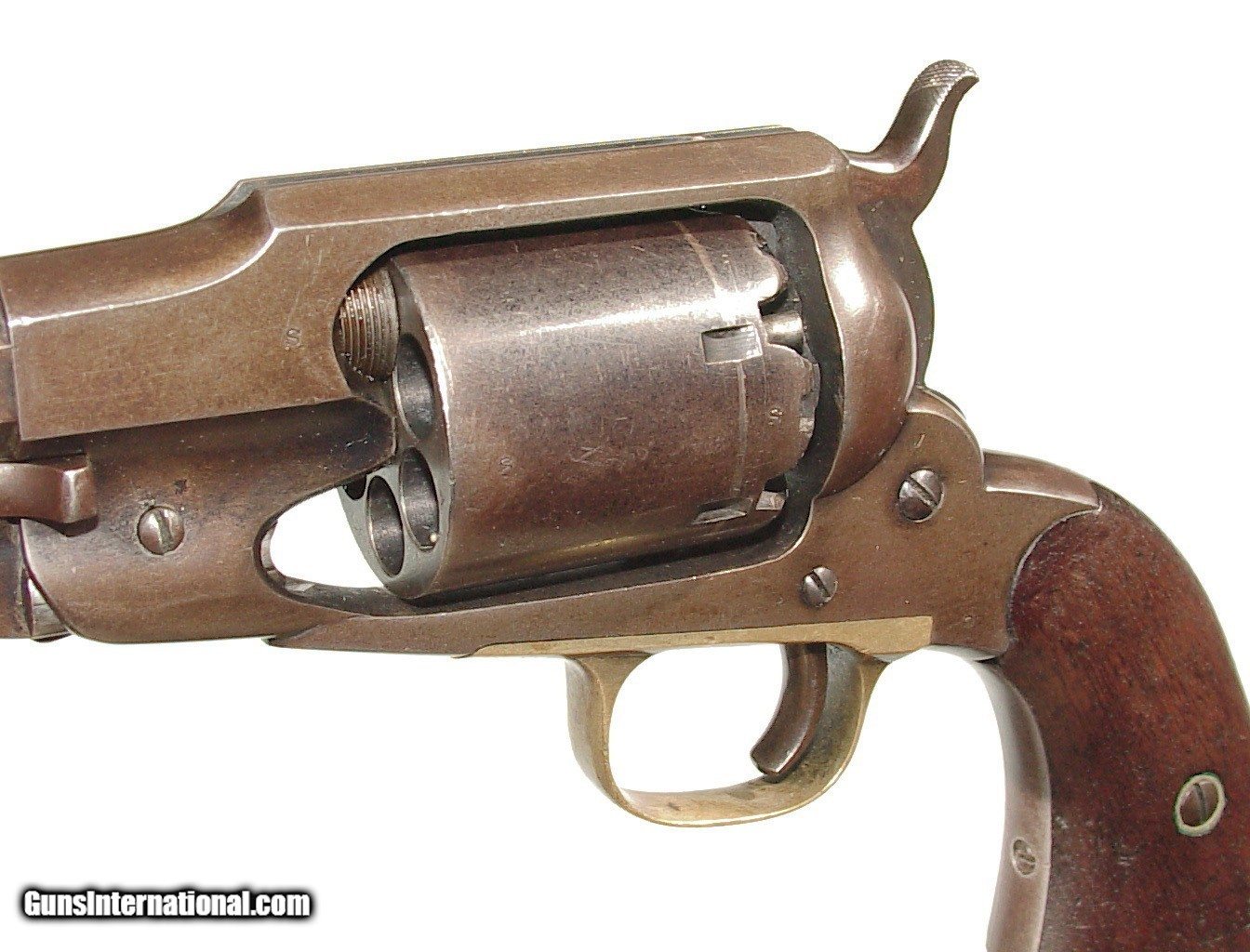 Description: .44 caliber, 8" octagon barrel with loading rod located underneath. Six shot cylinder. Two piece wooden grips with the left bearing the U.S. inspector's cartouche. A crisp example with the metal parts showing blue mixing with plum, very smooth surfaces and sharp edges. The correct single letter inspection initials can be found on the appropriate parts and all of the stampings are sharp and clear. Mechanically excellent. Excellent bright bore and perfect rifling. SOLD Antique: Yes |