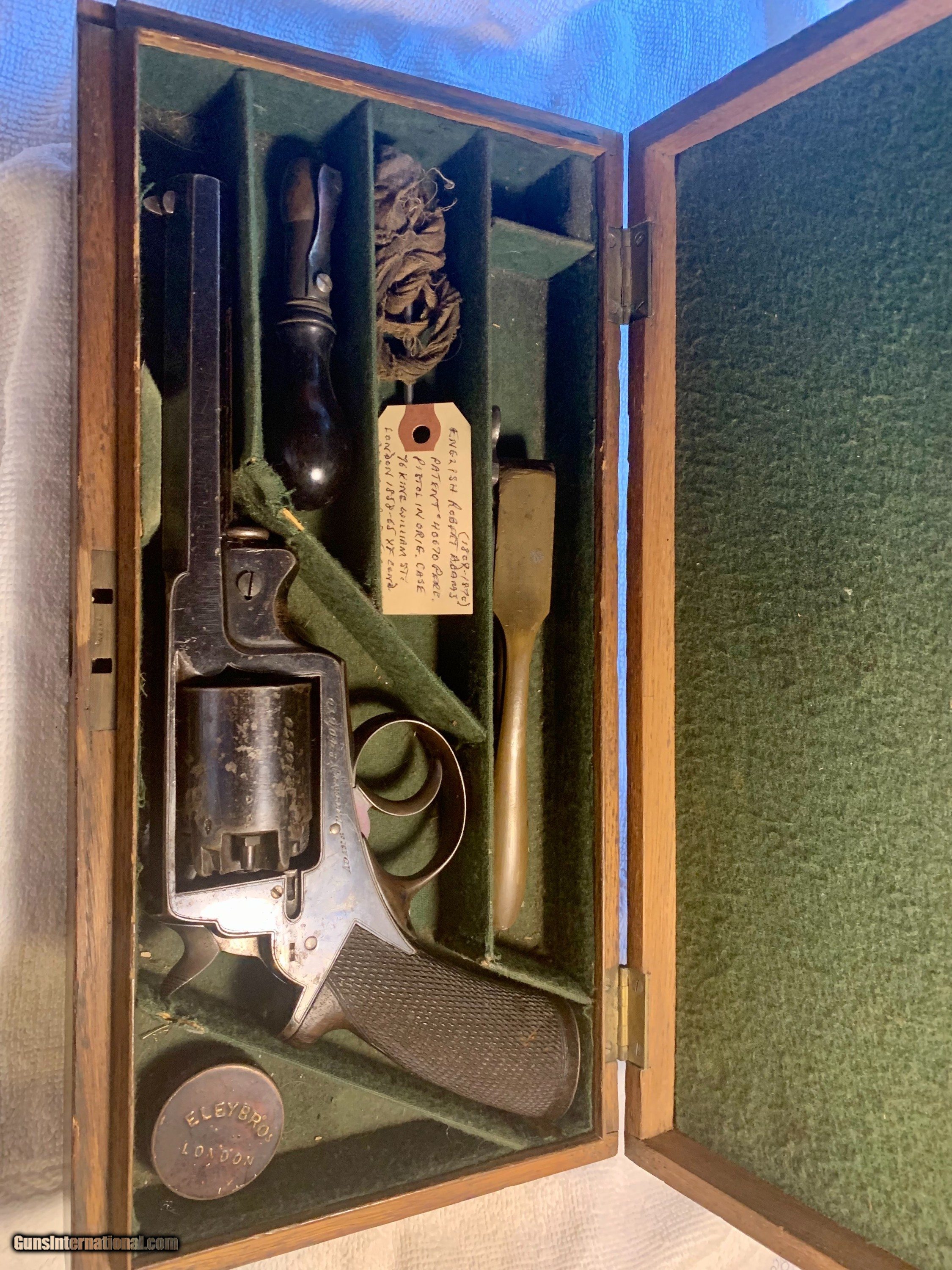 Description: Beautiful and rare to find in its factory case. Robert Adams b 1808-1870 London. all original accessories intact 90% color .45 caliber, 5 3/4" barrel. serial # 596 excellent bore F/XF condition SOLD SOLD Antique: Yes |