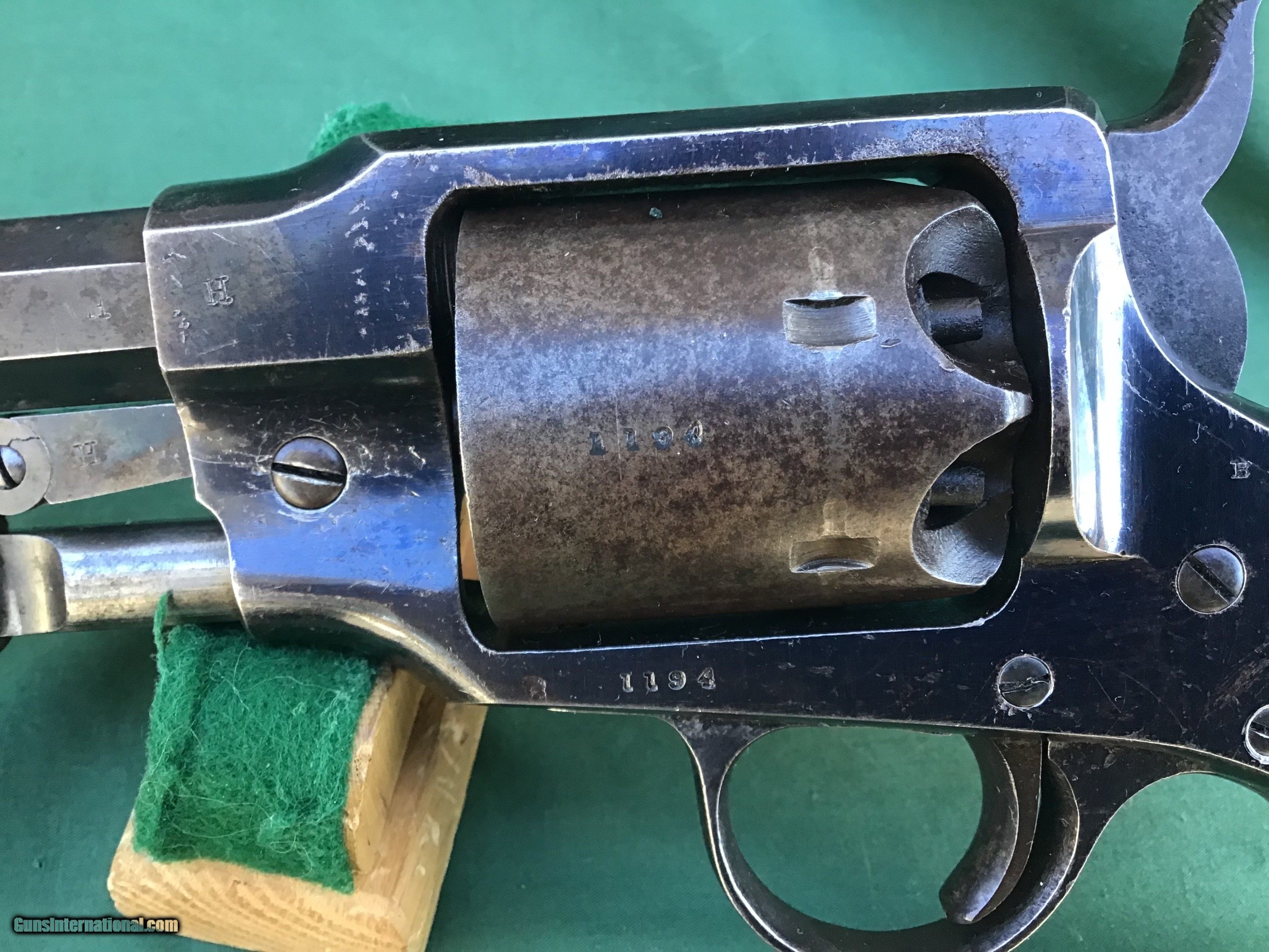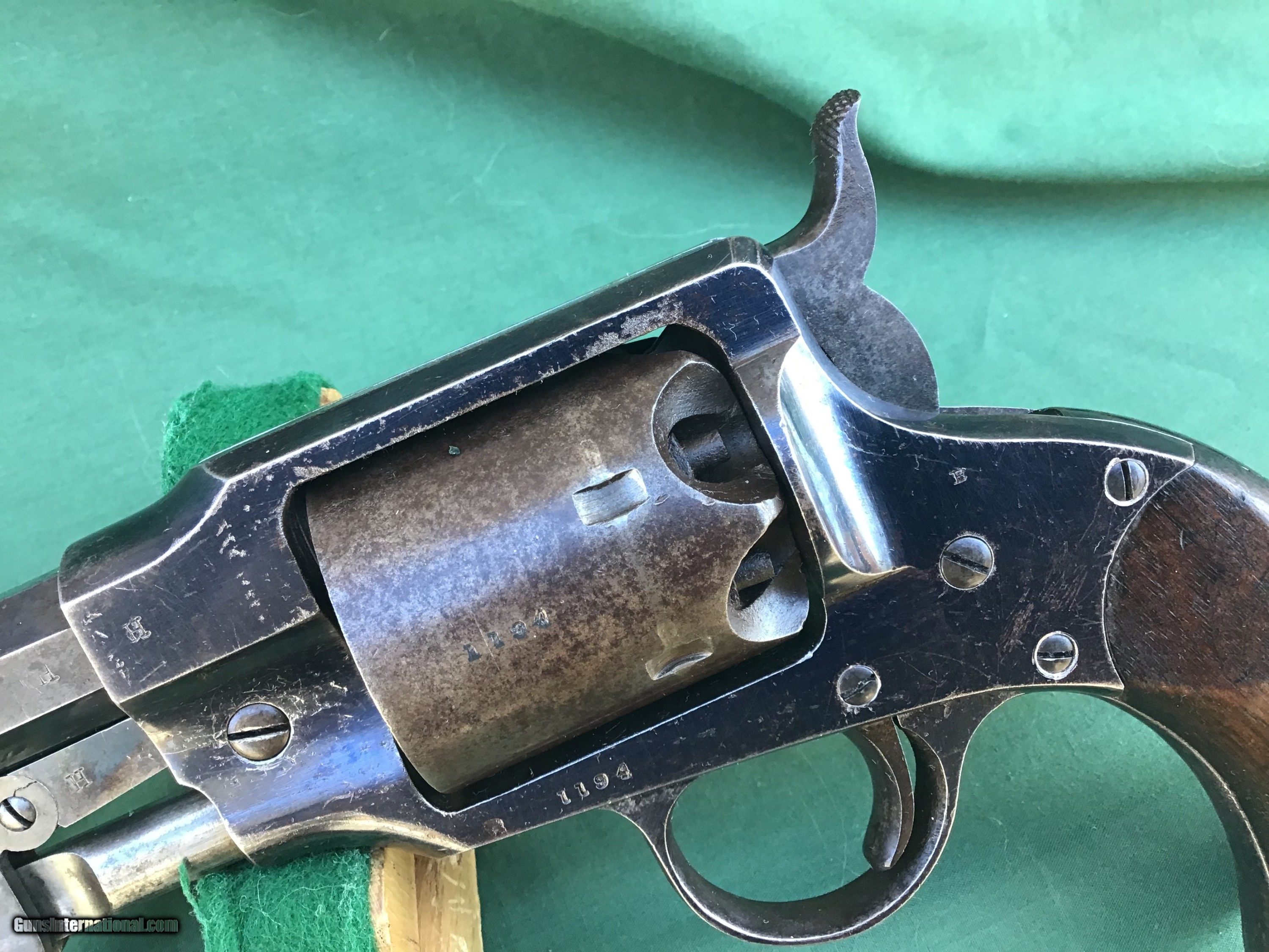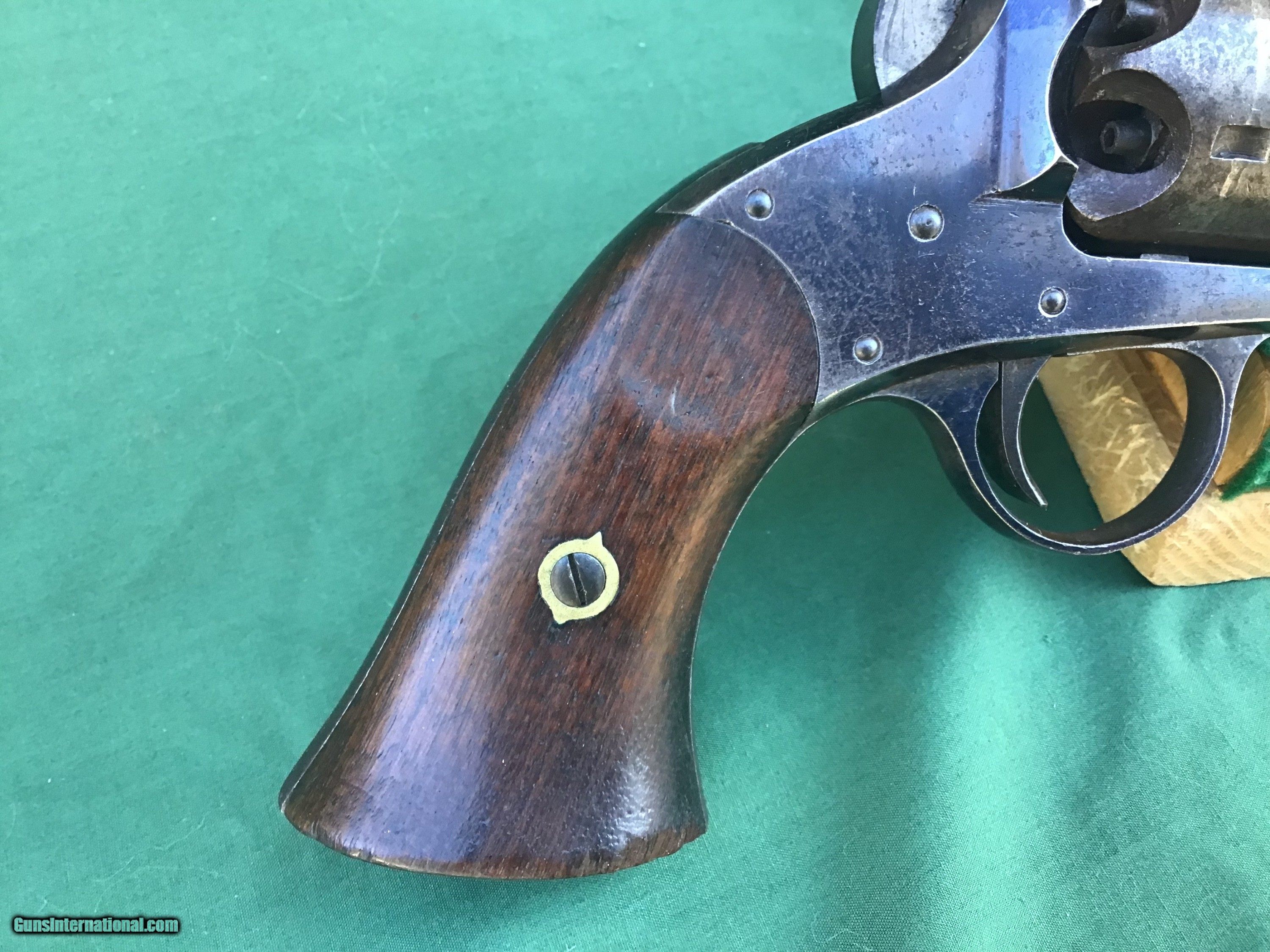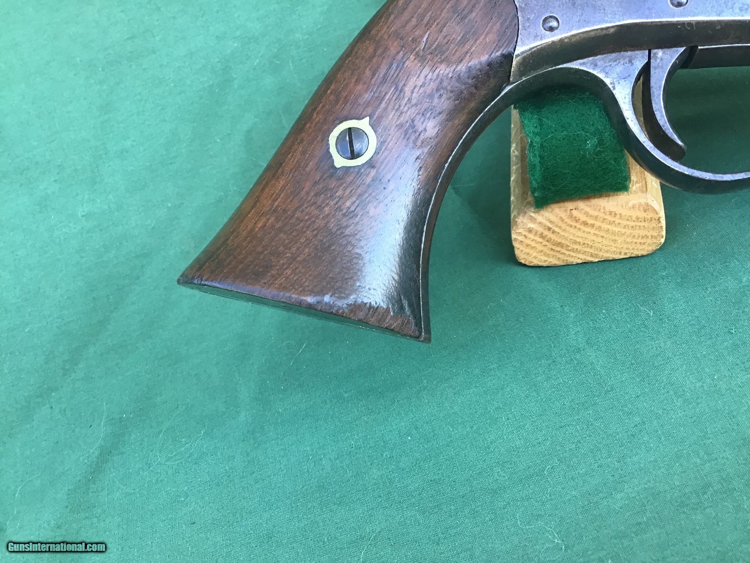 Description: Rogers and Spencer Revolver serial number 1194. It has all matching serial numbers. Very nice grips with inspector marks and cartouche. Some light chipping on right grip on lower edge (see pic). Barrel retains 85 to 90% original blue. Receiver exhibits about the same 85 to 90%. Case colors are still showing on loading lever. All the sub inspector marks are present on the various parts. Blackstrap retains 70 to 75% original blue as well. Silvered out case colors on hammer and cylinder exhibits a nice brown patina. Nice bore. Gun functions as it should. Hammer functions when fired, but if held back by thumb it's a little sticky. Should be cleaned. Please make no mistake, the revolver indexes and functions properly (great mainspring but sticky / gummy hammer). If your looking for an above average Rodgers and Spencer here is your chance. Please feel free to contact me with questions. SOLD Antique: Yes |