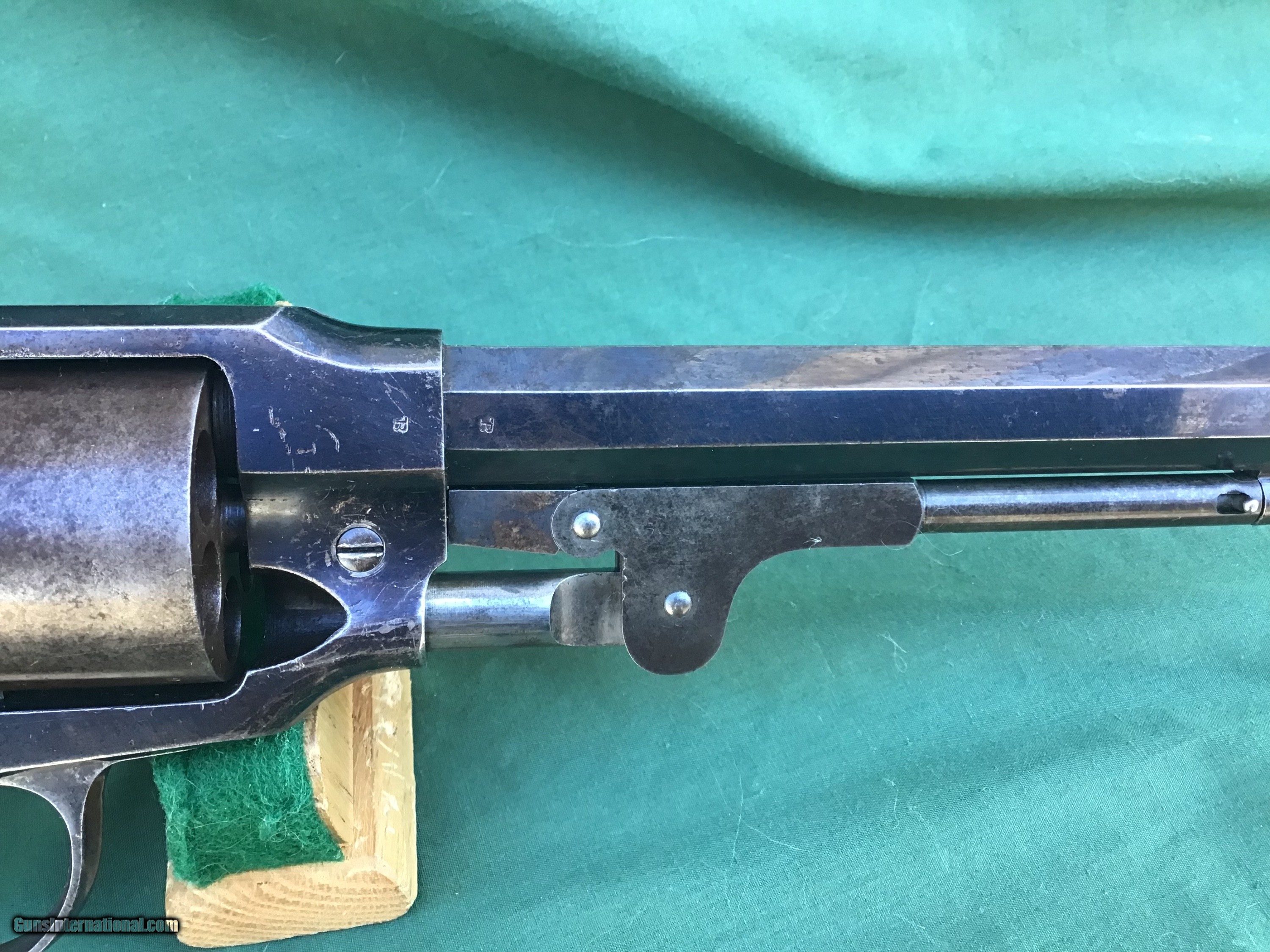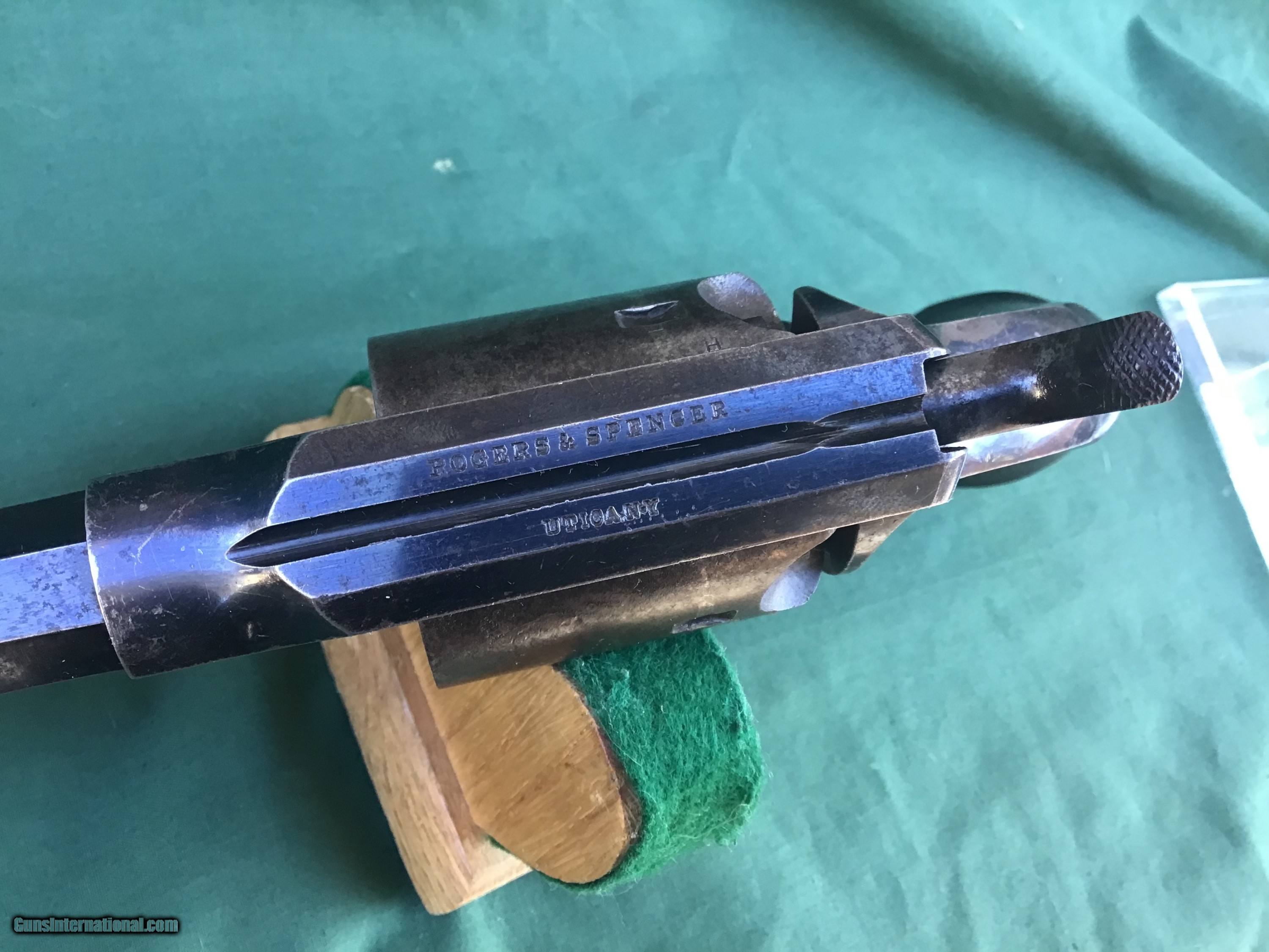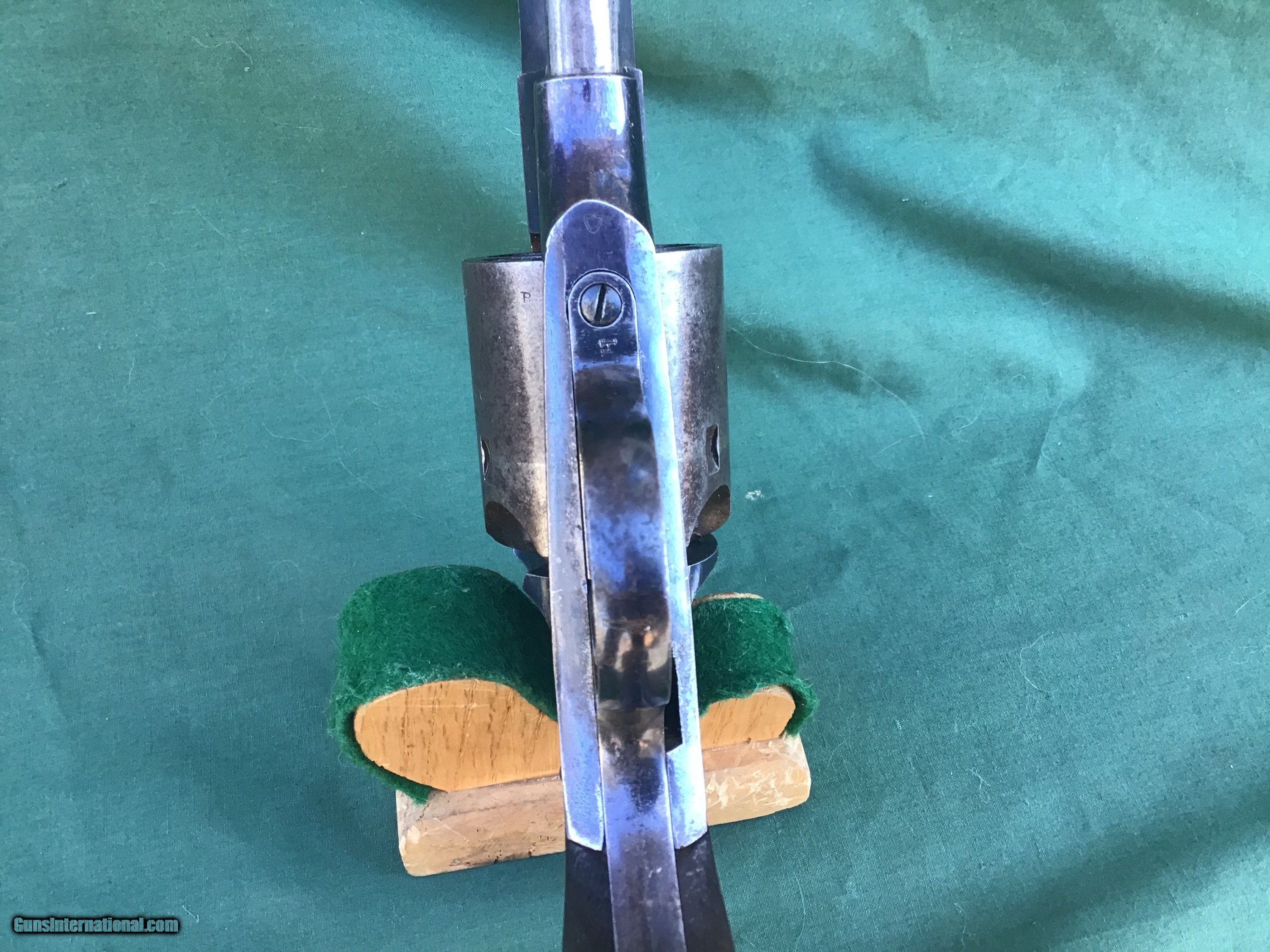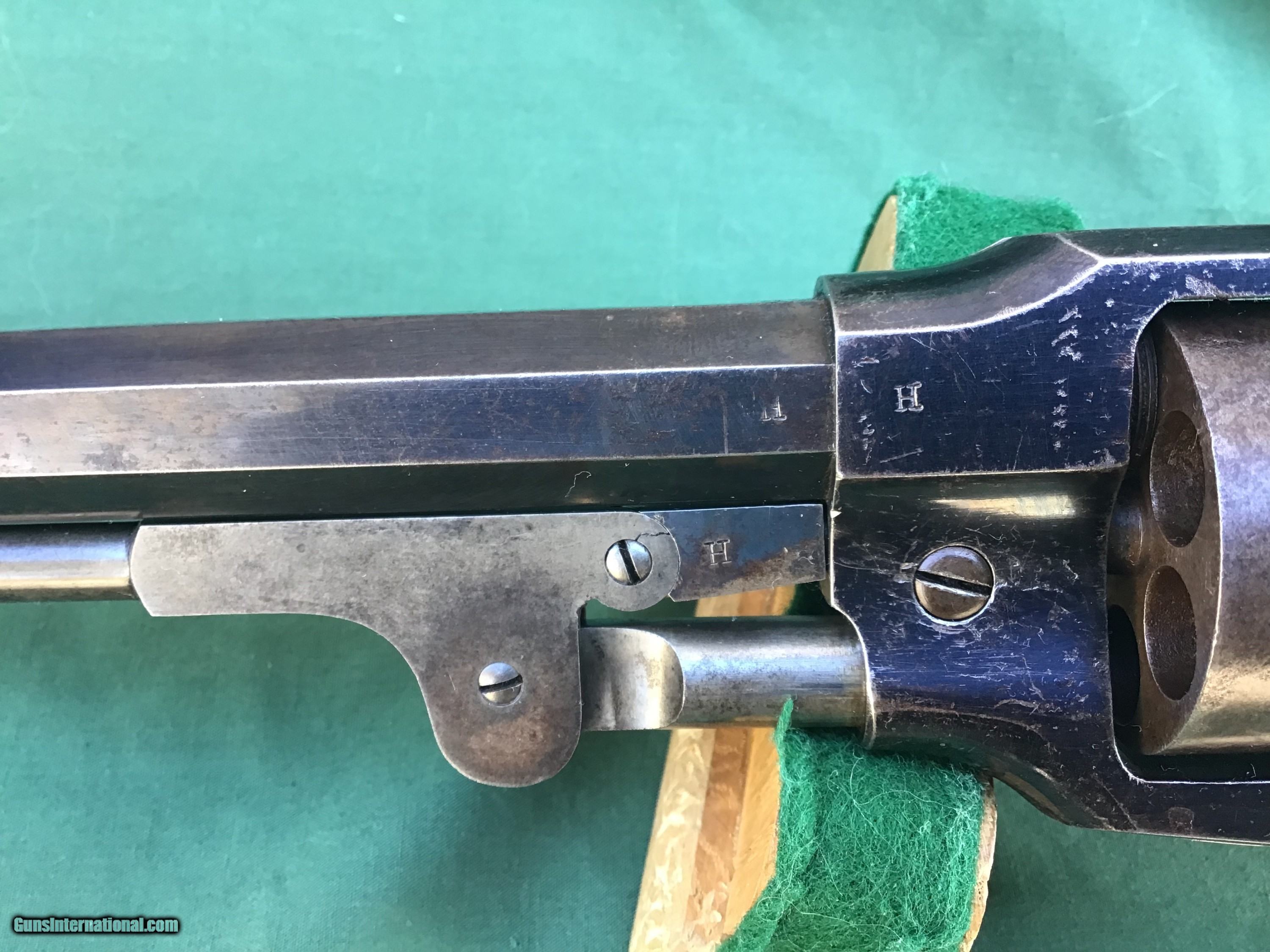 Description: Rogers and Spencer Revolver serial number 1194. It has all matching serial numbers. Very nice grips with inspector marks and cartouche. Some light chipping on right grip on lower edge (see pic). Barrel retains 85 to 90% original blue. Receiver exhibits about the same 85 to 90%. Case colors are still showing on loading lever. All the sub inspector marks are present on the various parts. Blackstrap retains 70 to 75% original blue as well. Silvered out case colors on hammer and cylinder exhibits a nice brown patina. Nice bore. Gun functions as it should. Hammer functions when fired, but if held back by thumb it's a little sticky. Should be cleaned. Please make no mistake, the revolver indexes and functions properly (great mainspring but sticky / gummy hammer). If your looking for an above average Rodgers and Spencer here is your chance. Please feel free to contact me with questions. SOLD Antique: Yes |