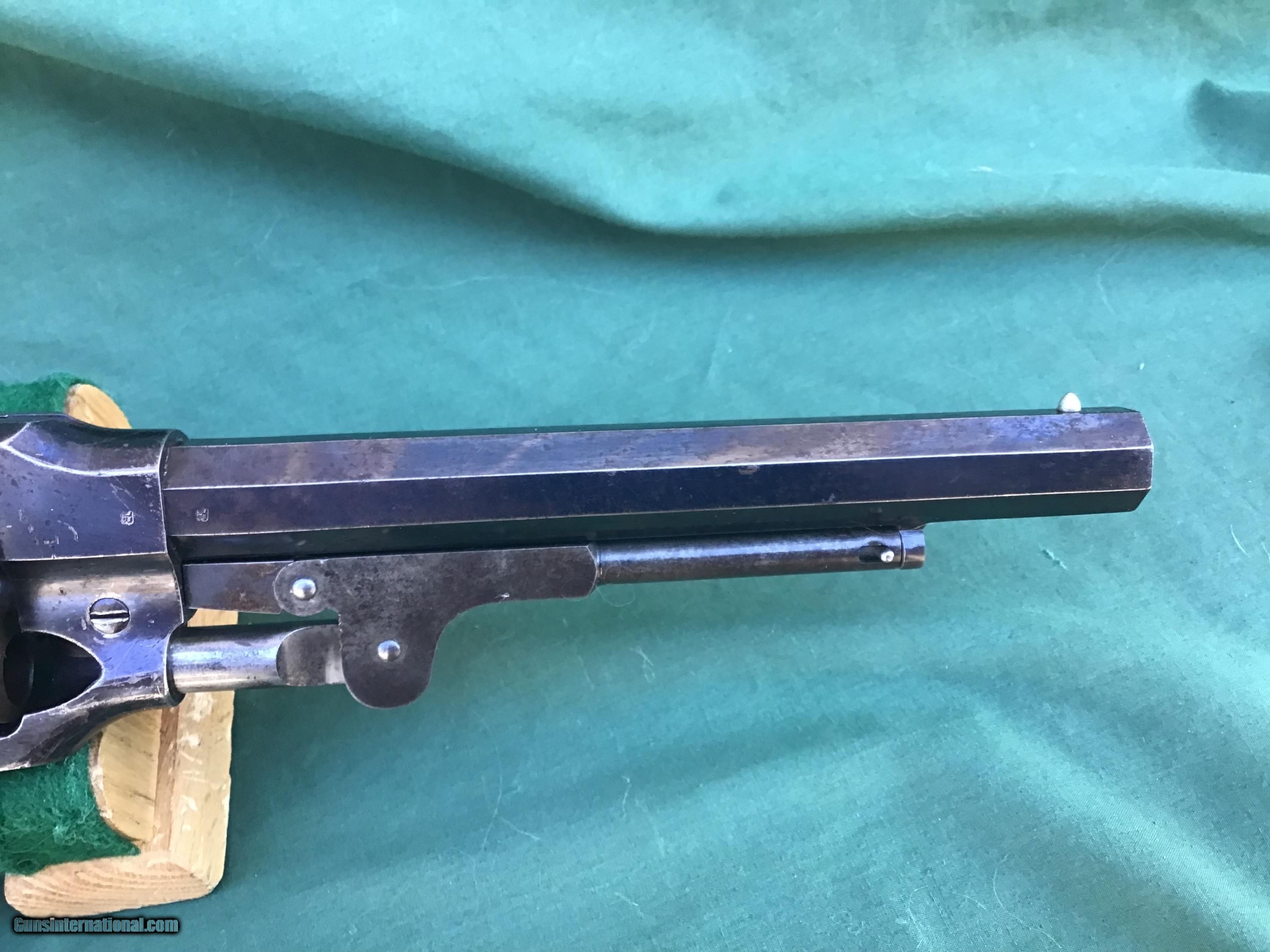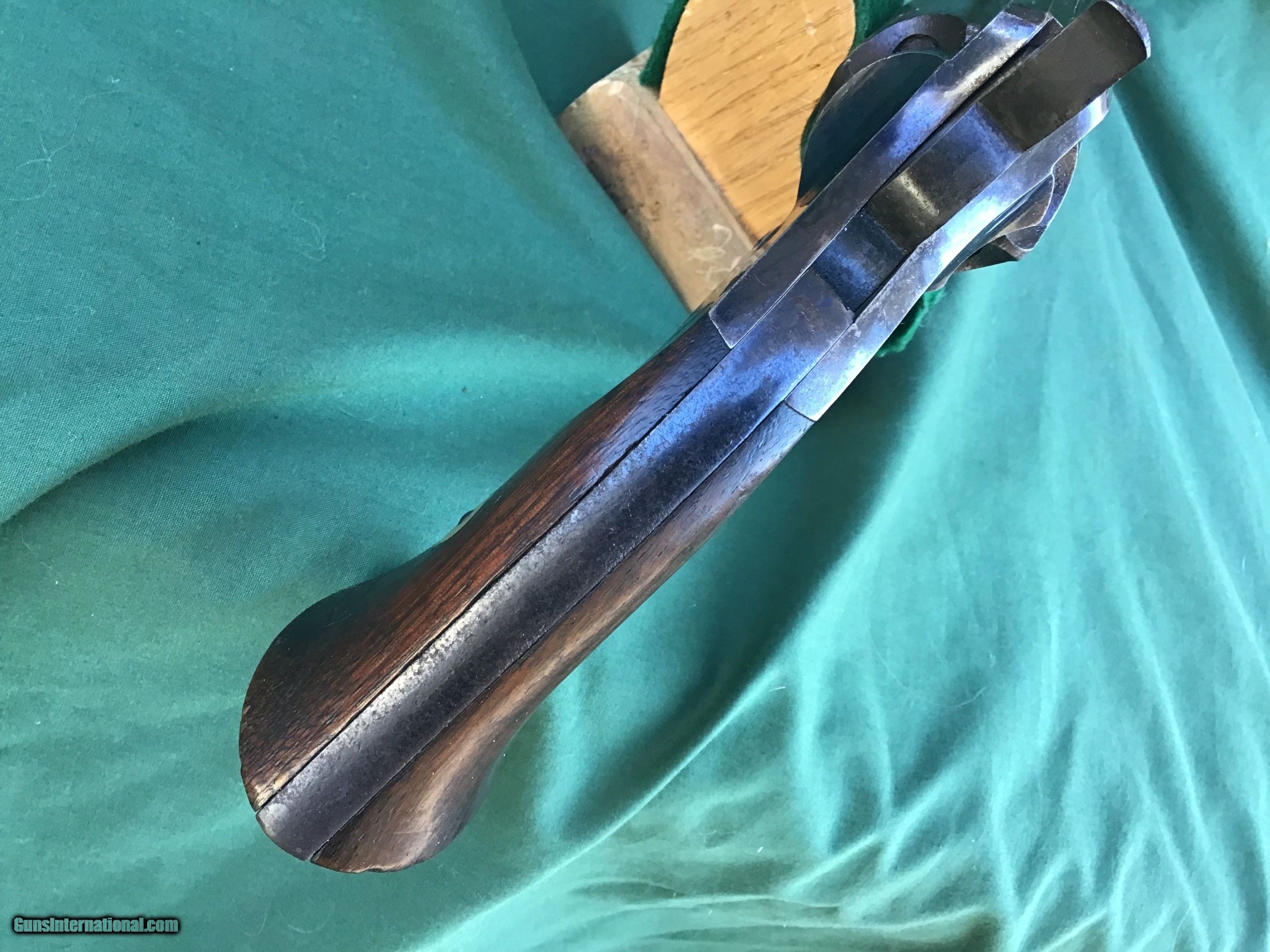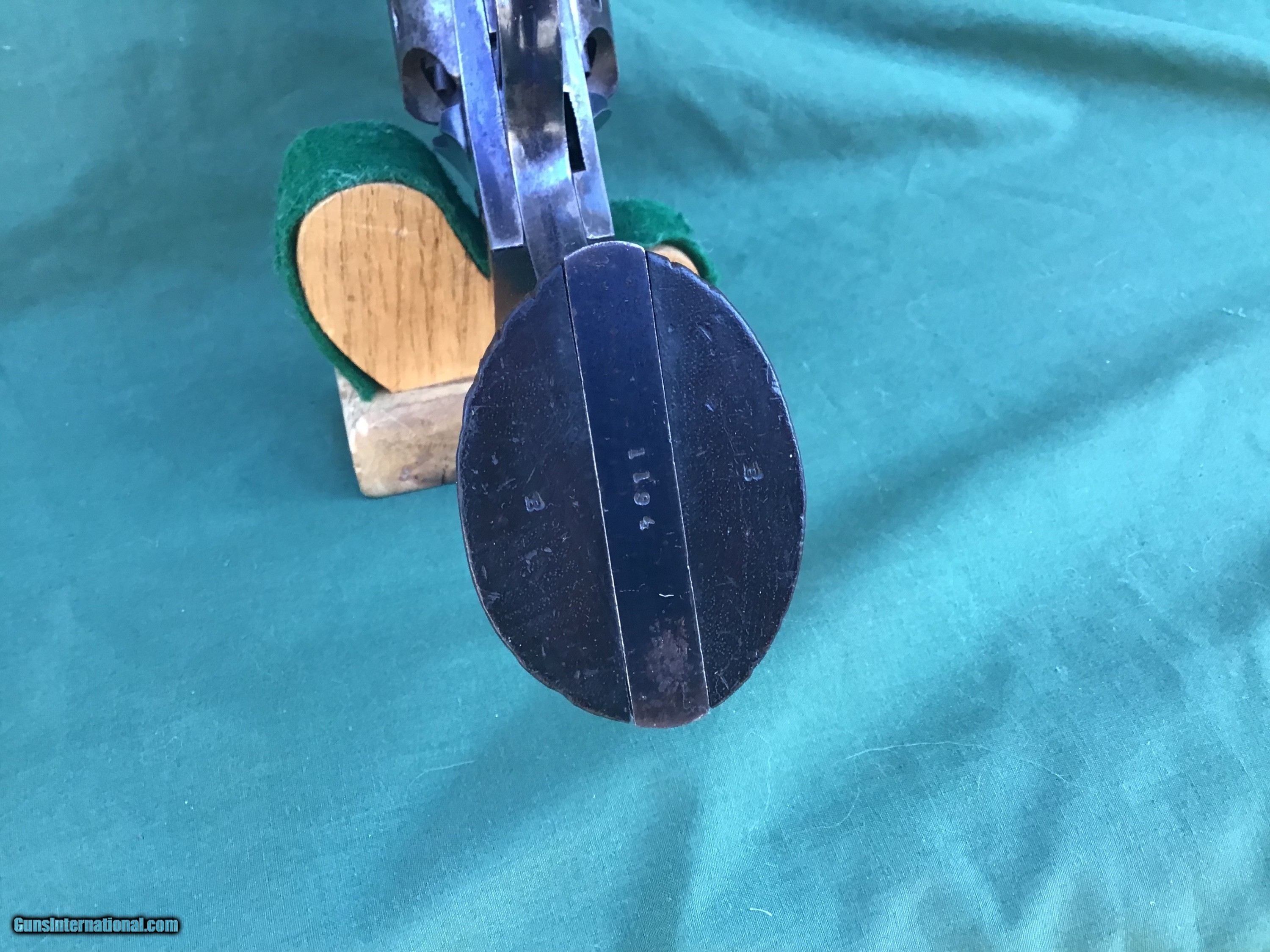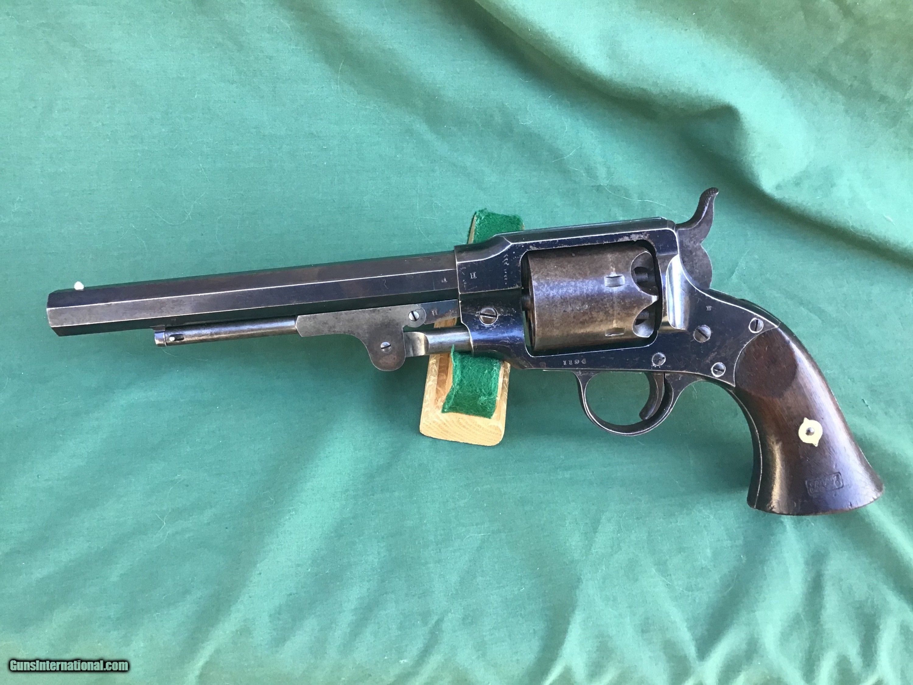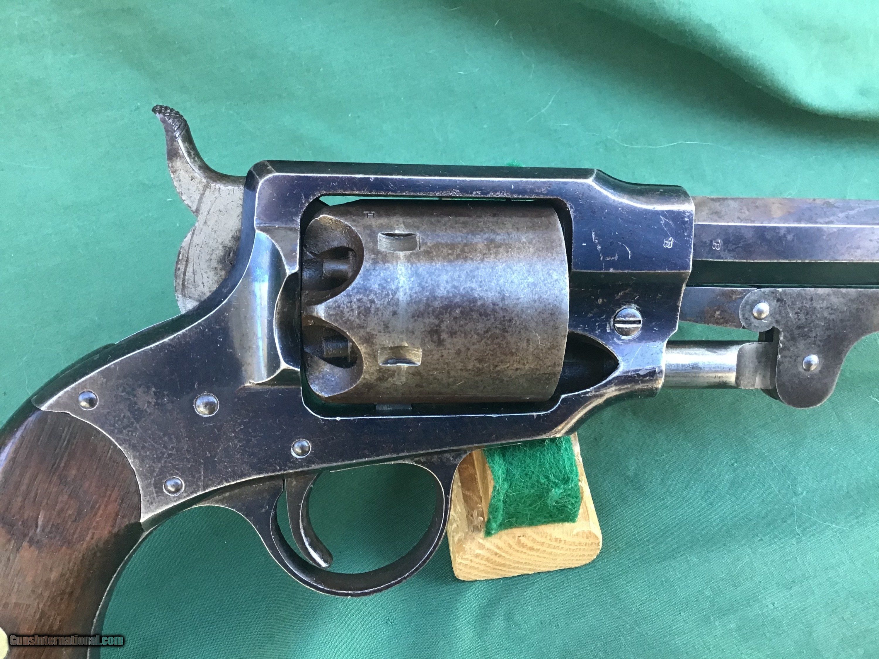 Description: Rogers and Spencer Revolver serial number 1194. It has all matching serial numbers. Very nice grips with inspector marks and cartouche. Some light chipping on right grip on lower edge (see pic). Barrel retains 85 to 90% original blue. Receiver exhibits about the same 85 to 90%. Case colors are still showing on loading lever. All the sub inspector marks are present on the various parts. Blackstrap retains 70 to 75% original blue as well. Silvered out case colors on hammer and cylinder exhibits a nice brown patina. Nice bore. Gun functions as it should. Hammer functions when fired, but if held back by thumb it's a little sticky. Should be cleaned. Please make no mistake, the revolver indexes and functions properly (great mainspring but sticky / gummy hammer). If your looking for an above average Rodgers and Spencer here is your chance. Please feel free to contact me with questions. SOLD Antique: Yes |