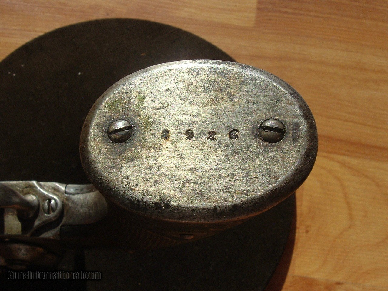 Description: Scarce Civil War percussion Benjamin F Joslyn Army 1st model revolver, .44 caliber. Serial #2926 matching steel plate on the bottom of the butt, frame, lever and is stamped on the inside of each grip. These scarce revolvers were produced early in the war during 1861-1862 with only approximately 3,000 manufactured. This example is in very good+ condition overall. The metal is a pleasing smooth aged gun metal grey. Very clear barrel markings on the top "B. F. JOSLYN. / PAT'D MAY 4TH,1858.". Bore with strong rifling. Mechanics are very good, tight. Beautiful 2-piece original walnut grips with fine distinct checkering still present. These scarce Joslyn revolvers are not common to run across on today's market. .100% original and complete. SOLD Antique: Yes |