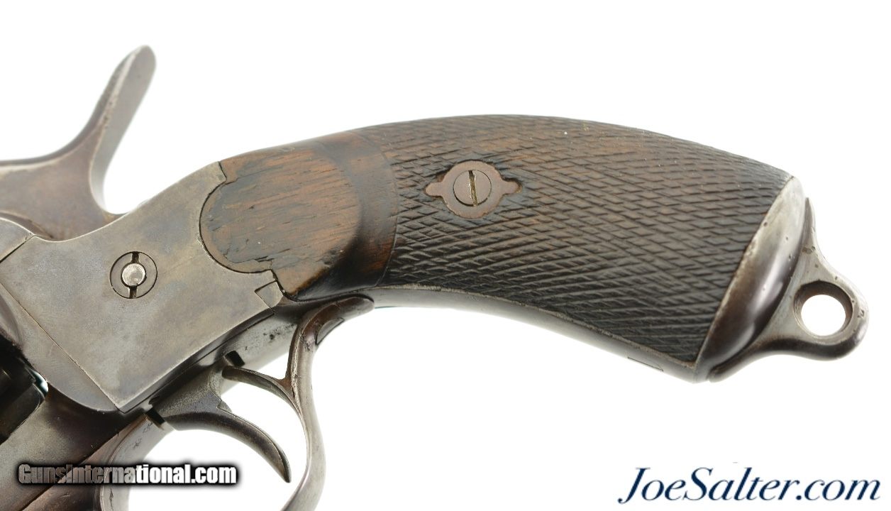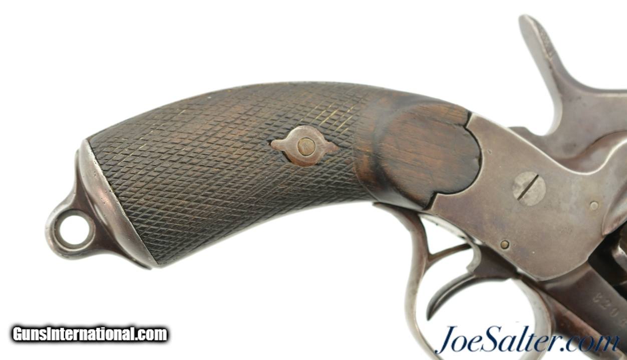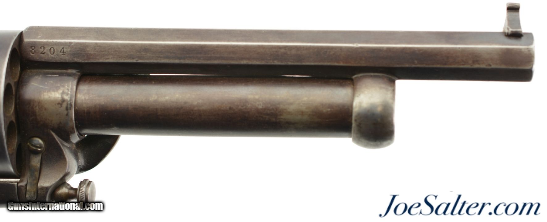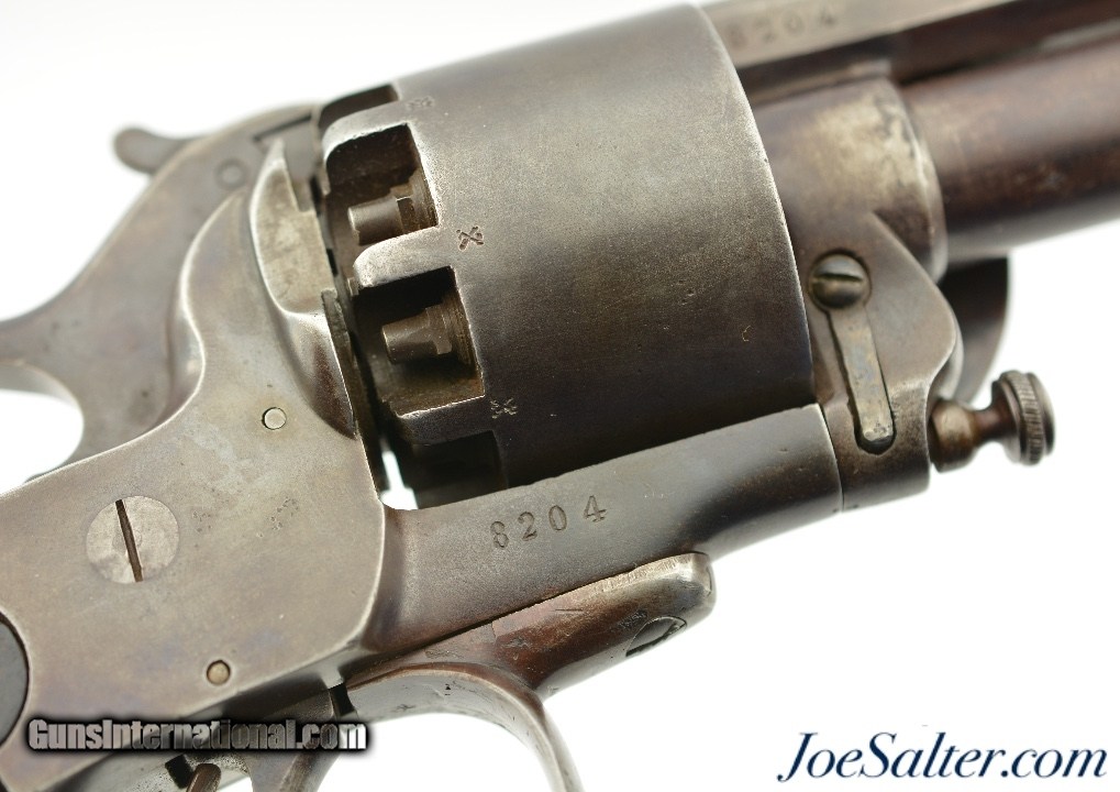 Description: Serial #8204, .44 Caliber / 18 Bore, 6 1/2" octagon barrel / 4 3/4" smoothbore barrel both having dark, lightly pitted bores. This is an all-matching numbered revolver that has crisp Birmingham proofs and "LEMAT & GIRARD’S PATENT LONDON," on the top barrel flat. The metal has an overall plum-brown patina with hints of original blue remaining on some of the protected areas. Silvering is present on the high and exposed edges, as well as gray fading at the muzzles. The checkered walnut grips are in good-very good shape with some light-moderate flattening of the points, and some with-the-grain cracks at the screw bolster on the right panel. The action lock-up is tight and the revolver functions flawlessly. These British-made Le Mats were produced for Confederate contracts after the Confederate agent in France, Charles F. Girard, reasoned that it would be faster and cheaper to manufacture Le Mats in Britain rather than shipping completed guns to Britain for inspection and final shipment to America. Actual production records have yet to be discovered, but the accepted assumption is that these British LeMats were built in 1864 and 1865, although there is a possibility that production started earlier. In their book "LeMat / The Man, The Gun" by Forgett & Serpette (1996); serial #8016 is illustrated on page 79. It is practically identical in marking and configuration to this example, save for the fact that the frame assembly pin is a non-original replacement on the published revolver. This is a splendid example of a Confederate LeMat, in very good plus condition, and would make a fantastic addition to any collection. Antique SOLD Antique: Yes |