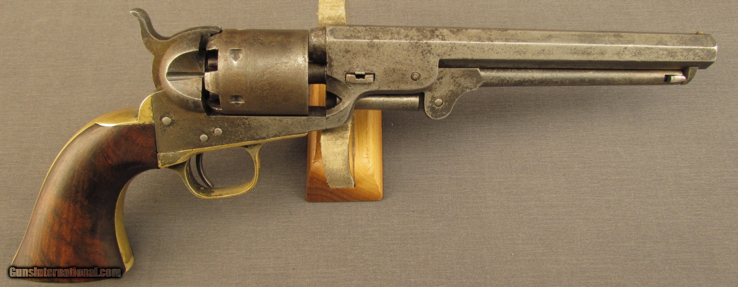 Description: Serial #118930, .36 Caliber, 7 1/2” octagon barrel with a good bore that has dark freckling at the breech-end and mild freckling within the grooves. This is a very early 1862 manufactured revolver that has all-matching numbers, including the wedge and cylinder arbor, with the metal having an overall mottled gray patina speckled with darker areas of mild freckling. Approximately 10-15% of a period added, extremely thin silver plate finish remains, most visibly on the rear portion of the frame, hammer, and especially on the underside of the barrel and protected surfaces of the loading lever. The exposed silver has even surface “bubbling” and has tarnished to a pale rose color mixing with blue-black, while the protected silver has a whitish gray color edged with pink and black. The cylinder is mostly a mottled pewter gray with some freckling at the face and mild pinprick pitting around the nipples. About 75-80% of the naval scene remains with a few shallow impact marks along the circumference as well. The brass trigger guard and gripstrap have a mostly speckled, pale yellow-ochre patina with traces of original silver remaining around the legs of the bow. The burled walnut grip is extremely handsome, and was most probably added to the revolver when it was given the silver finish. The wood is in very good plus condition with some evidence of light sanding through the years and retains a very nice oil finish throughout. The lock-up is still tight with a very small amount of barrel play, and the mechanism functions flawlessly. The revolver is accompanied by a 2002 dated Colt factory letter giving a ship date of January 20, 1862, to B. Kittredge & Co. in Cincinnati, OH. A further 2002 dated, handwritten letter to the previous owner by noted dealer Floyd Everhart is also included detailing his encounters with similarly finished, Kittredge retailed '51 Navies. It was his opinion that Kittredge silver plated them in an effort to make the guns more “flashy”, but that the extreme thinness of the silver soon caused it to flake away. His experience was that only traces of silver still remain on guns so finished, and that this example has more than any other he had seen up to that point. Antique SOLD Antique: Yes Manufacturer: Colt Model: 1851 Serial Number: 118930 Caliber Info: .36 Cal Gauge Info: .36 Cal |