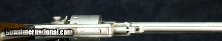 Description: .44, #27550, 8 inch barrel, nickel finish, one piece walnut grip, faint cartouche on grips, all matching numbers, circa 1860's Condition: excellent bore with some black powder oxidation, 90% nickel overall, chip at toe of grip, excellent marks, excellent mechanically. SOLD Antique: Yes |