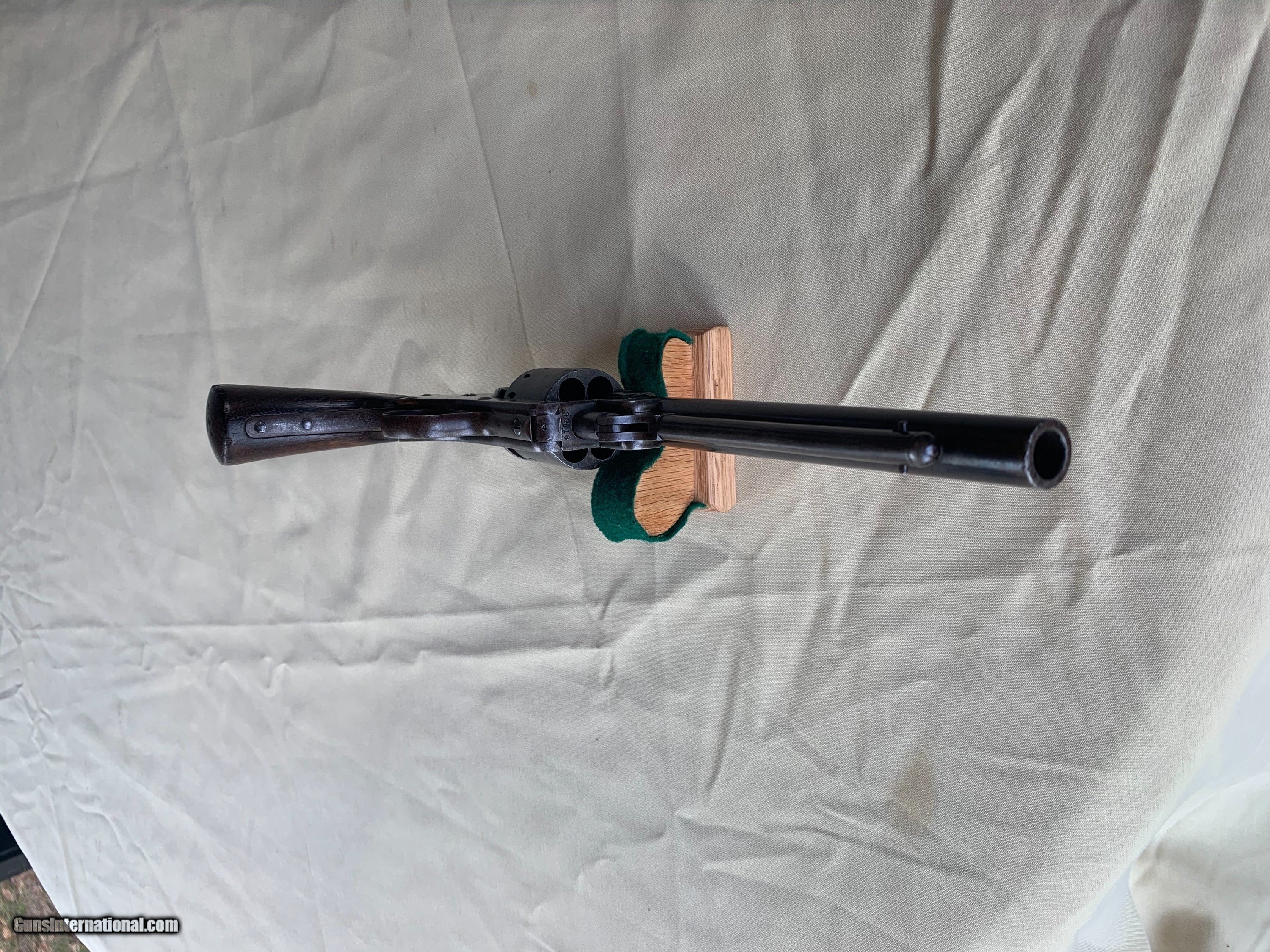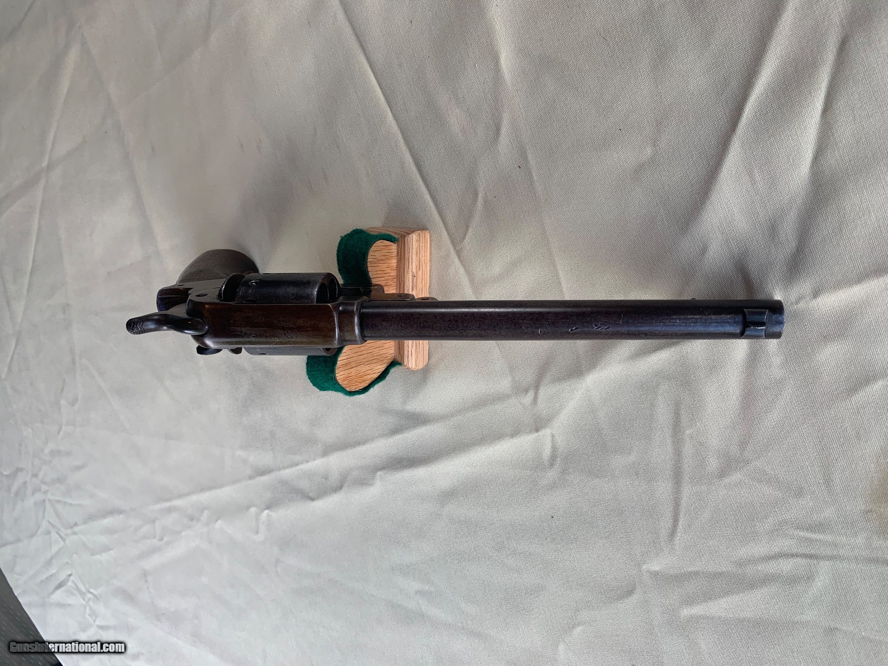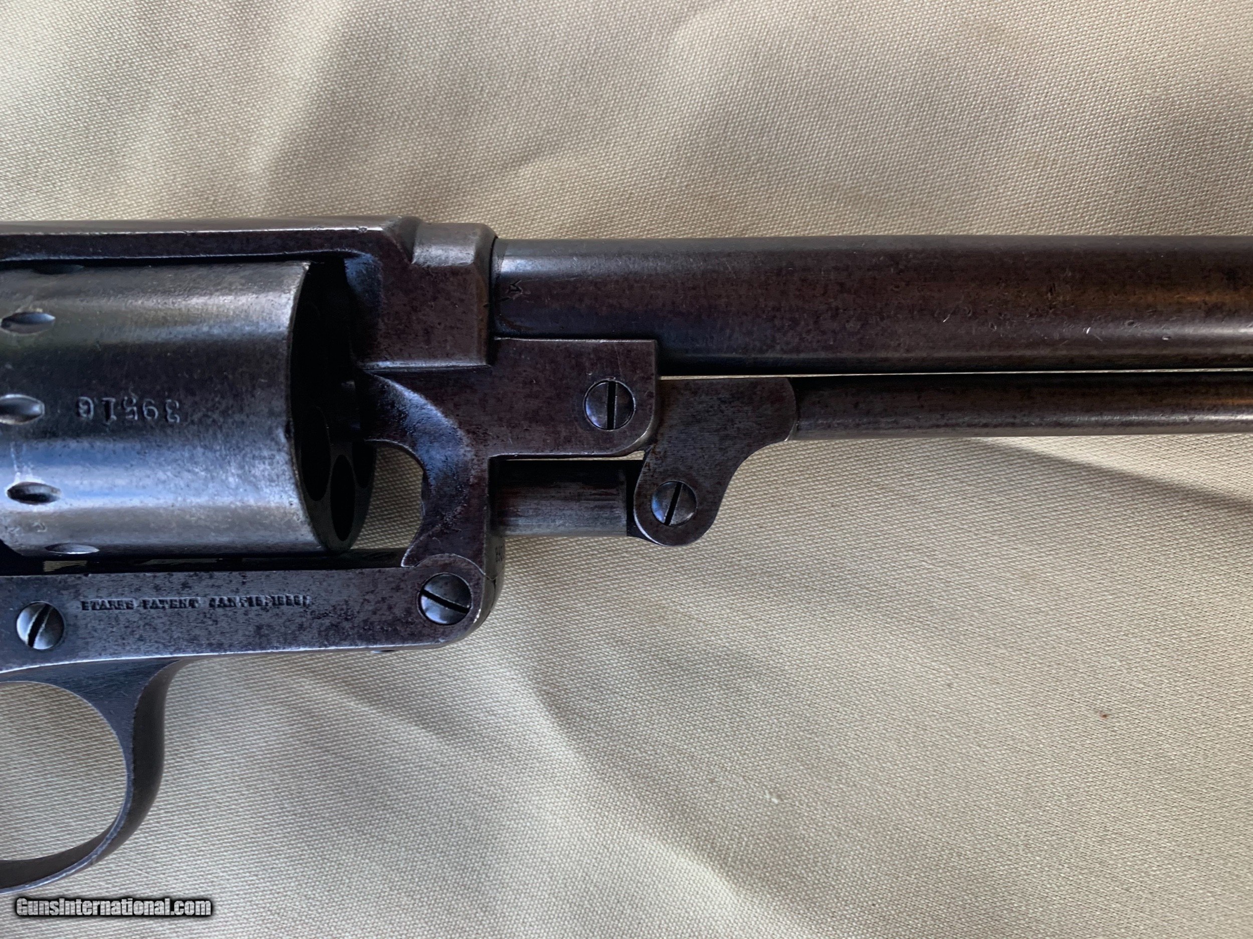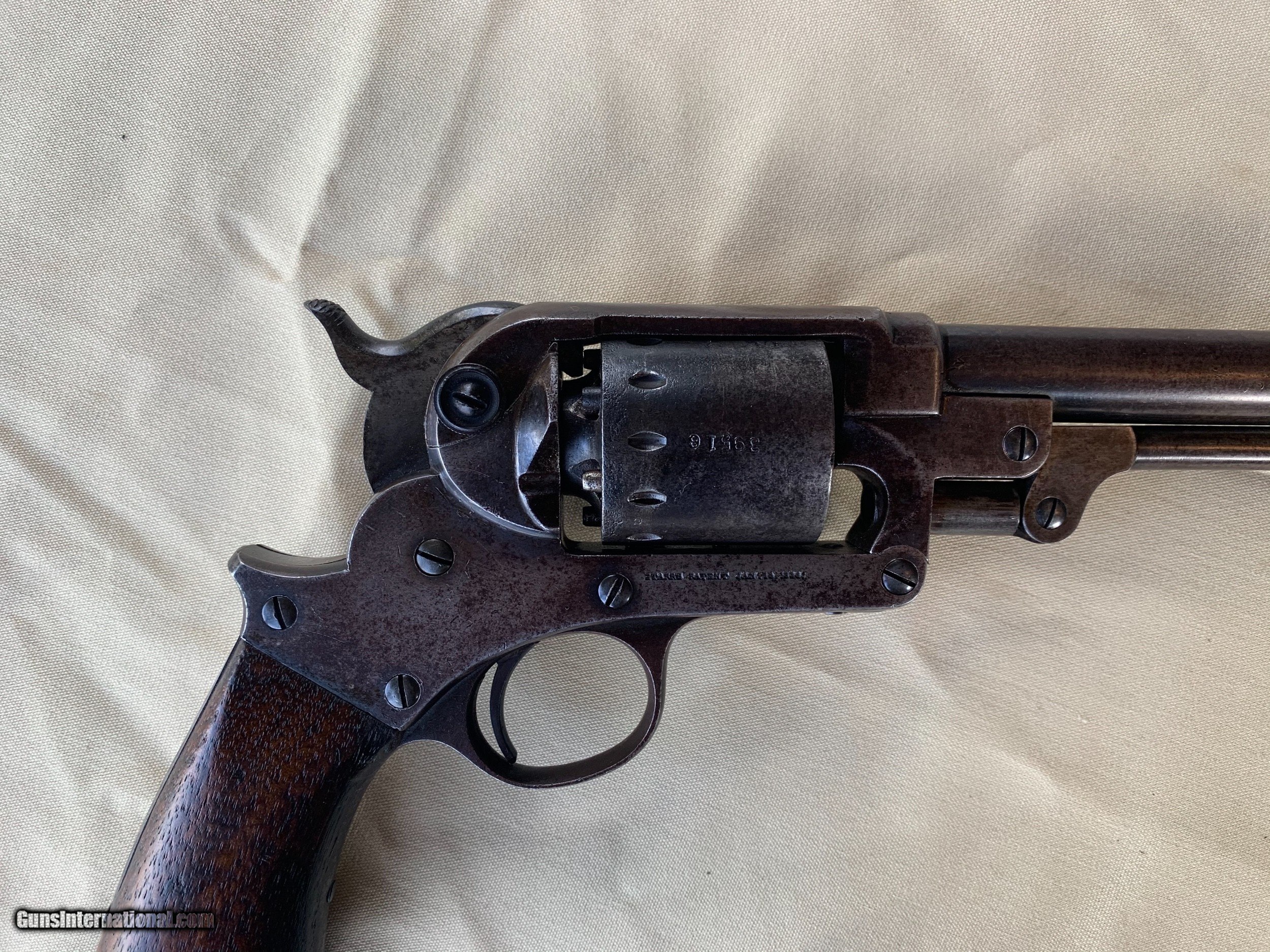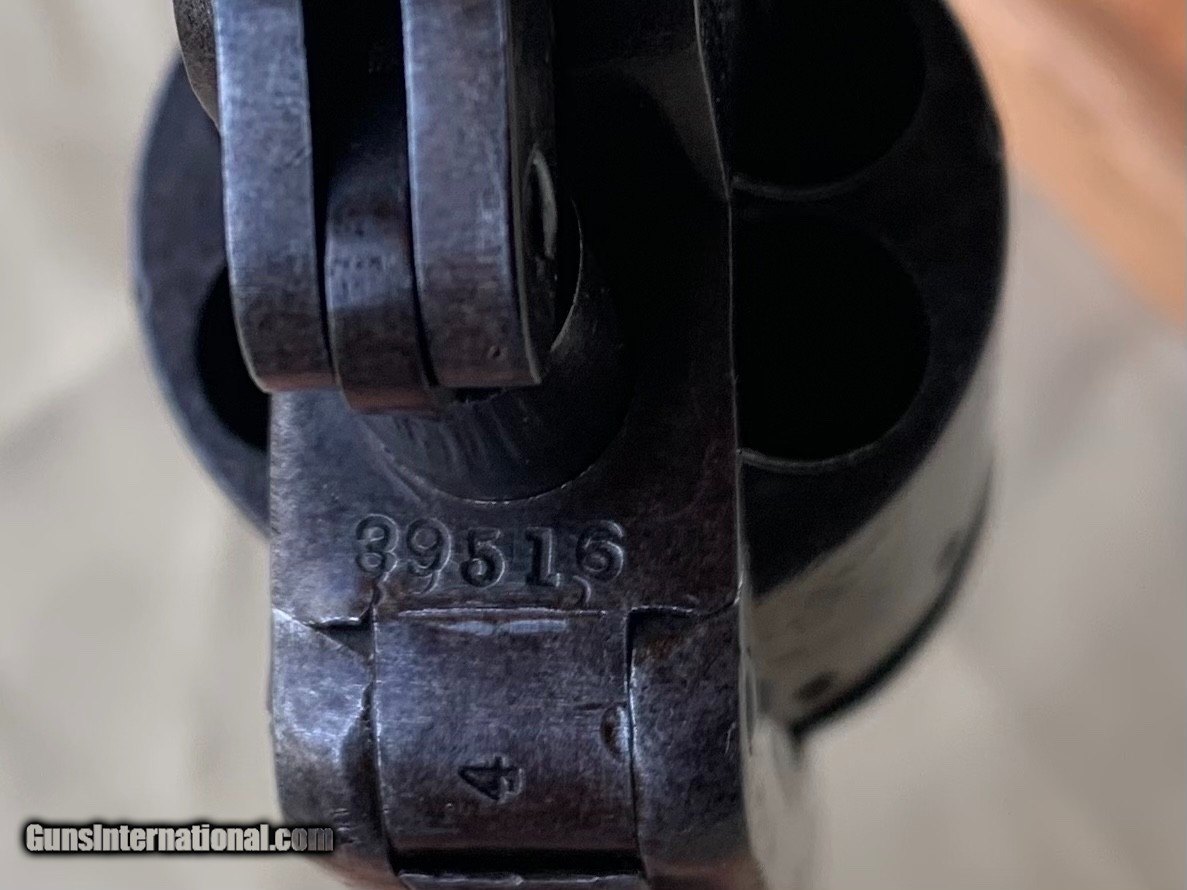 Description: Starr SA Civil War Vintage . U . S . Military Marked . 100 percent correct and all original . All matching Numbers . Serial number 39516 . 1860's Vintage . Bore and mechanics are very good . Very good working order . Original Finish has turned a very nice blue brown patina . Original Wood Grips are Excellent. Inspector Cartouche still visible on both grips . Crisp markings on metal . Very nice Example of a Rare Starr SA . Please review my photos and email me with any questions ? 3 day inspection as allways . Thank you for looking Little Jo SOLD Antique: Yes Handgun Caliber: .44 Manufacturer: Starr Model: SA Serial Number: 39516 |