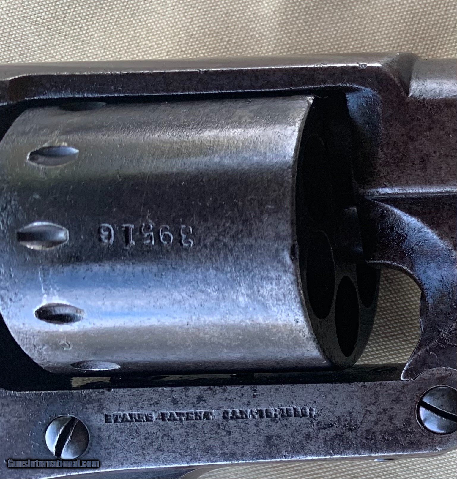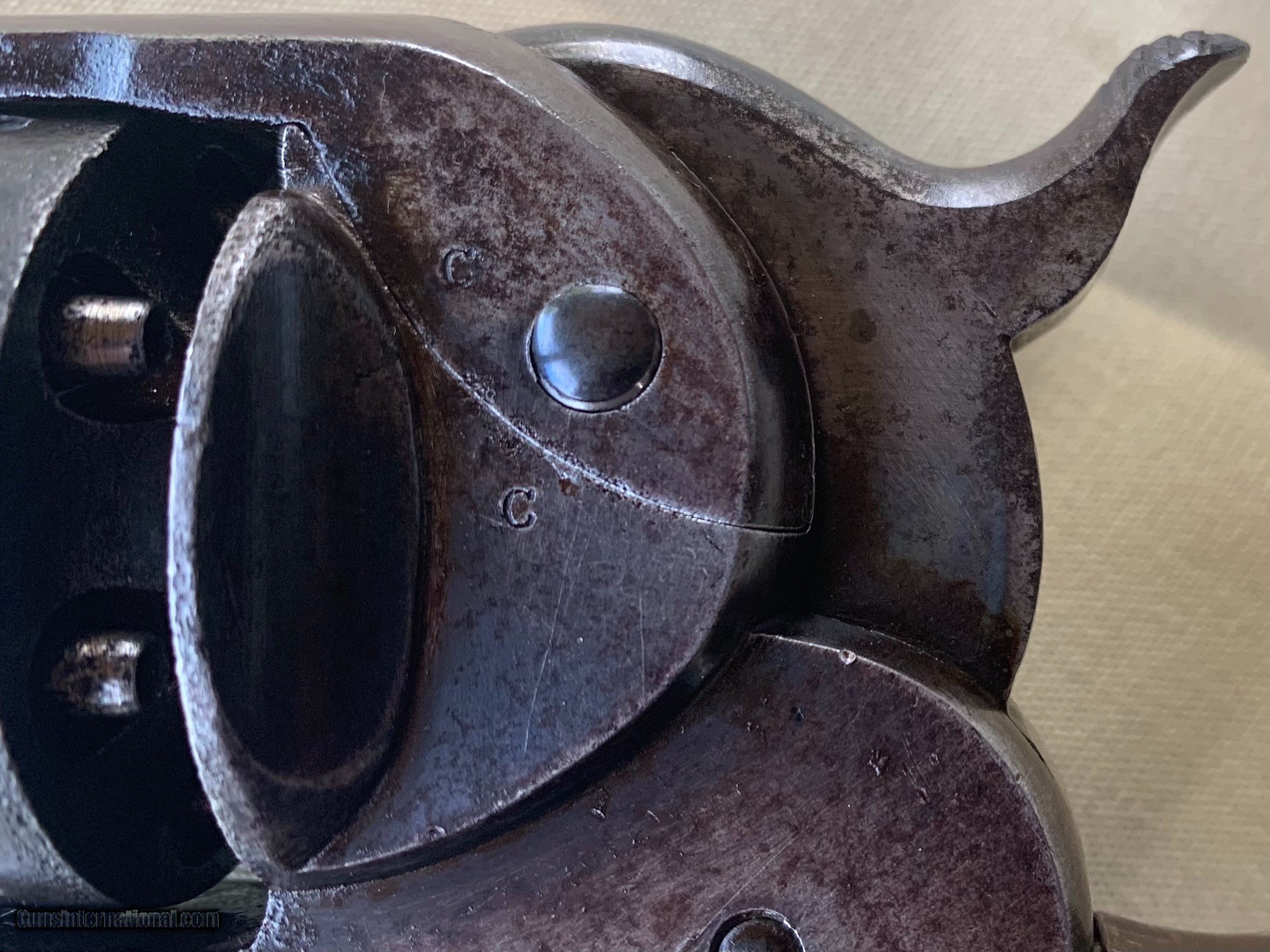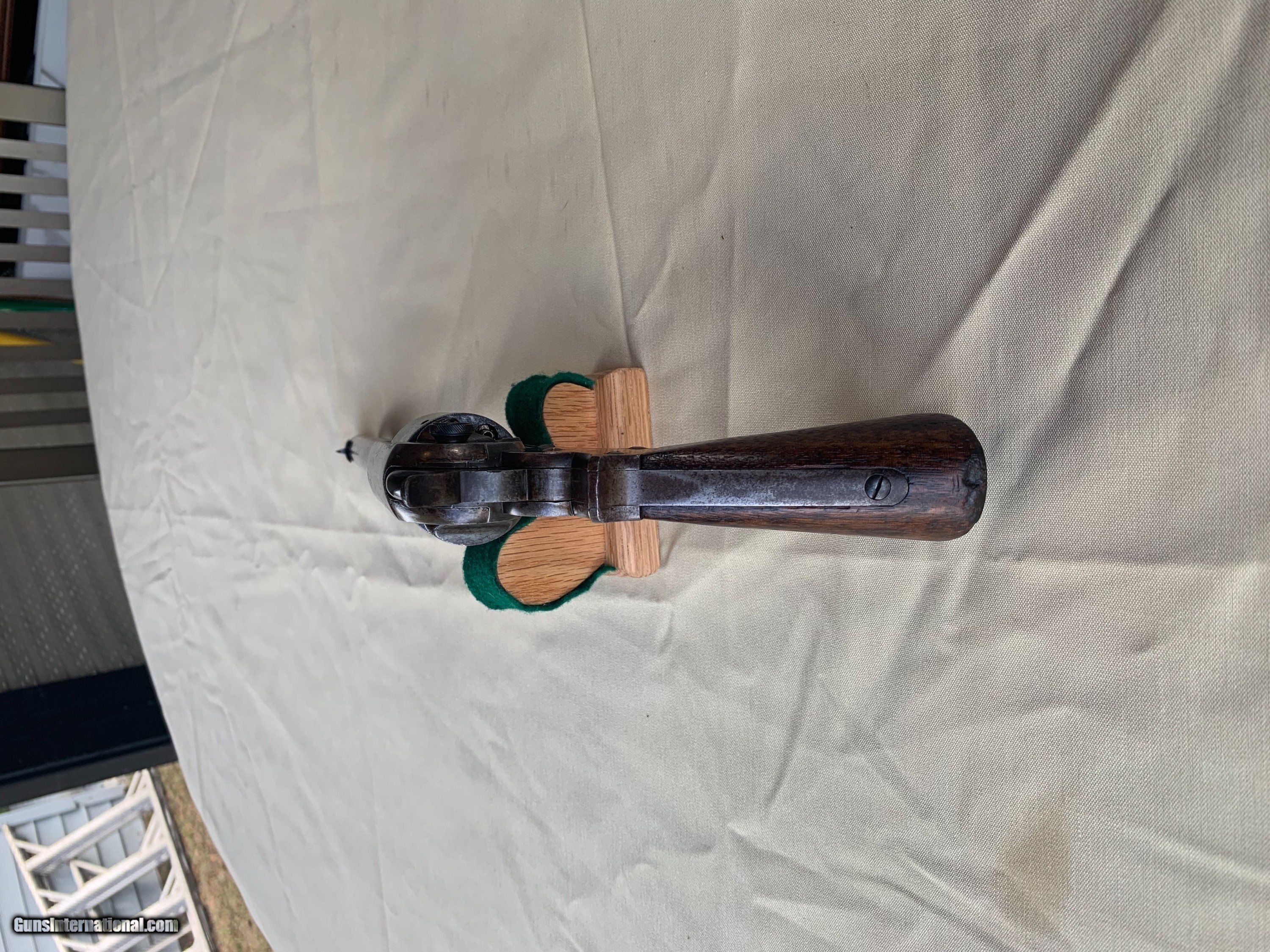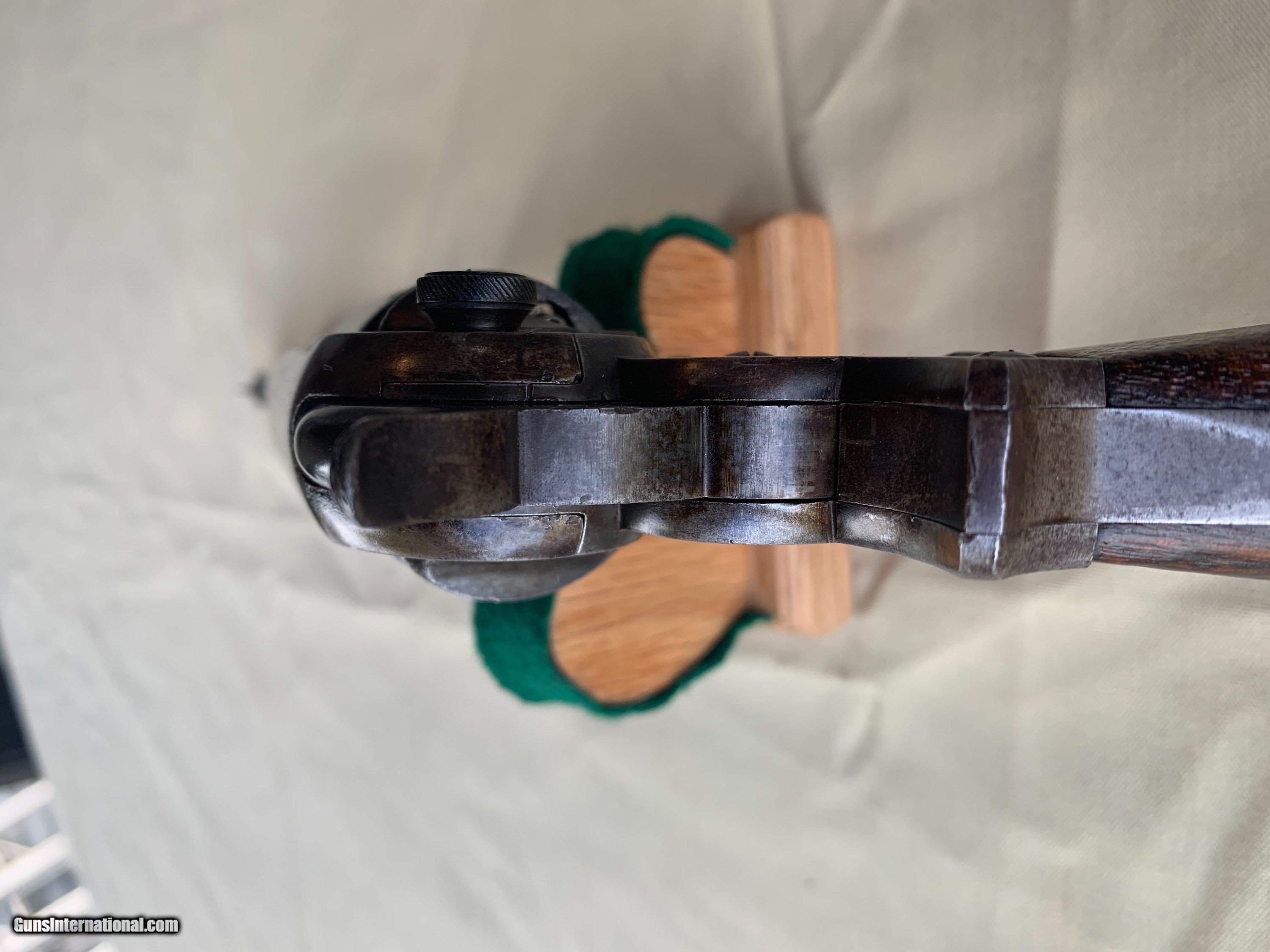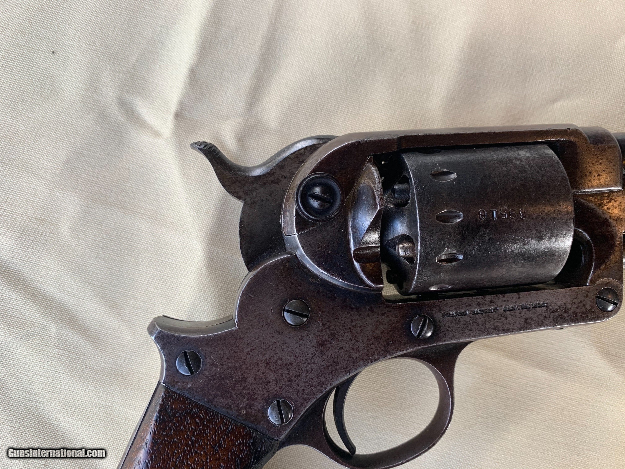 Description: Starr SA Civil War Vintage . U . S . Military Marked . 100 percent correct and all original . All matching Numbers . Serial number 39516 . 1860's Vintage . Bore and mechanics are very good . Very good working order . Original Finish has turned a very nice blue brown patina . Original Wood Grips are Excellent. Inspector Cartouche still visible on both grips . Crisp markings on metal . Very nice Example of a Rare Starr SA . Please review my photos and email me with any questions ? 3 day inspection as allways . Thank you for looking Little Jo SOLD Antique: Yes Handgun Caliber: .44 Manufacturer: Starr Model: SA Serial Number: 39516 |