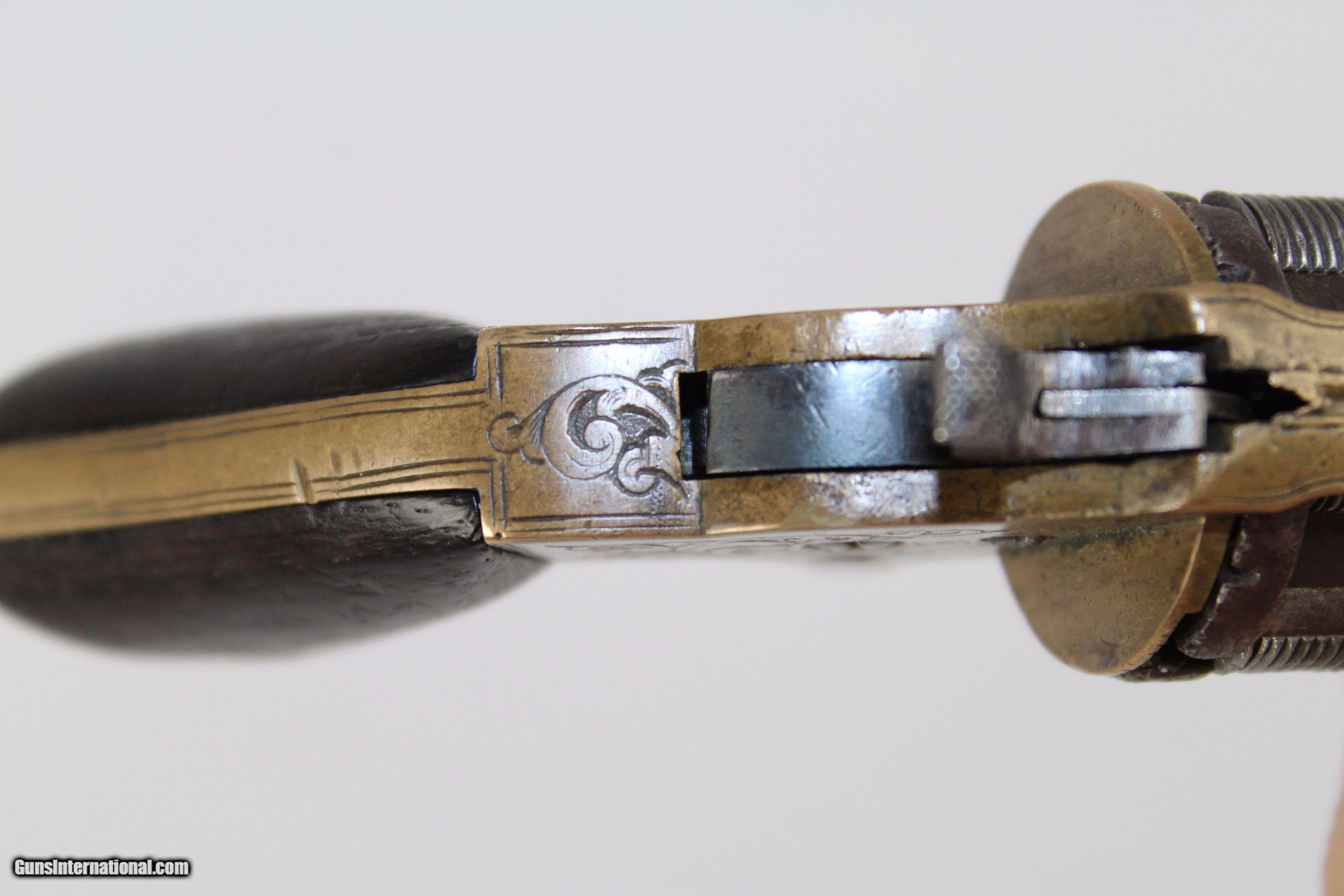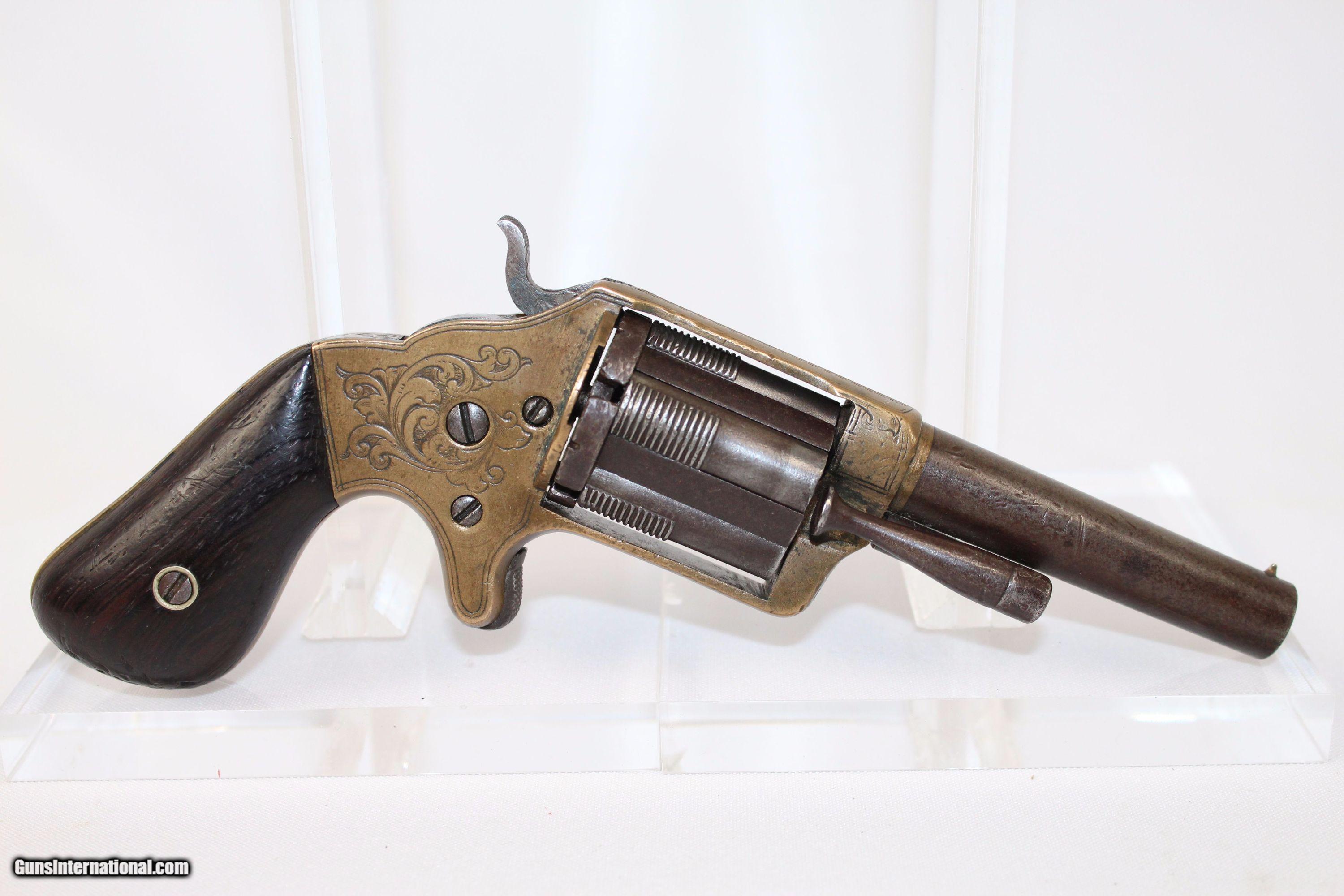 Description: Unique CIVIL WAR Antique Brooklyn SLOCUM Revolver With Rollin White By-Passing Sliding Chambers Here we present an antique Brooklyn Arms Co. Slocum Patent Pocket Revolver, made circa 1863 in Brooklyn, New York. Only about 10,000 were produced. Firearms technology was rapidly advancing in the 19th Century with Colt introducing his revolver, and Smith & Wesson introducing the “bored through” cylinder that allowed revolvers to be used with metallic cartridges. This development was the intellectual property of an inventor by the name of Rollin White, a former Colt employee who took his idea to Samuel Colt himself, and was fired for his efforts. White found a buyer for his patent in Horace Smith and Daniel Wesson, giving their new company an enormous advantage for the next 12 years. However, with the Civil War in full fury and arms supply and manufacturing what it was, many different inventors, mechanics and manufacturers popped up to take advantage of the need for arms. Many makers of revolvers attempted to design and manufacture their own concept, but ended up violating the Rollin White Patent, for which Smith & Wesson and Rollin White aggressively sued. Other companies came up with creative solutions to navigate around the patent and some succeeded. This is one of those success stories, at least in the sense that a functional revolver was created to use metallic rimfire ammunition without violating the patent. Each chamber slides in its channel. Though this relatively small pocket revolver was no official armament of the Civil War, like so many others, plenty of them were carried into battle by soldiers who purchased them privately. This revolver features nice scroll engraving. The top of the barrel reads “B.A. CO. PATENT APRIL 14 1863”. The overall condition is good. The metal surfaces are dark with age. The markings are legible. The grips are in very good condition. The bore is dark and untouched. There has been a repair or modification to the hammer. The action functions intermittently. Here is a very unique Civil War-era revolver, one that survived the scrutiny of the Rollin White Patent! Own the original! This is a legitimate antique and not a reproduction. Barrel is 3 inches. Caliber: .32 Rimfire Overall condition as seen in photos. Very Fast. Very Safe. FREE SHIPPING WORLDWIDE. Delivered directly to your door by express mail! Guaranteed AUTHENTIC & Includes CERTIFICATE OF AUTHENTICITY. ancestryguns $800 #5387 SOLD Antique: Yes |