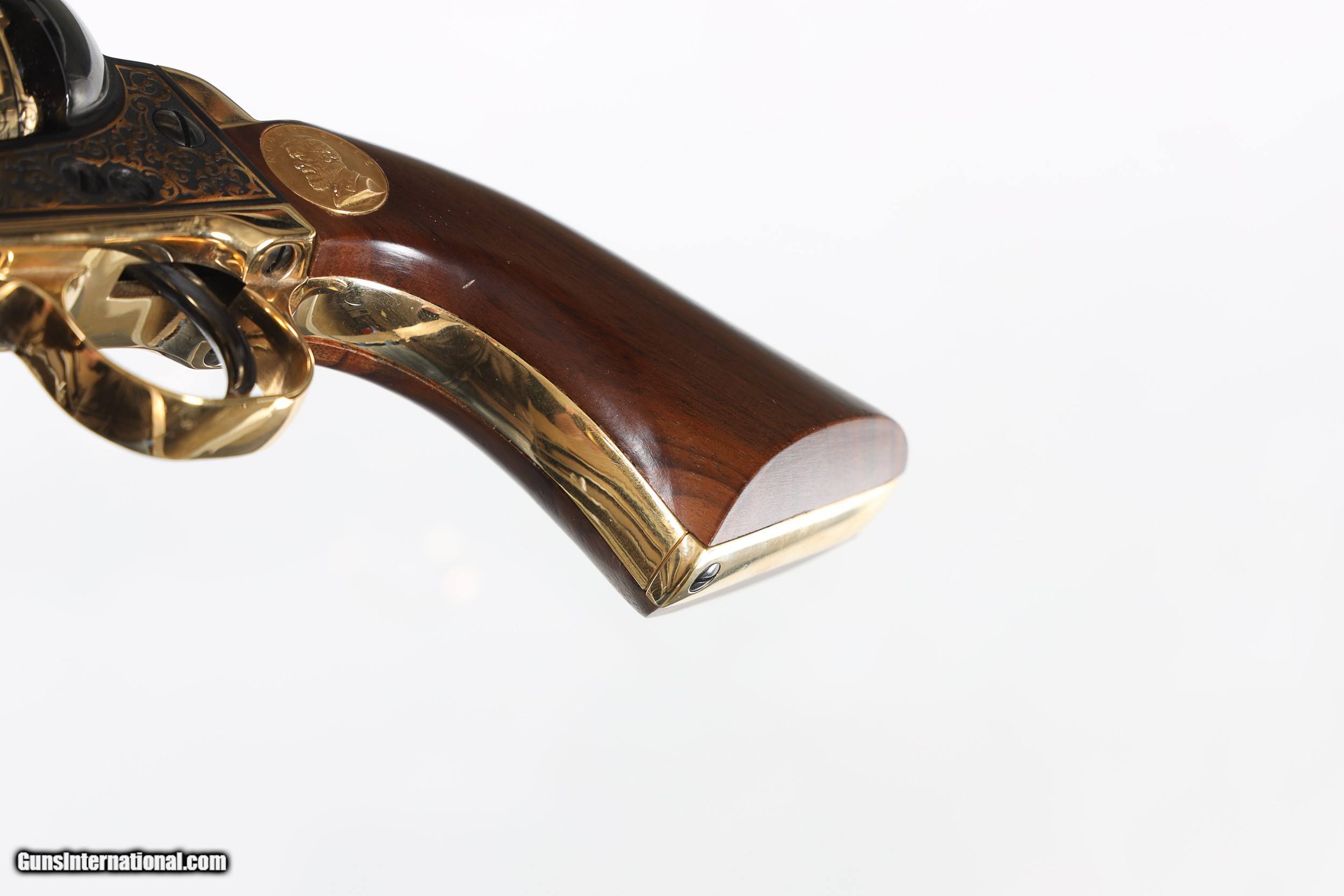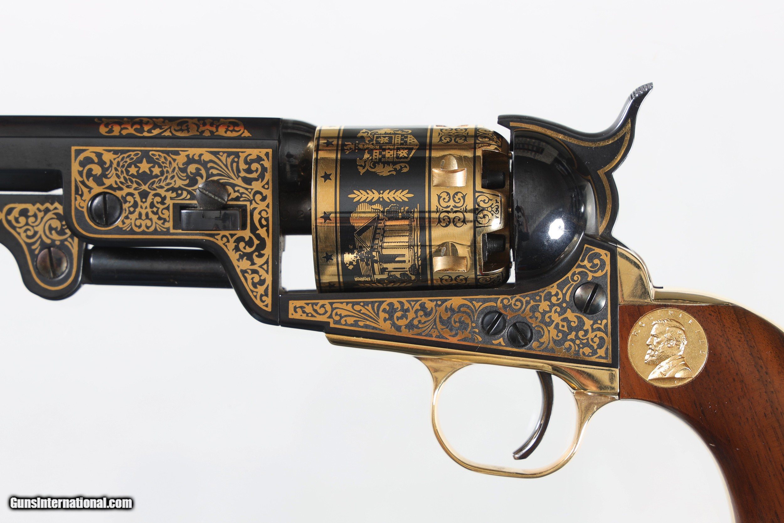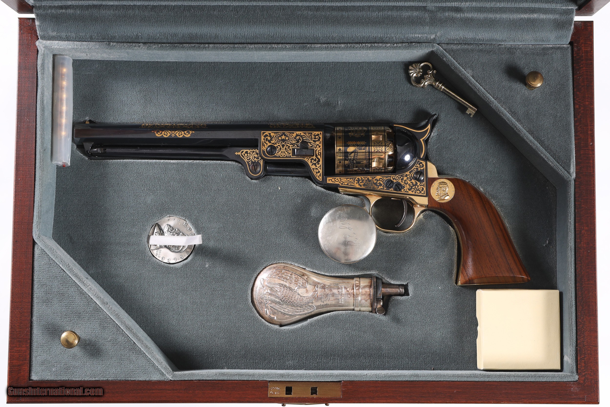 Description: Robert E. Lee Commemorative gold overlay with medallion inleaded into left stock with coin silver plated powder flask, gold plated shot, Robert E. Lee engraved cap box, key, in presentation case. Revolver remains near mint, light handling marks to display case. Williamsburg Firearms Manufactory From the original '51 Navy Colt at the Confederate Museum. With paper work and white gloves. Free Shipping, No Credit Card Fees! SOLD Manufacturer: Williamsburg Firearms Model: Navy Serial Number: 1378 Caliber Info: .36cal Barrels: 7 1/2 |
