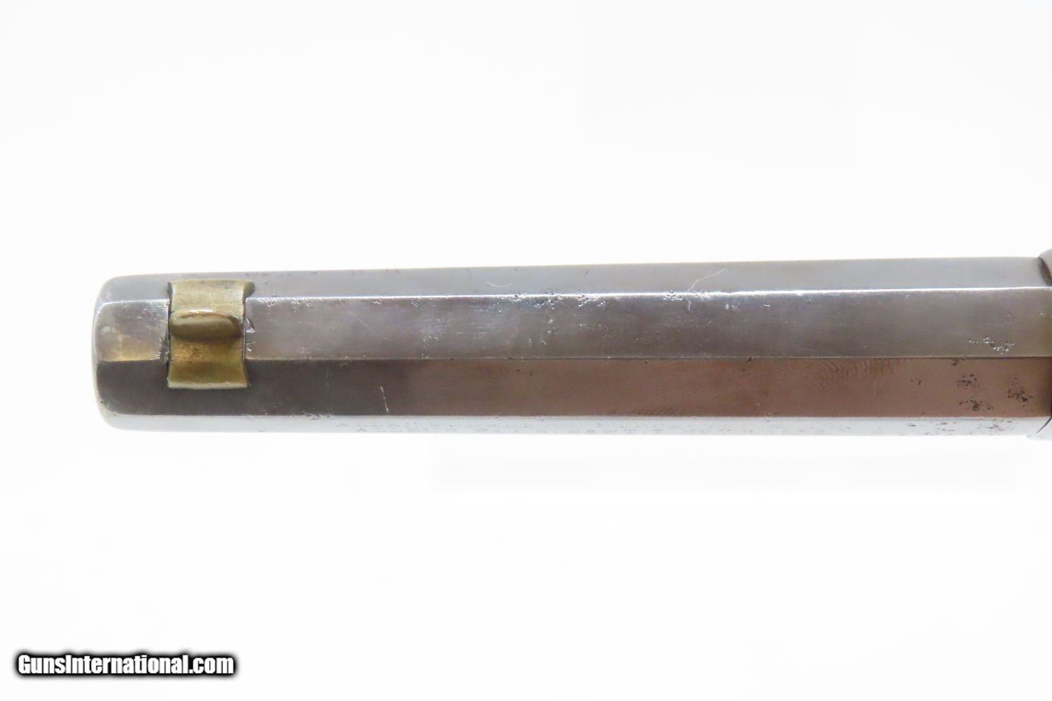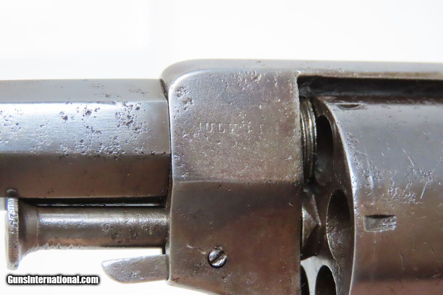 Description: Very SCARCE Allen & Wheelock SIDEHAMMER First Issue .32 Caliber RF REVOLVER FIRST ISSUE Civil War Era Revolver with Walnut Grips! Here we present an antique Allen & Wheelock Sidehammer First Issue Revolver, made circa 1859 in Worcester, Massachusetts. There were three variations of the Allen & Wheelock and Ethan Allen & Co. .32 Sidehammer revolver were manufactured between 1859 and 1862. Only a little more than a thousand are estimated to have been manufactured. Production was limited due to the introduction of Allen's lipfire revolvers which did not require violating the Rollin White bored through cylinder patent and also used less expensive ammunition. The most immediately eye-catching feature on this revolver is the side-mounted hammer on the right side of the gun. The features that make this distinctly a first issue are the rear cylinder axis pin and the lack of the later 1860 patent date. This example doesn’t have the cylinder scene, likely due to wear over the years. The left side of the barrel is marked “ALLEN & WHEELOCK. WORCESTER. MASS./ALLEN’S PAT’S. SEPT. 7. NOV. 9. 1858.” The overall condition is good. Strong and tight action. Semi-bright bore in good shape. Very good grips with below average wear. Cylinder scene remnants can still be seen. Numbers match, including the grips and grip frame! Smooth, even brown patina. Here is a nice revolver with some great aesthetics for the collection. Own the original! This is a legitimate antique and not a reproduction. Barrel is 4 inches. Caliber: .32 Rimfire Overall condition as seen in photos. Very Fast. Very Safe. FREE SHIPPING WORLDWIDE. Delivered directly to your door by express mail! Guaranteed AUTHENTIC & Includes CERTIFICATE OF AUTHENTICITY. ancestryguns $1200 #210337 SOLD Antique: Yes |