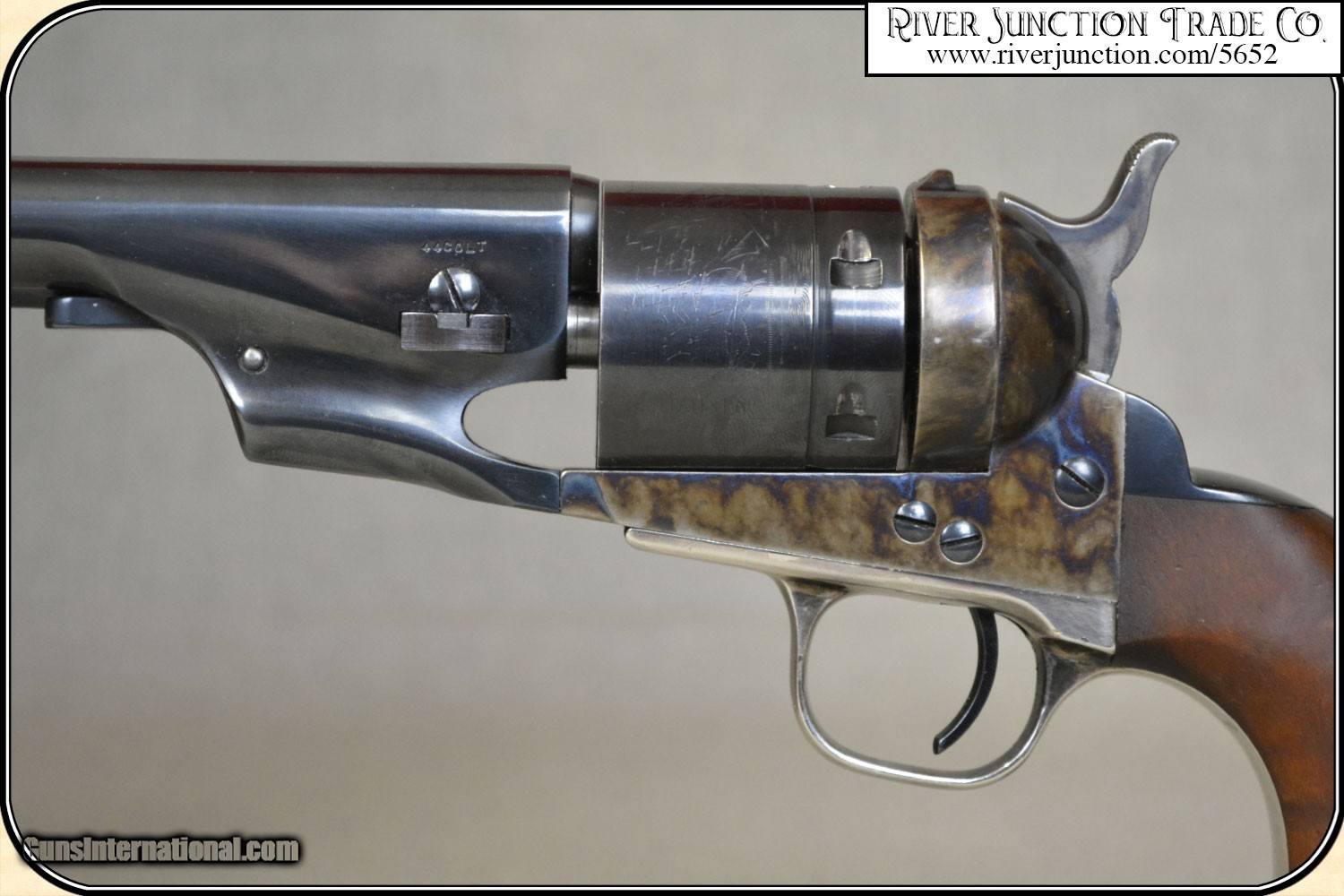 Description: In the book METALLIC CARTRIDGE CONVERSIONS on page 175, Author Dennis Adler states: "While craftsmen like Gren, Howell and Millington were building custom cartridge conversions; the demand for these guns far outstripped the ability to produce sufficient quantities. Hand Crafted versions were just that, handcrafted, and they require considerable time to build and were expensive, averaging more that $1000. Into this scenario arrive Dave Anderson, a former machinist who segued got into gunsmithing as a second career in the late 1970s." That resulted in a sort of a semi custom conversion, but as reality would have it no, reduction in price. (I remember when I first started offering these in my catalog I was paying $800 and $900 dealer cost. )When Anderson discontinued operation his average guns were selling in the $1300.+ price range. This one is a 1860 Army in .44 Colt Cartridge. 8 inch barrel.The main feature of this gun is the stunning high polish, high luster blue. It has a likewise stunning silver plated trigger guard which is almost as bright today as the day it was boxed. The gun is mechanically perfect. The only flaws are two fine scratches on the cylinder and miner handling marks. Serial number is 2512 marked on the frame and the barrel. On the underside of the barrel it is marked AFF AGUANGA CA. On the top of the barrel is marked -ADDRESS AMERICAN FRONTIER U.S.A.- Must be shipped to an FFL Dealer. This is considered a modern firearm and must be shipped to a Federal Firearms License (FFL) Dealer. A copy of that license must be provided before shipment can be made. We always answer questions and entertain offers. Payment: Item, can be ordered with a credit card or paypal on our sight . Just Google (riverjunction) and type in the River Junction Trade Co. item number (5652) in the search box. Before you checkout you will see shipping cost and total. OR If you prefer: Pay by cash, postal money order, cashiers check, personal & business checks. We wait for checks to clear. Have questions? Call me 563-880-4588. Jim You can go to oursite to review this item and order with paypal or credit card if you like.You will see shipping charges before you complete checkout.or call me at 563-880-4588 if you have questions. We qualify some of our items as eligible for our LAYAWAY PROGRAM. We accept Bank Check, Money order, Personal checks or wire transfer. Items over $1000.00 can layaway at 1/3 down and 1/3 in 30 days and balance in the following 30 days. No discount is offered on layaway items. We are open to offers at any other time. SOLD |