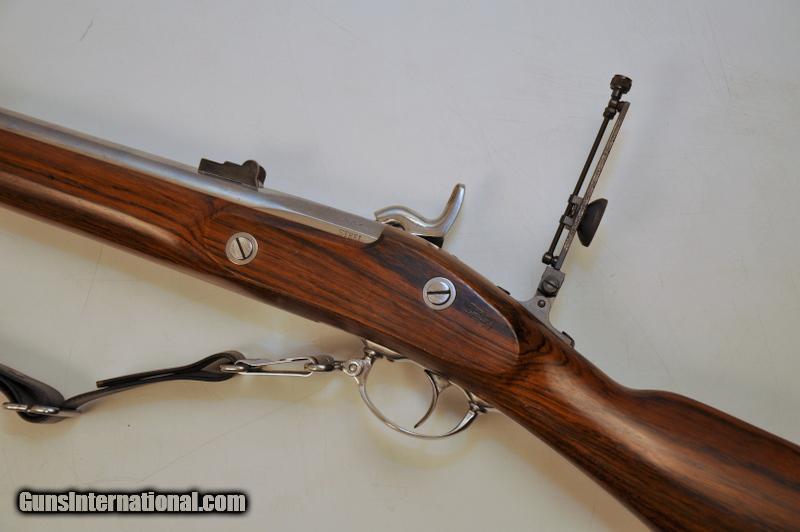Description: .58 cal. SN. 3124. MFG by ColtBlackpowder Arms Co, 1995-2002. 40" barrel other steel parts have bright polished finish. Original front & 2 leaf rear sight. After market long range vernier rear sight with 4" staff is inletted into wrist of the 3 band walnut stock. Tulip tipped steel ramrod. Black synthetic sling. Metal has VG polished finish. Rear sight shows spots of corrosion & leafs exhibit looseness. Very good bore. Sound mechanics. Priority mail $35.00 SOLD |