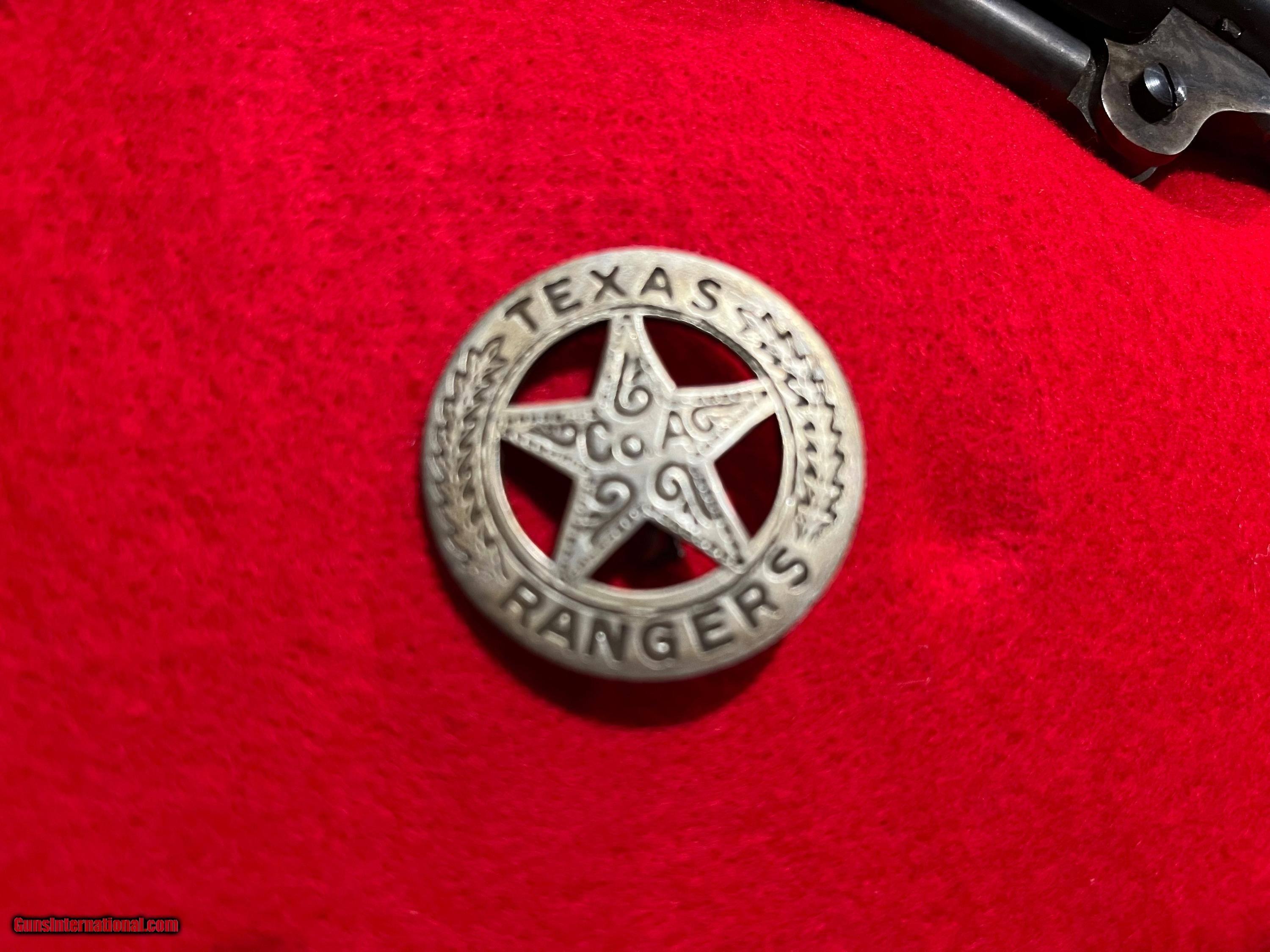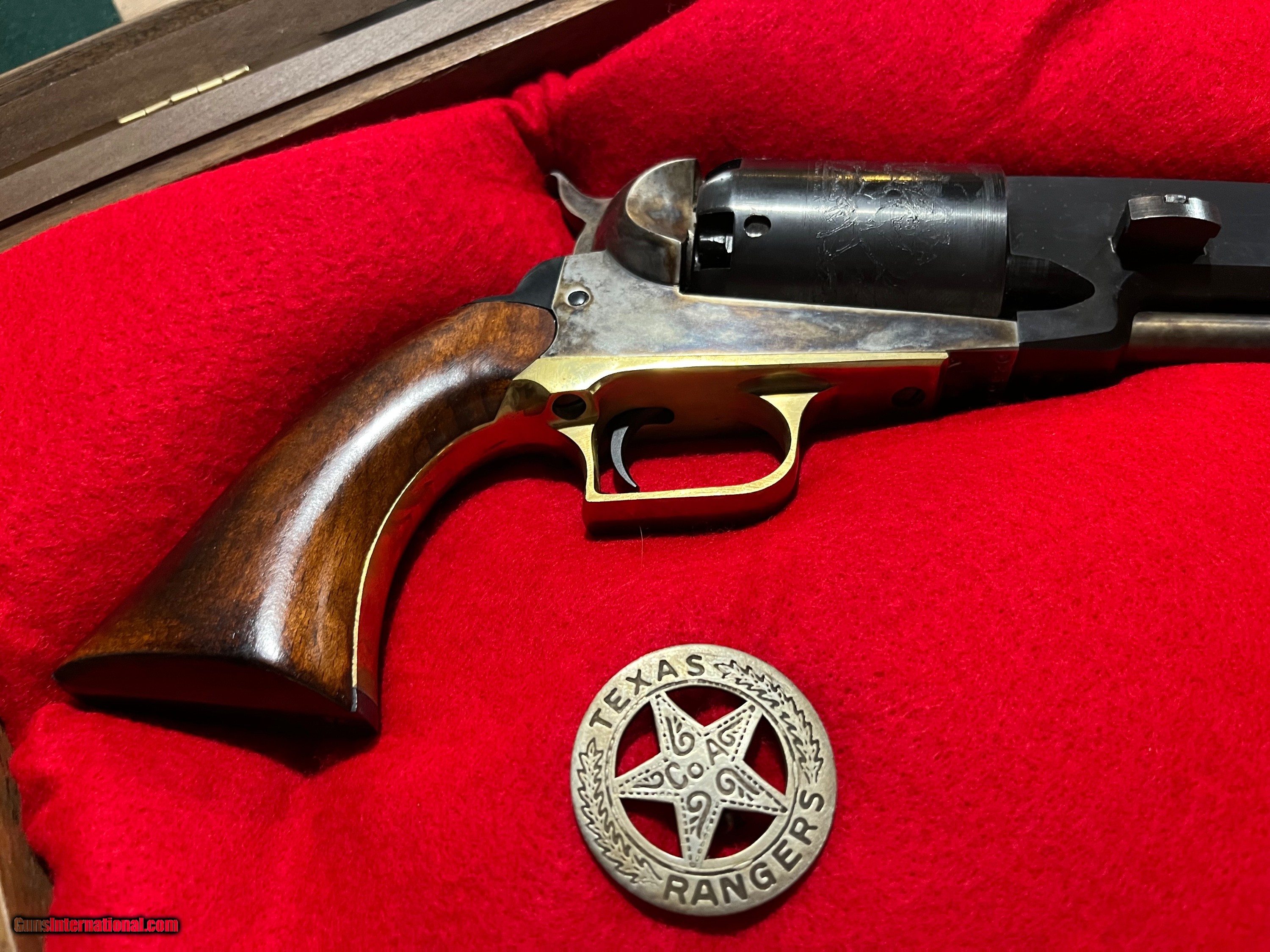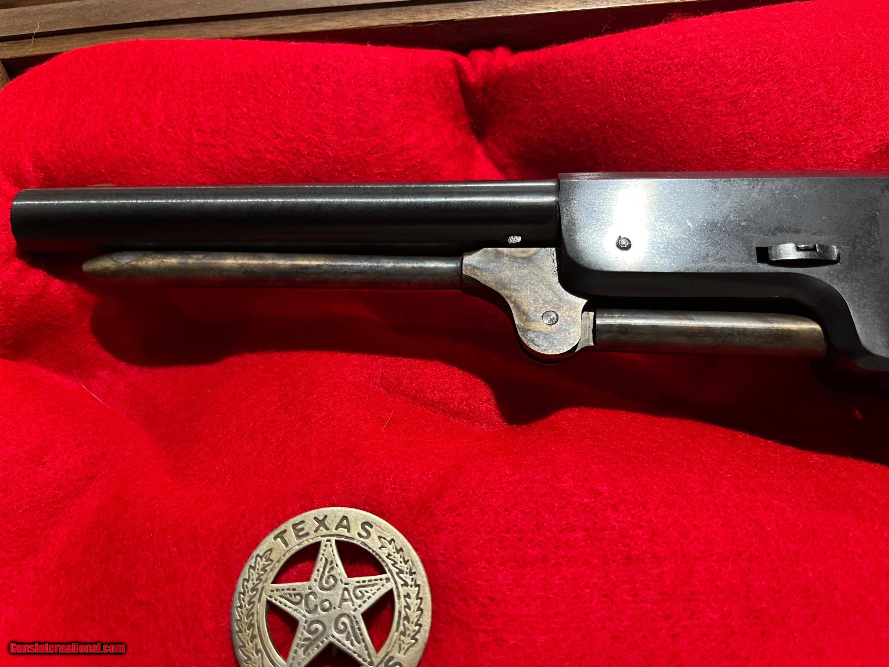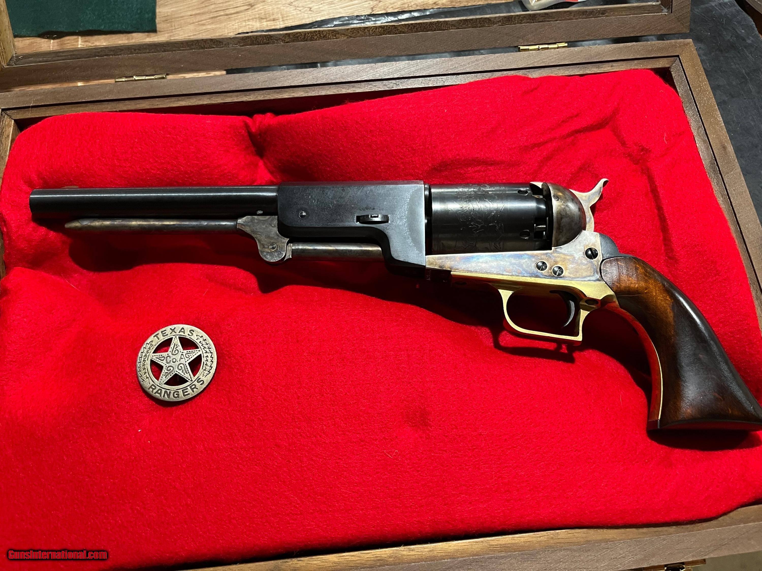 Description: Italian (Armi San Marco) reproduction of Colt Walker .44 percussion revolver. Col Samuel Walker of the Texas Rangers wanted a handgun his Rangers could use from horseback powerful enough to kill a Comanche pony, and Samuel Colt obliged him with this 4.5 lb brute. I purchased this high quality reproduction in 1995 and it has never been fired. It is blued with case colored frame and loading lever and a brass trigger guard. There is a contemporary scene roll engraved on the cylinder. Bore, chambers, grips and finish are as new. Comes with a repro Company A Texas Ranger badge made from a Mexican peso coin. Price includes shipping. SOLD Antique: Yes |
