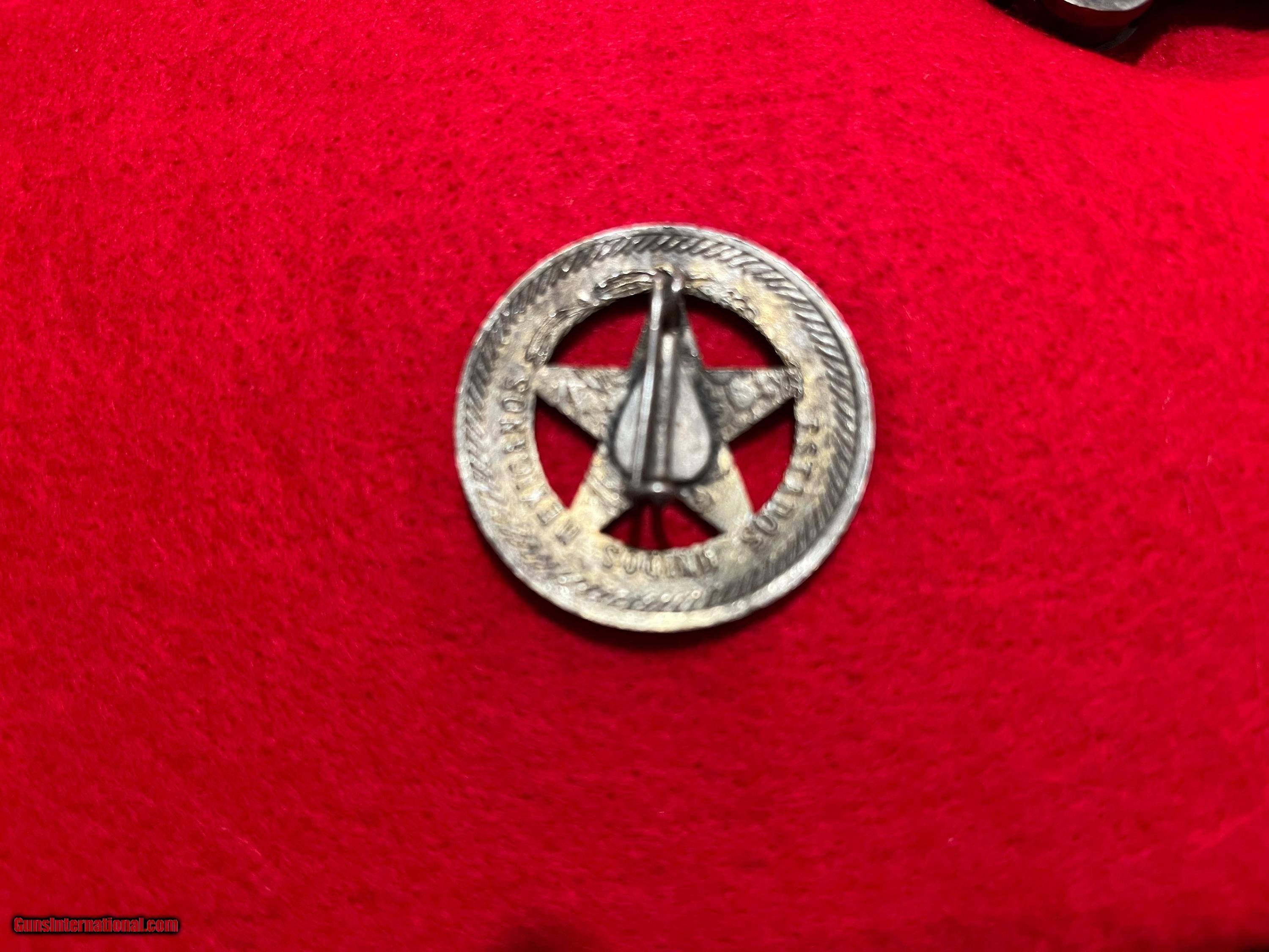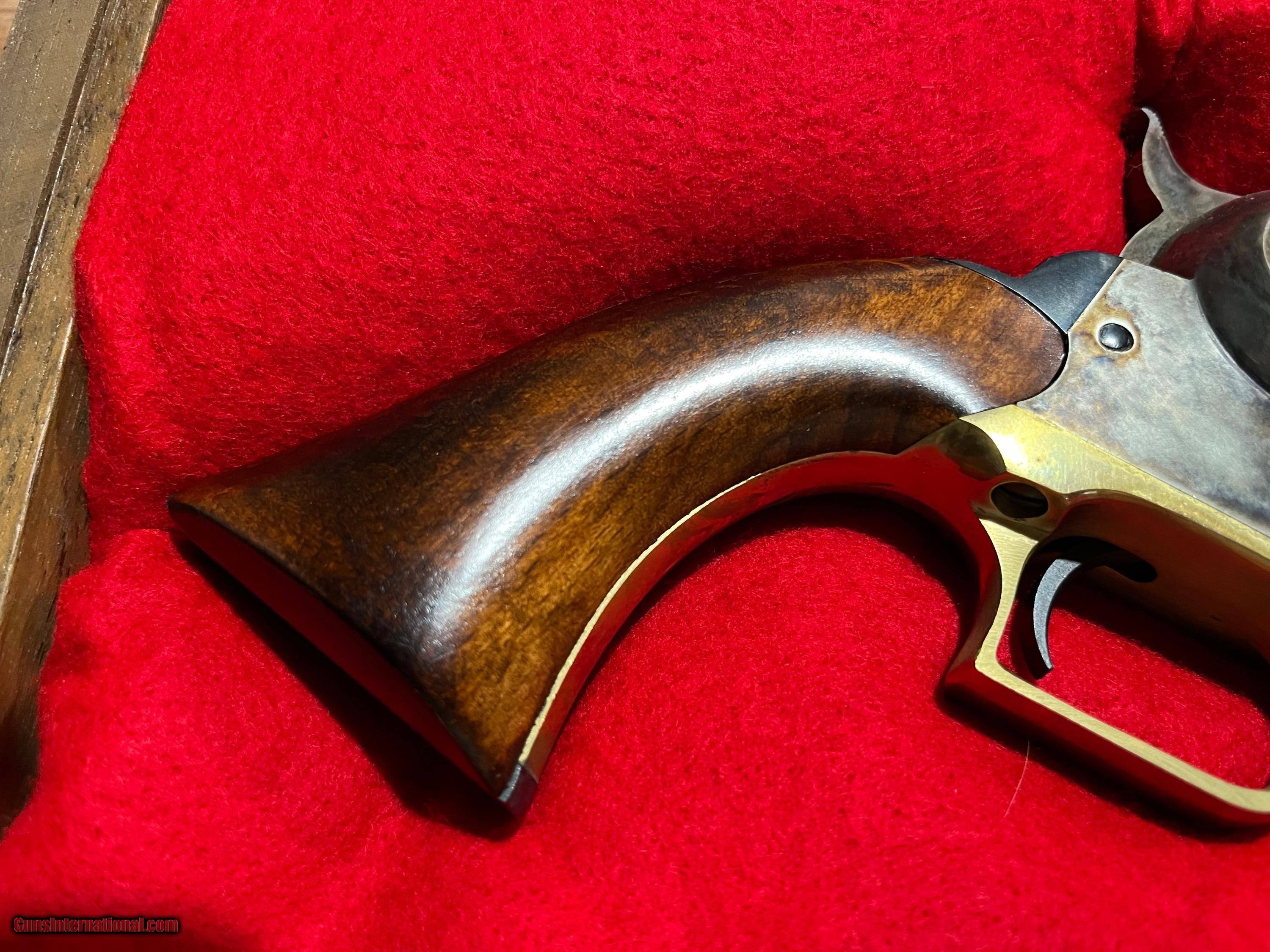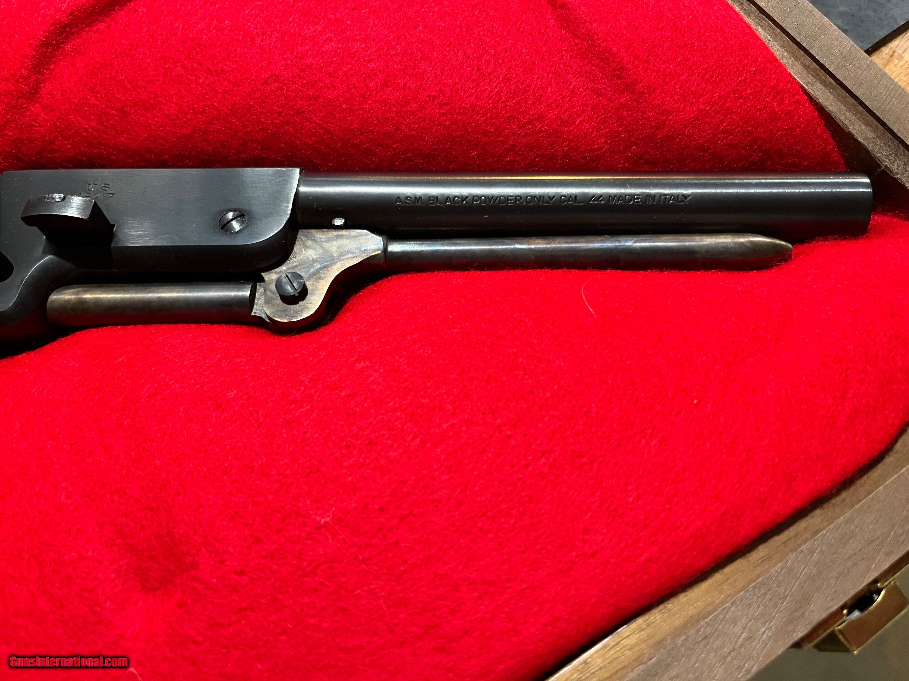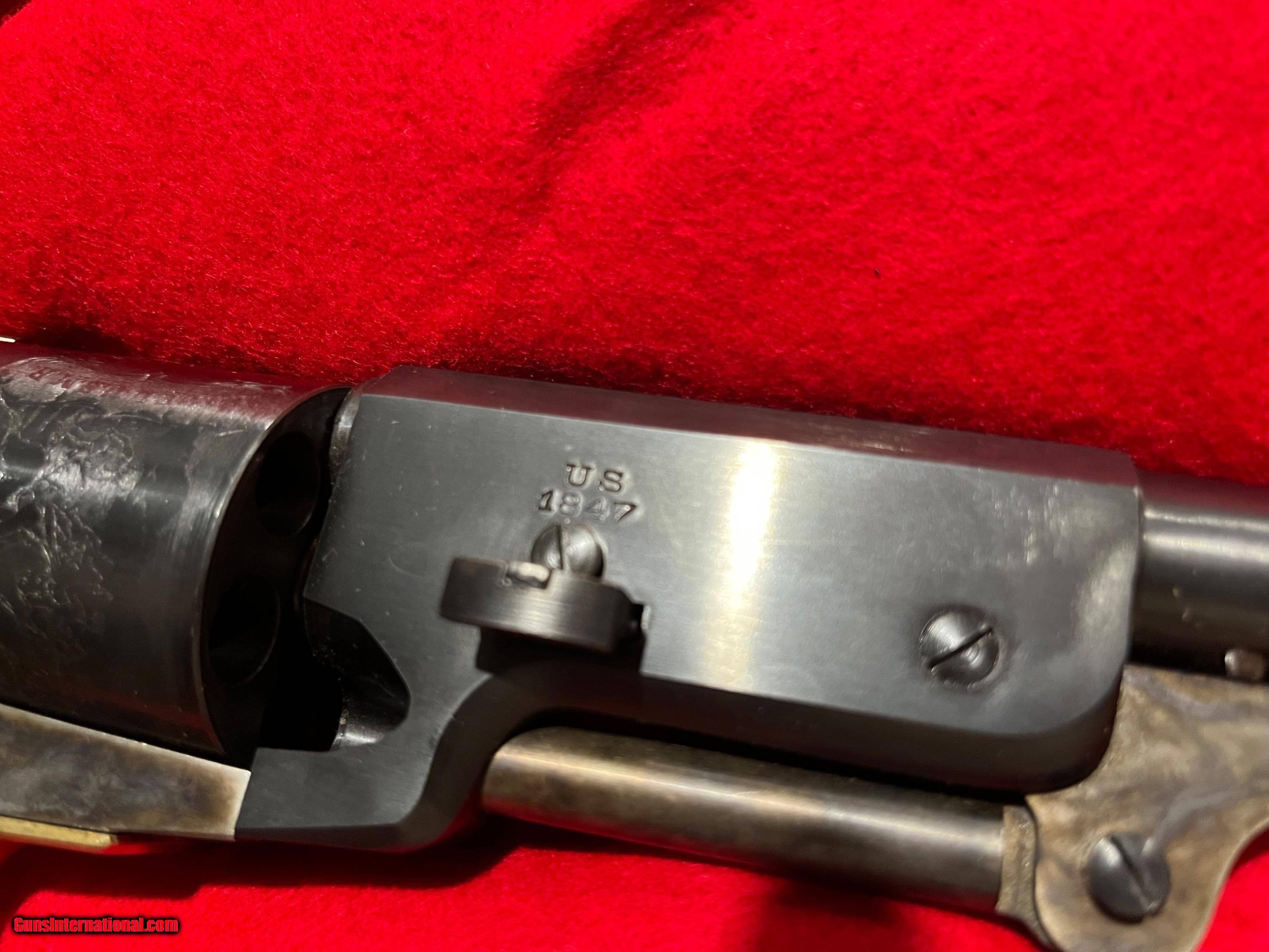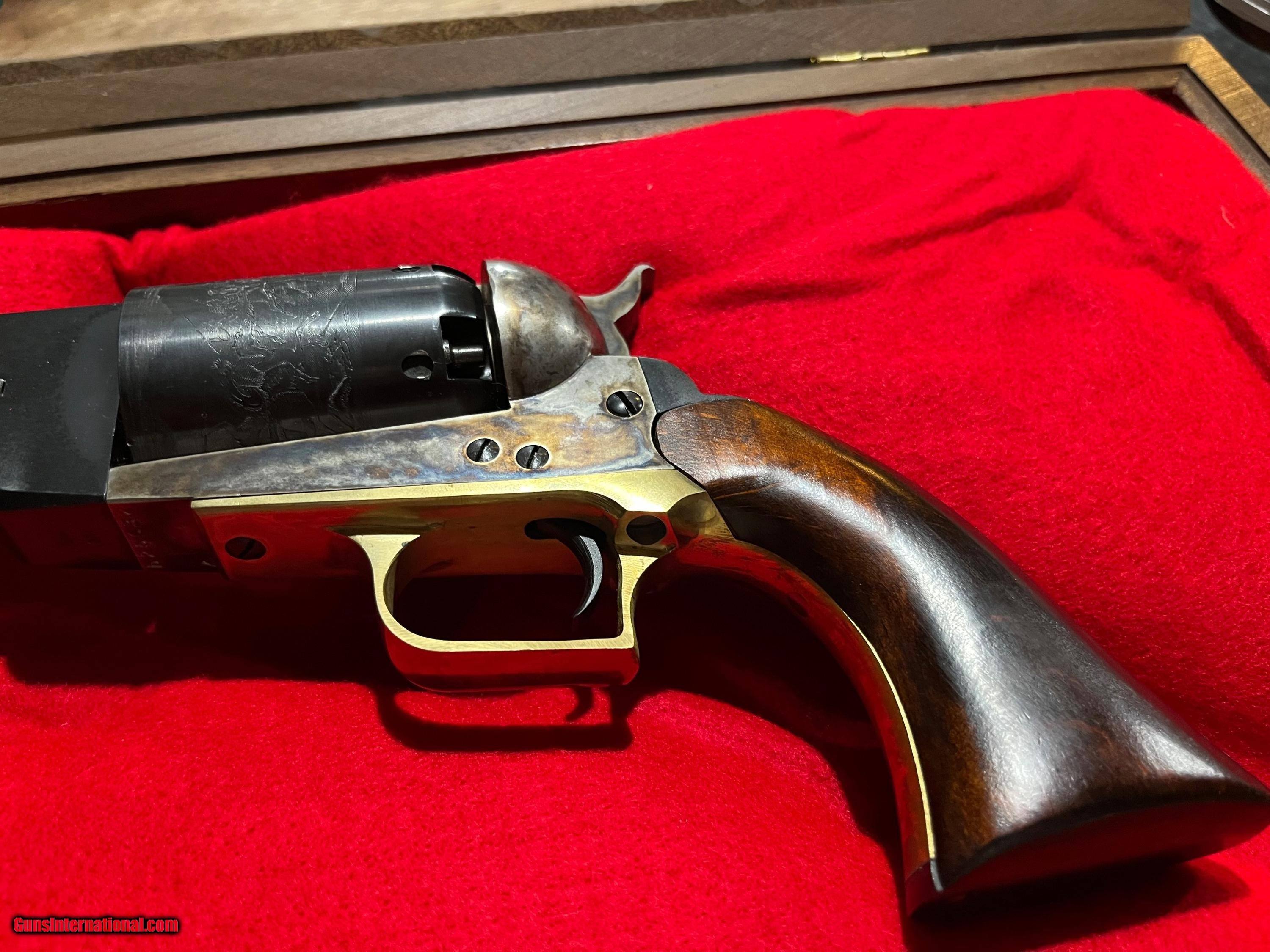 Description: Italian (Armi San Marco) reproduction of Colt Walker .44 percussion revolver. Col Samuel Walker of the Texas Rangers wanted a handgun his Rangers could use from horseback powerful enough to kill a Comanche pony, and Samuel Colt obliged him with this 4.5 lb brute. I purchased this high quality reproduction in 1995 and it has never been fired. It is blued with case colored frame and loading lever and a brass trigger guard. There is a contemporary scene roll engraved on the cylinder. Bore, chambers, grips and finish are as new. Comes with a repro Company A Texas Ranger badge made from a Mexican peso coin. Price includes shipping. SOLD Antique: Yes |