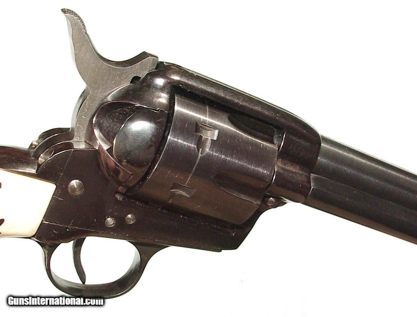 Description: .44 magnum caliber, 7 1/2" barrel, finished blue with plastic stag grips. Finished blue overall and showing very little evidence of use. Mechanically excellent. Copy of the Colt S.A.A. and having the distinctive square face hammer. These were often used in Western Movies and TV shows in the 1950's and early 60's because of Colt's late start up of S.A.A. production after WWII. SOLD Curio/Relic: Yes |